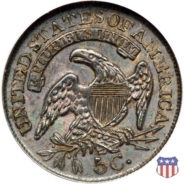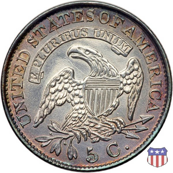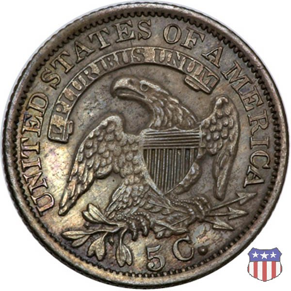 Dopo quasi 25 anni di sospensione, l'half dime tornò a essere coniato nel 1829 con i disegni di John Reich già presenti da tempo sugli altri nominali in argento. Ma ad incidere i conii fu il "Chief Engraver" William Kneass, poiché Reich si era dimesso nel 1817, in polemica con la Zecca per la scarsa considerazione (anche economica) in cui era tenuto. La moneta, mostra una formosa Lady Liberty al dritto (per la quale i critici dissero, probabilmente non senza ragione, che l'artista aveva ritratto la sua grassa amante) e un'aquila ad ali spiegate con scudo sul petto, disegno piú tardi noto come "sandwich-board", al rovescio. Per la prima volta vi compare il valore, nella forma 5 C. Il "Capped Bust Half Dime" fu coniato ininterrottamente fino al 1837, anno in cui furono leggermente modificati i suoi parametri, con il titolo dell'argento che passò a 900 millesimi e il peso che scese a 1,34 grammi. | ||||||||||||