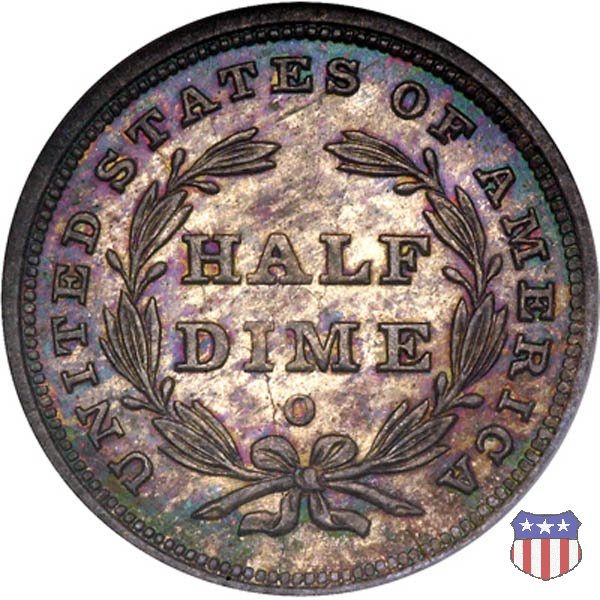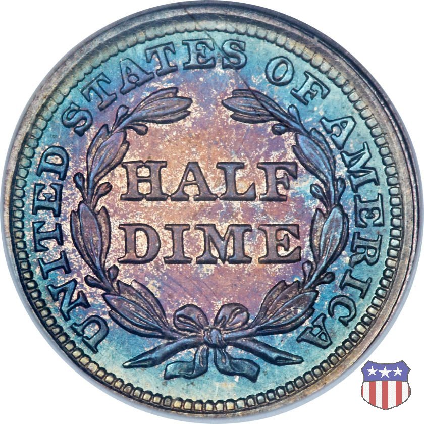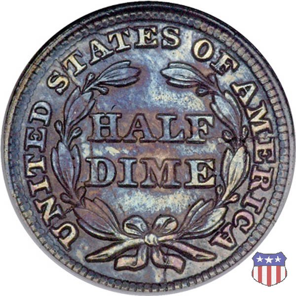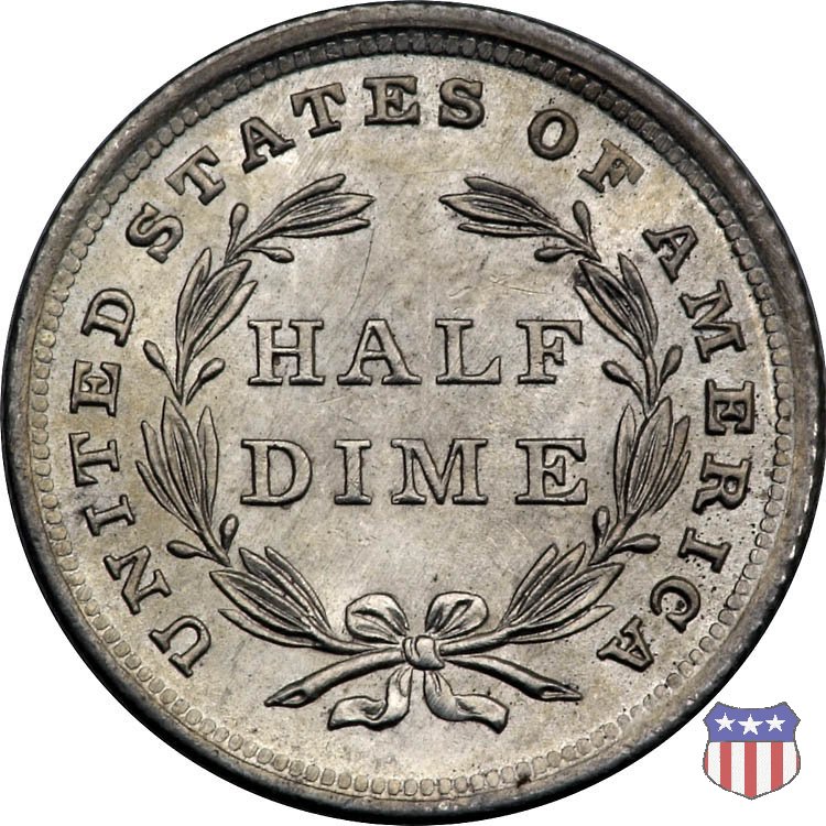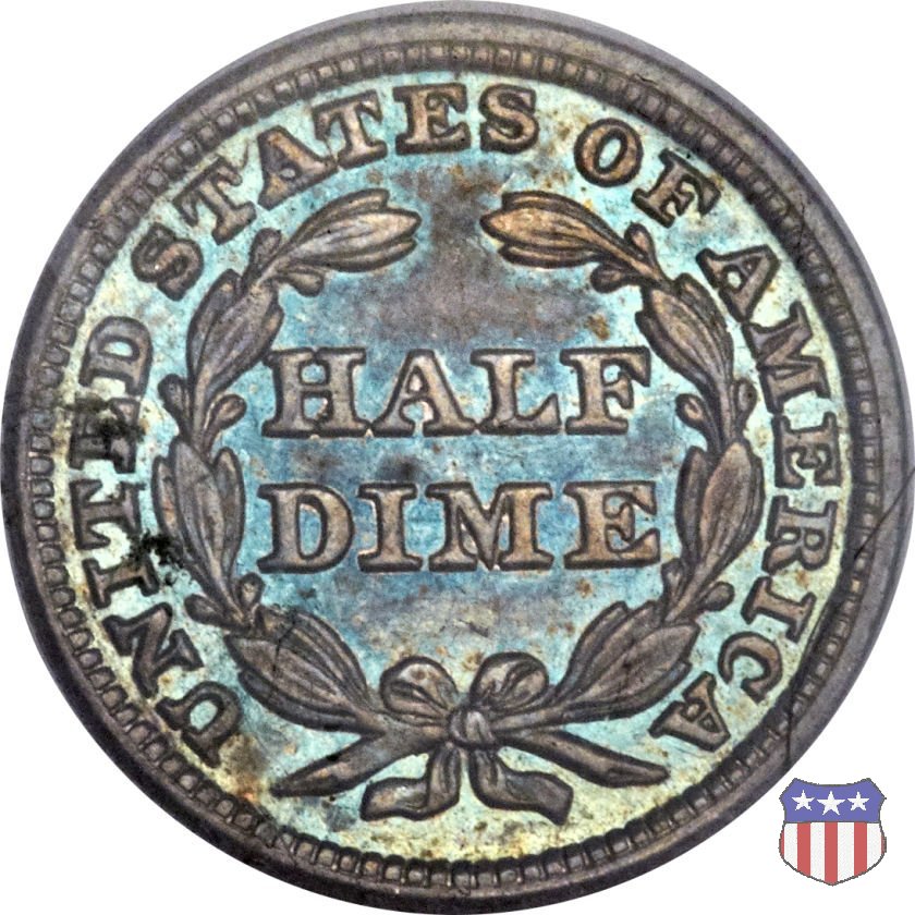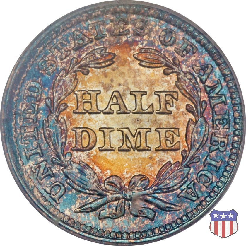 Figura femminile simboleggiante Lady Liberty, con un lungo abito drappeggiato, seduta su una roccia. Con la mano sinistra tiene un'asta, sormontata da un berretto frigio. La mano destra si appoggia a uno scudo e tiene una fascia con la scritta LIBERTY. Nel giro, un arco di 13 stelle, sotto la base della roccia la data. Valore HALF DIME su due righe all'interno di una corona d'alloro. Nel giro UNITED STATES OF AMERICA. Il marchio di zecca, ove presente, è all'interno della corona, sotto la M di DIME.