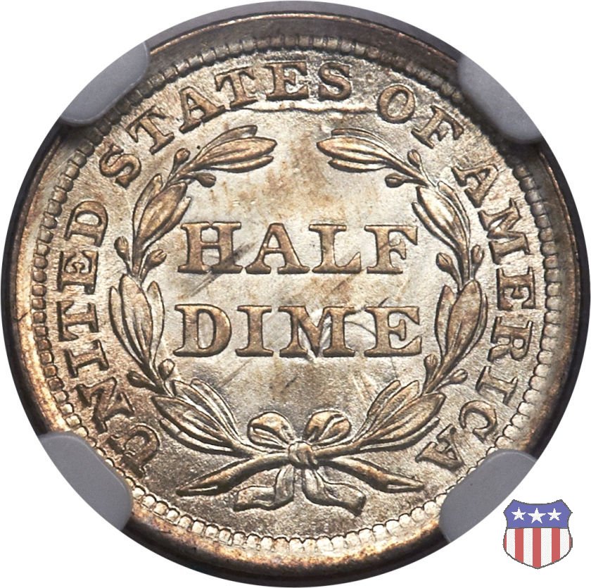 L'half dime disegnato da Christian Gobrecht, porta al dritto la figura seduta di Lady Liberty da cui prende nome, vista per la prima volta sul dollaro 1836, e al rovescio il valore, scritto per la prima volta nella forma HALF DIME, all'interno di una corona. Ben quattro sono le varianti di questa moneta, che si distinguono per la presenza o meno delle stelle al dritto, di due frecce ai lati della data, della legenda UNITED STATES OF AMERICA che passa dal rovescio al dritto, per la forma della corona e, "dulcis in fundo", per una differenza di peso. La Variante 3, coniata nel 1853, 1854 e 1855 nelle Zecche di Philadelphia e New Orleans, è conosciuta come "Arrows at Date", per le due frecce, una volta a destra l'altra a sinistra, ai lati della data, che stanno a indicare la riduzione di peso della moneta, che passa da 1,34 a 1,24 grammi, mantenendo invariati il diametro e il titolo dell'argento (Atto del Congresso 21 Febbraio 1853). Segno di zecca: - O New Orleans - senza segno Philadelphia | ||||||