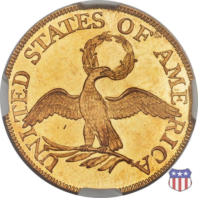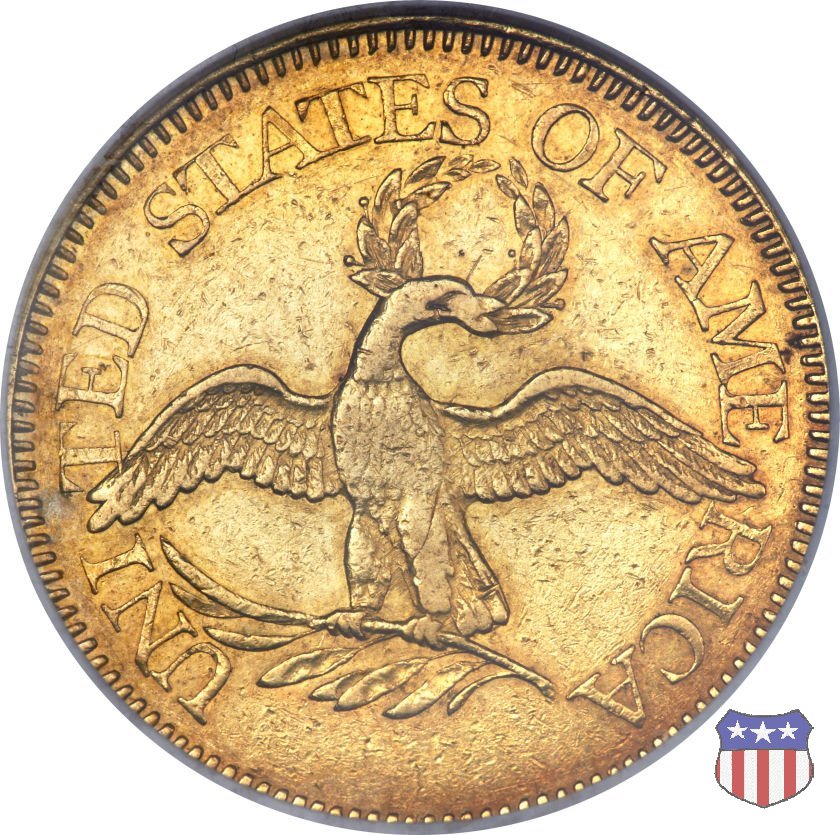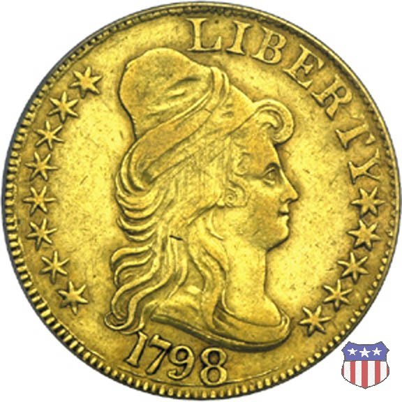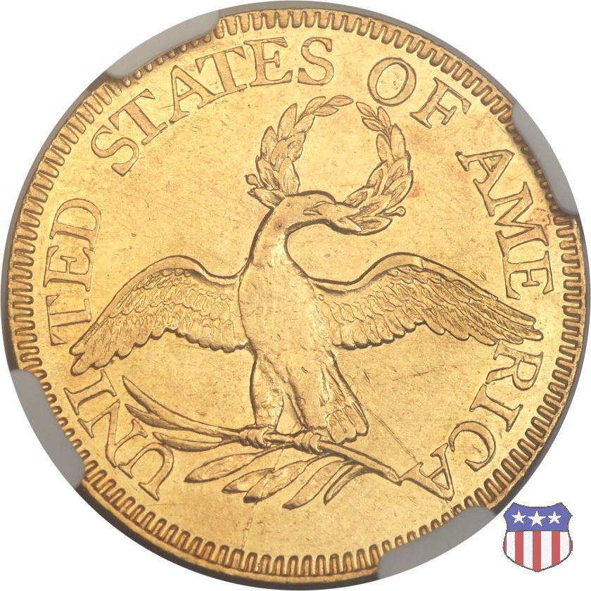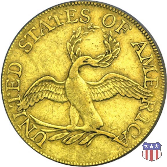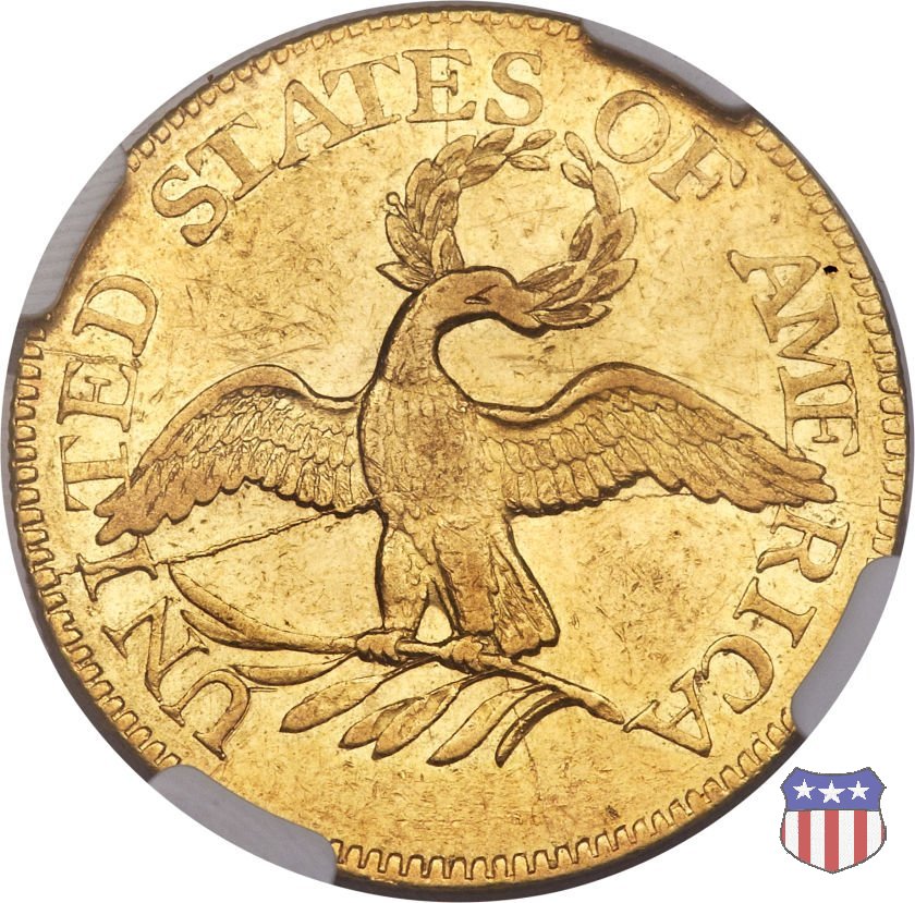 La "half eagle" è stata la prima moneta d'oro effettivamente coniata a nome degli Stati Uniti. La Lady Liberty di Robert Scot indossa un copricapo a forma di turbante, di alta moda contemporanea, invece del tradizionale pileo. Per questo, il disegno è noto anche come "Turban Head", "un tumultuoso, morbido copricapo" - scrive Christian Vermeule - "che sembra torreggiare in mezzo a un grande ciuffo arricciato e a lunghe trecce". Il disegno dell'aquila al rovescio riprende in parte quello dell'uccello ad ali aperte già presente sulle monete d'argento. Al pari di quello, ha ben poco di naturale, e anche di maestoso, e sarà presto sostituito dal modello araldico. | ||||||||||