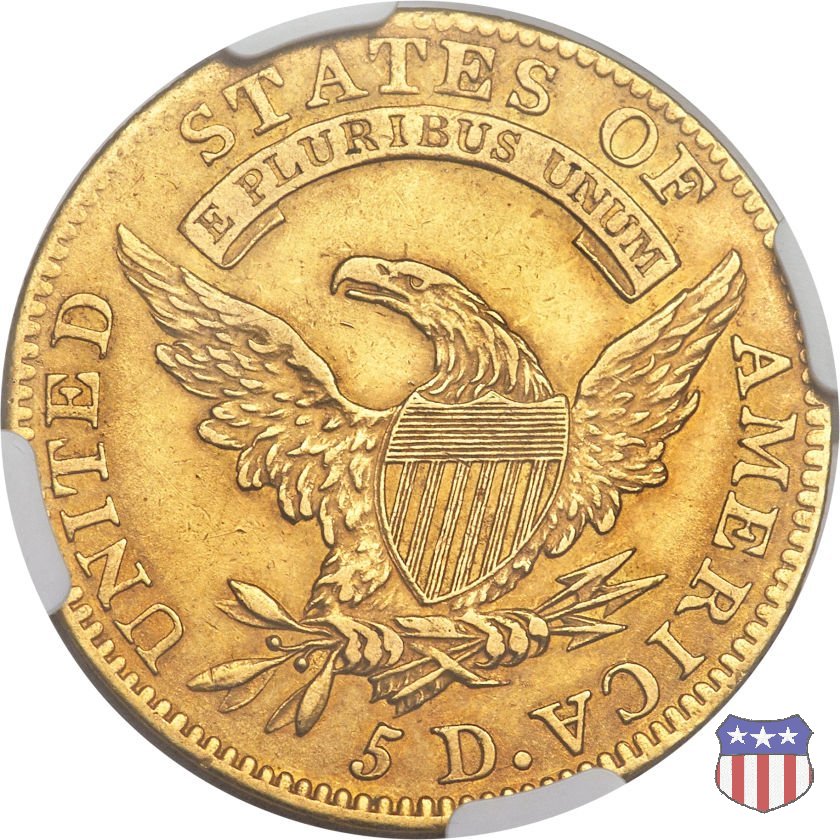 Busto drappeggiato di Lady Liberty volto a sinistra, che indossa un cappello frigio con l'iscrizione LIBERTY sulla fascia. Nel giro 13 stelle, 7 a sinistra e 6 a destra, in basso la data. Le monete, coniate a Philadelphia, non presentano segni di zecca. Aquila ad ali spiegate, con scudo sul petto, che stringe un ramo d'ulivo nel suo artiglio destro, e un mazzo di frecce nel sinistro, e ha sopra la testa un cartiglio col motto E PLURIBUS UNUM. Nel giro UNITED STATES OF AMERICA, in basso il valore, 5 D.