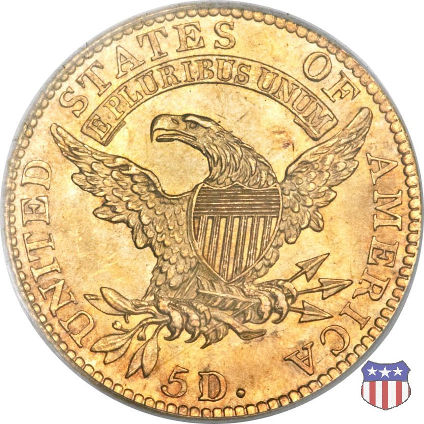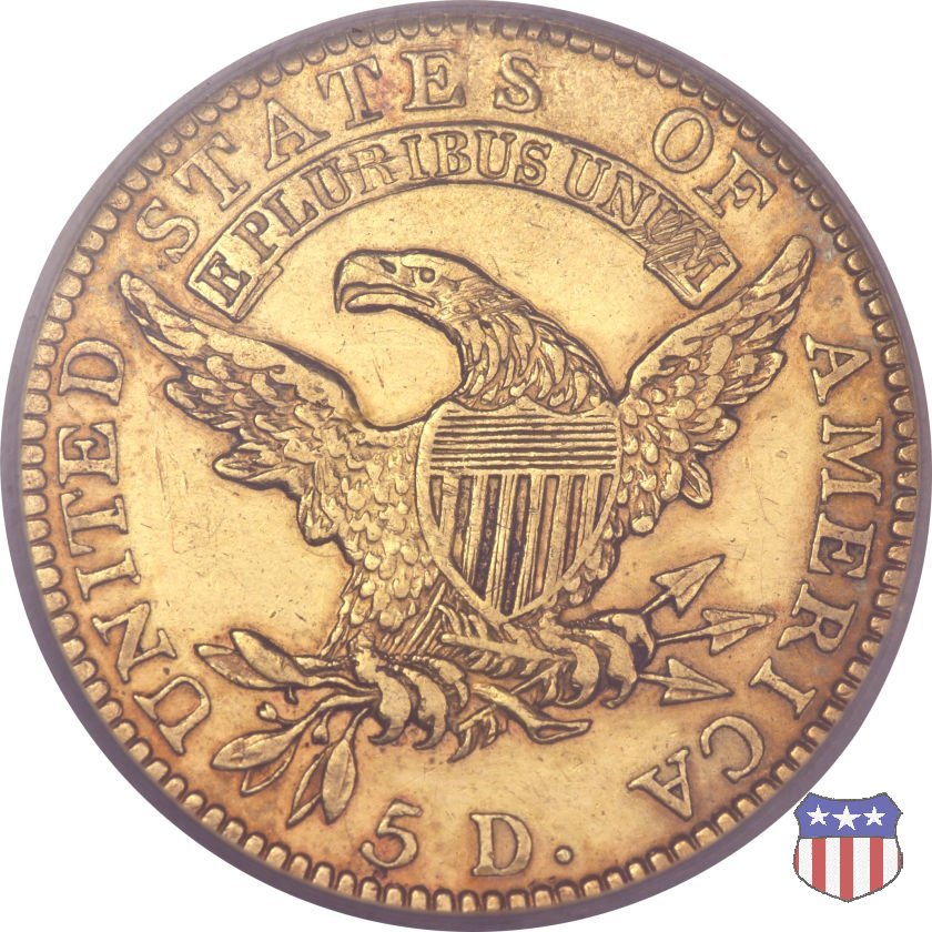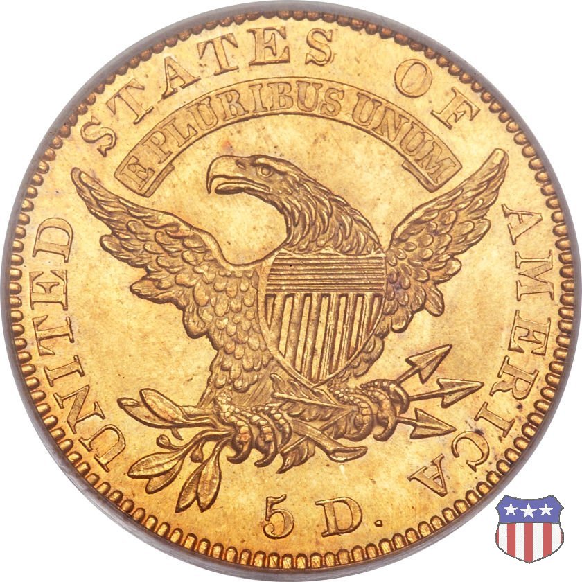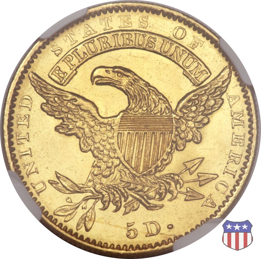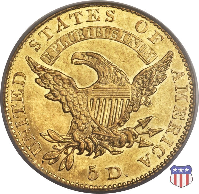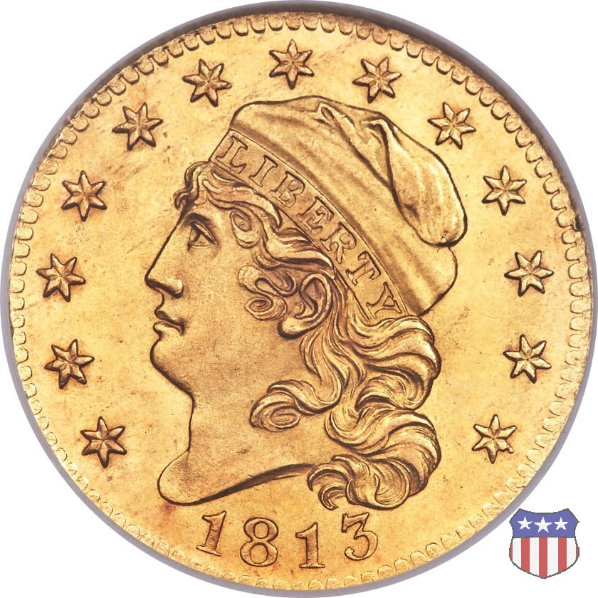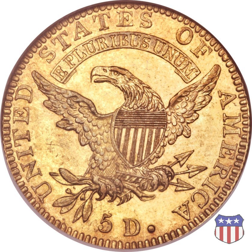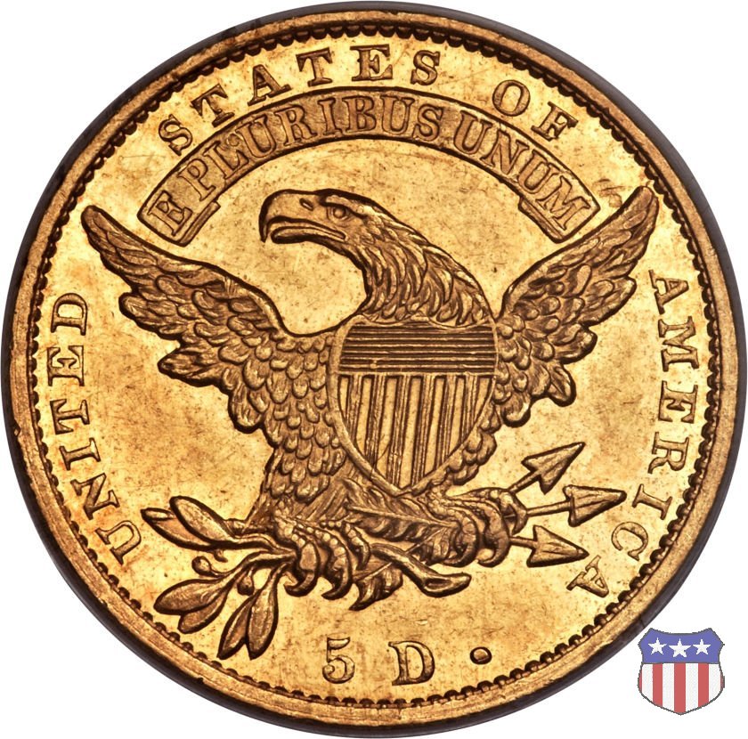 Nel 1813 il dritto della "half eagle" fu parzialmente modificato rispetto a quello del periodo 1807-1812. Il busto di Lady Liberty venne troncato (e la denominazione passò da "Capped Bust" a "Capped Head") e le stelle, sempre in numero di 13, occuparono tutto il giro della moneta, non piú divise tra destra e sinistra. Il rovescio, con l'aquila "sandwich board", rimase invece invariato. Nel 1829 un'altra importante modifica riguardò il diametro della moneta, ridotto da 25 a 23,80 mm. Anche le dimensioni di lettere, data e stelle furono ridotte. Peso e composizione non subirono variazioni rispetto alle emissioni precedenti. In questa tipologia sono da segnalare numerose grandi rarità: 1815 (11 esemplari conosciuti), 1822 (3 esemplari conosciuti), 1825, variante "5 over 4" (2 esemplari conosciuti), 1828, variante "8 over 7" (5 esemplari conosciuti) e 1832, variante "Curved 2, 12 stars" (5 esemplari conosciuti). Di grande rarità anche le emissioni del 1826, quelle 1829, in particolare nel tipo "Large Date", e del 1833, sempre nella variante "Large Date". | ||||||||||||||||||||||