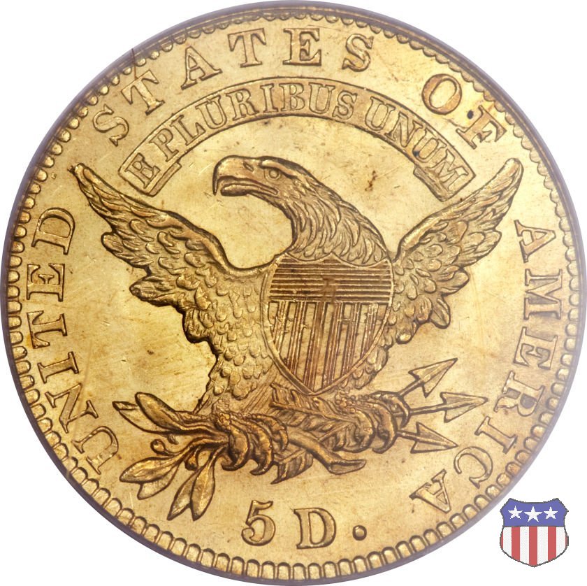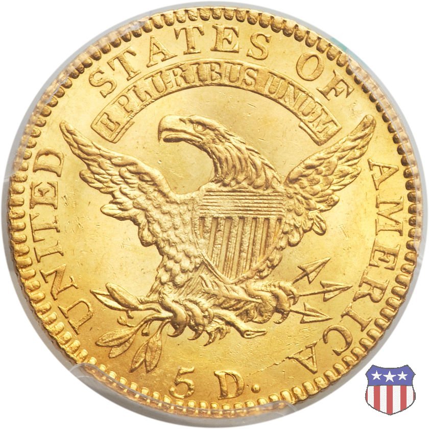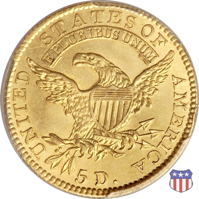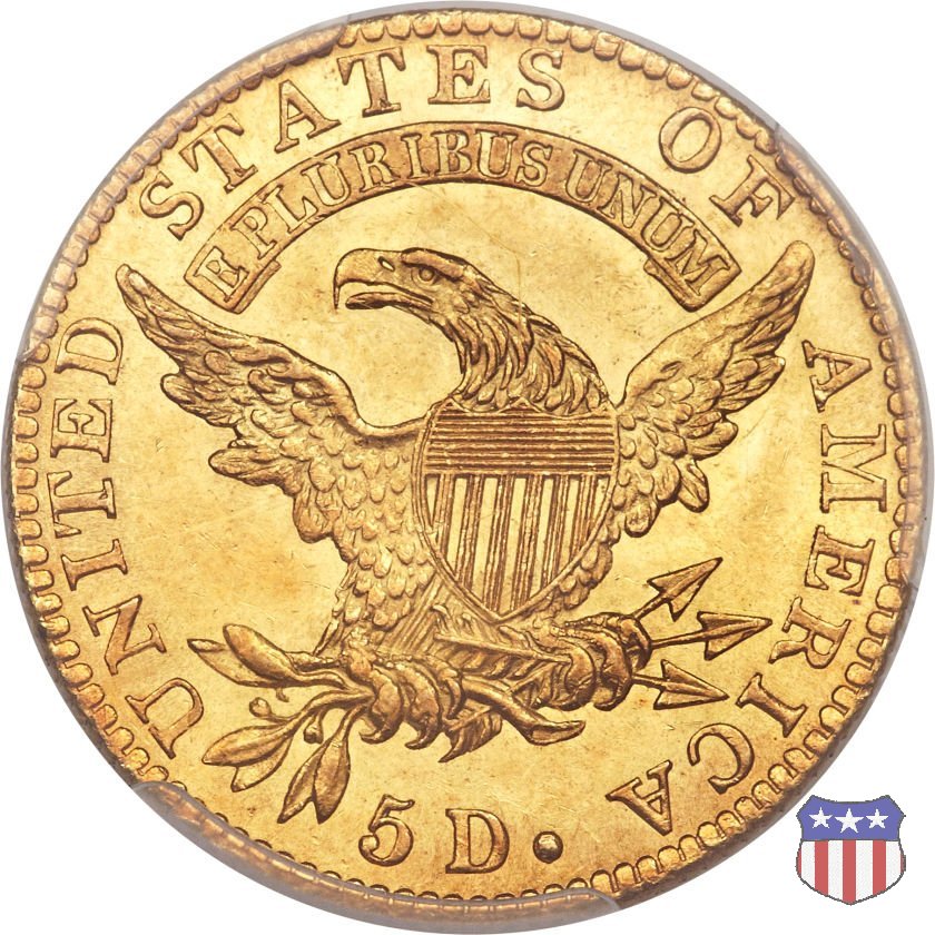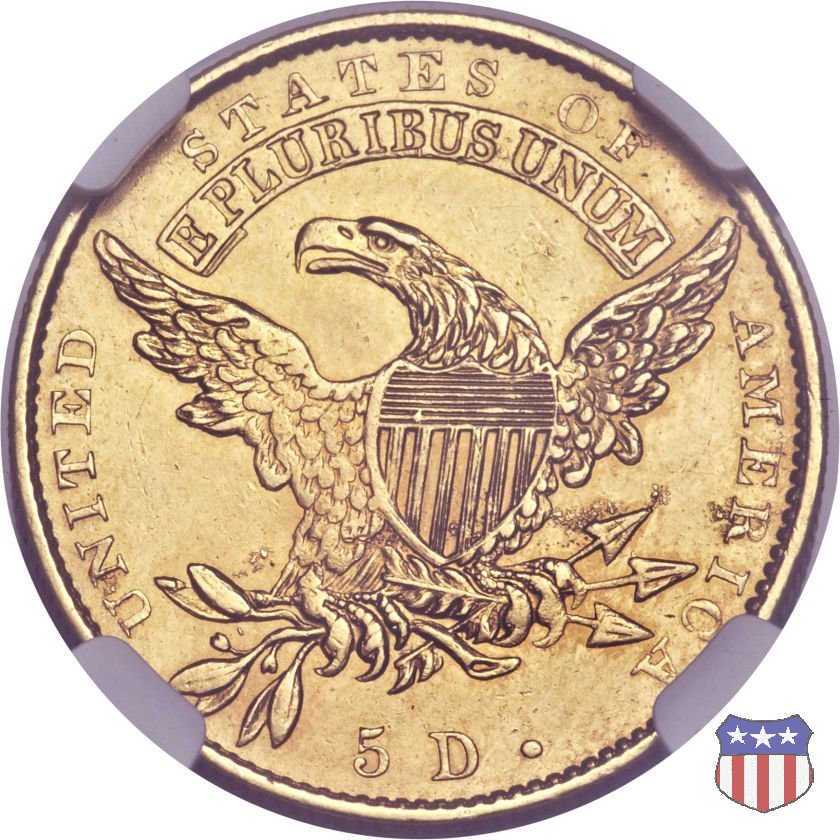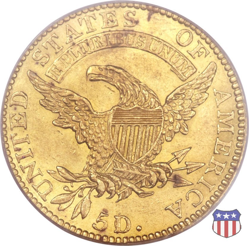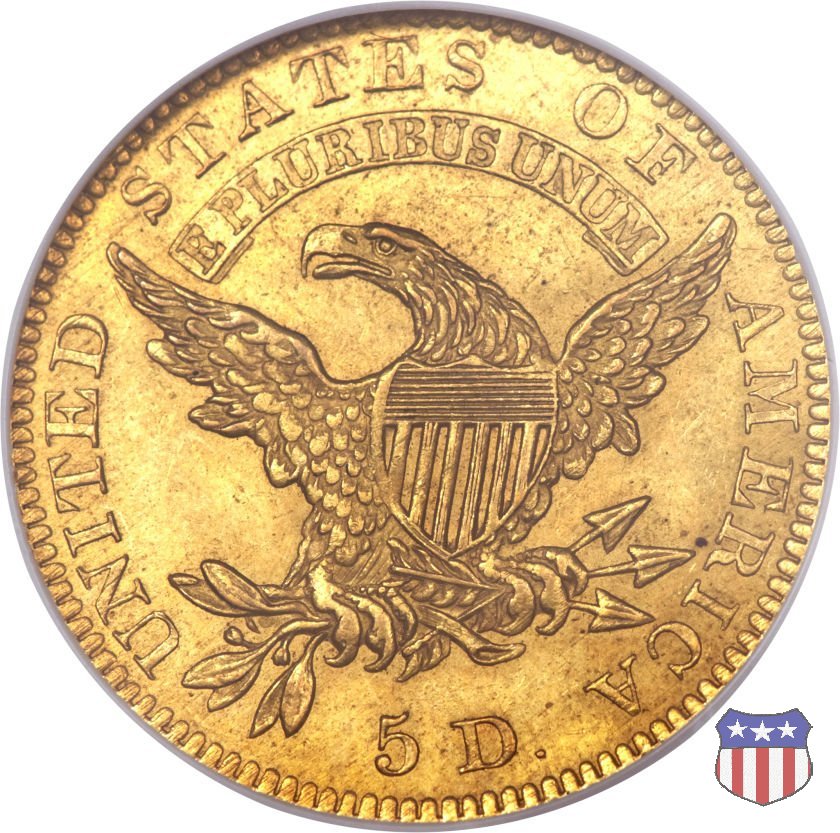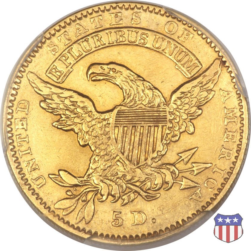 Nel 1813 il dritto della "half eagle" fu parzialmente modificato rispetto a quello del periodo 1807-1812. Il busto di Lady Liberty venne troncato (e la denominazione passò da "Capped Bust" a "Capped Head") e le stelle, sempre in numero di 13, occuparono tutto il giro della moneta, non piú divise tra destra e sinistra. Il rovescio, con l'aquila "sandwich board", rimase invece invariato. Nel 1829 un'altra importante modifica riguardò il diametro della moneta, ridotto da 25 a 23,80 mm. Anche le dimensioni di lettere, data e stelle furono ridotte. Peso e composizione non subirono variazioni rispetto alle emissioni precedenti. In questa tipologia sono da segnalare numerose grandi rarità: 1815 (11 esemplari conosciuti), 1822 (3 esemplari conosciuti), 1825, variante "5 over 4" (2 esemplari conosciuti), 1828, variante "8 over 7" (5 esemplari conosciuti) e 1832, variante "Curved 2, 12 stars" (5 esemplari conosciuti). Di grande rarità anche le emissioni del 1826, quelle 1829, in particolare nel tipo "Large Date", e del 1833, sempre nella variante "Large Date". | ||||||||||||||||||||||