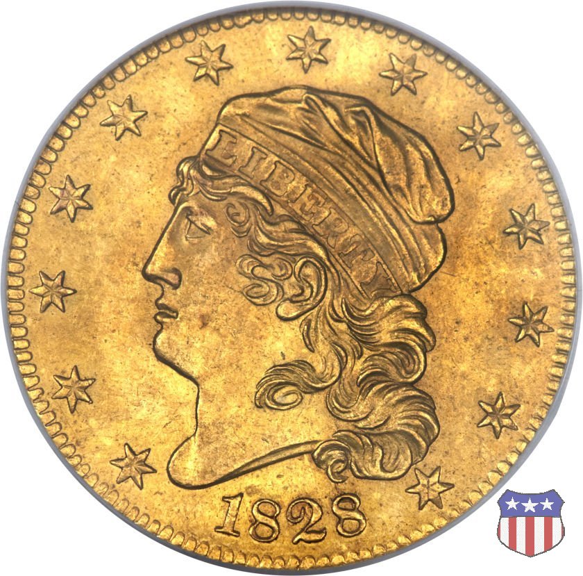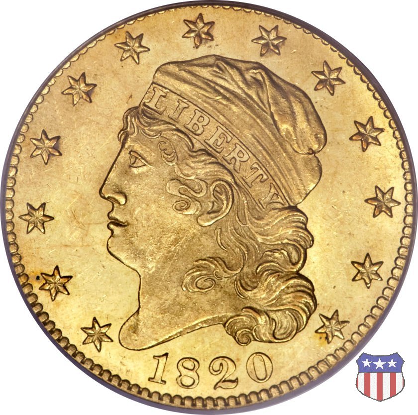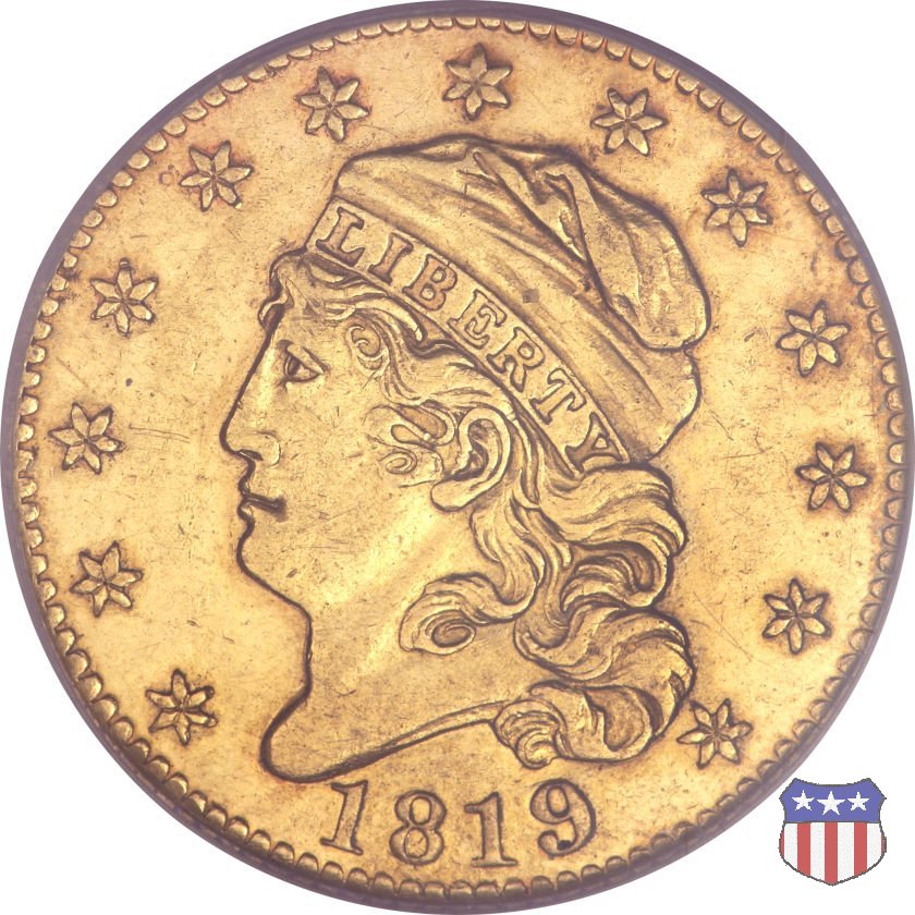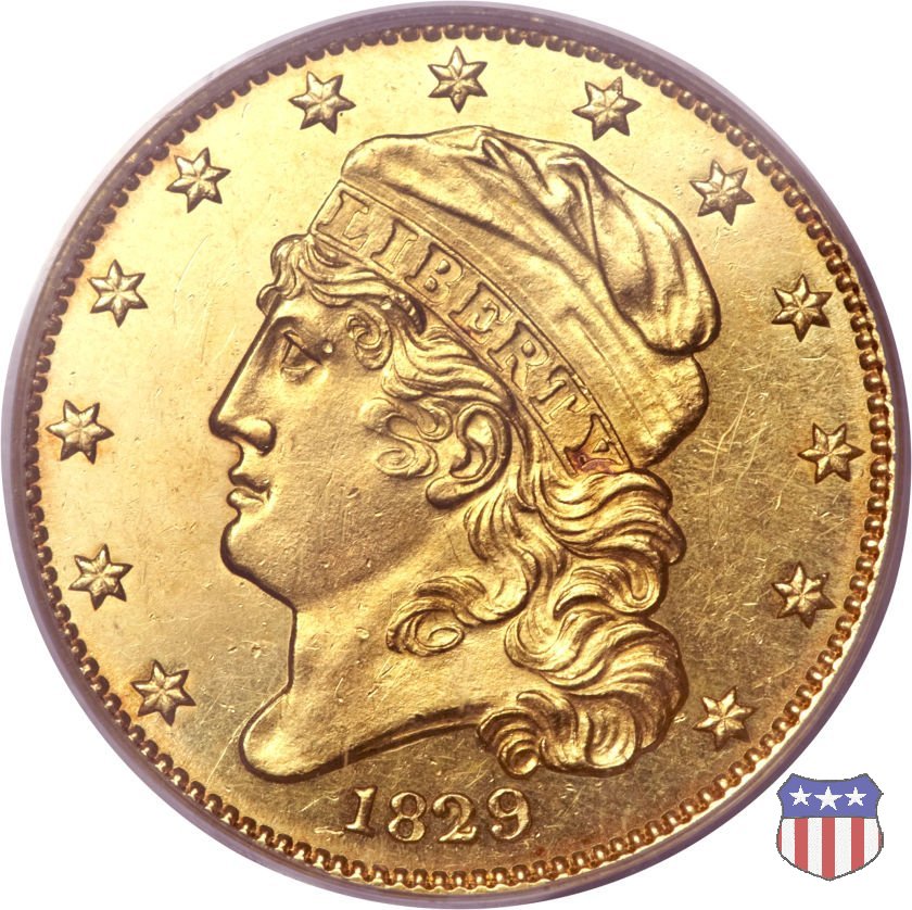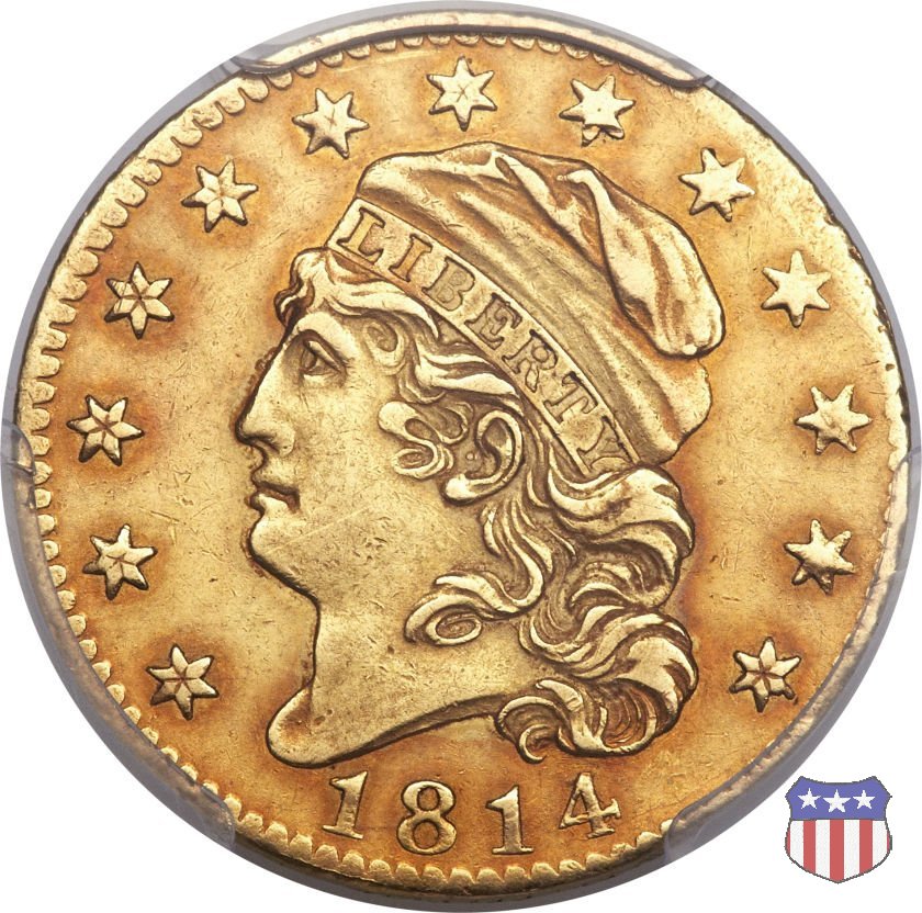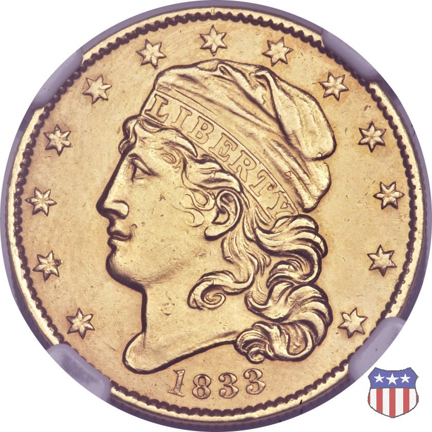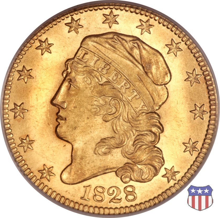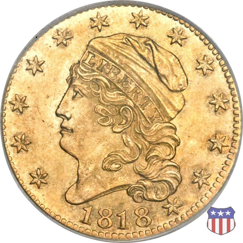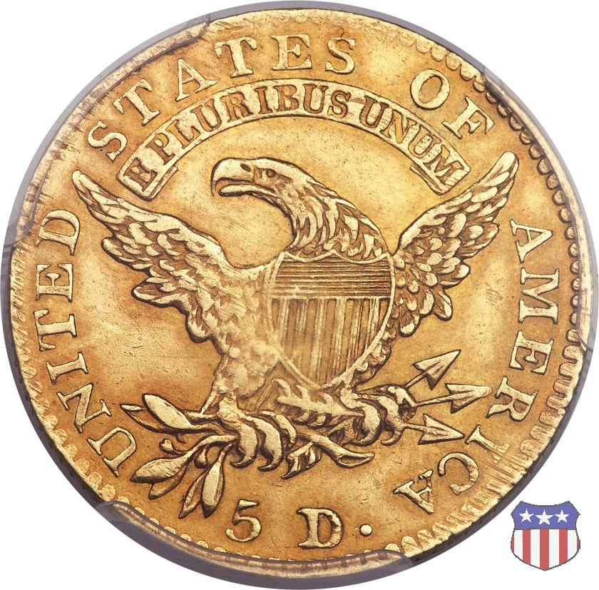 Nel 1813 il dritto della "half eagle" fu parzialmente modificato rispetto a quello del periodo 1807-1812. Il busto di Lady Liberty venne troncato (e la denominazione passò da "Capped Bust" a "Capped Head") e le stelle, sempre in numero di 13, occuparono tutto il giro della moneta, non piú divise tra destra e sinistra. Il rovescio, con l'aquila "sandwich board", rimase invece invariato. Nel 1829 un'altra importante modifica riguardò il diametro della moneta, ridotto da 25 a 23,80 mm. Anche le dimensioni di lettere, data e stelle furono ridotte. Peso e composizione non subirono variazioni rispetto alle emissioni precedenti. In questa tipologia sono da segnalare numerose grandi rarità: 1815 (11 esemplari conosciuti), 1822 (3 esemplari conosciuti), 1825, variante "5 over 4" (2 esemplari conosciuti), 1828, variante "8 over 7" (5 esemplari conosciuti) e 1832, variante "Curved 2, 12 stars" (5 esemplari conosciuti). Di grande rarità anche le emissioni del 1826, quelle 1829, in particolare nel tipo "Large Date", e del 1833, sempre nella variante "Large Date". | ||||||||||||||||||||||