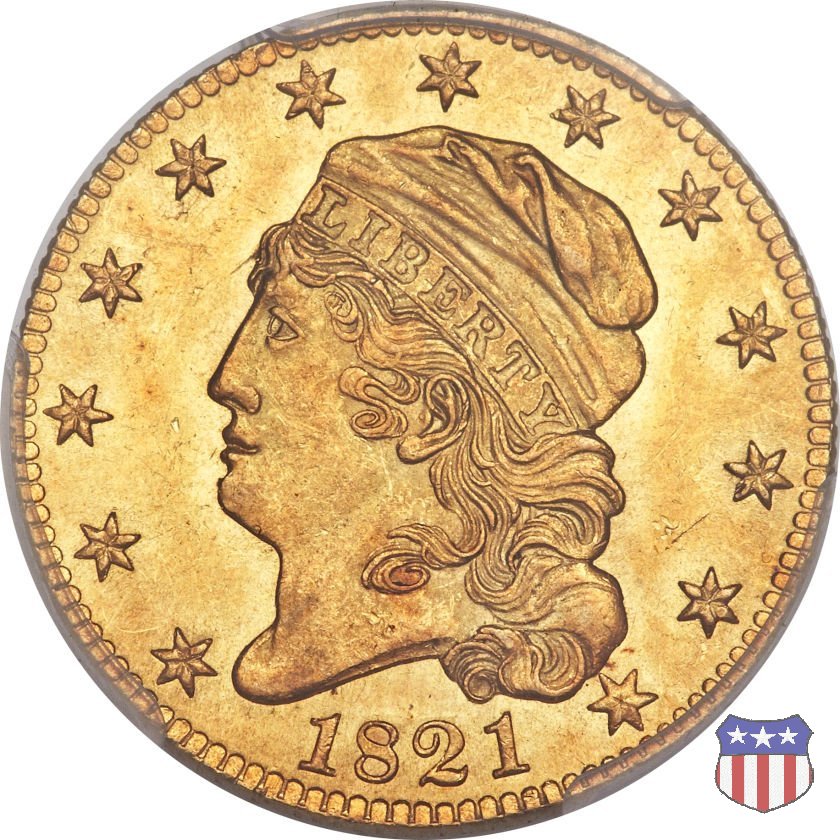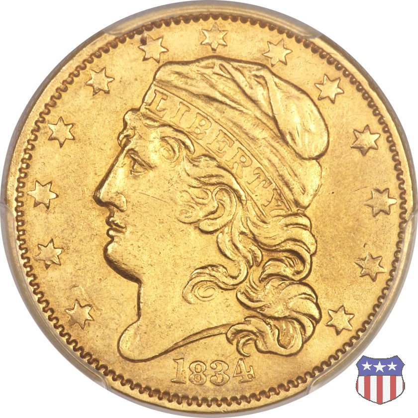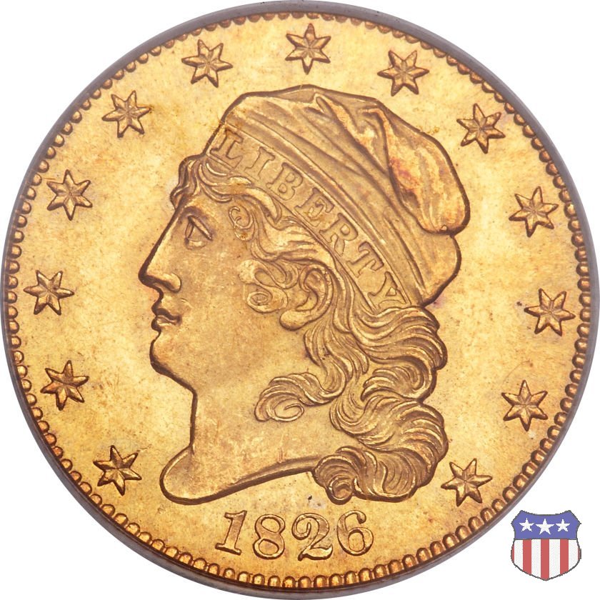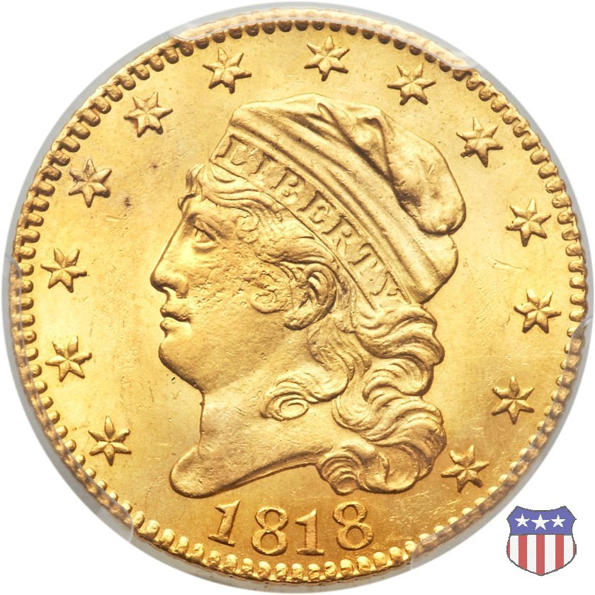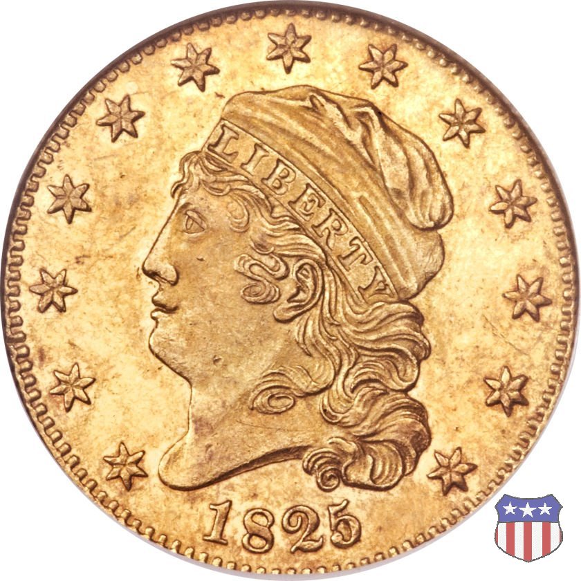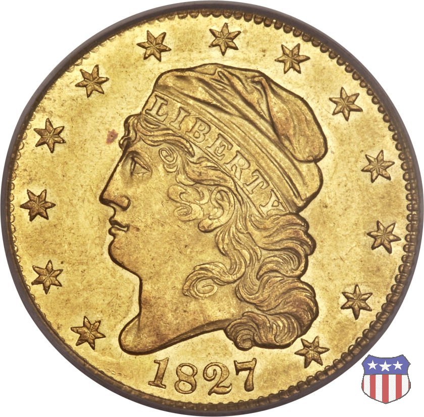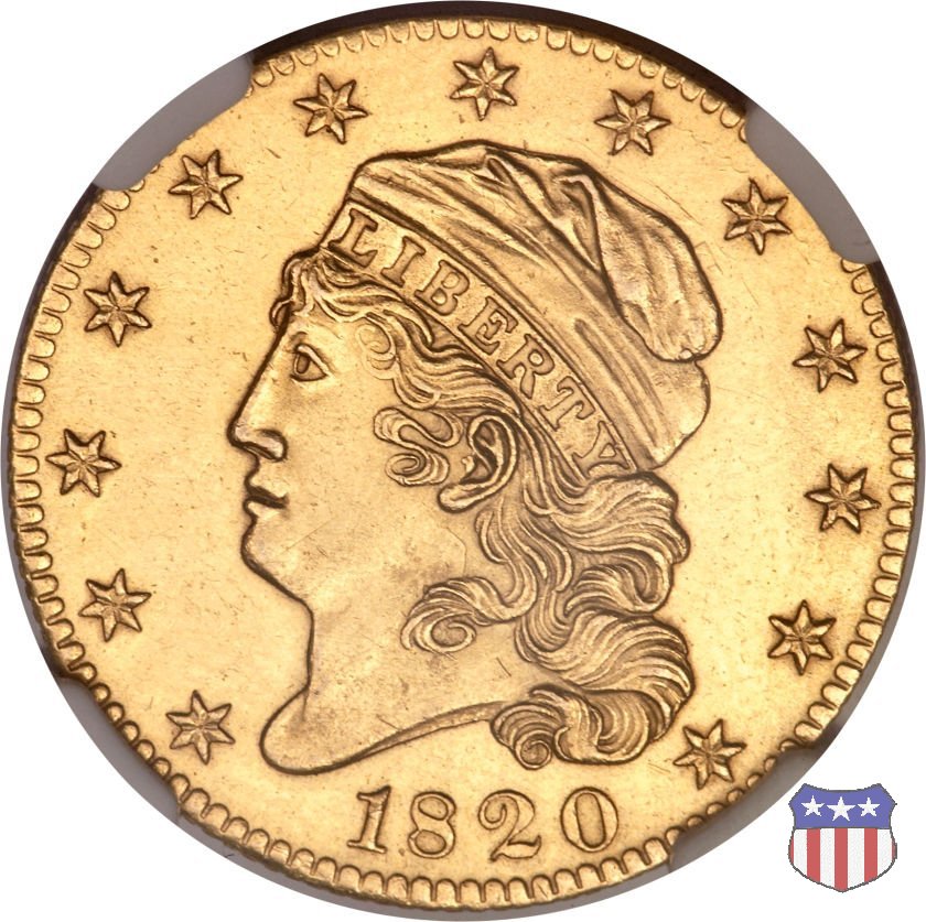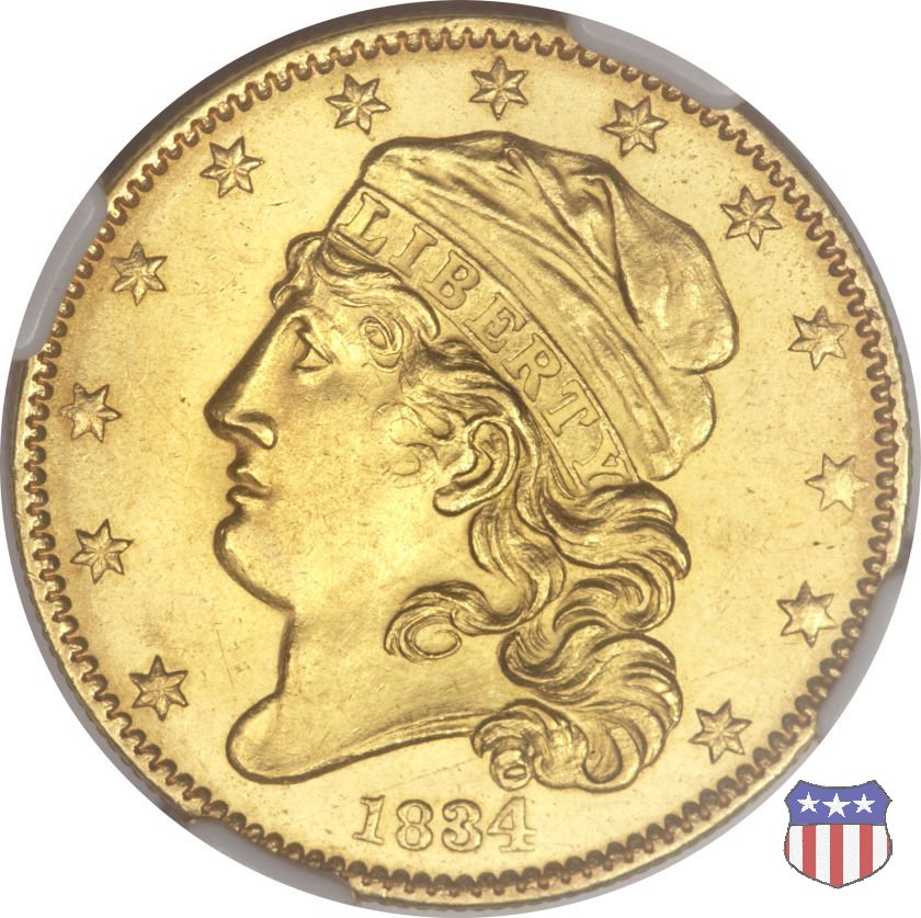 Nel 1813 il dritto della "half eagle" fu parzialmente modificato rispetto a quello del periodo 1807-1812. Il busto di Lady Liberty venne troncato (e la denominazione passò da "Capped Bust" a "Capped Head") e le stelle, sempre in numero di 13, occuparono tutto il giro della moneta, non piú divise tra destra e sinistra. Il rovescio, con l'aquila "sandwich board", rimase invece invariato. Nel 1829 un'altra importante modifica riguardò il diametro della moneta, ridotto da 25 a 23,80 mm. Anche le dimensioni di lettere, data e stelle furono ridotte. Peso e composizione non subirono variazioni rispetto alle emissioni precedenti. In questa tipologia sono da segnalare numerose grandi rarità: 1815 (11 esemplari conosciuti), 1822 (3 esemplari conosciuti), 1825, variante "5 over 4" (2 esemplari conosciuti), 1828, variante "8 over 7" (5 esemplari conosciuti) e 1832, variante "Curved 2, 12 stars" (5 esemplari conosciuti). Di grande rarità anche le emissioni del 1826, quelle 1829, in particolare nel tipo "Large Date", e del 1833, sempre nella variante "Large Date". | ||||||||||||||||||||||
