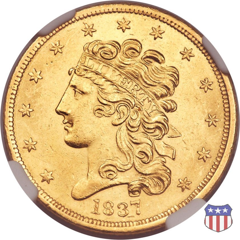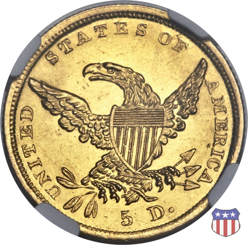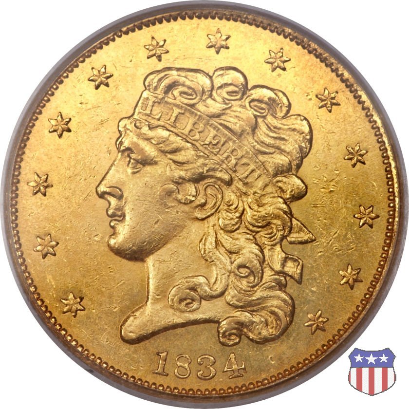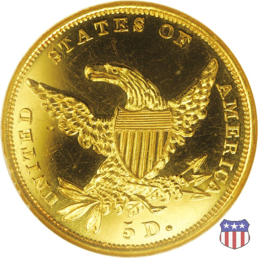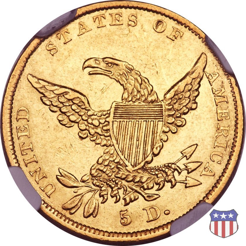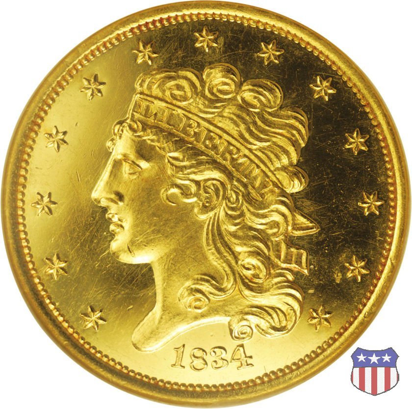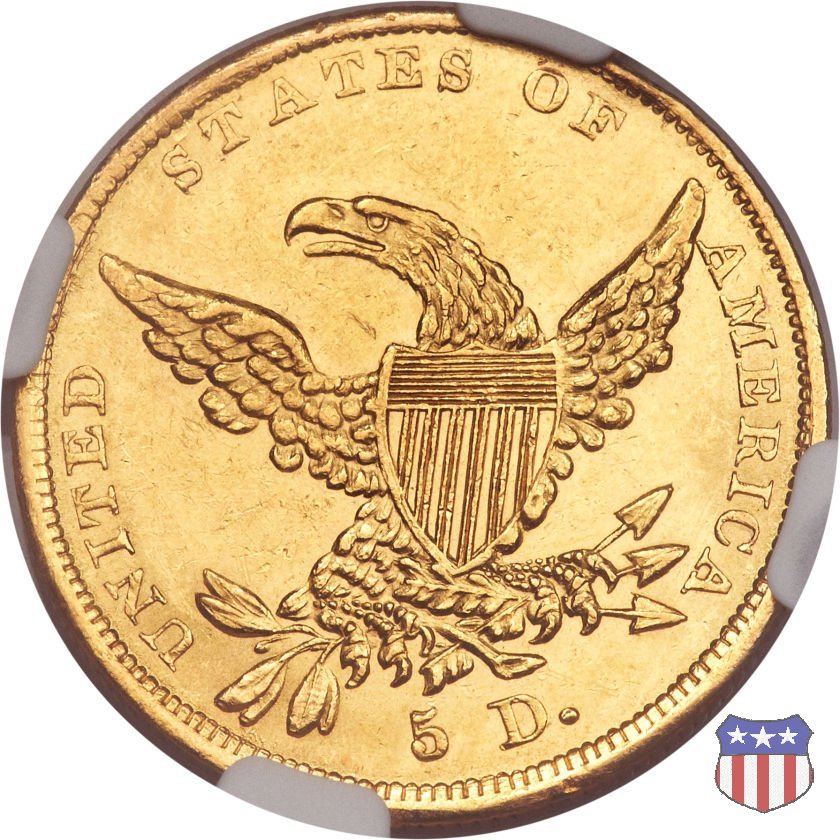 Nel 1834, dopo che una piccola parte di monete era stata coniata nella tipologia "Capped Head", la mezza aquila venne ridisegnata da William Kneass, secondo "Chief-Engraver" della Zecca dal 1824 al 1840, anno della sua morte. Kneass disegna come Liberty una ragazza piú giovane dei modelli precedenti, con un nastro che lega i suoi lunghi, riccioluti, capelli. Al rovescio, riprende l'aquila di Reich, ad ali spiegate con scudo sul petto, eliminando però il motto E PLURIBUS UNUM. Gli stessi disegni, negli stessi anni, furono utilizzati da Kneass anche per le "Quarter Eagles". Questa tipologia ridusse sia il diametro, da 23,8 a 22,5 mm., che il peso, da 8,75 a 8,36 grammi. Il titolo dell'oro venne dapprima calato, da 916,7 a 899,2, per poi passare, nel 1837, a 900. Per la prima volta le "Half Eagles" vennero coniate, oltre che a Philadelphia, nelle Zecche, aperte proprio in quegli anni, di Charlotte e Dahlonega. La "Classic Head" fu coniata soltanto per cinque anni, in quantitativi calanti dopo i primi tre, e la si può considerare una moneta di transizione tra le prime tipologie e quella che, a partire dal 1839, percorrerà tutto il secolo fino a sbarcare nel successivo. Segno di zecca: - C Charlotte - D Dahlonega - senza segno Philadelphia | ||||||||