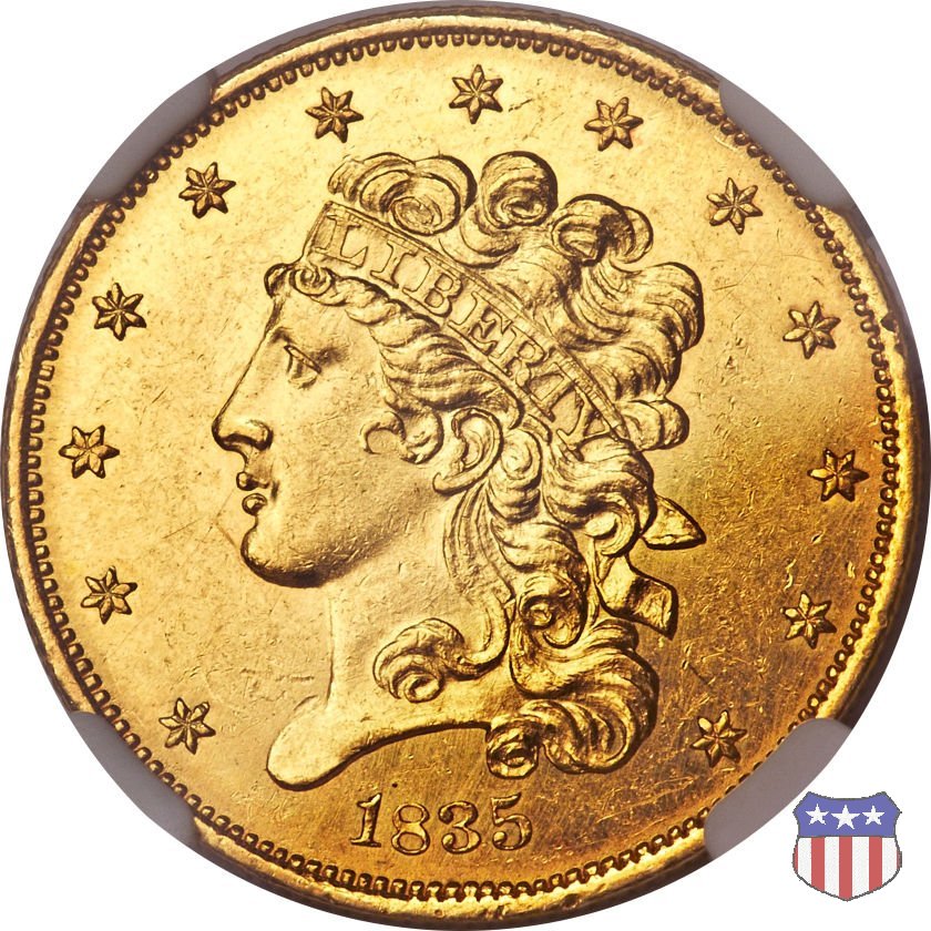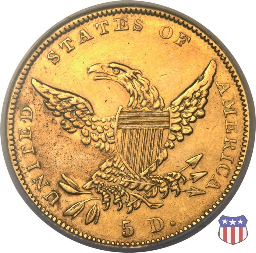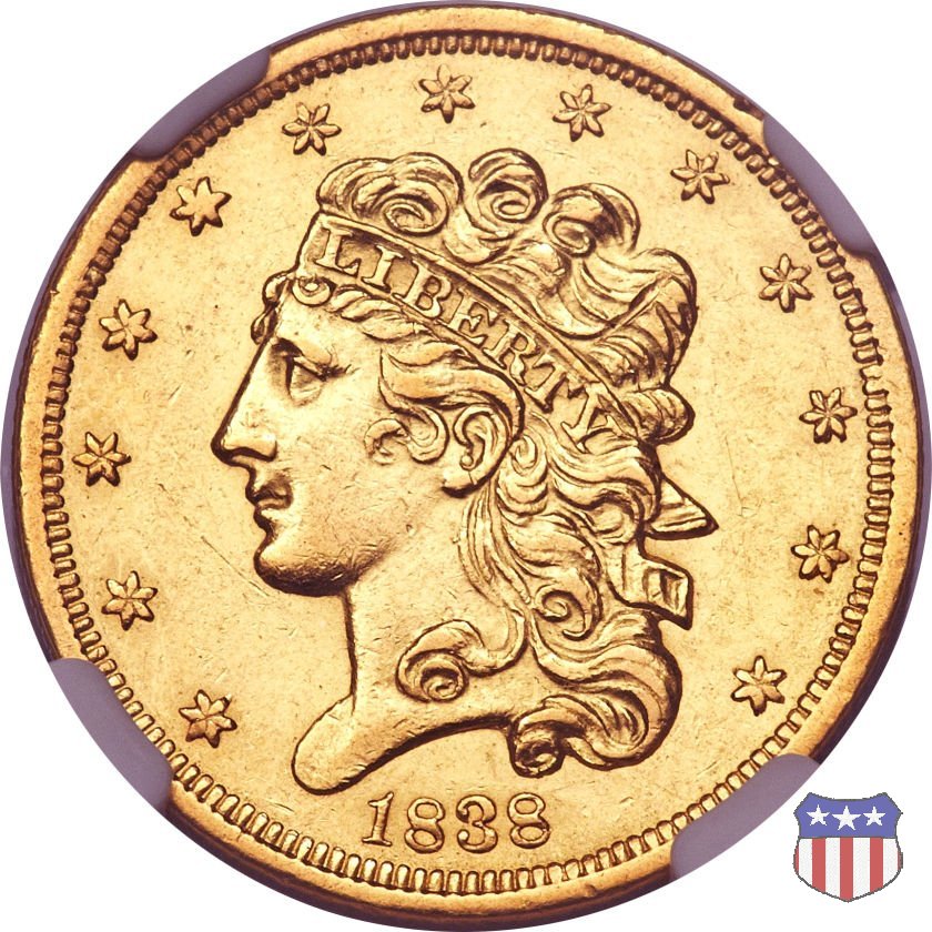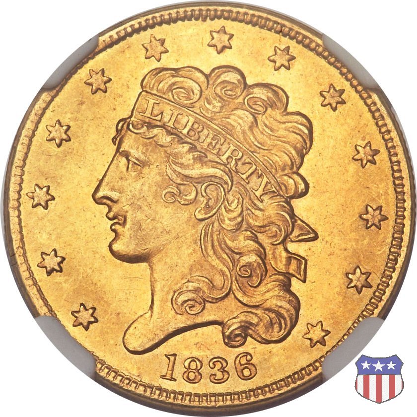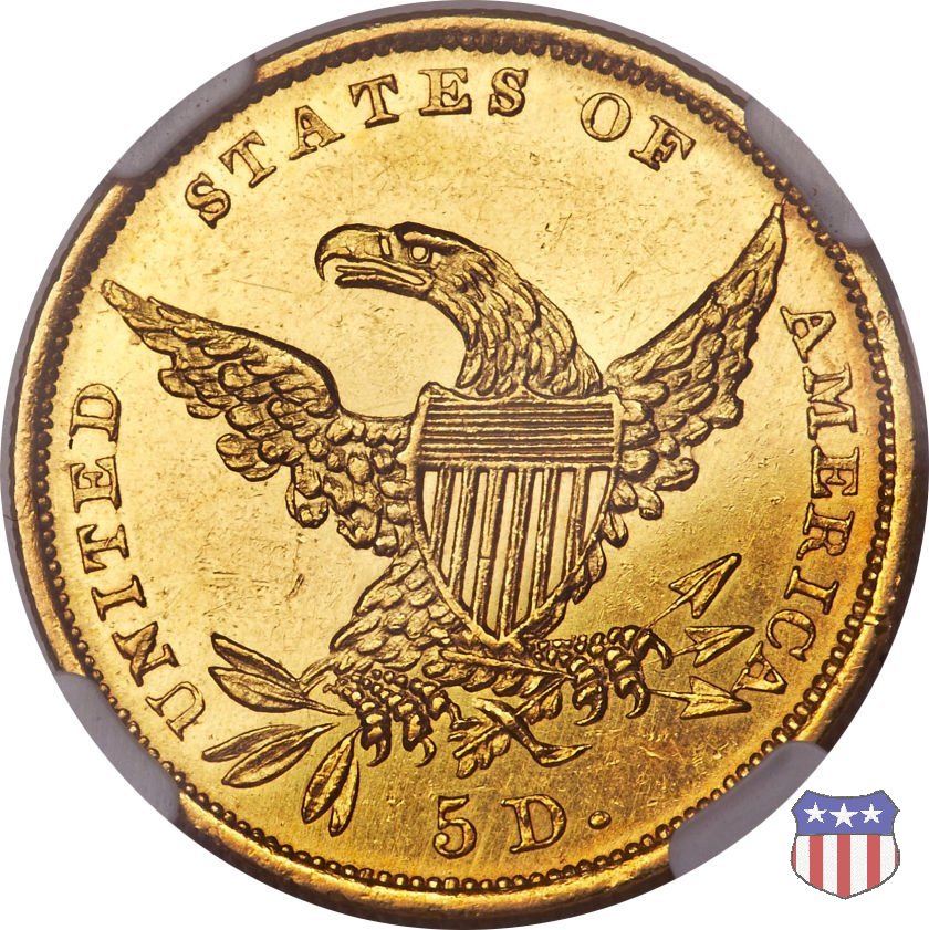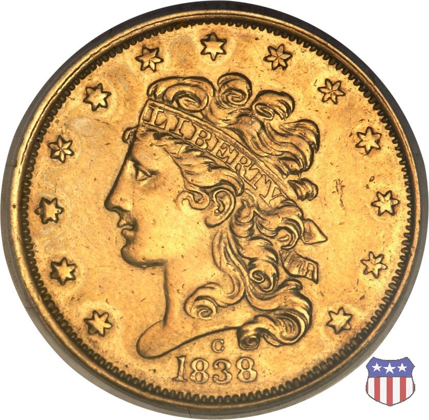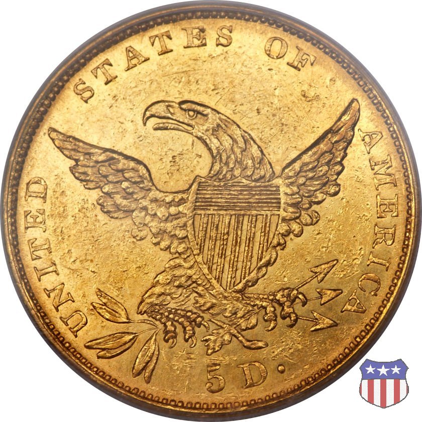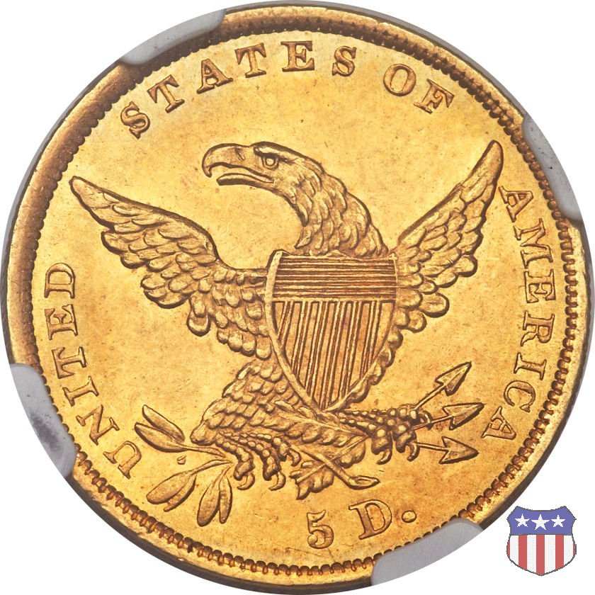 Nel 1834, dopo che una piccola parte di monete era stata coniata nella tipologia "Capped Head", la mezza aquila venne ridisegnata da William Kneass, secondo "Chief-Engraver" della Zecca dal 1824 al 1840, anno della sua morte. Kneass disegna come Liberty una ragazza piú giovane dei modelli precedenti, con un nastro che lega i suoi lunghi, riccioluti, capelli. Al rovescio, riprende l'aquila di Reich, ad ali spiegate con scudo sul petto, eliminando però il motto E PLURIBUS UNUM. Gli stessi disegni, negli stessi anni, furono utilizzati da Kneass anche per le "Quarter Eagles". Questa tipologia ridusse sia il diametro, da 23,8 a 22,5 mm., che il peso, da 8,75 a 8,36 grammi. Il titolo dell'oro venne dapprima calato, da 916,7 a 899,2, per poi passare, nel 1837, a 900. Per la prima volta le "Half Eagles" vennero coniate, oltre che a Philadelphia, nelle Zecche, aperte proprio in quegli anni, di Charlotte e Dahlonega. La "Classic Head" fu coniata soltanto per cinque anni, in quantitativi calanti dopo i primi tre, e la si può considerare una moneta di transizione tra le prime tipologie e quella che, a partire dal 1839, percorrerà tutto il secolo fino a sbarcare nel successivo. Segno di zecca: - C Charlotte - D Dahlonega - senza segno Philadelphia | ||||||||