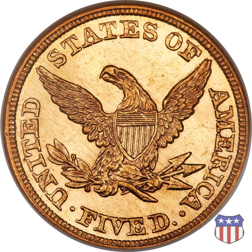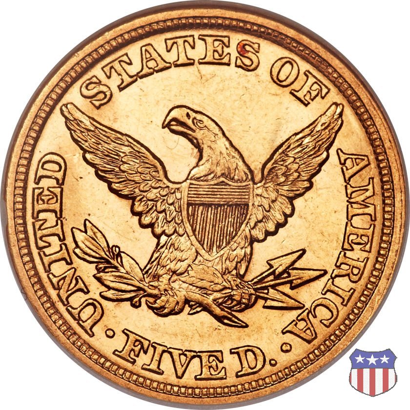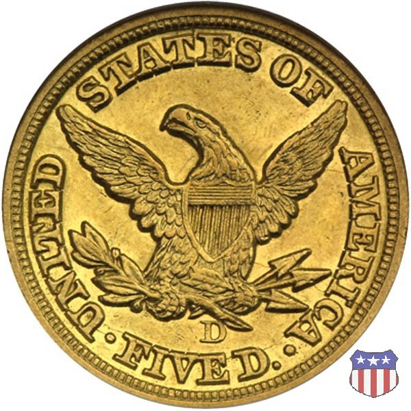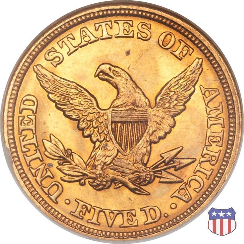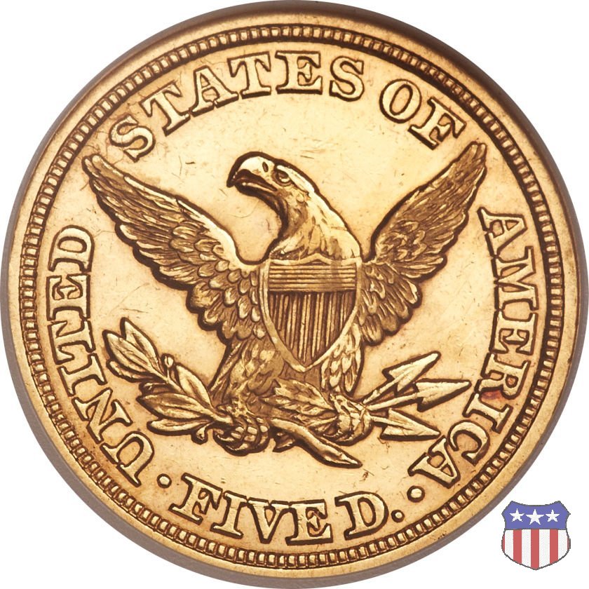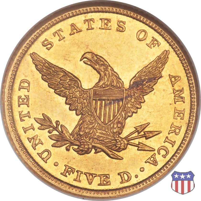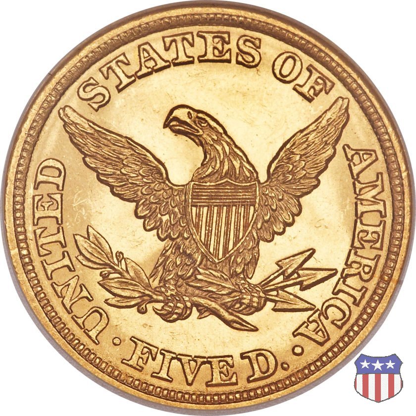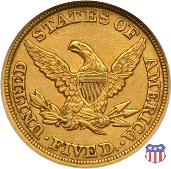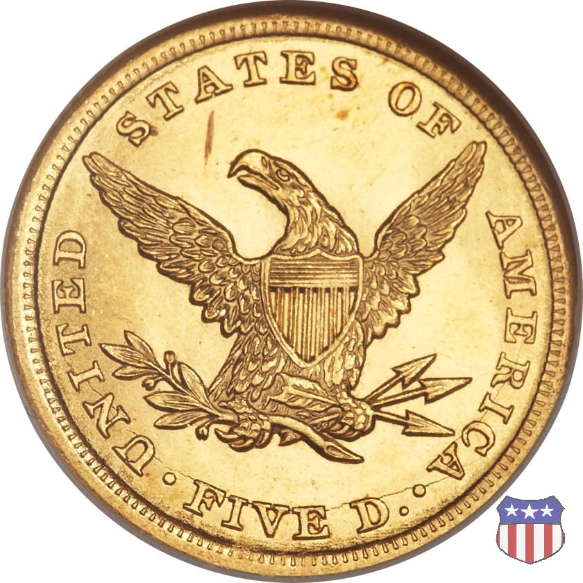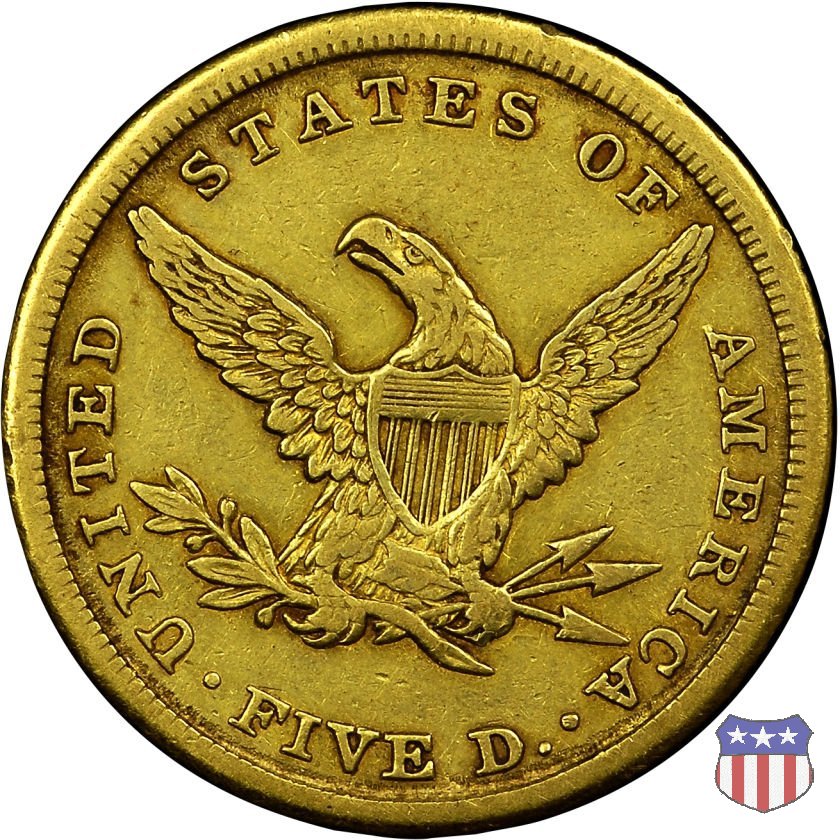 Negli stessi anni in cui creava il dollaro e le altre monete d'argento conosciute come "Liberty Seated", Christian Gobrecht lavorò anche sulle monete d'oro, sia da 2,50 che da 5 e 10 dollari, proponendo per tutte le stesso disegno (unica variante la presenza o meno del motto sulle monete da 5 e 10 dollari). Conosciuto come "Liberty Head", sulla "Half Eagle" questo disegno è stato utilizzato dal 1840 al 1866 nella variante "No Motto", e dal 1866 al 1908 con l'aggiunta del motto IN GOD WE TRUST in un cartiglio sopra la testa dell'aquila. Il dritto mostra una testa coronata di Liberty di ispirazione neoclassica, mentre il rovescio ripropone l'aquila ad ali spiegate con scudo sul petto già vista nelle tipologie precedenti. Da segnalare nella tipologia "No Motto", la grande rarità delle prime coniazioni di San Francisco, nel 1854. Appena 268 esemplari coniati, di cui soltanto tre sono oggi conosciuti. Nel 1840 è stato variato il diametro delle monete. Dopo che una parte di esse era stata coniata a 22,5 mm., si è passati a un diametro piú piccolo, 21,6 mm., mantenuto poi fino al 1929, ultimo anno di coniazione delle "Half Eagles". Segno di zecca: - C Charlotte - D Dahlonega - O New Orleans - S San Francisco - senza segno Philadelphia | ||||||||||||||||