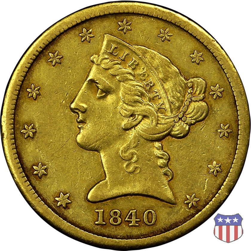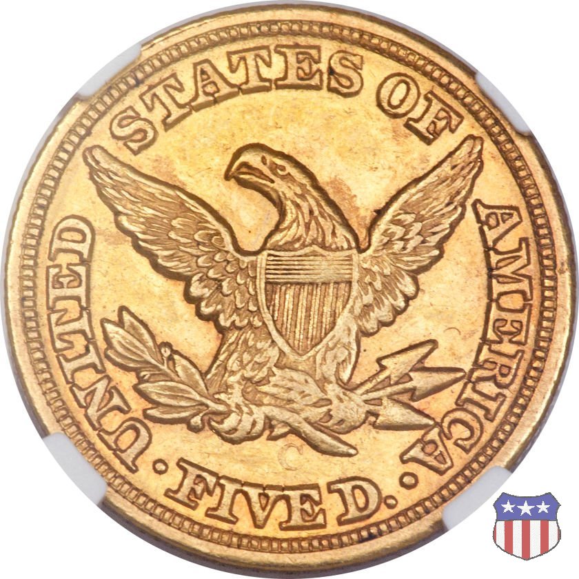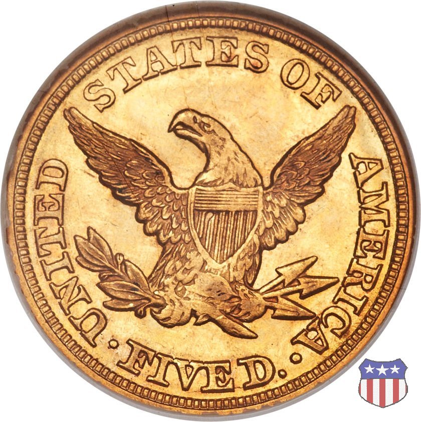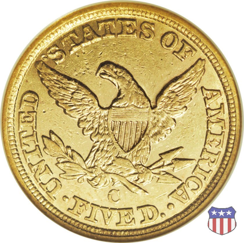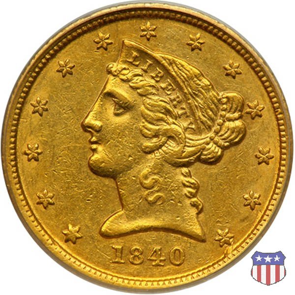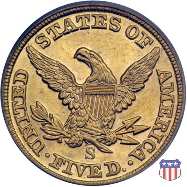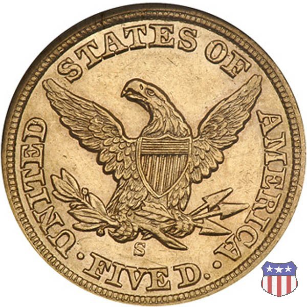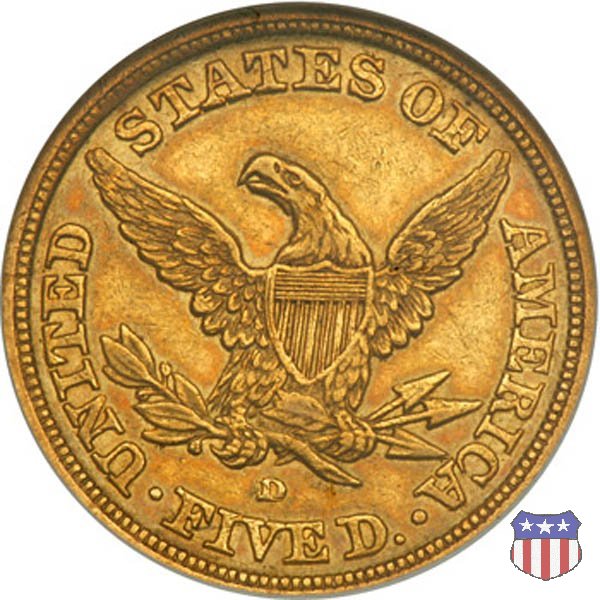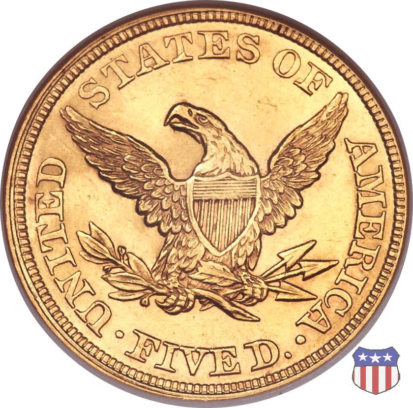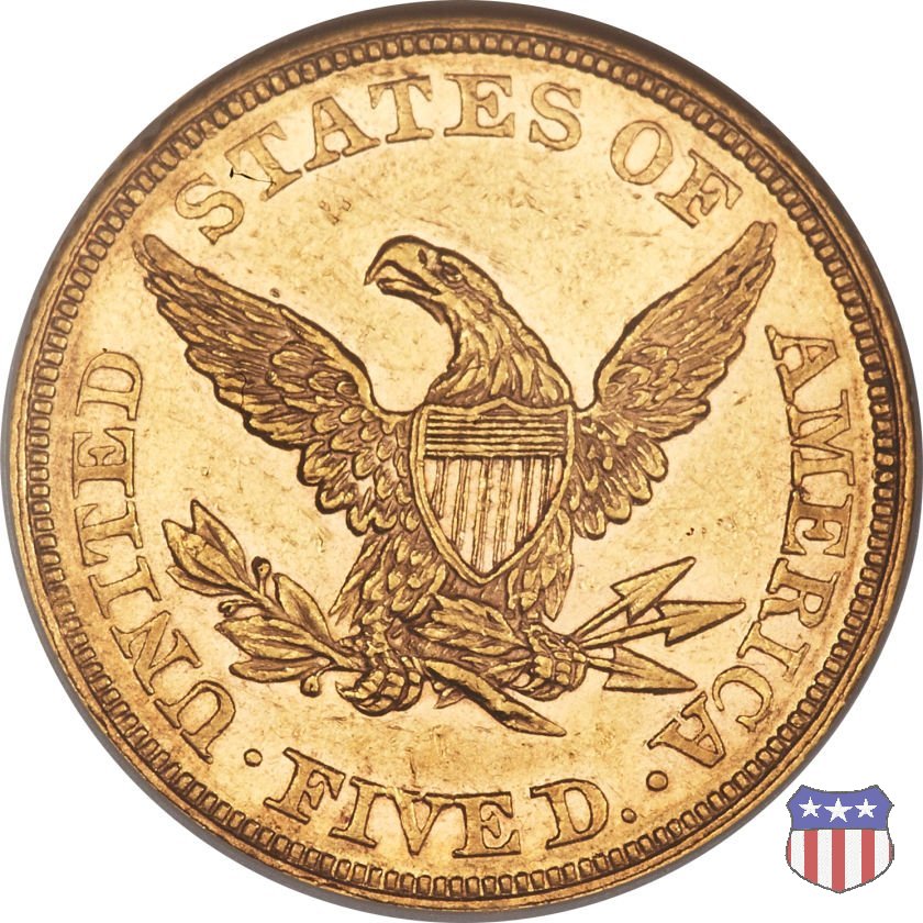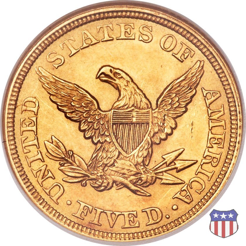 Negli stessi anni in cui creava il dollaro e le altre monete d'argento conosciute come "Liberty Seated", Christian Gobrecht lavorò anche sulle monete d'oro, sia da 2,50 che da 5 e 10 dollari, proponendo per tutte le stesso disegno (unica variante la presenza o meno del motto sulle monete da 5 e 10 dollari). Conosciuto come "Liberty Head", sulla "Half Eagle" questo disegno è stato utilizzato dal 1840 al 1866 nella variante "No Motto", e dal 1866 al 1908 con l'aggiunta del motto IN GOD WE TRUST in un cartiglio sopra la testa dell'aquila. Il dritto mostra una testa coronata di Liberty di ispirazione neoclassica, mentre il rovescio ripropone l'aquila ad ali spiegate con scudo sul petto già vista nelle tipologie precedenti. Da segnalare nella tipologia "No Motto", la grande rarità delle prime coniazioni di San Francisco, nel 1854. Appena 268 esemplari coniati, di cui soltanto tre sono oggi conosciuti. Nel 1840 è stato variato il diametro delle monete. Dopo che una parte di esse era stata coniata a 22,5 mm., si è passati a un diametro piú piccolo, 21,6 mm., mantenuto poi fino al 1929, ultimo anno di coniazione delle "Half Eagles". Segno di zecca: - C Charlotte - D Dahlonega - O New Orleans - S San Francisco - senza segno Philadelphia | ||||||||||||||||