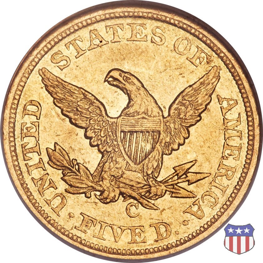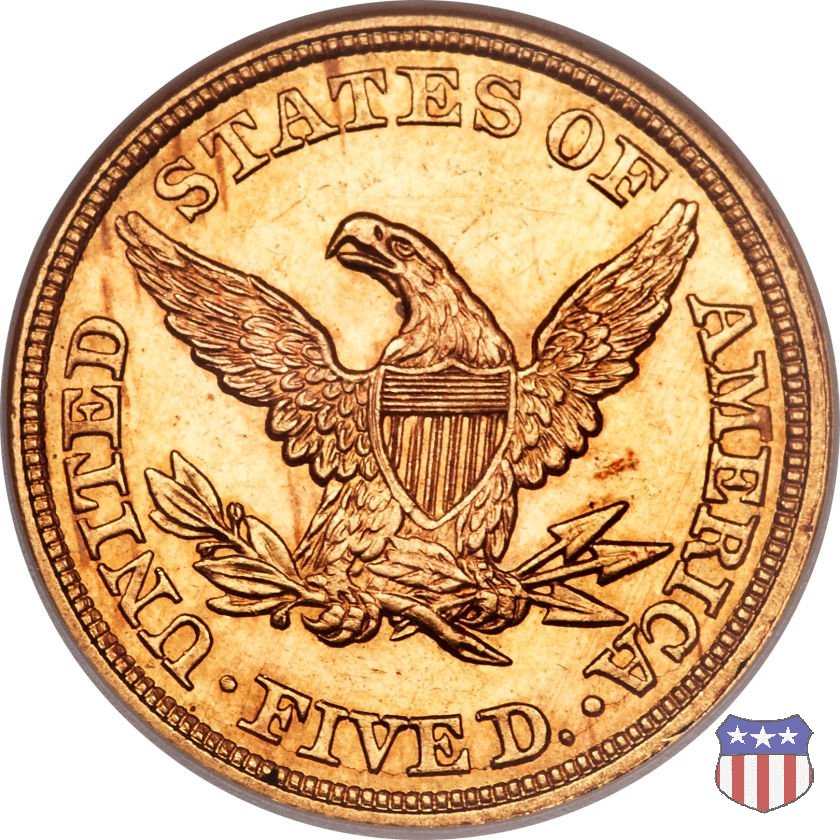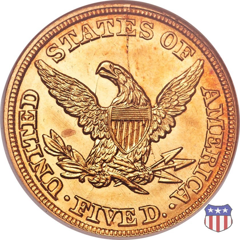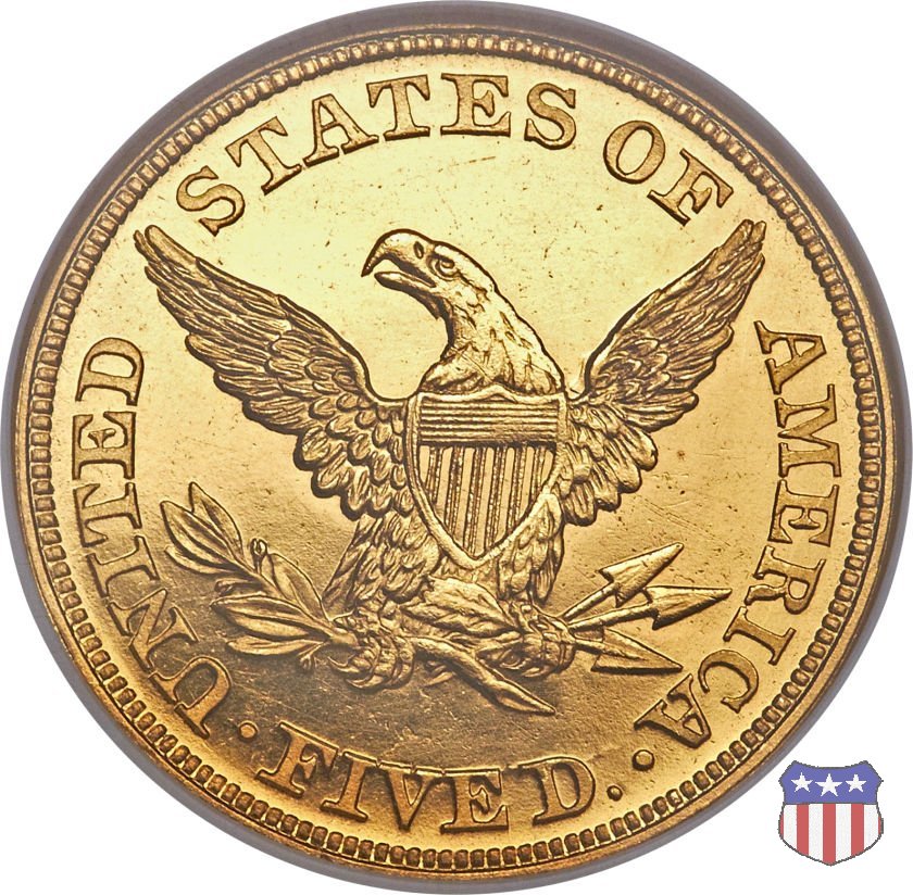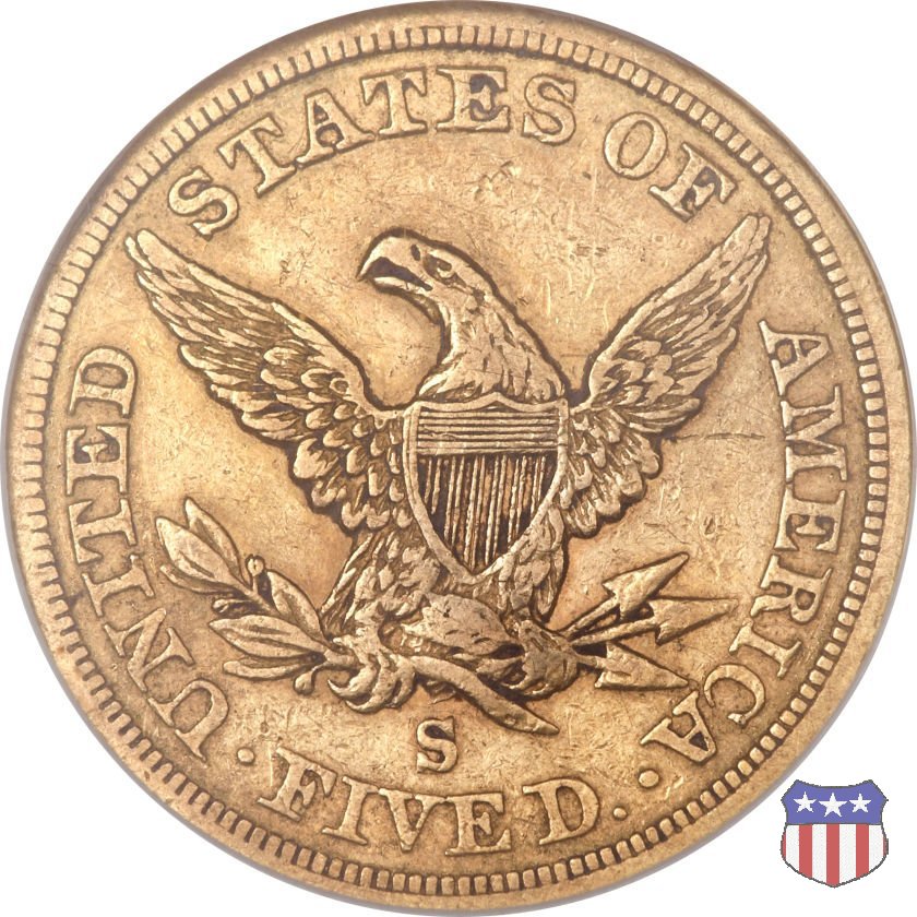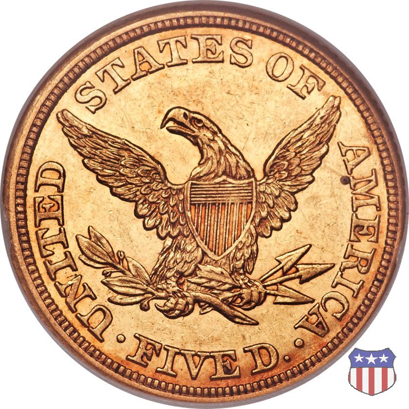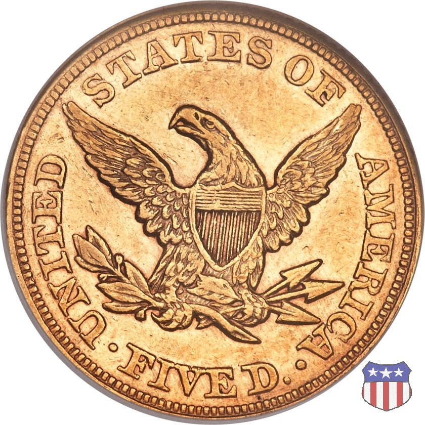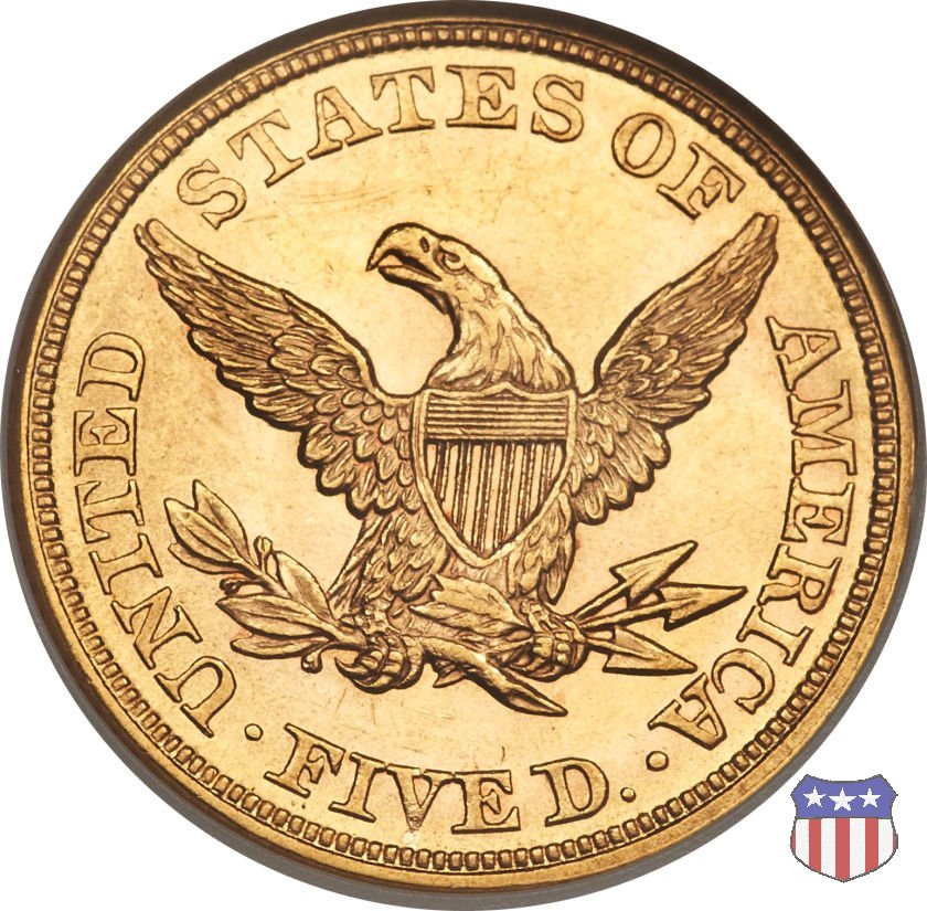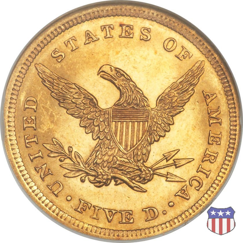 Negli stessi anni in cui creava il dollaro e le altre monete d'argento conosciute come "Liberty Seated", Christian Gobrecht lavorò anche sulle monete d'oro, sia da 2,50 che da 5 e 10 dollari, proponendo per tutte le stesso disegno (unica variante la presenza o meno del motto sulle monete da 5 e 10 dollari). Conosciuto come "Liberty Head", sulla "Half Eagle" questo disegno è stato utilizzato dal 1840 al 1866 nella variante "No Motto", e dal 1866 al 1908 con l'aggiunta del motto IN GOD WE TRUST in un cartiglio sopra la testa dell'aquila. Il dritto mostra una testa coronata di Liberty di ispirazione neoclassica, mentre il rovescio ripropone l'aquila ad ali spiegate con scudo sul petto già vista nelle tipologie precedenti. Da segnalare nella tipologia "No Motto", la grande rarità delle prime coniazioni di San Francisco, nel 1854. Appena 268 esemplari coniati, di cui soltanto tre sono oggi conosciuti. Nel 1840 è stato variato il diametro delle monete. Dopo che una parte di esse era stata coniata a 22,5 mm., si è passati a un diametro piú piccolo, 21,6 mm., mantenuto poi fino al 1929, ultimo anno di coniazione delle "Half Eagles". Segno di zecca: - C Charlotte - D Dahlonega - O New Orleans - S San Francisco - senza segno Philadelphia | ||||||||||||||||