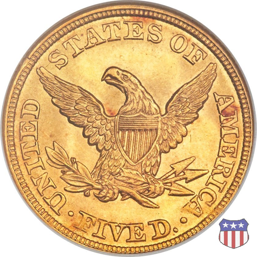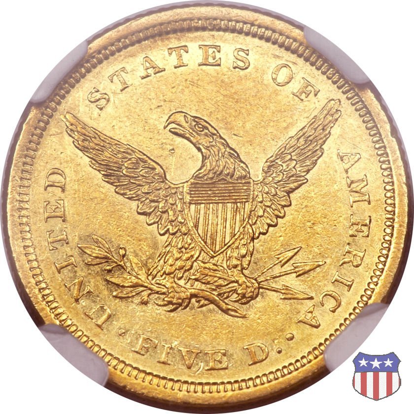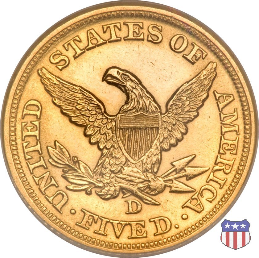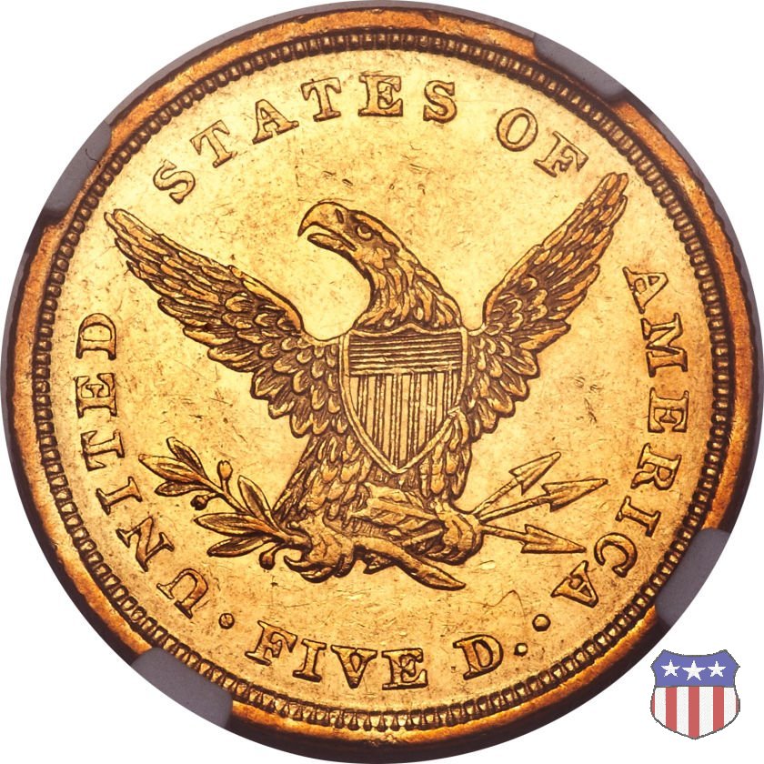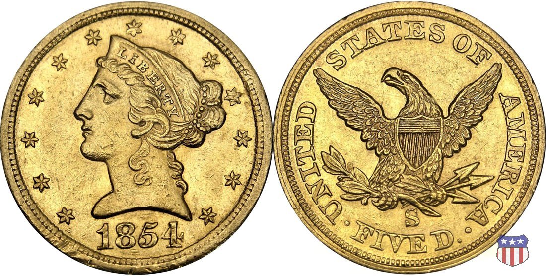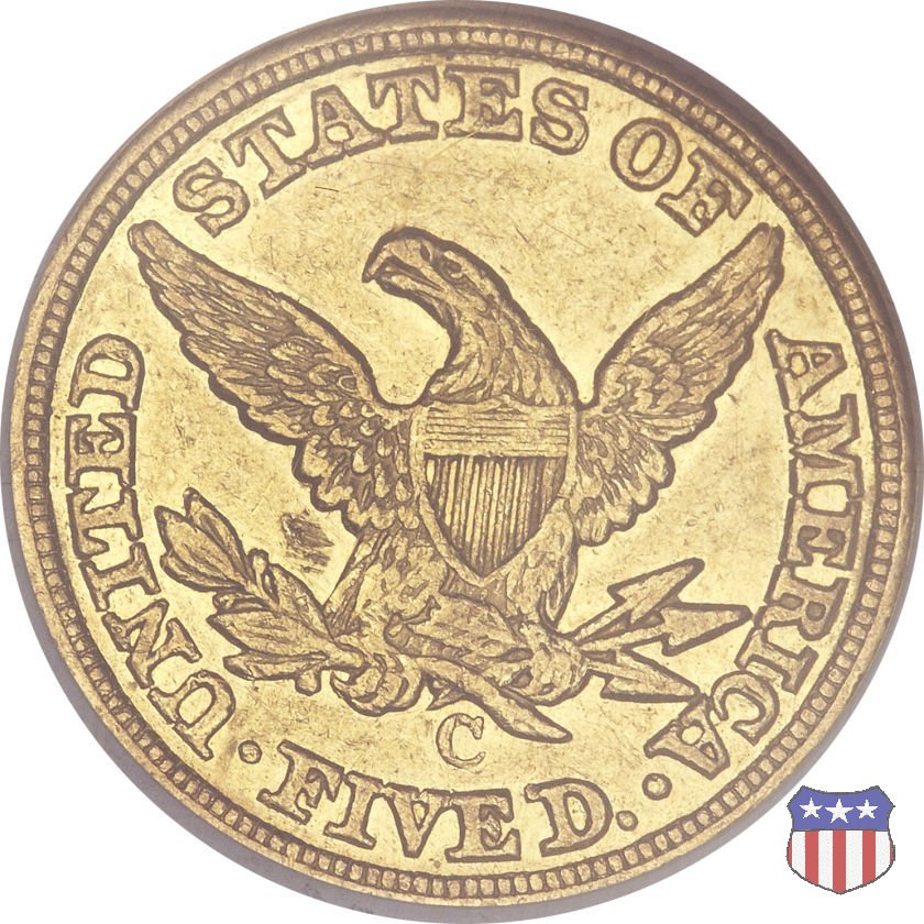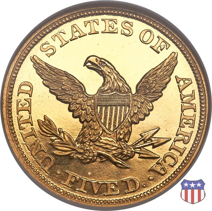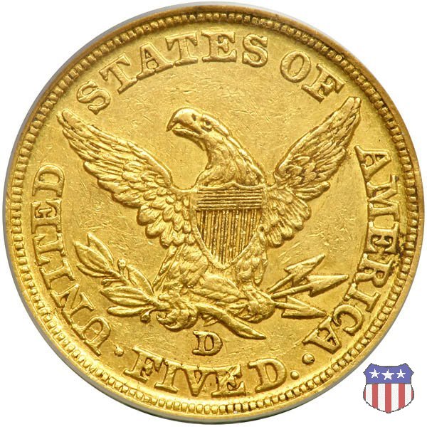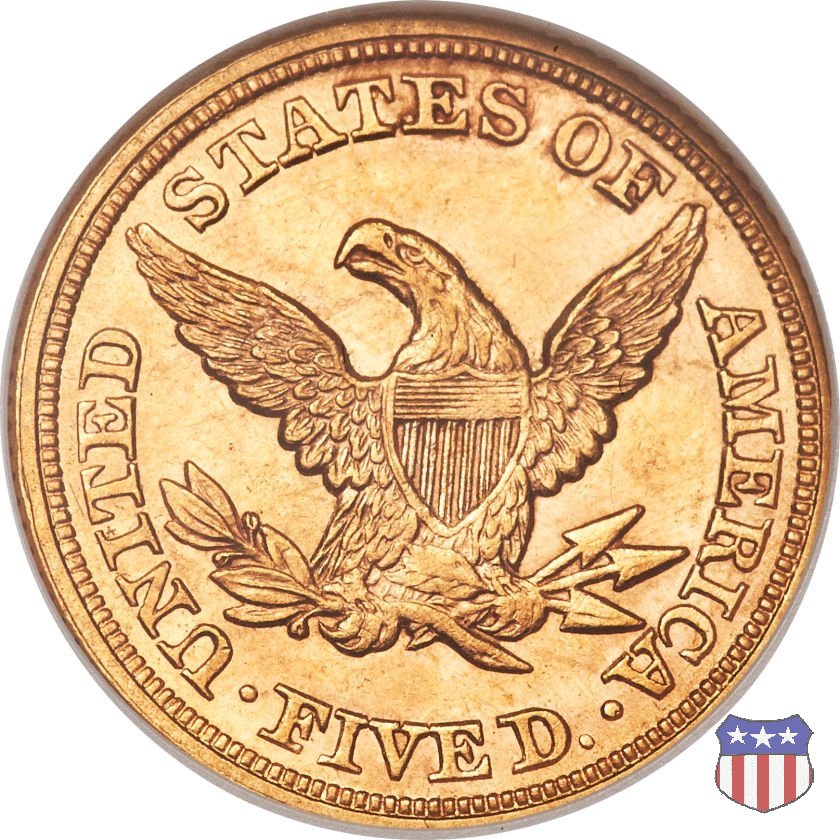 Negli stessi anni in cui creava il dollaro e le altre monete d'argento conosciute come "Liberty Seated", Christian Gobrecht lavorò anche sulle monete d'oro, sia da 2,50 che da 5 e 10 dollari, proponendo per tutte le stesso disegno (unica variante la presenza o meno del motto sulle monete da 5 e 10 dollari). Conosciuto come "Liberty Head", sulla "Half Eagle" questo disegno è stato utilizzato dal 1840 al 1866 nella variante "No Motto", e dal 1866 al 1908 con l'aggiunta del motto IN GOD WE TRUST in un cartiglio sopra la testa dell'aquila. Il dritto mostra una testa coronata di Liberty di ispirazione neoclassica, mentre il rovescio ripropone l'aquila ad ali spiegate con scudo sul petto già vista nelle tipologie precedenti. Da segnalare nella tipologia "No Motto", la grande rarità delle prime coniazioni di San Francisco, nel 1854. Appena 268 esemplari coniati, di cui soltanto tre sono oggi conosciuti. Nel 1840 è stato variato il diametro delle monete. Dopo che una parte di esse era stata coniata a 22,5 mm., si è passati a un diametro piú piccolo, 21,6 mm., mantenuto poi fino al 1929, ultimo anno di coniazione delle "Half Eagles". Segno di zecca: - C Charlotte - D Dahlonega - O New Orleans - S San Francisco - senza segno Philadelphia | ||||||||||||||||