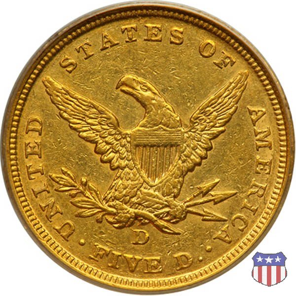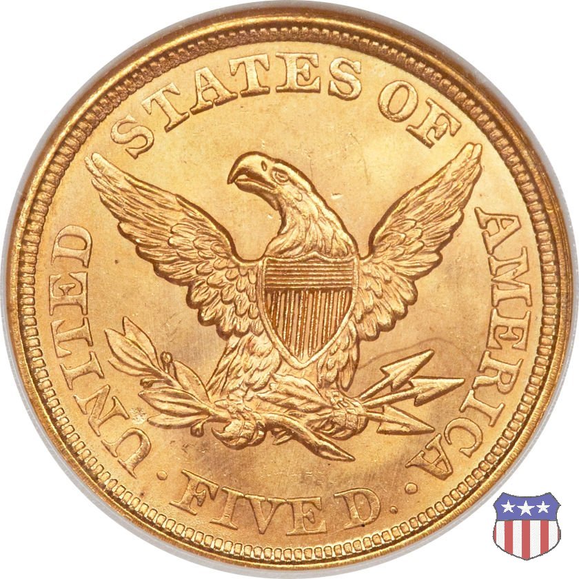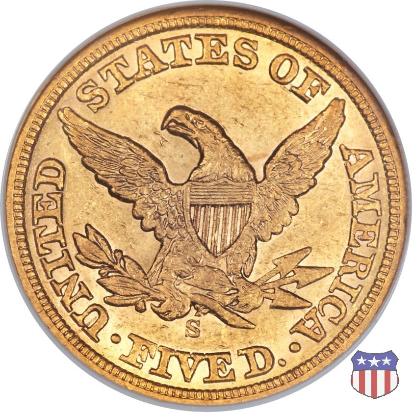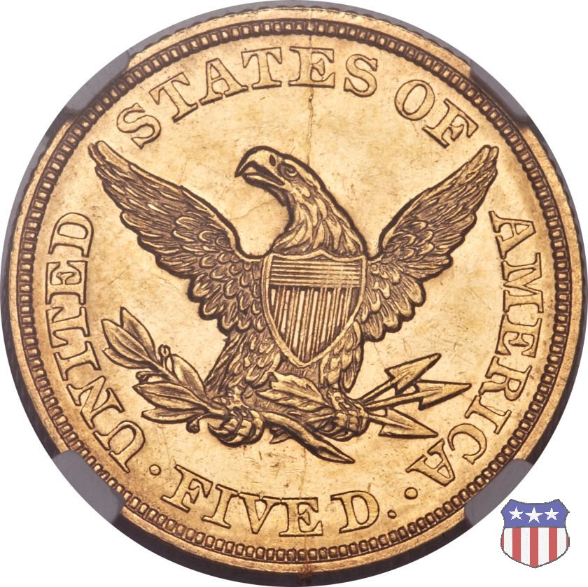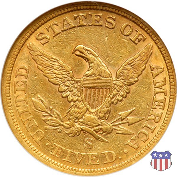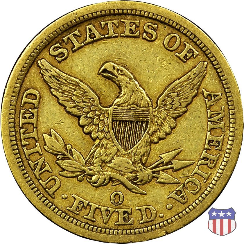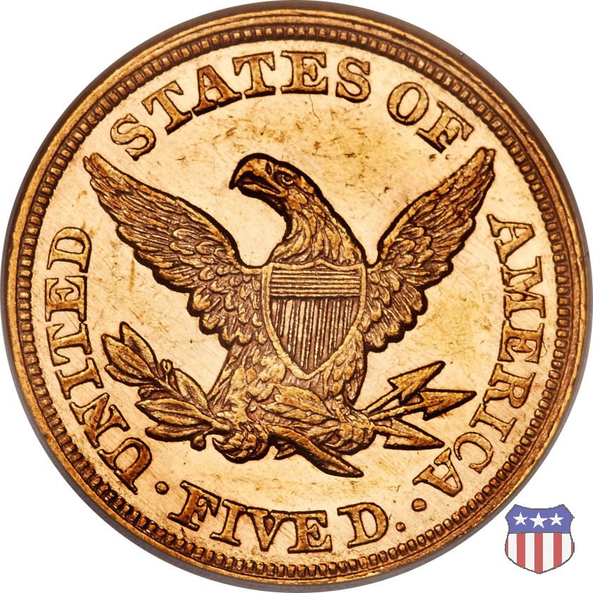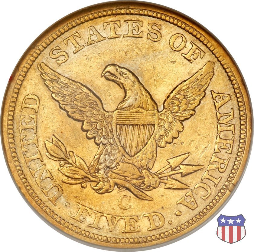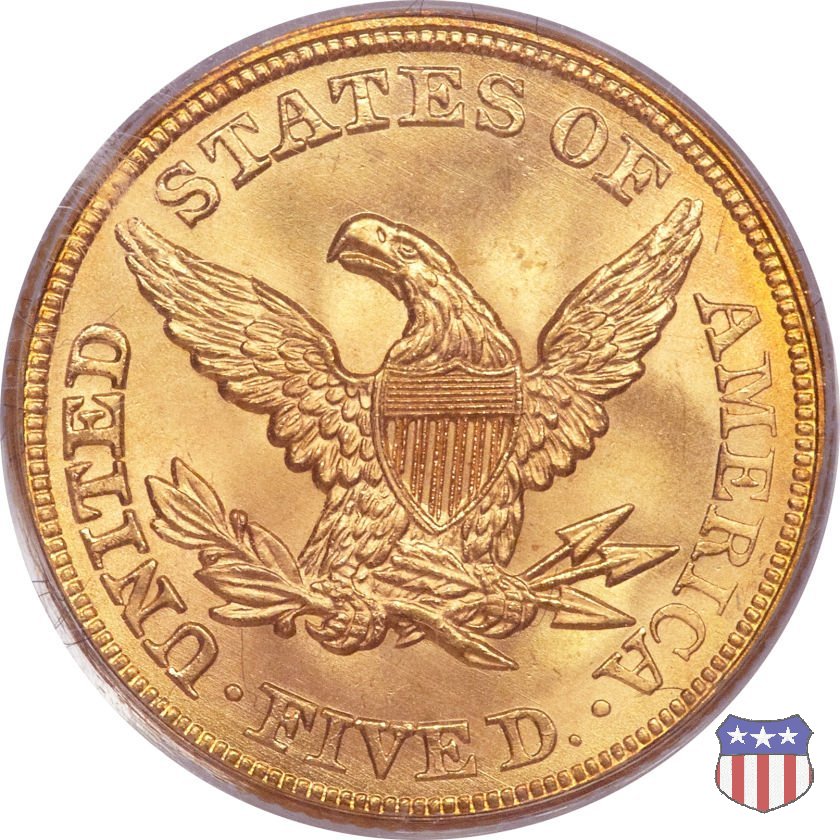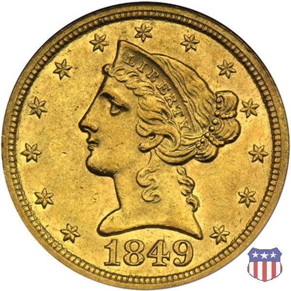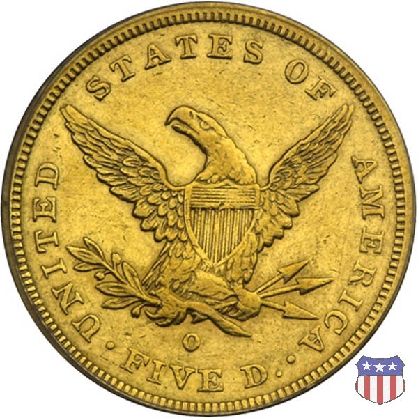Negli stessi anni in cui creava il dollaro e le altre monete d'argento conosciute come "Liberty Seated", Christian Gobrecht lavorò anche sulle monete d'oro, sia da 2,50 che da 5 e 10 dollari, proponendo per tutte le stesso disegno (unica variante la presenza o meno del motto sulle monete da 5 e 10 dollari). Conosciuto come "Liberty Head", sulla "Half Eagle" questo disegno è stato utilizzato dal 1840 al 1866 nella variante "No Motto", e dal 1866 al 1908 con l'aggiunta del motto IN GOD WE TRUST in un cartiglio sopra la testa dell'aquila. Il dritto mostra una testa coronata di Liberty di ispirazione neoclassica, mentre il rovescio ripropone l'aquila ad ali spiegate con scudo sul petto già vista nelle tipologie precedenti. Da segnalare nella tipologia "No Motto", la grande rarità delle prime coniazioni di San Francisco, nel 1854. Appena 268 esemplari coniati, di cui soltanto tre sono oggi conosciuti. Nel 1840 è stato variato il diametro delle monete. Dopo che una parte di esse era stata coniata a 22,5 mm., si è passati a un diametro piú piccolo, 21,6 mm., mantenuto poi fino al 1929, ultimo anno di coniazione delle "Half Eagles". Segno di zecca: - C Charlotte - D Dahlonega - O New Orleans - S San Francisco - senza segno Philadelphia | ||||||||||||||||