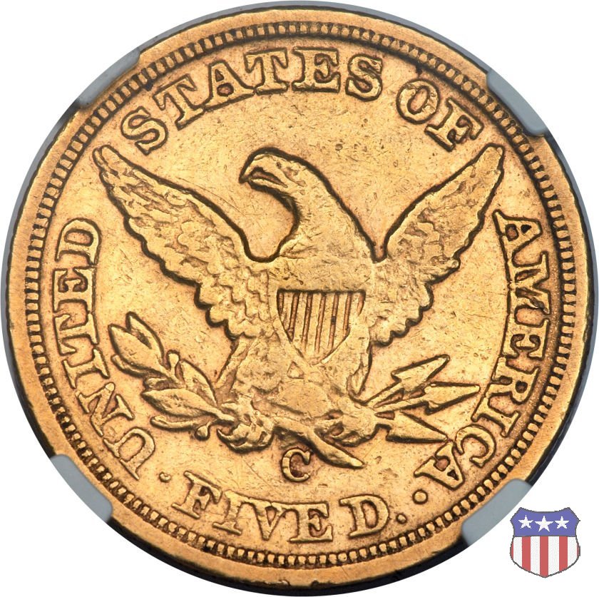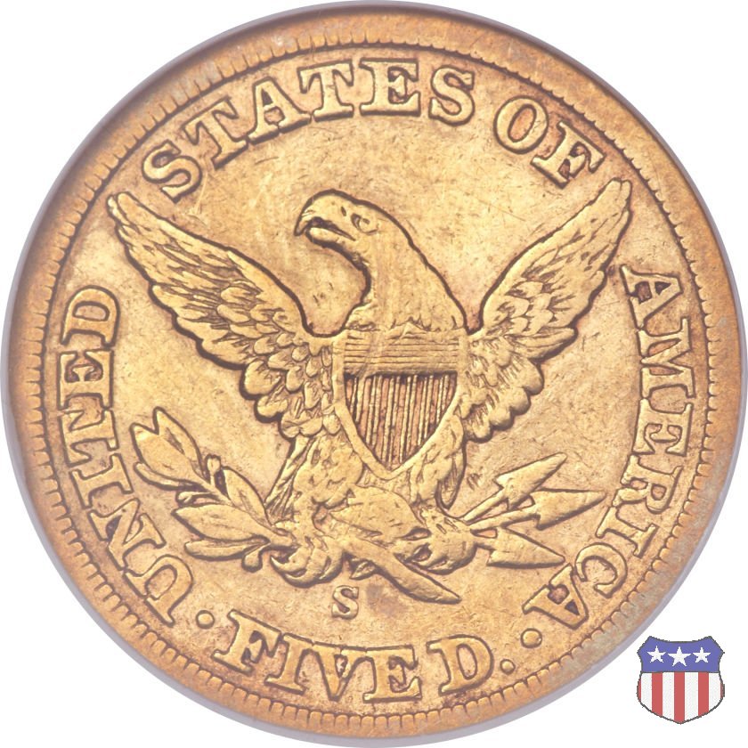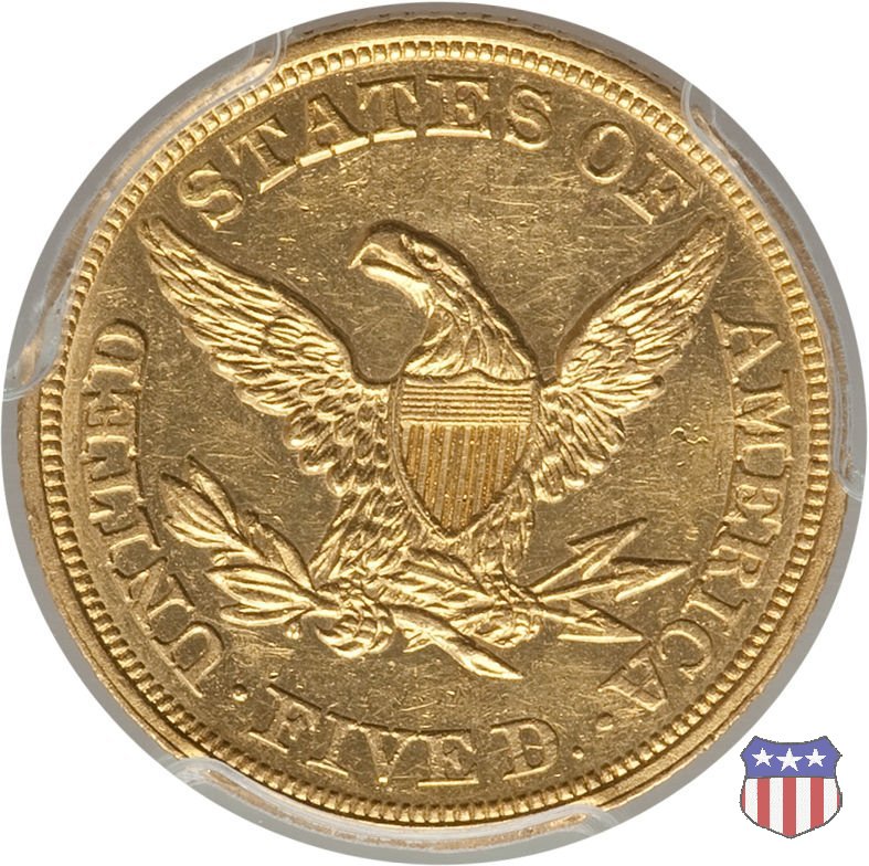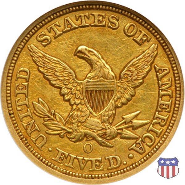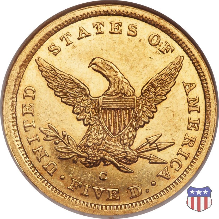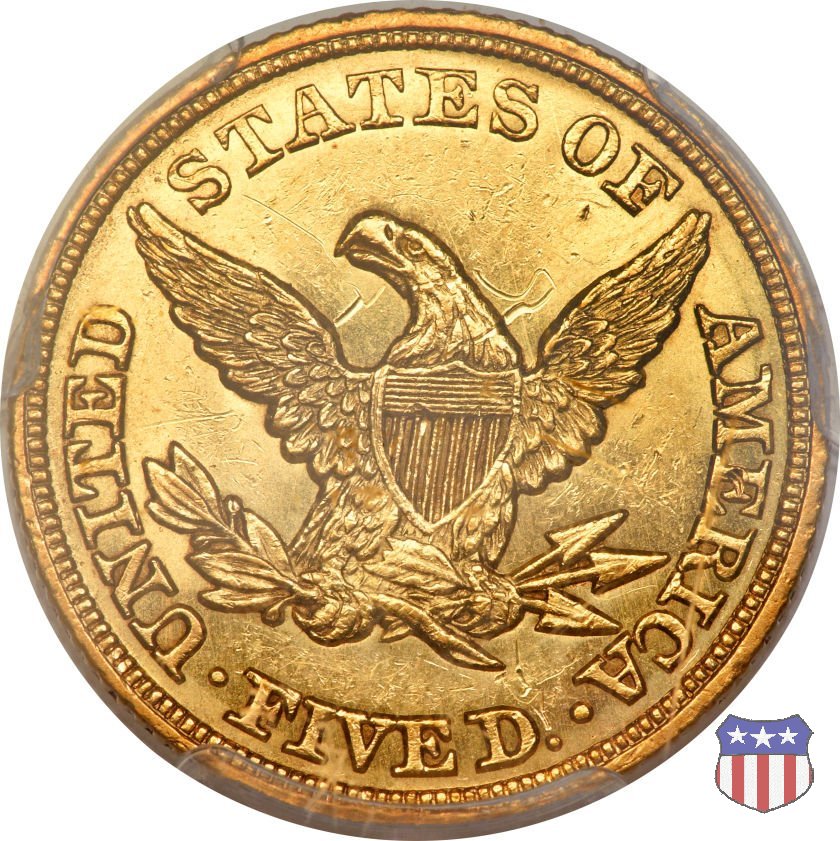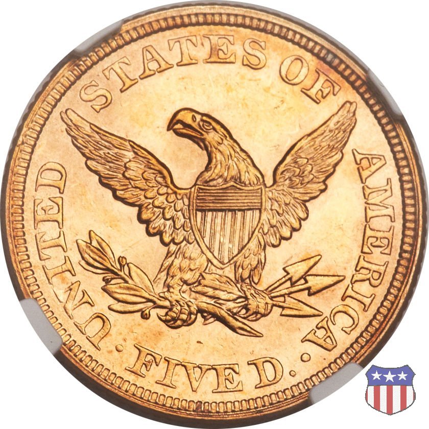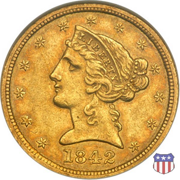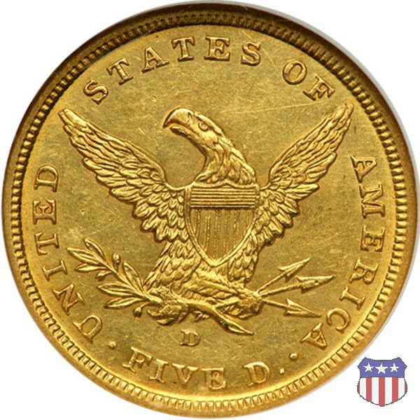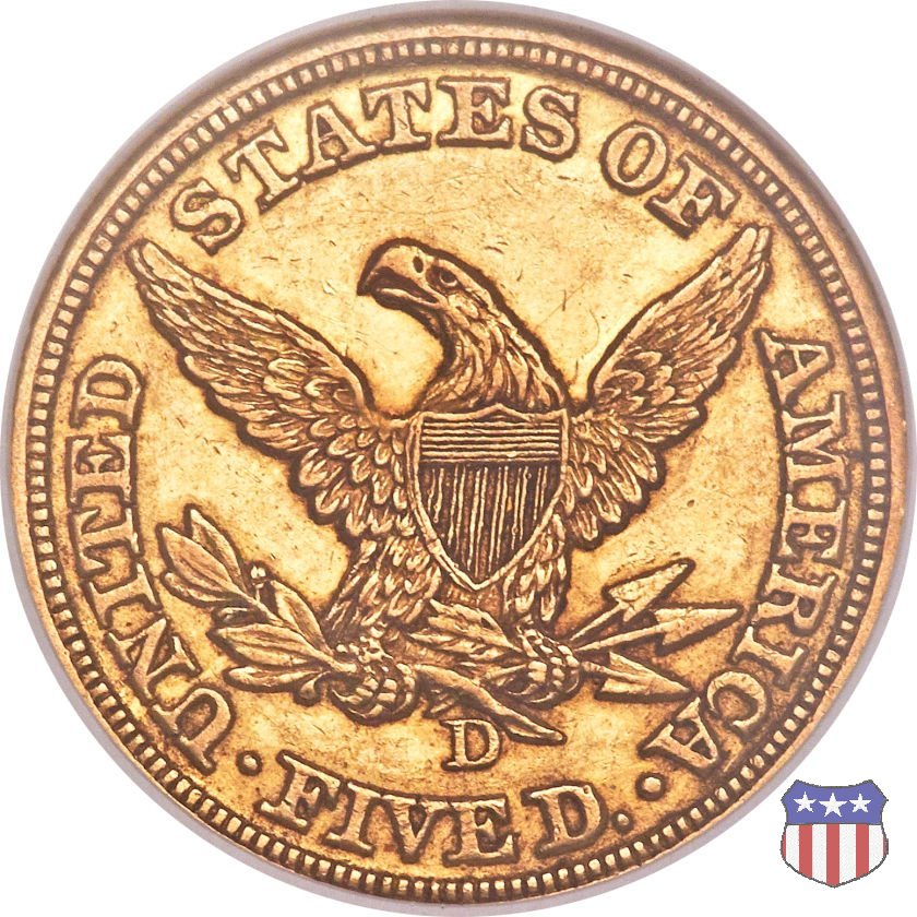 Negli stessi anni in cui creava il dollaro e le altre monete d'argento conosciute come "Liberty Seated", Christian Gobrecht lavorò anche sulle monete d'oro, sia da 2,50 che da 5 e 10 dollari, proponendo per tutte le stesso disegno (unica variante la presenza o meno del motto sulle monete da 5 e 10 dollari). Conosciuto come "Liberty Head", sulla "Half Eagle" questo disegno è stato utilizzato dal 1840 al 1866 nella variante "No Motto", e dal 1866 al 1908 con l'aggiunta del motto IN GOD WE TRUST in un cartiglio sopra la testa dell'aquila. Il dritto mostra una testa coronata di Liberty di ispirazione neoclassica, mentre il rovescio ripropone l'aquila ad ali spiegate con scudo sul petto già vista nelle tipologie precedenti. Da segnalare nella tipologia "No Motto", la grande rarità delle prime coniazioni di San Francisco, nel 1854. Appena 268 esemplari coniati, di cui soltanto tre sono oggi conosciuti. Nel 1840 è stato variato il diametro delle monete. Dopo che una parte di esse era stata coniata a 22,5 mm., si è passati a un diametro piú piccolo, 21,6 mm., mantenuto poi fino al 1929, ultimo anno di coniazione delle "Half Eagles". Segno di zecca: - C Charlotte - D Dahlonega - O New Orleans - S San Francisco - senza segno Philadelphia | ||||||||||||||||