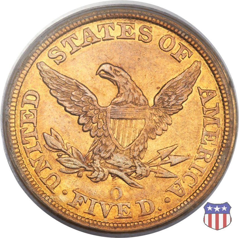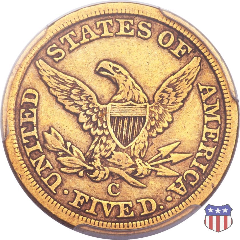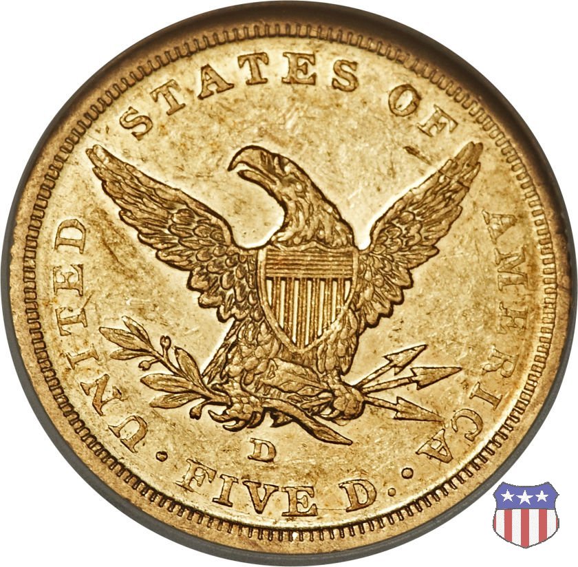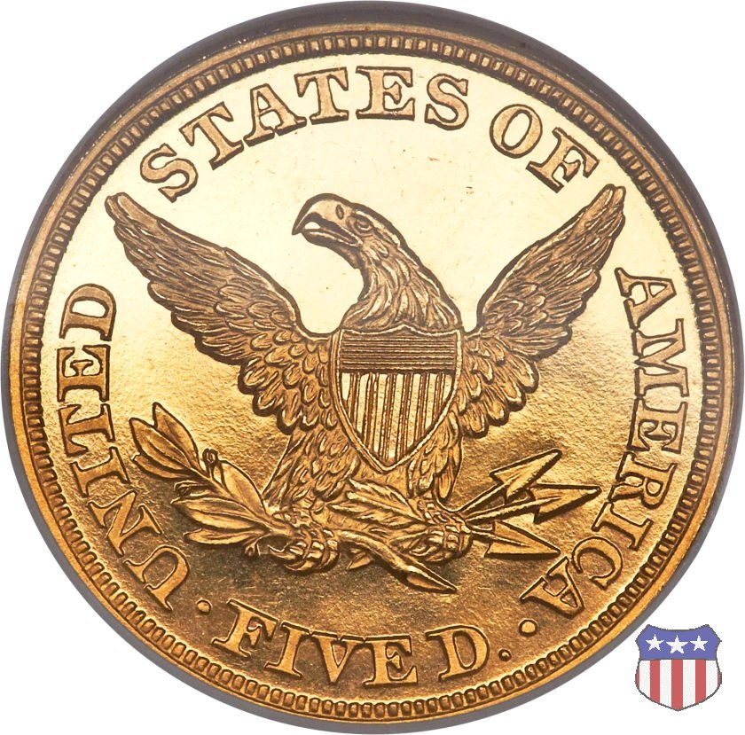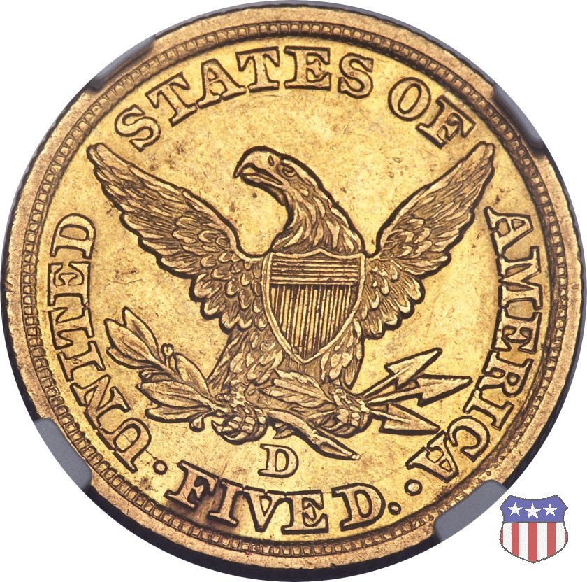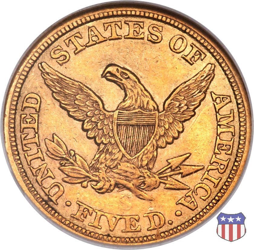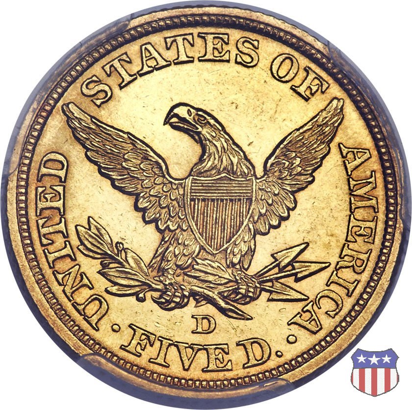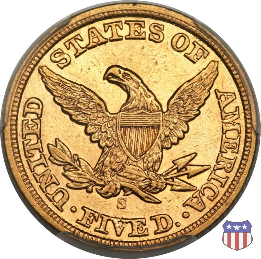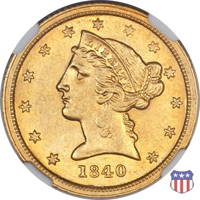 Negli stessi anni in cui creava il dollaro e le altre monete d'argento conosciute come "Liberty Seated", Christian Gobrecht lavorò anche sulle monete d'oro, sia da 2,50 che da 5 e 10 dollari, proponendo per tutte le stesso disegno (unica variante la presenza o meno del motto sulle monete da 5 e 10 dollari). Conosciuto come "Liberty Head", sulla "Half Eagle" questo disegno è stato utilizzato dal 1840 al 1866 nella variante "No Motto", e dal 1866 al 1908 con l'aggiunta del motto IN GOD WE TRUST in un cartiglio sopra la testa dell'aquila. Il dritto mostra una testa coronata di Liberty di ispirazione neoclassica, mentre il rovescio ripropone l'aquila ad ali spiegate con scudo sul petto già vista nelle tipologie precedenti. Da segnalare nella tipologia "No Motto", la grande rarità delle prime coniazioni di San Francisco, nel 1854. Appena 268 esemplari coniati, di cui soltanto tre sono oggi conosciuti. Nel 1840 è stato variato il diametro delle monete. Dopo che una parte di esse era stata coniata a 22,5 mm., si è passati a un diametro piú piccolo, 21,6 mm., mantenuto poi fino al 1929, ultimo anno di coniazione delle "Half Eagles". Segno di zecca: - C Charlotte - D Dahlonega - O New Orleans - S San Francisco - senza segno Philadelphia | ||||||||||||||||