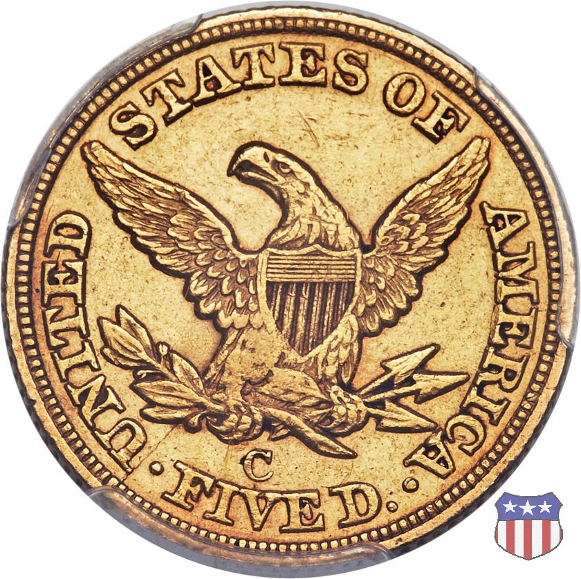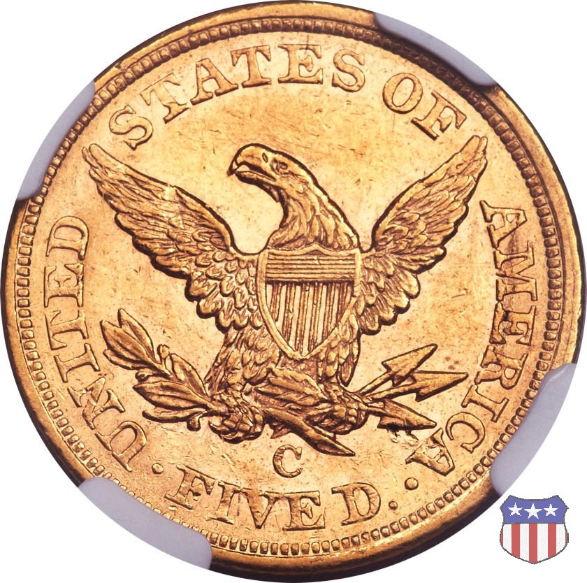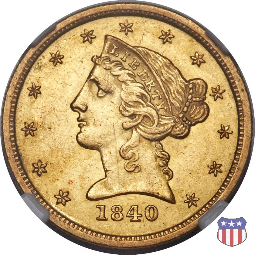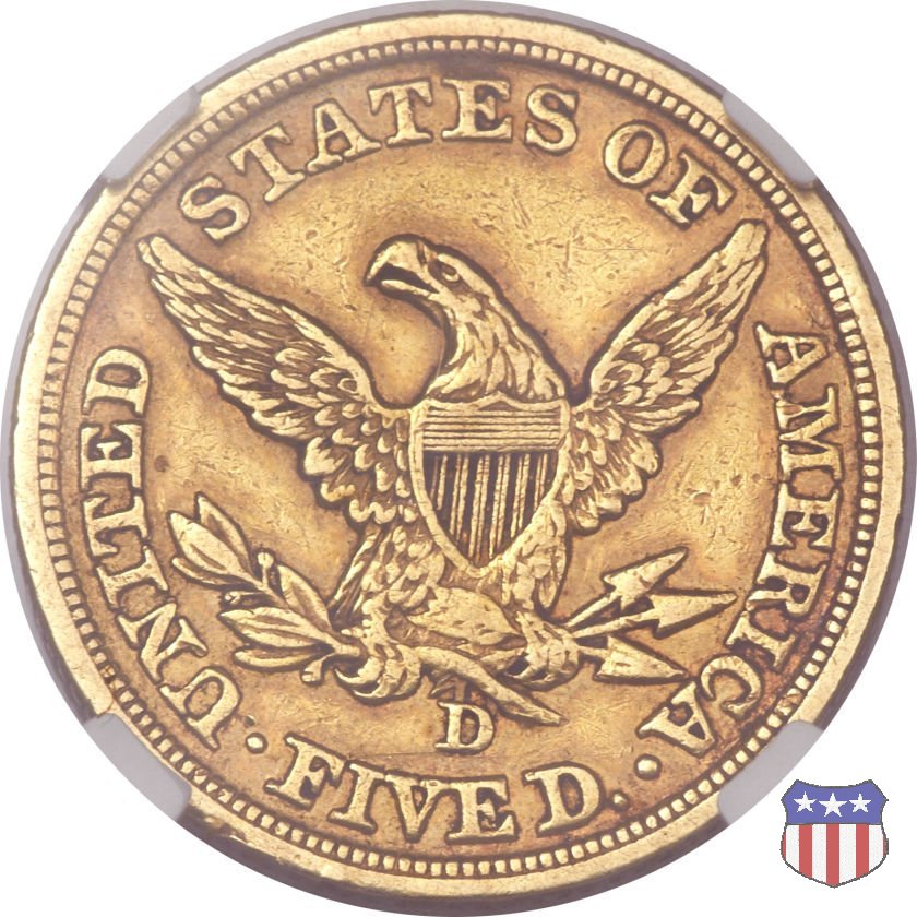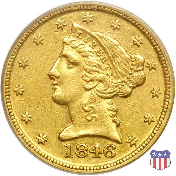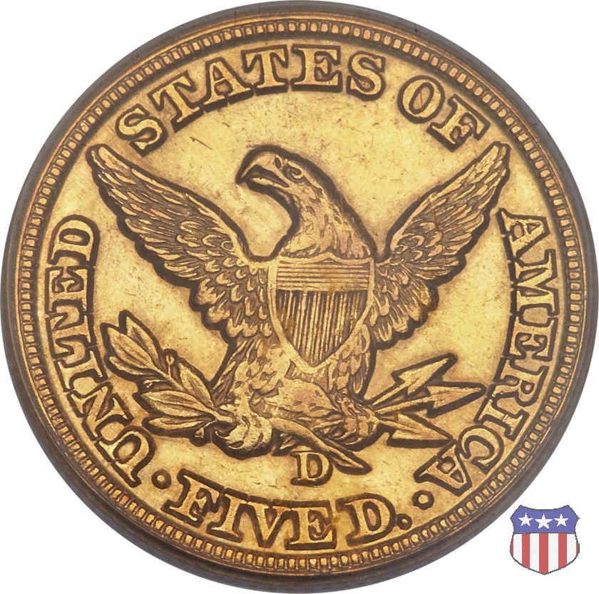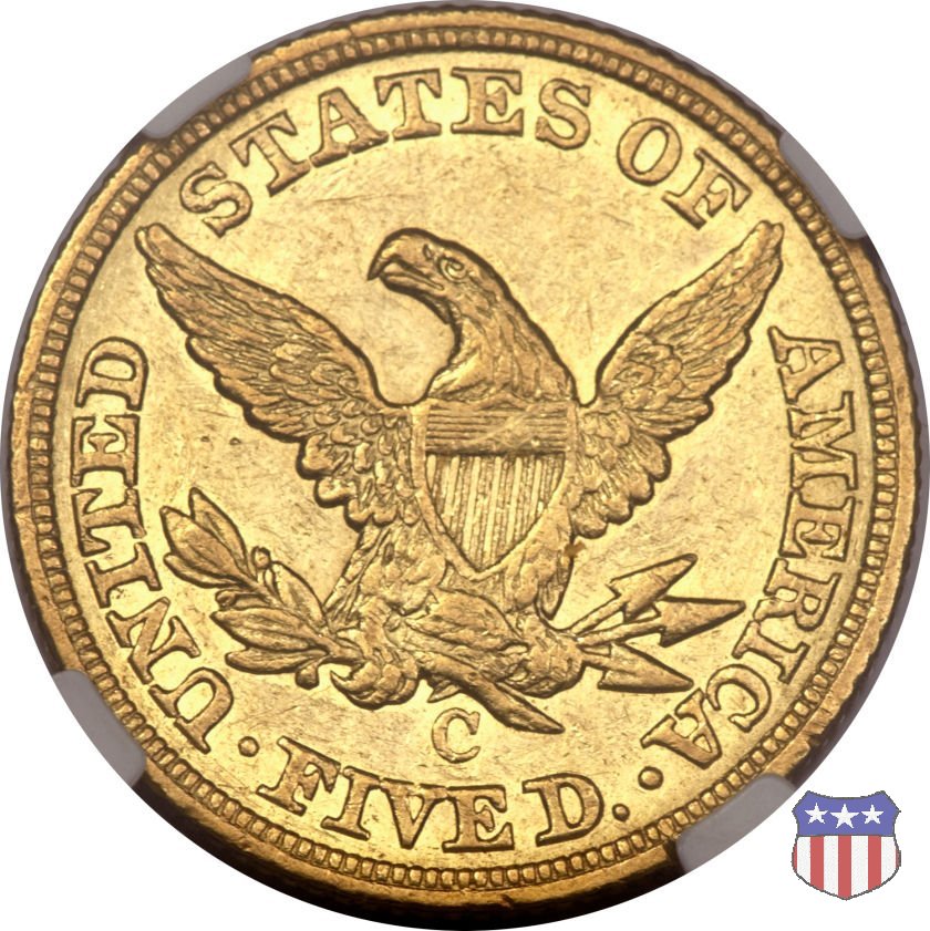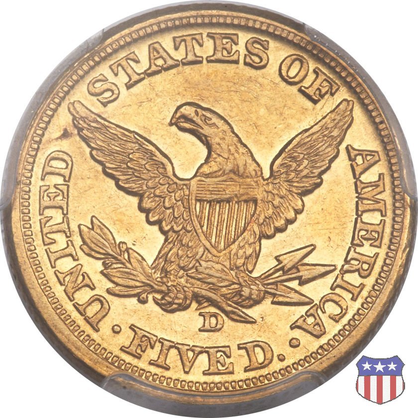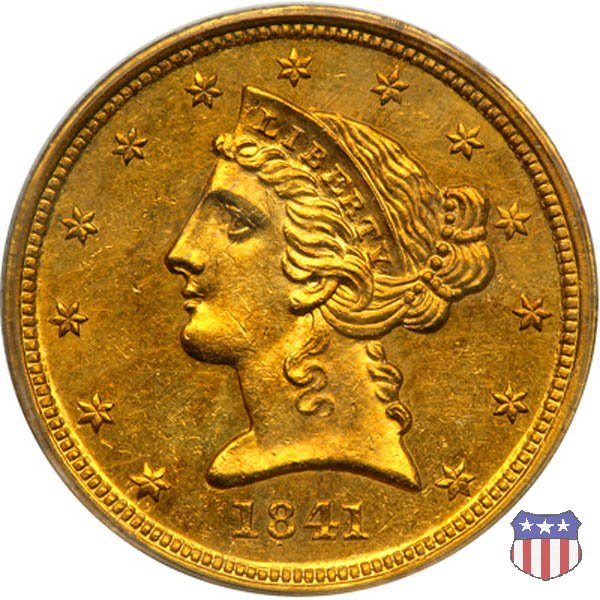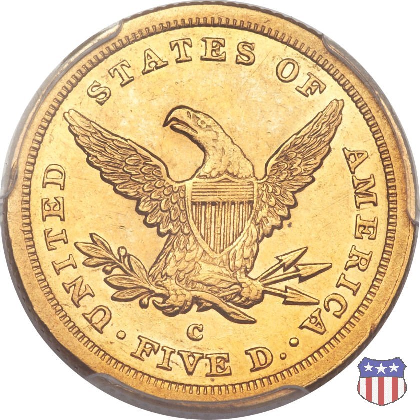 Negli stessi anni in cui creava il dollaro e le altre monete d'argento conosciute come "Liberty Seated", Christian Gobrecht lavorò anche sulle monete d'oro, sia da 2,50 che da 5 e 10 dollari, proponendo per tutte le stesso disegno (unica variante la presenza o meno del motto sulle monete da 5 e 10 dollari). Conosciuto come "Liberty Head", sulla "Half Eagle" questo disegno è stato utilizzato dal 1840 al 1866 nella variante "No Motto", e dal 1866 al 1908 con l'aggiunta del motto IN GOD WE TRUST in un cartiglio sopra la testa dell'aquila. Il dritto mostra una testa coronata di Liberty di ispirazione neoclassica, mentre il rovescio ripropone l'aquila ad ali spiegate con scudo sul petto già vista nelle tipologie precedenti. Da segnalare nella tipologia "No Motto", la grande rarità delle prime coniazioni di San Francisco, nel 1854. Appena 268 esemplari coniati, di cui soltanto tre sono oggi conosciuti. Nel 1840 è stato variato il diametro delle monete. Dopo che una parte di esse era stata coniata a 22,5 mm., si è passati a un diametro piú piccolo, 21,6 mm., mantenuto poi fino al 1929, ultimo anno di coniazione delle "Half Eagles". Segno di zecca: - C Charlotte - D Dahlonega - O New Orleans - S San Francisco - senza segno Philadelphia | ||||||||||||||||