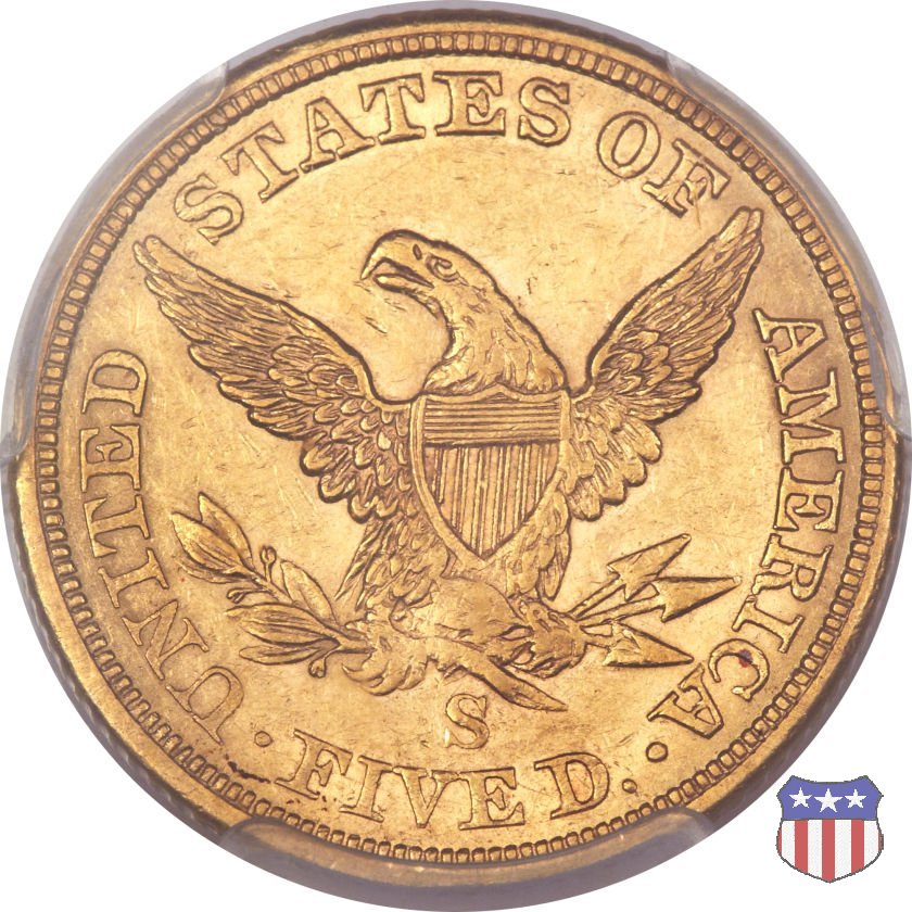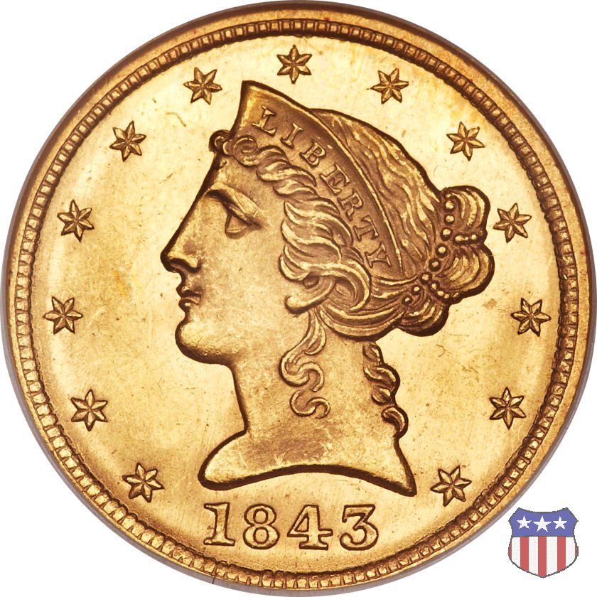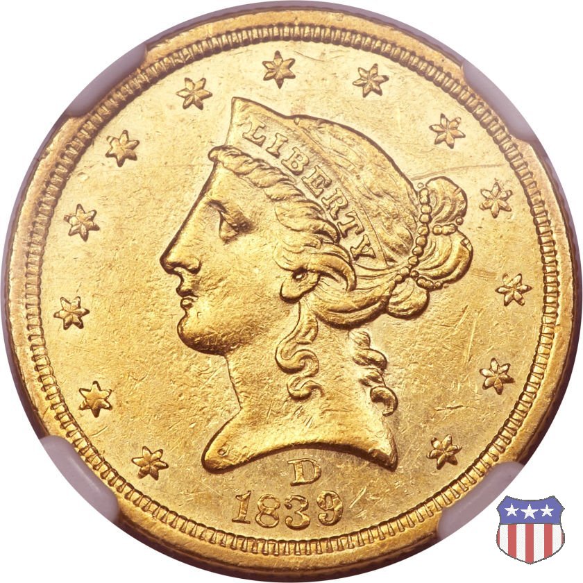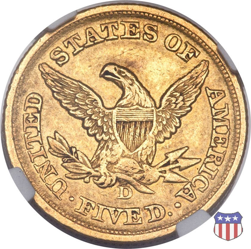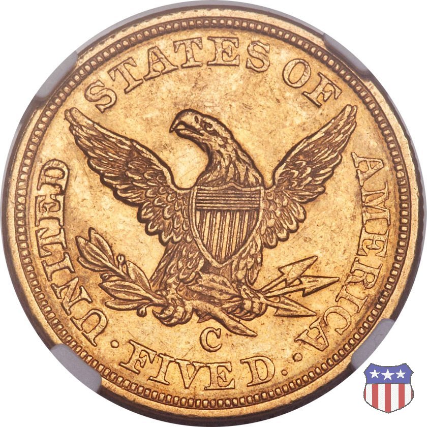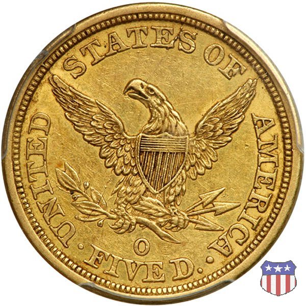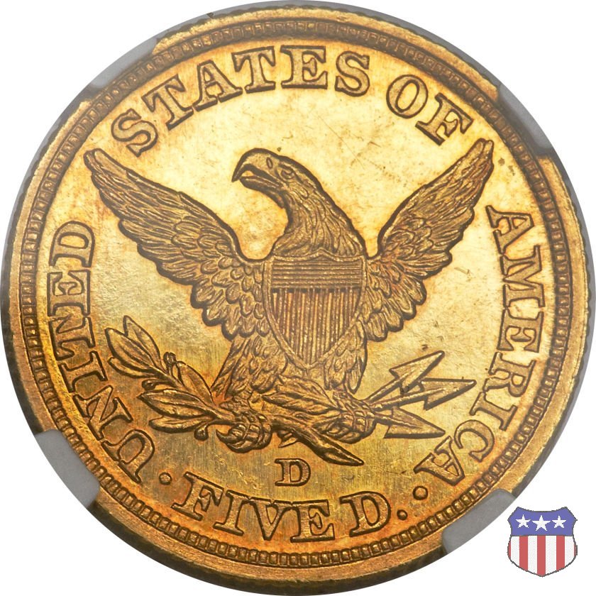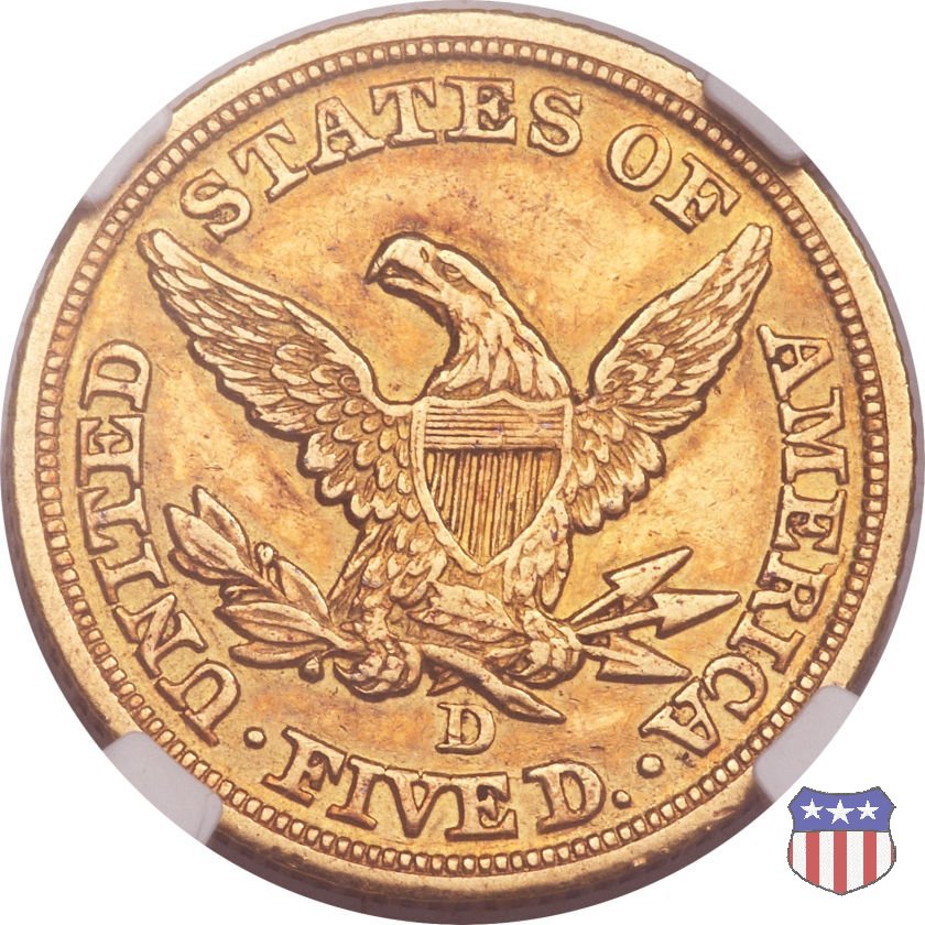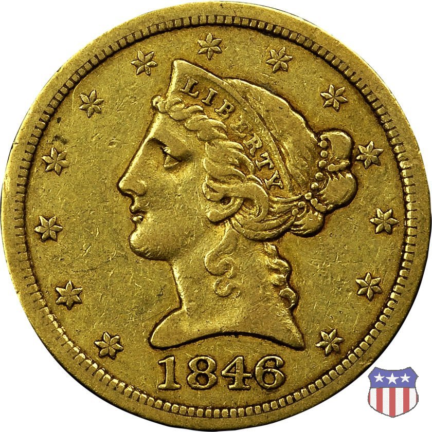 Negli stessi anni in cui creava il dollaro e le altre monete d'argento conosciute come "Liberty Seated", Christian Gobrecht lavorò anche sulle monete d'oro, sia da 2,50 che da 5 e 10 dollari, proponendo per tutte le stesso disegno (unica variante la presenza o meno del motto sulle monete da 5 e 10 dollari). Conosciuto come "Liberty Head", sulla "Half Eagle" questo disegno è stato utilizzato dal 1840 al 1866 nella variante "No Motto", e dal 1866 al 1908 con l'aggiunta del motto IN GOD WE TRUST in un cartiglio sopra la testa dell'aquila. Il dritto mostra una testa coronata di Liberty di ispirazione neoclassica, mentre il rovescio ripropone l'aquila ad ali spiegate con scudo sul petto già vista nelle tipologie precedenti. Da segnalare nella tipologia "No Motto", la grande rarità delle prime coniazioni di San Francisco, nel 1854. Appena 268 esemplari coniati, di cui soltanto tre sono oggi conosciuti. Nel 1840 è stato variato il diametro delle monete. Dopo che una parte di esse era stata coniata a 22,5 mm., si è passati a un diametro piú piccolo, 21,6 mm., mantenuto poi fino al 1929, ultimo anno di coniazione delle "Half Eagles". Segno di zecca: - C Charlotte - D Dahlonega - O New Orleans - S San Francisco - senza segno Philadelphia | ||||||||||||||||