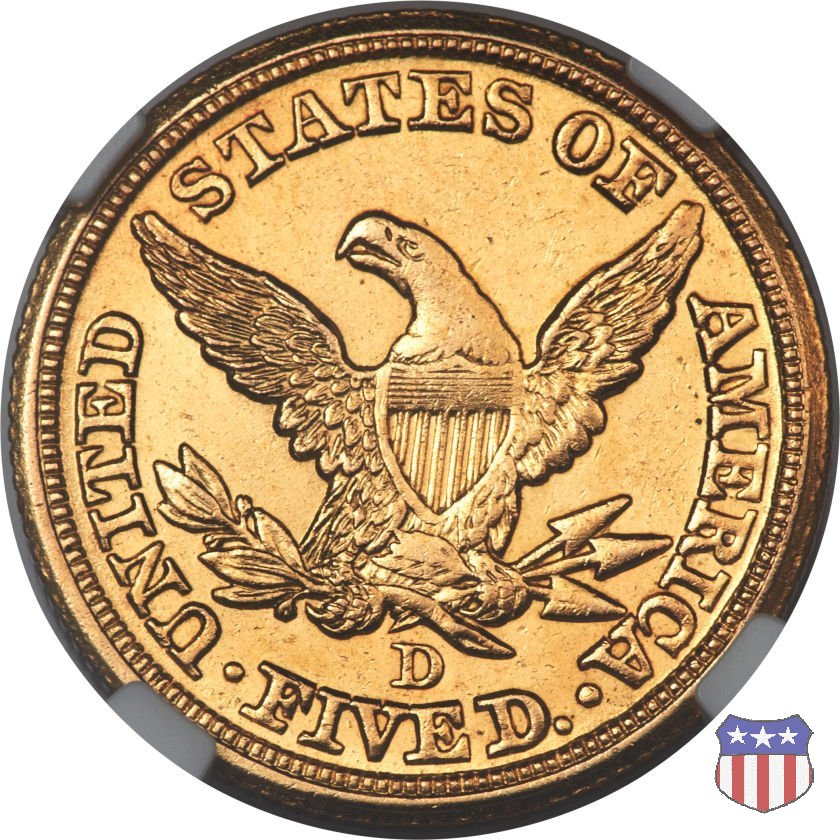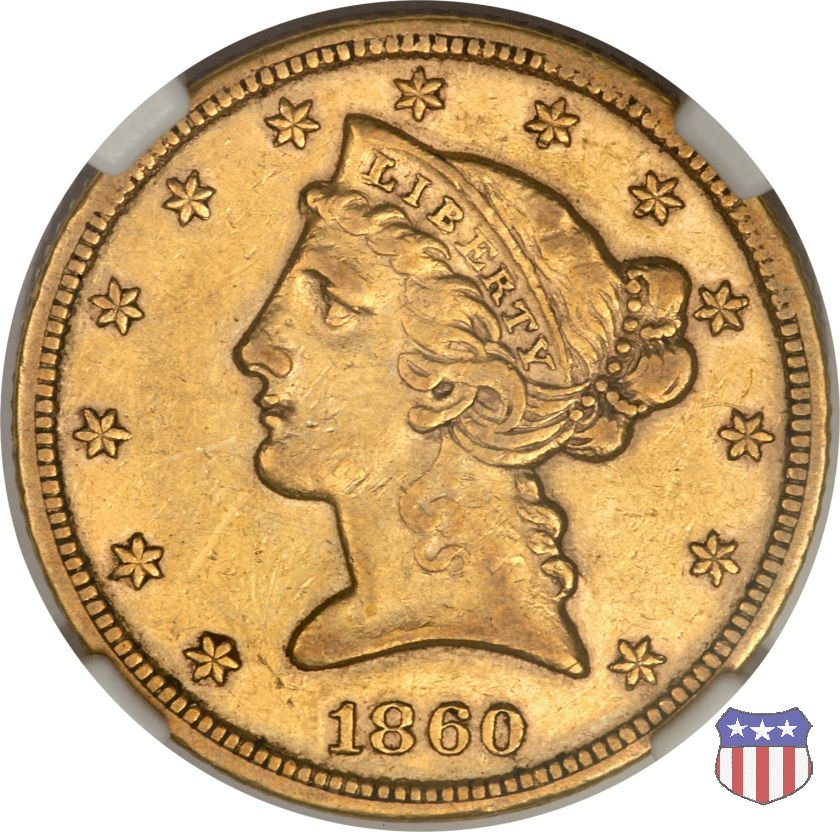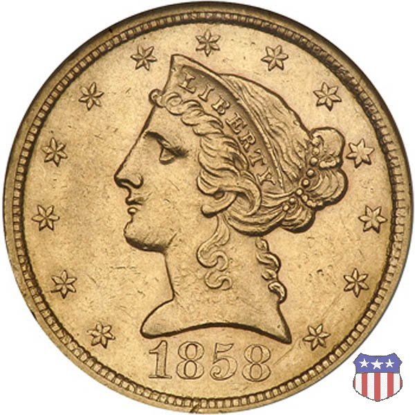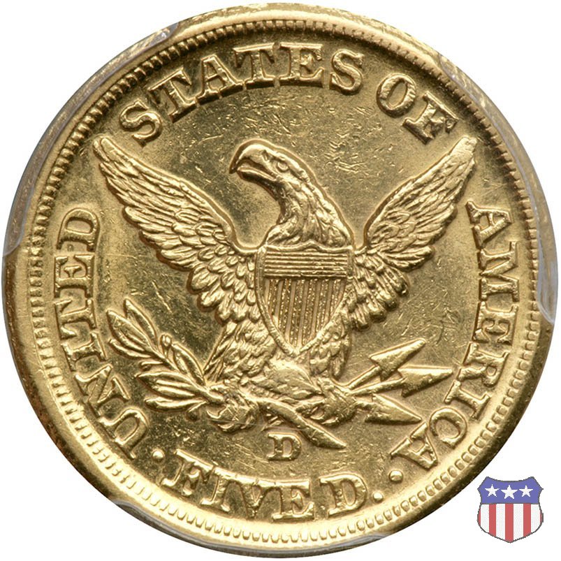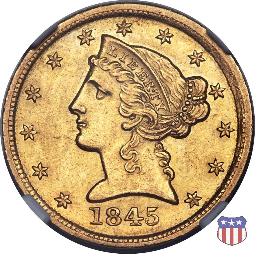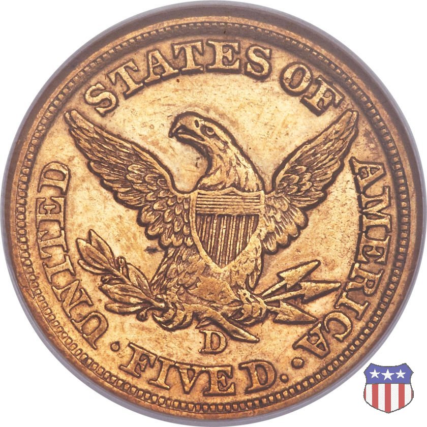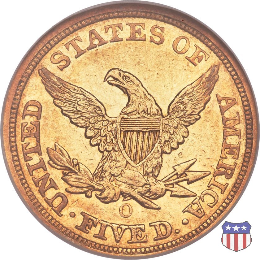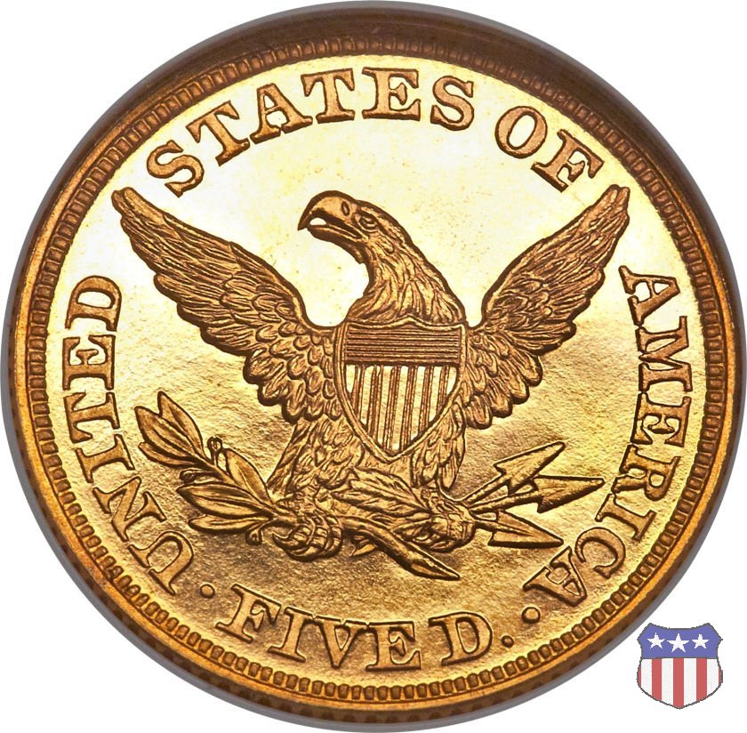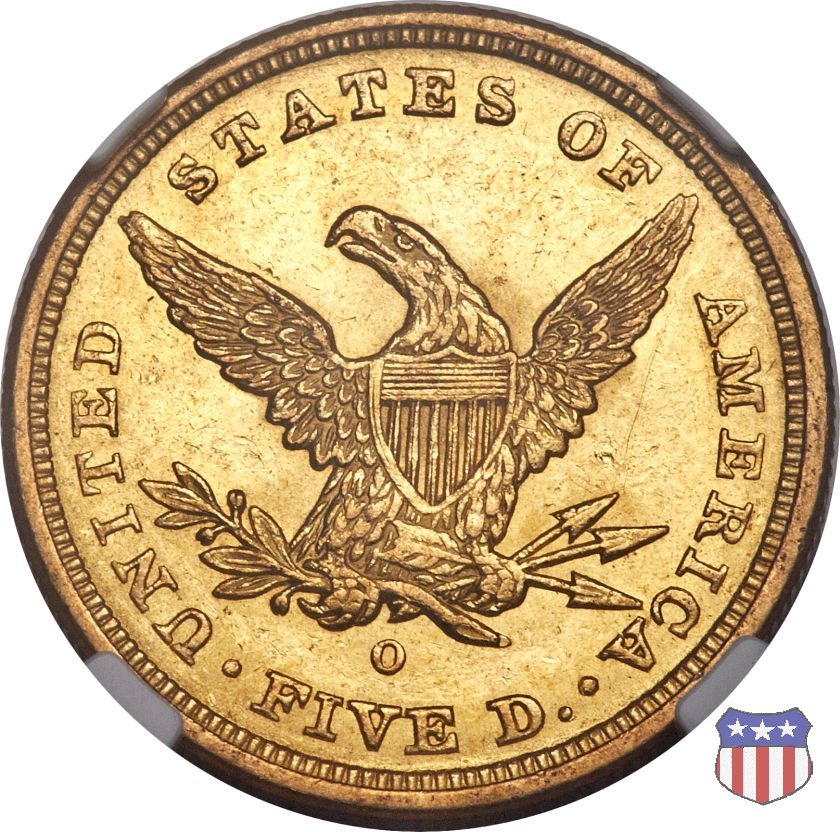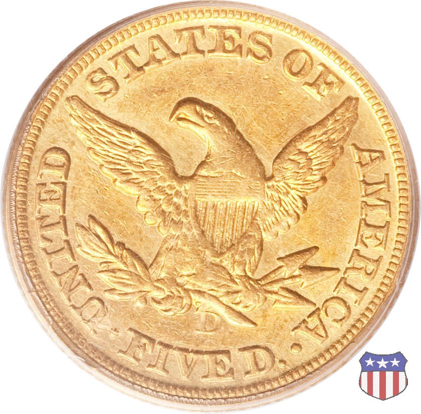 Negli stessi anni in cui creava il dollaro e le altre monete d'argento conosciute come "Liberty Seated", Christian Gobrecht lavorò anche sulle monete d'oro, sia da 2,50 che da 5 e 10 dollari, proponendo per tutte le stesso disegno (unica variante la presenza o meno del motto sulle monete da 5 e 10 dollari). Conosciuto come "Liberty Head", sulla "Half Eagle" questo disegno è stato utilizzato dal 1840 al 1866 nella variante "No Motto", e dal 1866 al 1908 con l'aggiunta del motto IN GOD WE TRUST in un cartiglio sopra la testa dell'aquila. Il dritto mostra una testa coronata di Liberty di ispirazione neoclassica, mentre il rovescio ripropone l'aquila ad ali spiegate con scudo sul petto già vista nelle tipologie precedenti. Da segnalare nella tipologia "No Motto", la grande rarità delle prime coniazioni di San Francisco, nel 1854. Appena 268 esemplari coniati, di cui soltanto tre sono oggi conosciuti. Nel 1840 è stato variato il diametro delle monete. Dopo che una parte di esse era stata coniata a 22,5 mm., si è passati a un diametro piú piccolo, 21,6 mm., mantenuto poi fino al 1929, ultimo anno di coniazione delle "Half Eagles". Segno di zecca: - C Charlotte - D Dahlonega - O New Orleans - S San Francisco - senza segno Philadelphia | ||||||||||||||||
