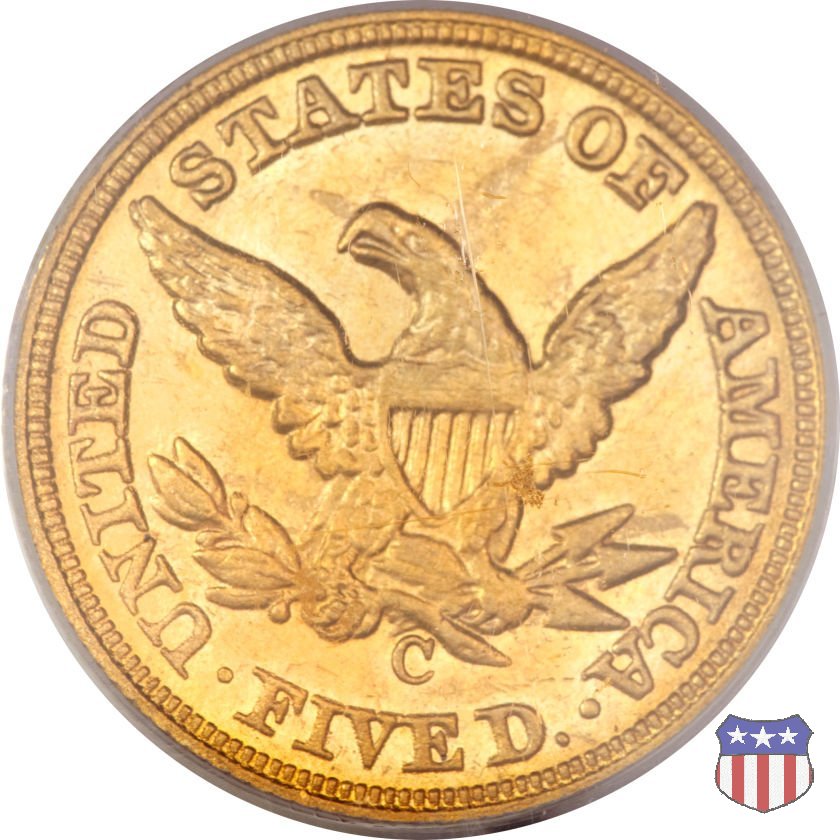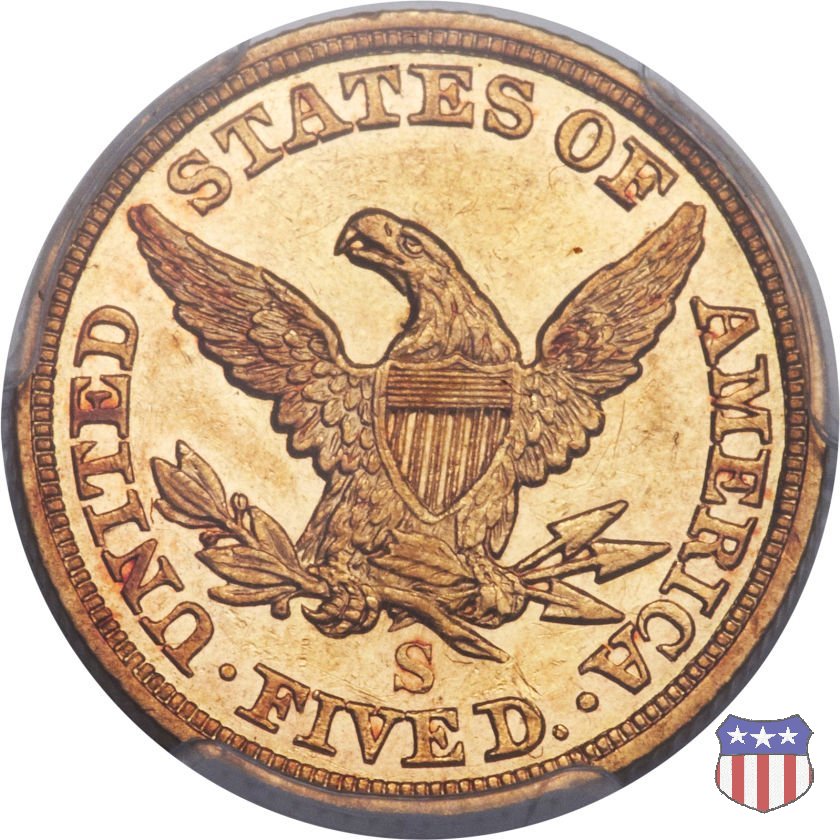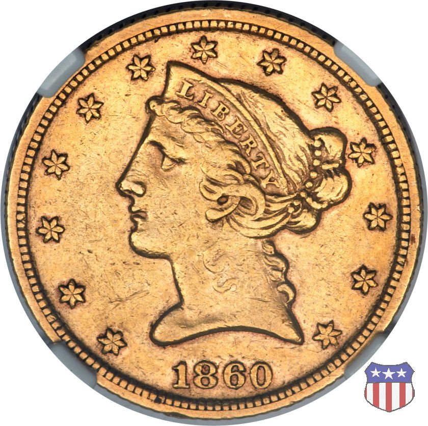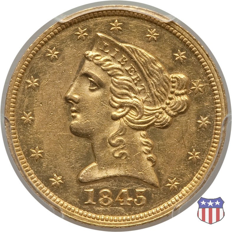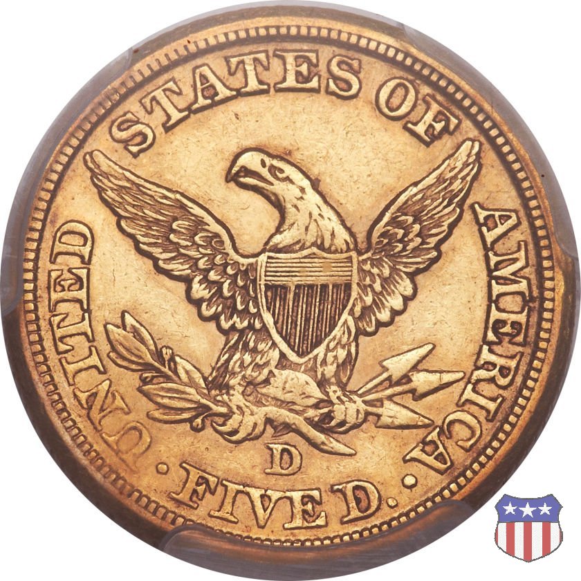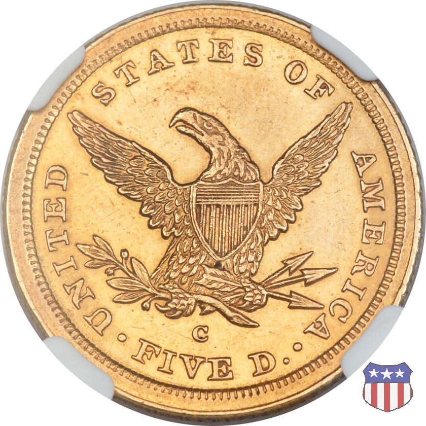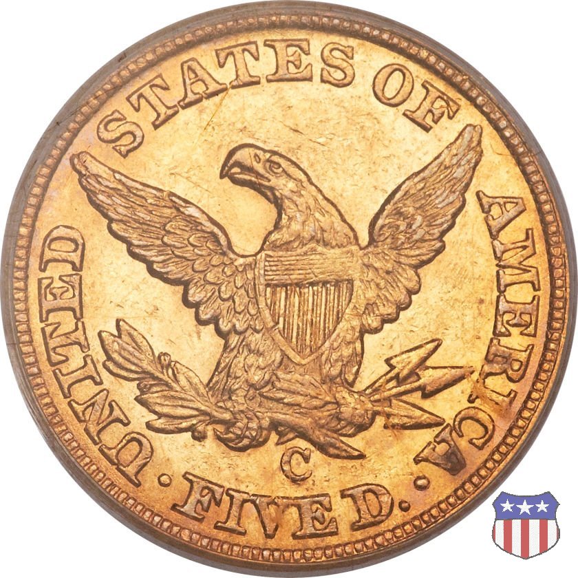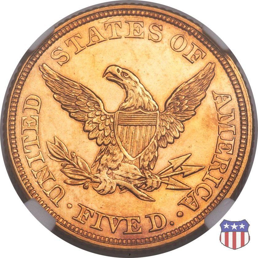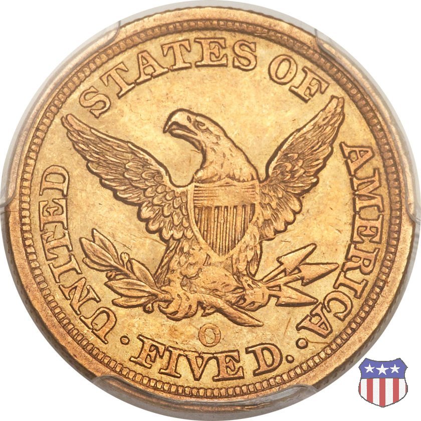 Negli stessi anni in cui creava il dollaro e le altre monete d'argento conosciute come "Liberty Seated", Christian Gobrecht lavorò anche sulle monete d'oro, sia da 2,50 che da 5 e 10 dollari, proponendo per tutte le stesso disegno (unica variante la presenza o meno del motto sulle monete da 5 e 10 dollari). Conosciuto come "Liberty Head", sulla "Half Eagle" questo disegno è stato utilizzato dal 1840 al 1866 nella variante "No Motto", e dal 1866 al 1908 con l'aggiunta del motto IN GOD WE TRUST in un cartiglio sopra la testa dell'aquila. Il dritto mostra una testa coronata di Liberty di ispirazione neoclassica, mentre il rovescio ripropone l'aquila ad ali spiegate con scudo sul petto già vista nelle tipologie precedenti. Da segnalare nella tipologia "No Motto", la grande rarità delle prime coniazioni di San Francisco, nel 1854. Appena 268 esemplari coniati, di cui soltanto tre sono oggi conosciuti. Nel 1840 è stato variato il diametro delle monete. Dopo che una parte di esse era stata coniata a 22,5 mm., si è passati a un diametro piú piccolo, 21,6 mm., mantenuto poi fino al 1929, ultimo anno di coniazione delle "Half Eagles". Segno di zecca: - C Charlotte - D Dahlonega - O New Orleans - S San Francisco - senza segno Philadelphia | ||||||||||||||||