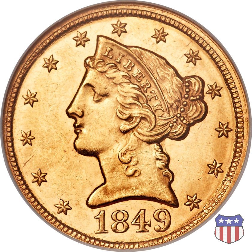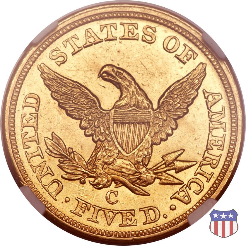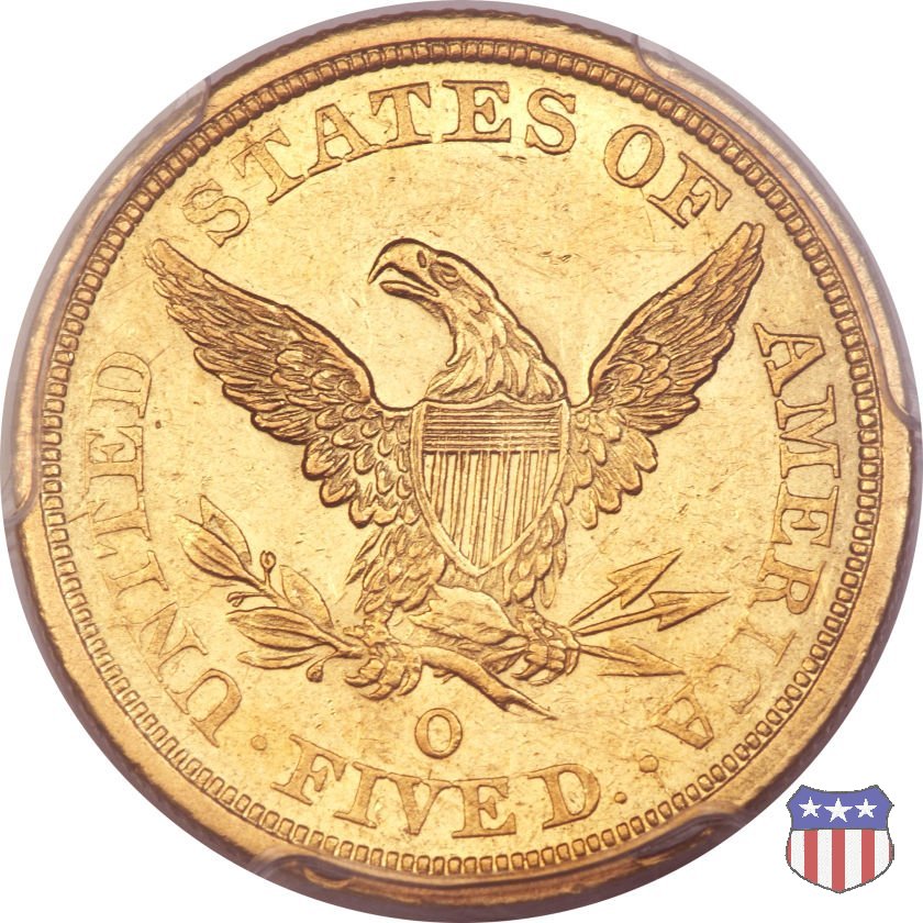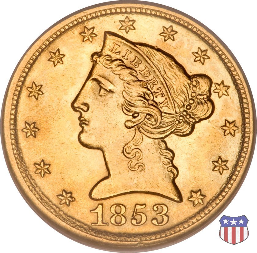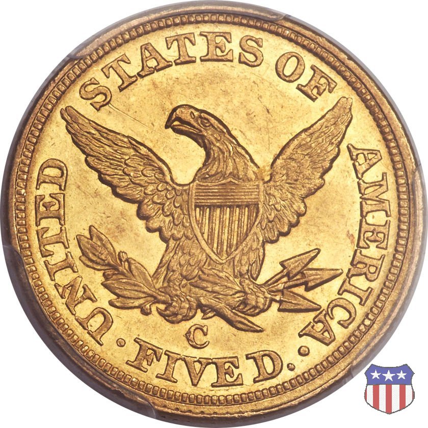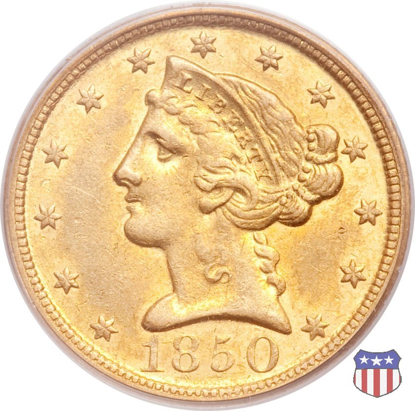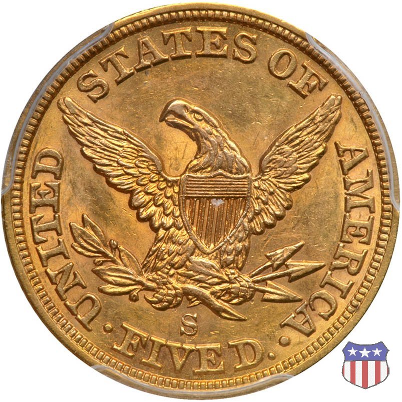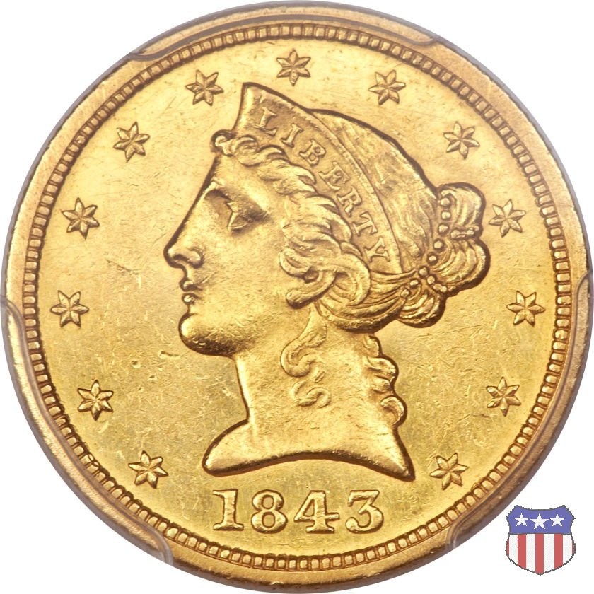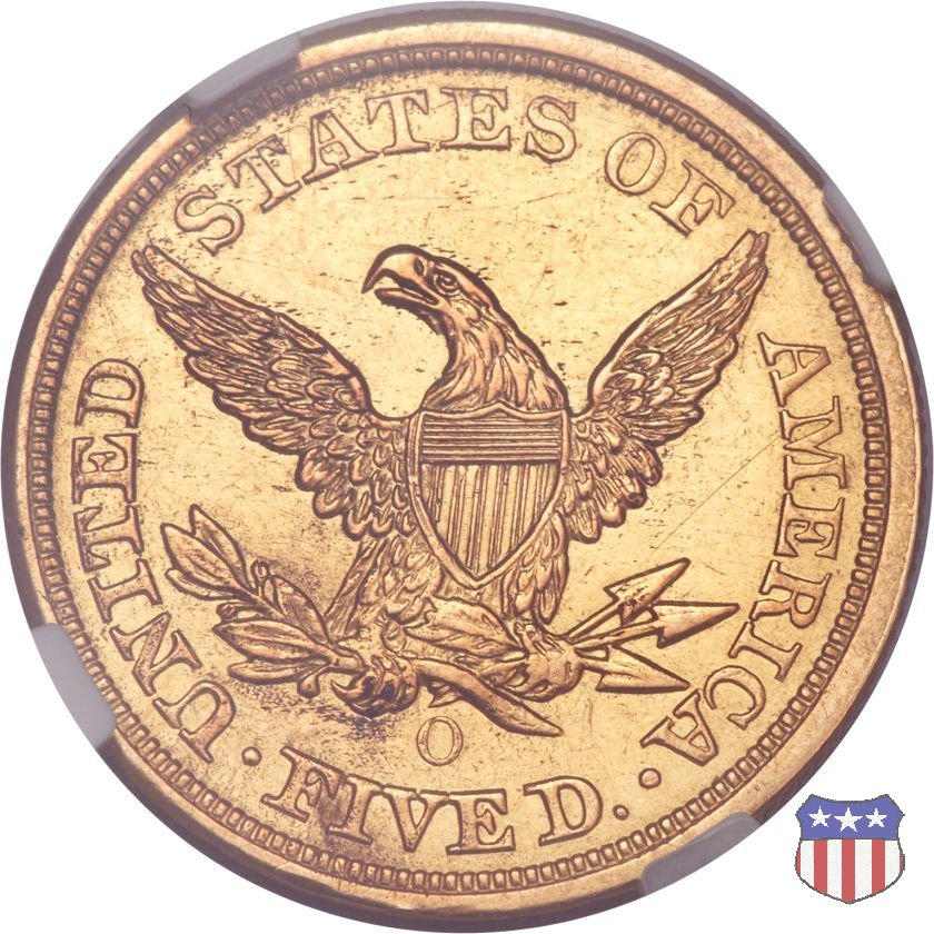 Negli stessi anni in cui creava il dollaro e le altre monete d'argento conosciute come "Liberty Seated", Christian Gobrecht lavorò anche sulle monete d'oro, sia da 2,50 che da 5 e 10 dollari, proponendo per tutte le stesso disegno (unica variante la presenza o meno del motto sulle monete da 5 e 10 dollari). Conosciuto come "Liberty Head", sulla "Half Eagle" questo disegno è stato utilizzato dal 1840 al 1866 nella variante "No Motto", e dal 1866 al 1908 con l'aggiunta del motto IN GOD WE TRUST in un cartiglio sopra la testa dell'aquila. Il dritto mostra una testa coronata di Liberty di ispirazione neoclassica, mentre il rovescio ripropone l'aquila ad ali spiegate con scudo sul petto già vista nelle tipologie precedenti. Da segnalare nella tipologia "No Motto", la grande rarità delle prime coniazioni di San Francisco, nel 1854. Appena 268 esemplari coniati, di cui soltanto tre sono oggi conosciuti. Nel 1840 è stato variato il diametro delle monete. Dopo che una parte di esse era stata coniata a 22,5 mm., si è passati a un diametro piú piccolo, 21,6 mm., mantenuto poi fino al 1929, ultimo anno di coniazione delle "Half Eagles". Segno di zecca: - C Charlotte - D Dahlonega - O New Orleans - S San Francisco - senza segno Philadelphia | ||||||||||||||||
