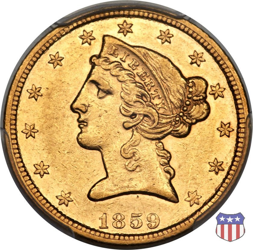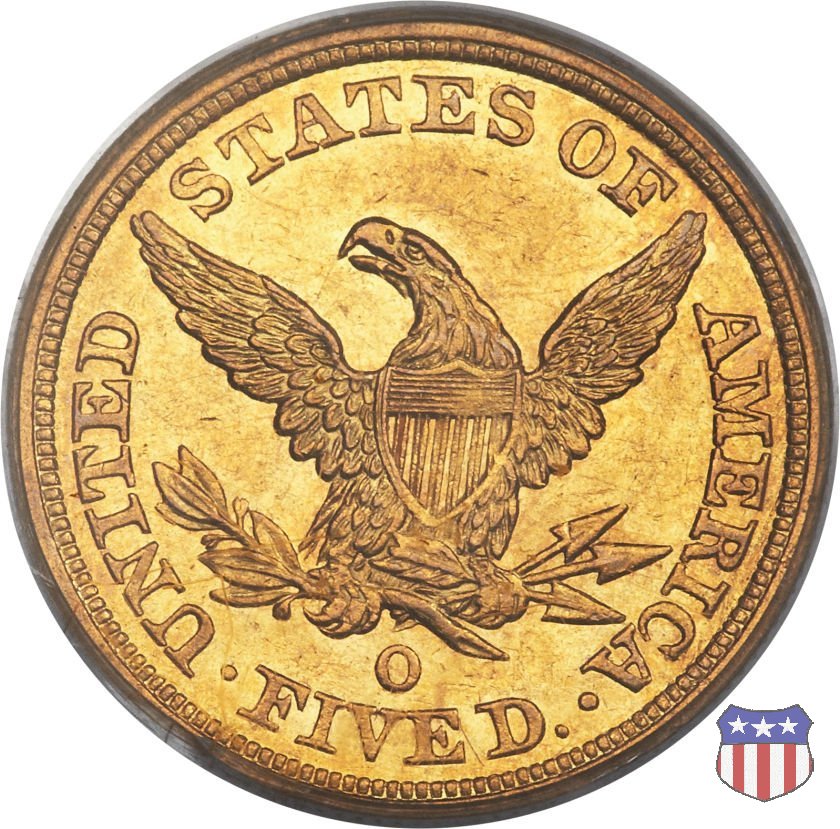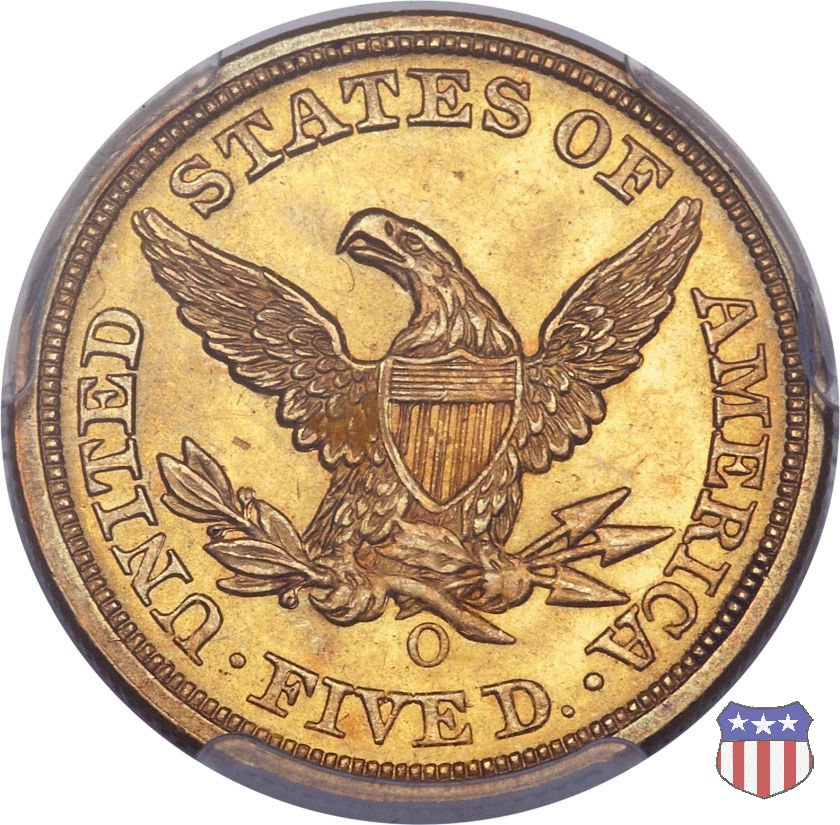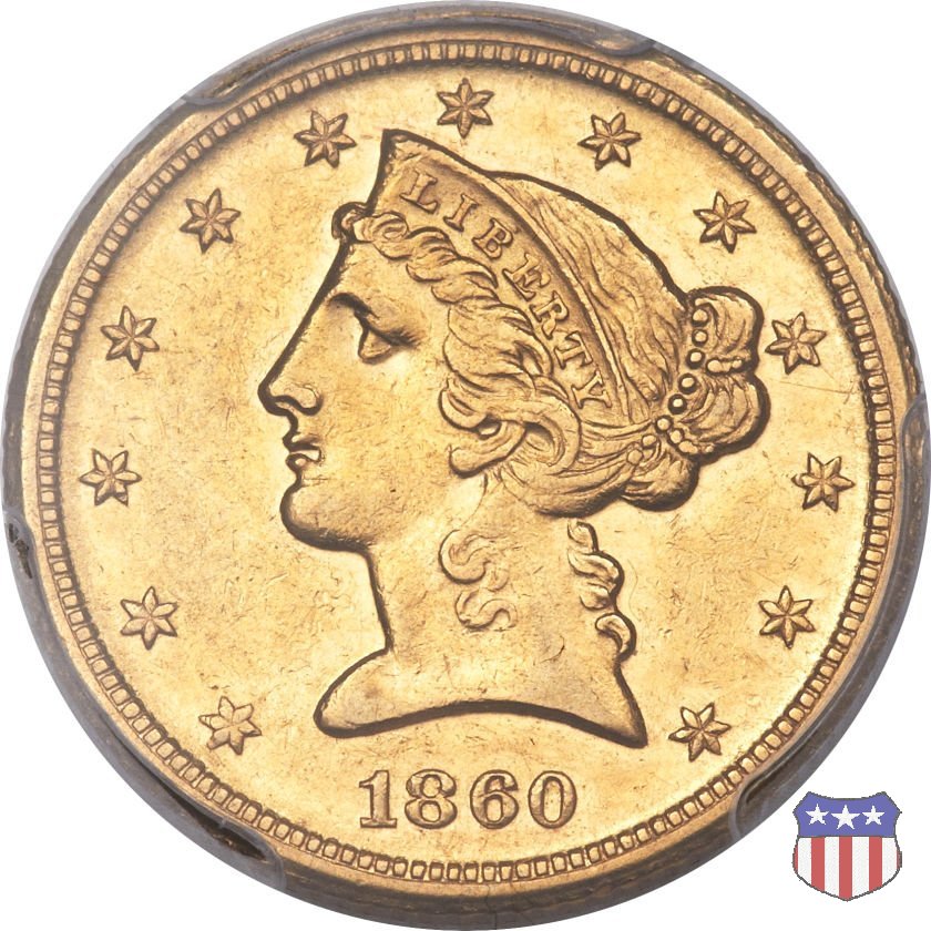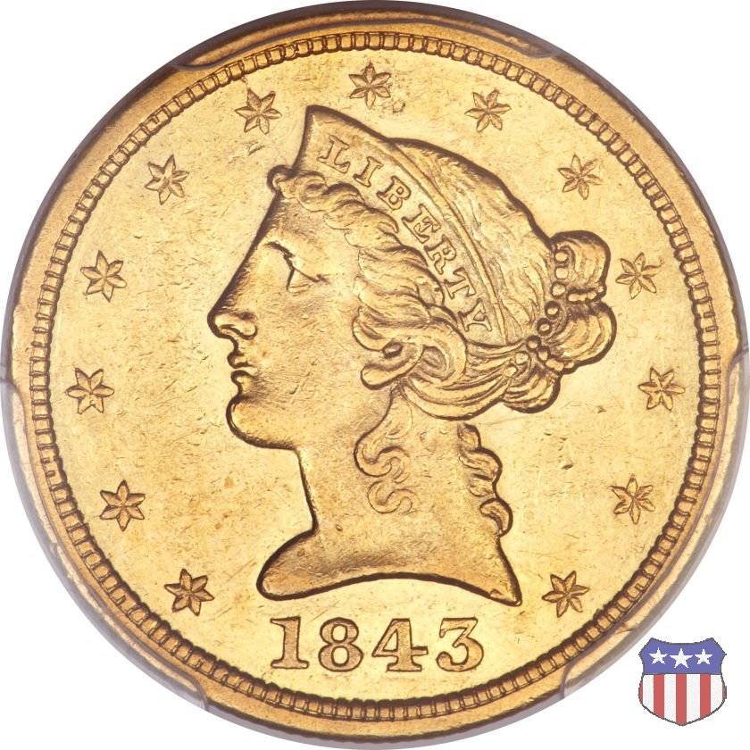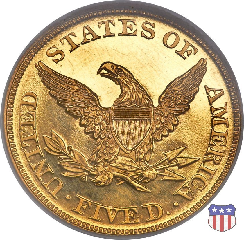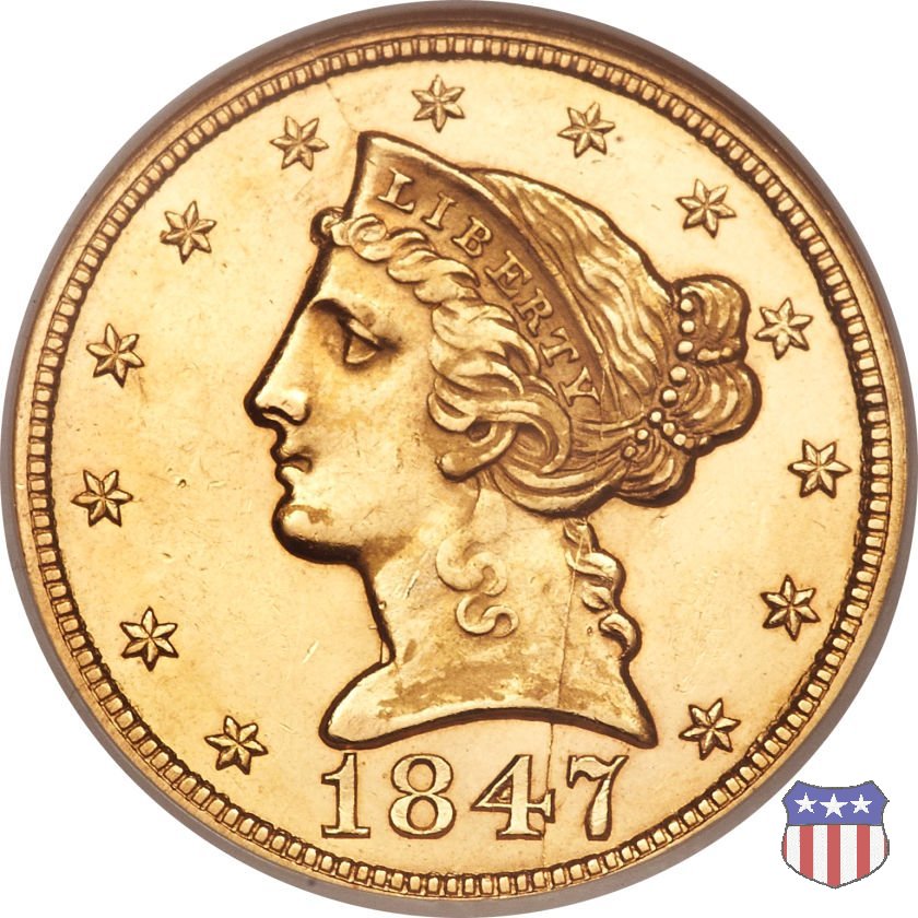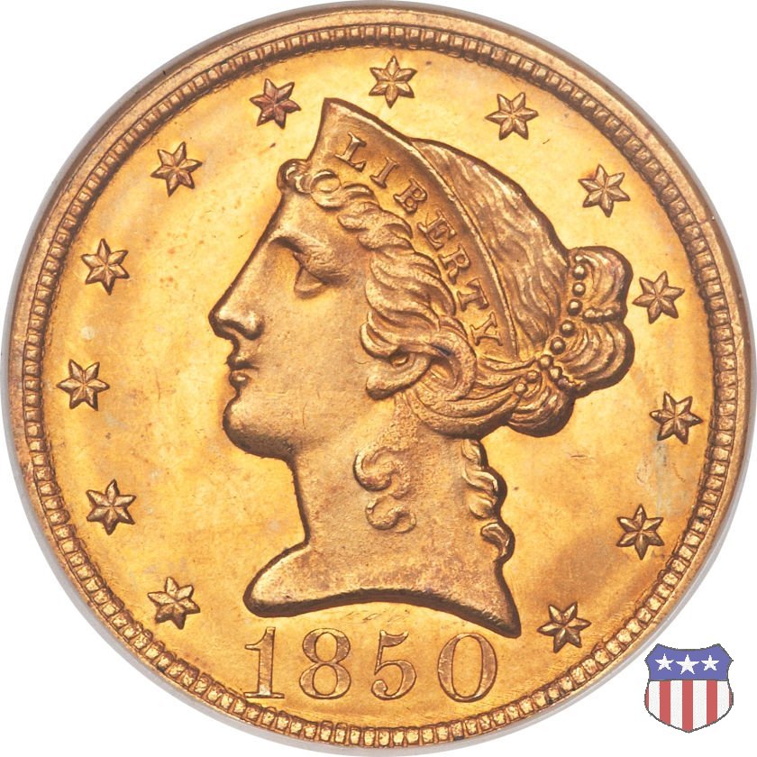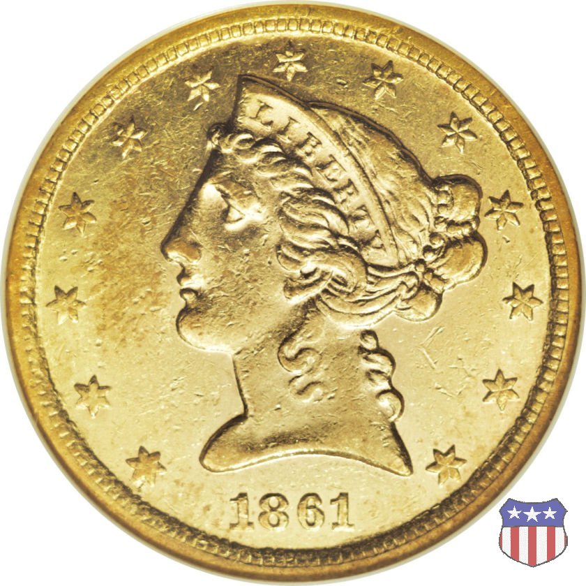 Negli stessi anni in cui creava il dollaro e le altre monete d'argento conosciute come "Liberty Seated", Christian Gobrecht lavorò anche sulle monete d'oro, sia da 2,50 che da 5 e 10 dollari, proponendo per tutte le stesso disegno (unica variante la presenza o meno del motto sulle monete da 5 e 10 dollari). Conosciuto come "Liberty Head", sulla "Half Eagle" questo disegno è stato utilizzato dal 1840 al 1866 nella variante "No Motto", e dal 1866 al 1908 con l'aggiunta del motto IN GOD WE TRUST in un cartiglio sopra la testa dell'aquila. Il dritto mostra una testa coronata di Liberty di ispirazione neoclassica, mentre il rovescio ripropone l'aquila ad ali spiegate con scudo sul petto già vista nelle tipologie precedenti. Da segnalare nella tipologia "No Motto", la grande rarità delle prime coniazioni di San Francisco, nel 1854. Appena 268 esemplari coniati, di cui soltanto tre sono oggi conosciuti. Nel 1840 è stato variato il diametro delle monete. Dopo che una parte di esse era stata coniata a 22,5 mm., si è passati a un diametro piú piccolo, 21,6 mm., mantenuto poi fino al 1929, ultimo anno di coniazione delle "Half Eagles". Segno di zecca: - C Charlotte - D Dahlonega - O New Orleans - S San Francisco - senza segno Philadelphia | ||||||||||||||||