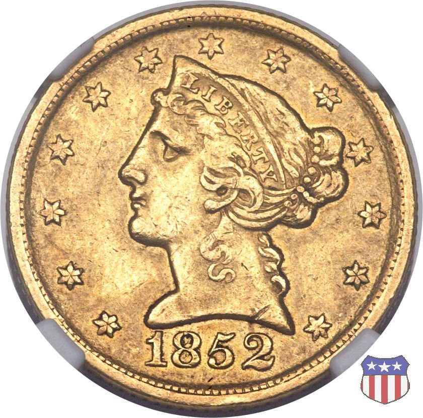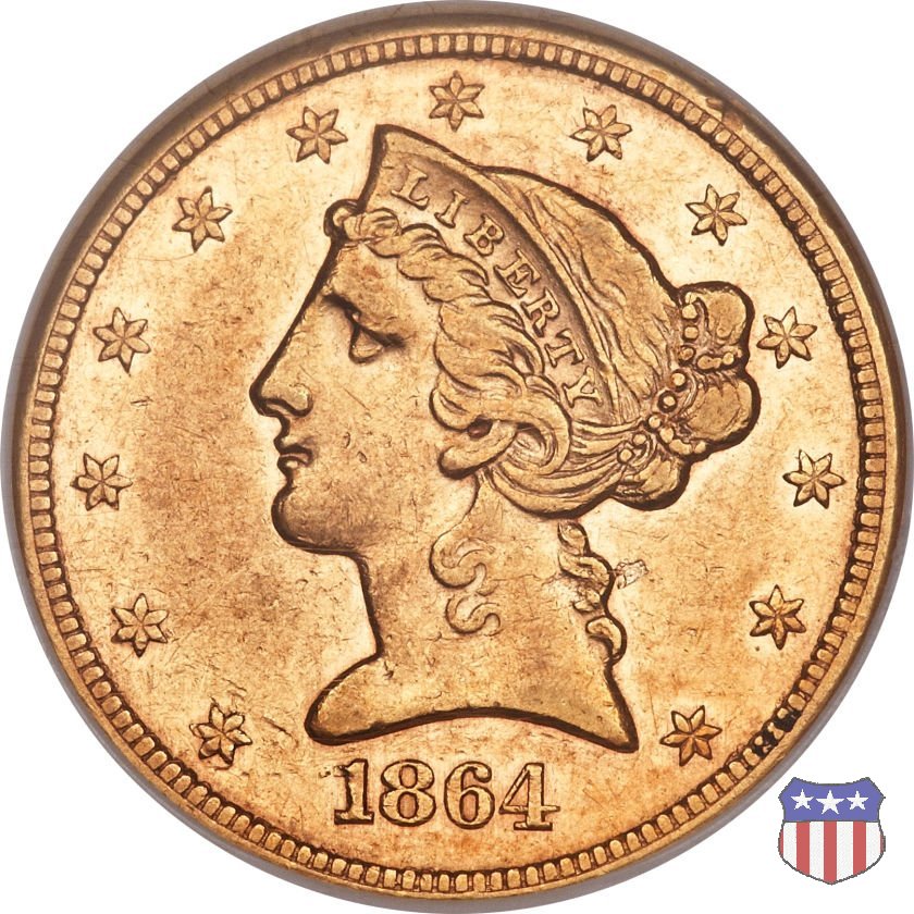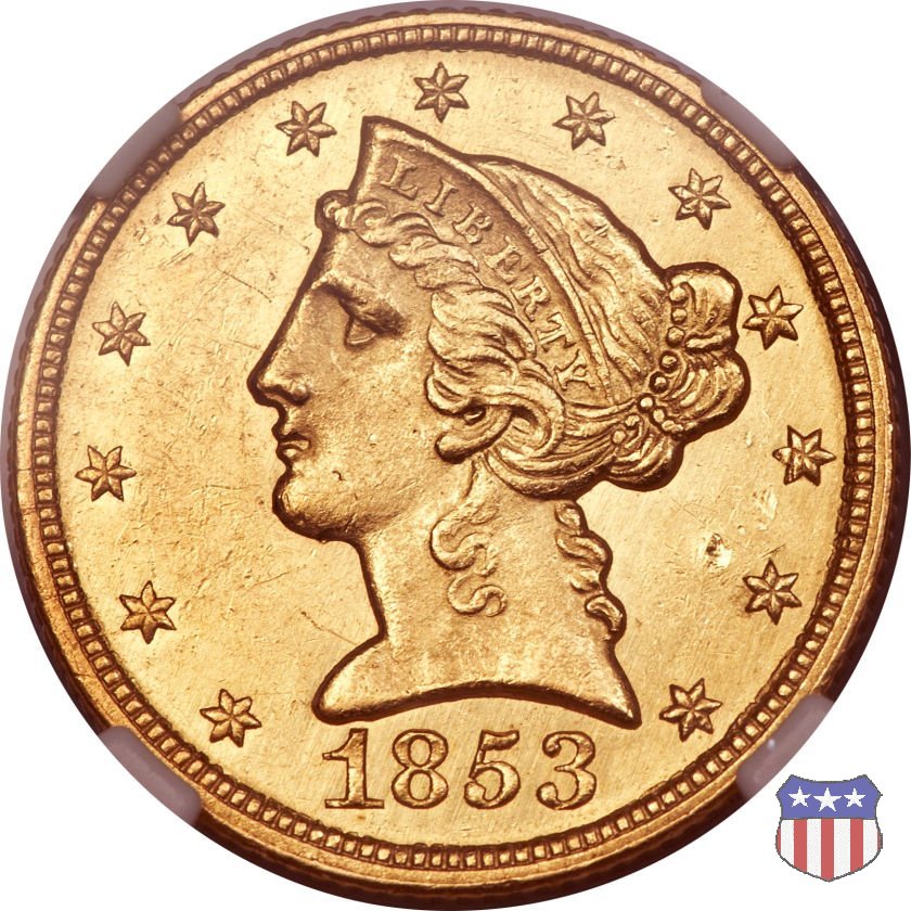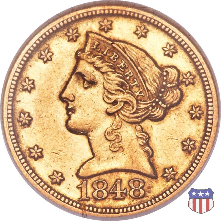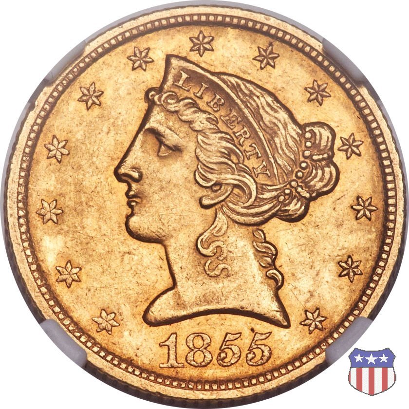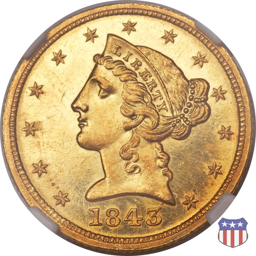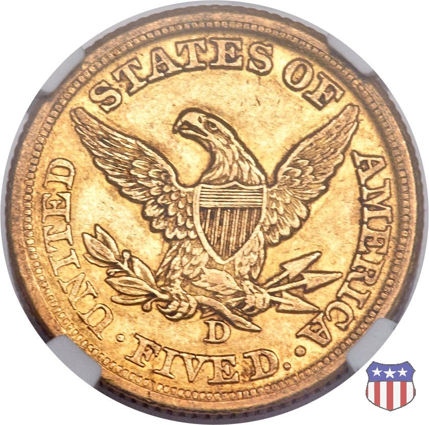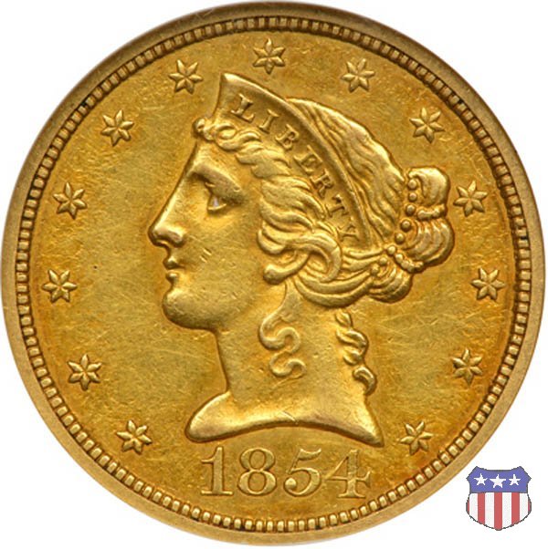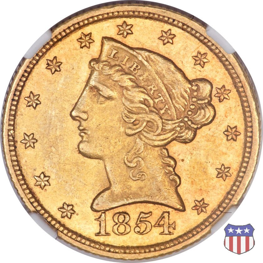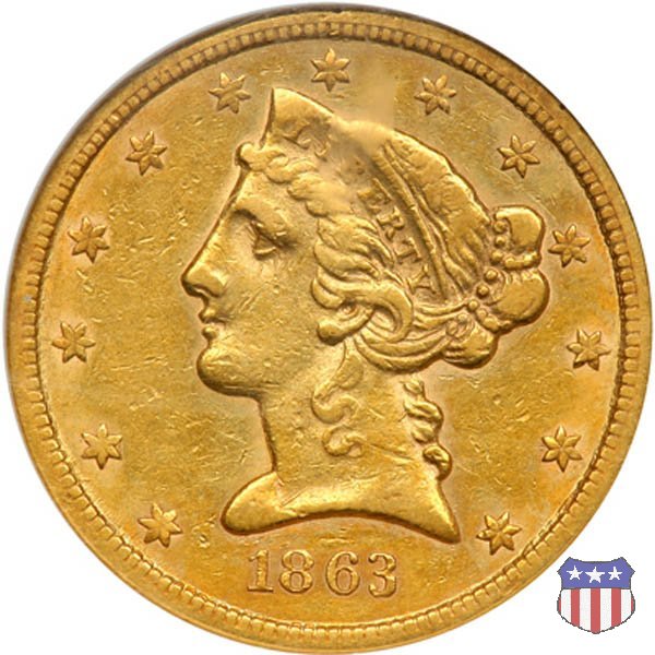 Negli stessi anni in cui creava il dollaro e le altre monete d'argento conosciute come "Liberty Seated", Christian Gobrecht lavorò anche sulle monete d'oro, sia da 2,50 che da 5 e 10 dollari, proponendo per tutte le stesso disegno (unica variante la presenza o meno del motto sulle monete da 5 e 10 dollari). Conosciuto come "Liberty Head", sulla "Half Eagle" questo disegno è stato utilizzato dal 1840 al 1866 nella variante "No Motto", e dal 1866 al 1908 con l'aggiunta del motto IN GOD WE TRUST in un cartiglio sopra la testa dell'aquila. Il dritto mostra una testa coronata di Liberty di ispirazione neoclassica, mentre il rovescio ripropone l'aquila ad ali spiegate con scudo sul petto già vista nelle tipologie precedenti. Da segnalare nella tipologia "No Motto", la grande rarità delle prime coniazioni di San Francisco, nel 1854. Appena 268 esemplari coniati, di cui soltanto tre sono oggi conosciuti. Nel 1840 è stato variato il diametro delle monete. Dopo che una parte di esse era stata coniata a 22,5 mm., si è passati a un diametro piú piccolo, 21,6 mm., mantenuto poi fino al 1929, ultimo anno di coniazione delle "Half Eagles". Segno di zecca: - C Charlotte - D Dahlonega - O New Orleans - S San Francisco - senza segno Philadelphia | ||||||||||||||||