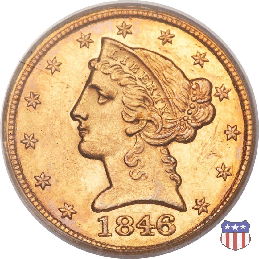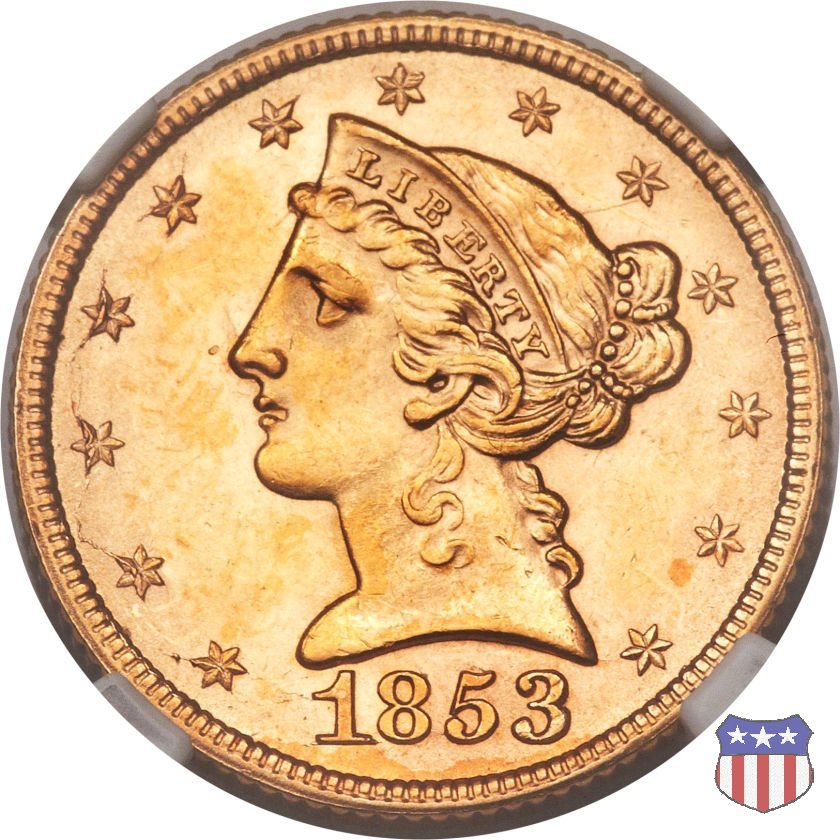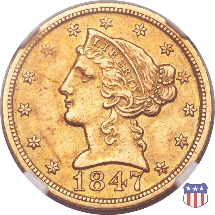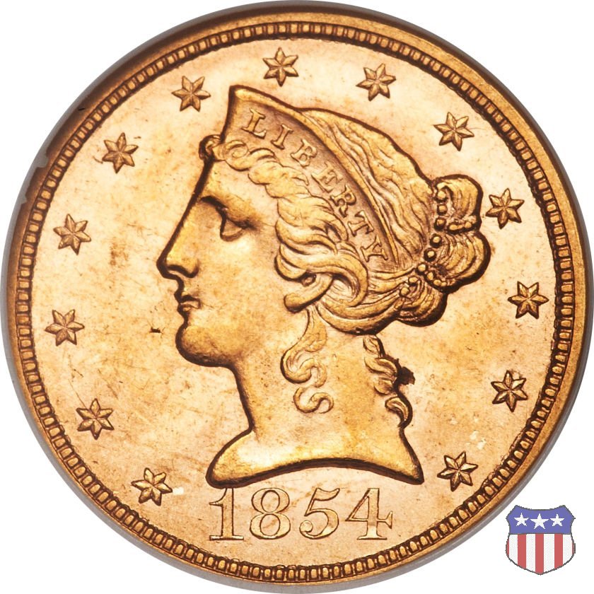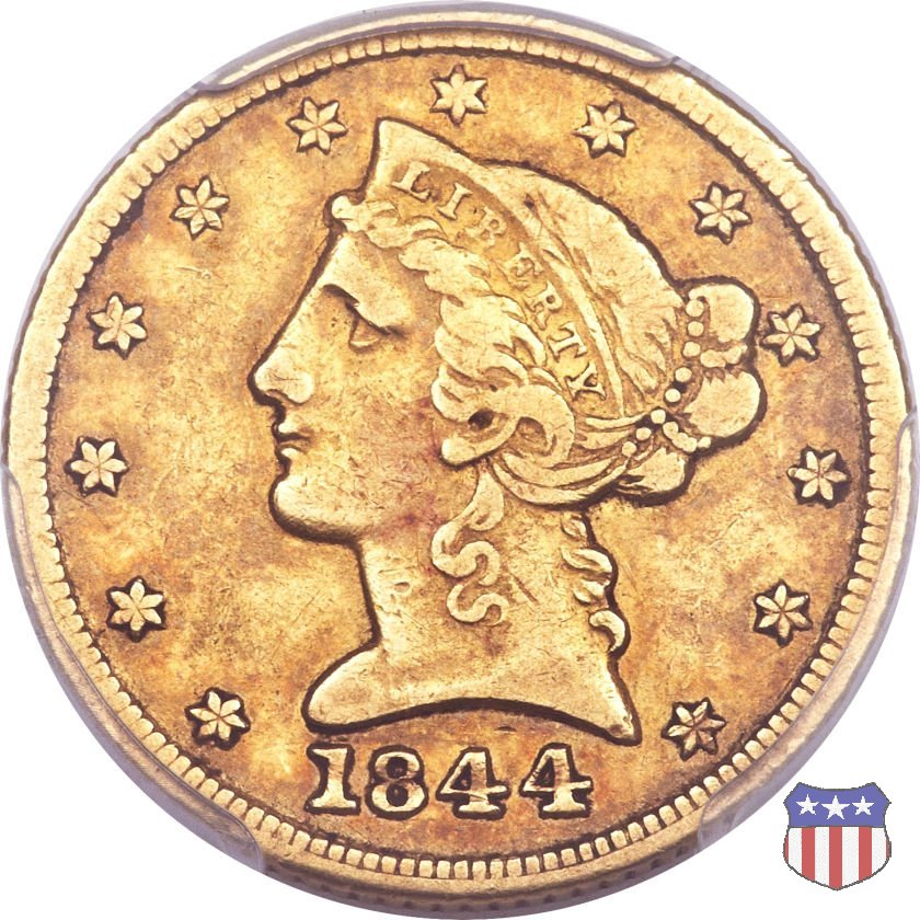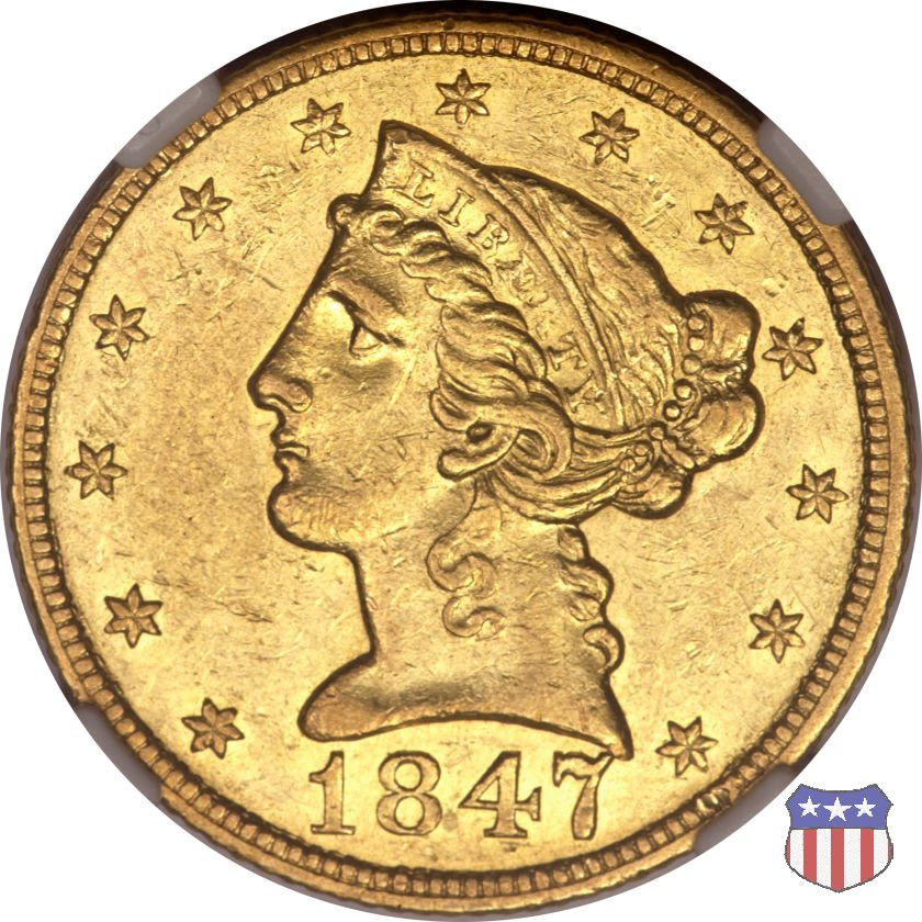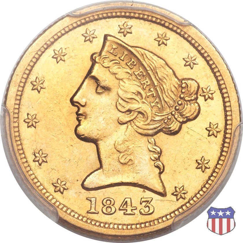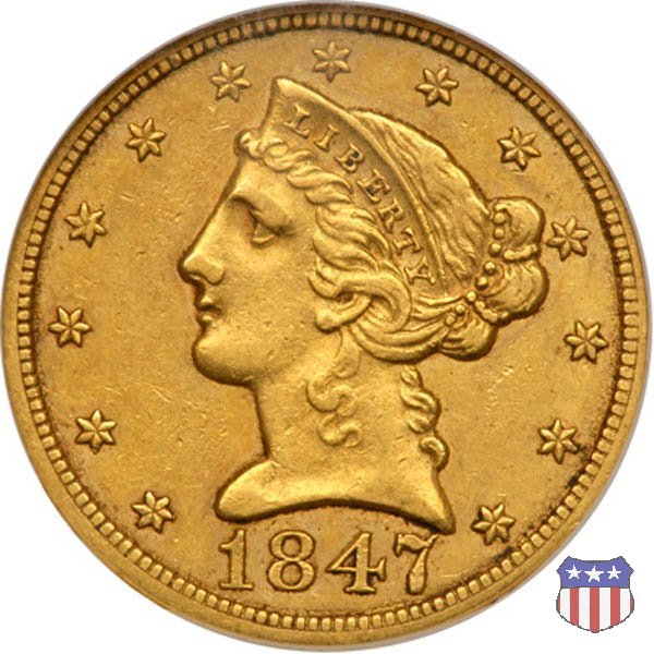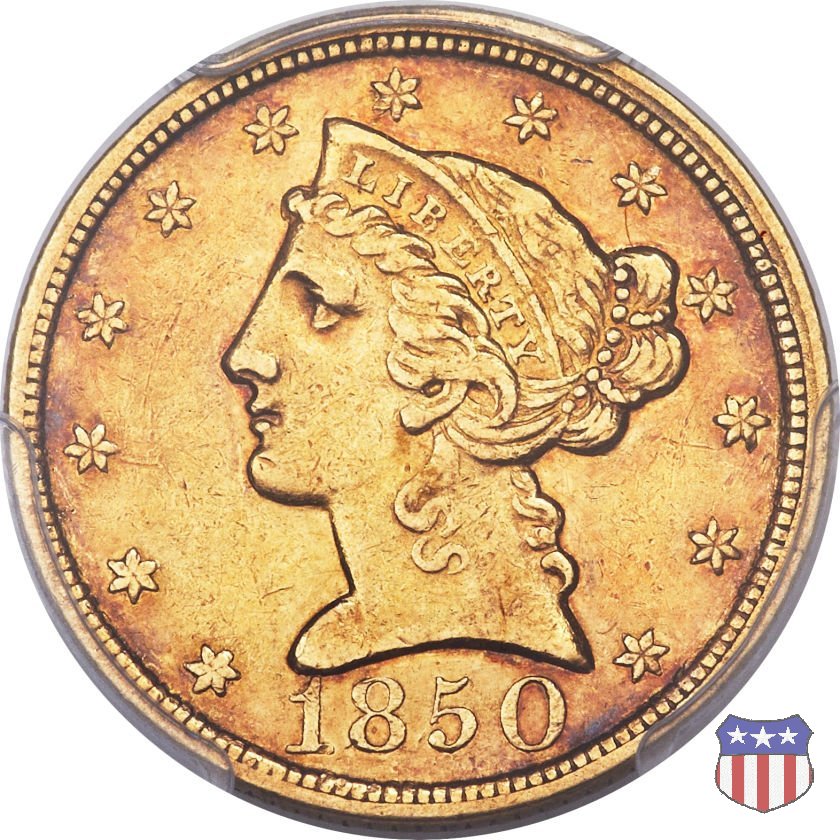 Negli stessi anni in cui creava il dollaro e le altre monete d'argento conosciute come "Liberty Seated", Christian Gobrecht lavorò anche sulle monete d'oro, sia da 2,50 che da 5 e 10 dollari, proponendo per tutte le stesso disegno (unica variante la presenza o meno del motto sulle monete da 5 e 10 dollari). Conosciuto come "Liberty Head", sulla "Half Eagle" questo disegno è stato utilizzato dal 1840 al 1866 nella variante "No Motto", e dal 1866 al 1908 con l'aggiunta del motto IN GOD WE TRUST in un cartiglio sopra la testa dell'aquila. Il dritto mostra una testa coronata di Liberty di ispirazione neoclassica, mentre il rovescio ripropone l'aquila ad ali spiegate con scudo sul petto già vista nelle tipologie precedenti. Da segnalare nella tipologia "No Motto", la grande rarità delle prime coniazioni di San Francisco, nel 1854. Appena 268 esemplari coniati, di cui soltanto tre sono oggi conosciuti. Nel 1840 è stato variato il diametro delle monete. Dopo che una parte di esse era stata coniata a 22,5 mm., si è passati a un diametro piú piccolo, 21,6 mm., mantenuto poi fino al 1929, ultimo anno di coniazione delle "Half Eagles". Segno di zecca: - C Charlotte - D Dahlonega - O New Orleans - S San Francisco - senza segno Philadelphia | ||||||||||||||||