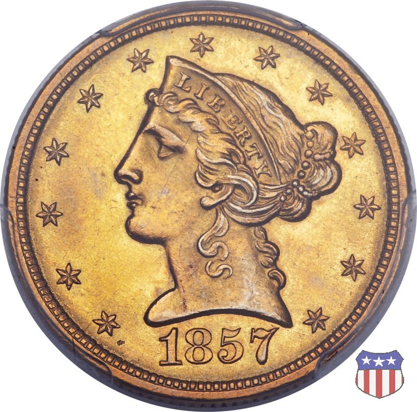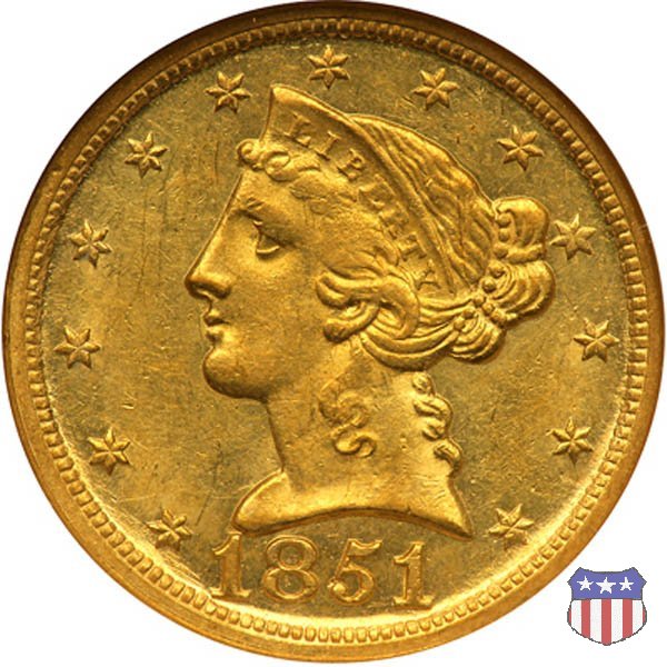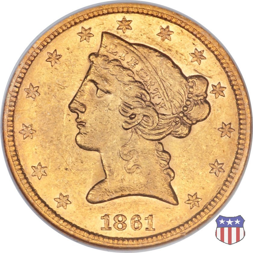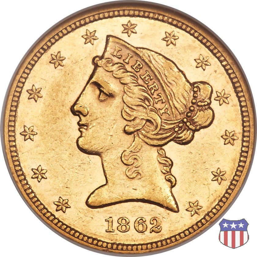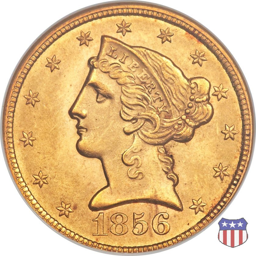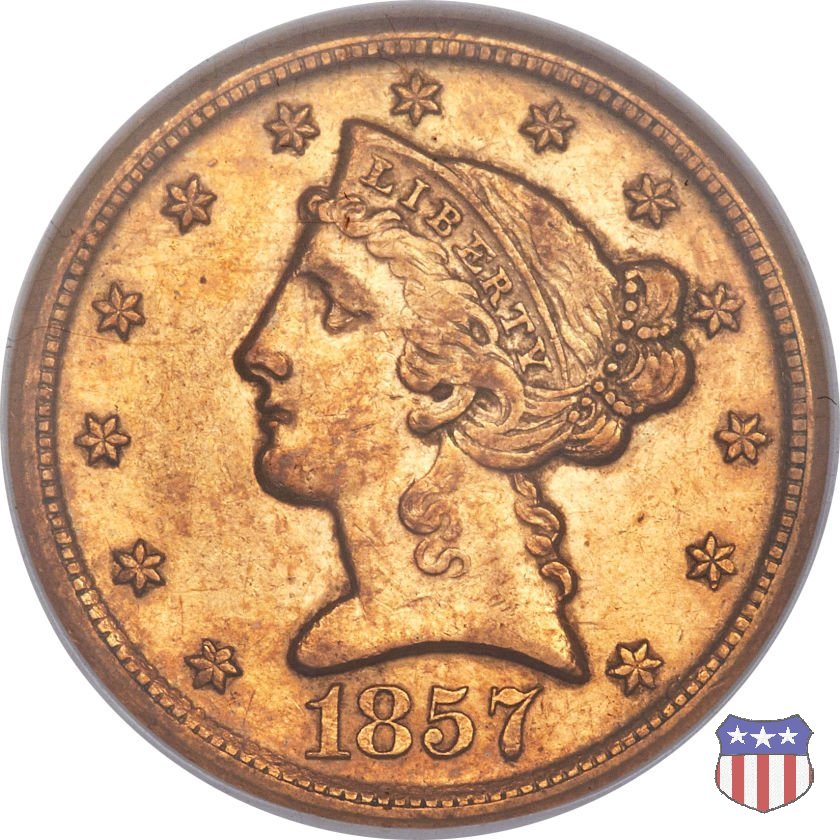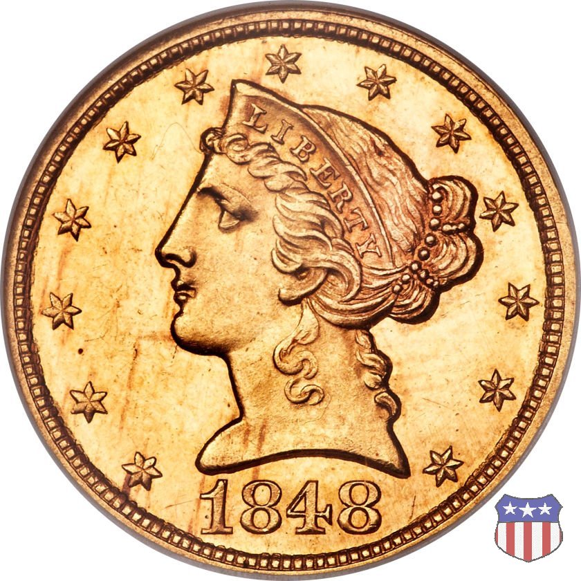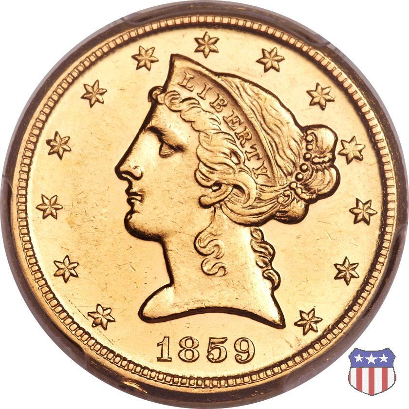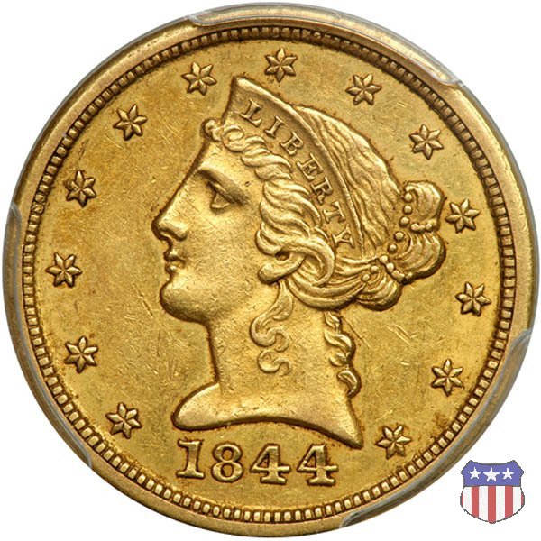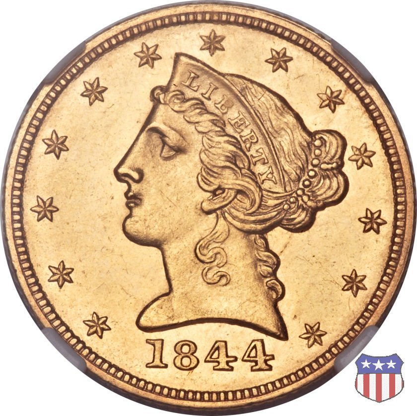 Negli stessi anni in cui creava il dollaro e le altre monete d'argento conosciute come "Liberty Seated", Christian Gobrecht lavorò anche sulle monete d'oro, sia da 2,50 che da 5 e 10 dollari, proponendo per tutte le stesso disegno (unica variante la presenza o meno del motto sulle monete da 5 e 10 dollari). Conosciuto come "Liberty Head", sulla "Half Eagle" questo disegno è stato utilizzato dal 1840 al 1866 nella variante "No Motto", e dal 1866 al 1908 con l'aggiunta del motto IN GOD WE TRUST in un cartiglio sopra la testa dell'aquila. Il dritto mostra una testa coronata di Liberty di ispirazione neoclassica, mentre il rovescio ripropone l'aquila ad ali spiegate con scudo sul petto già vista nelle tipologie precedenti. Da segnalare nella tipologia "No Motto", la grande rarità delle prime coniazioni di San Francisco, nel 1854. Appena 268 esemplari coniati, di cui soltanto tre sono oggi conosciuti. Nel 1840 è stato variato il diametro delle monete. Dopo che una parte di esse era stata coniata a 22,5 mm., si è passati a un diametro piú piccolo, 21,6 mm., mantenuto poi fino al 1929, ultimo anno di coniazione delle "Half Eagles". Segno di zecca: - C Charlotte - D Dahlonega - O New Orleans - S San Francisco - senza segno Philadelphia | ||||||||||||||||