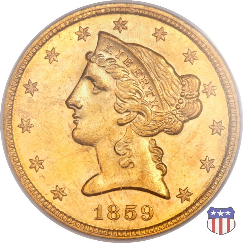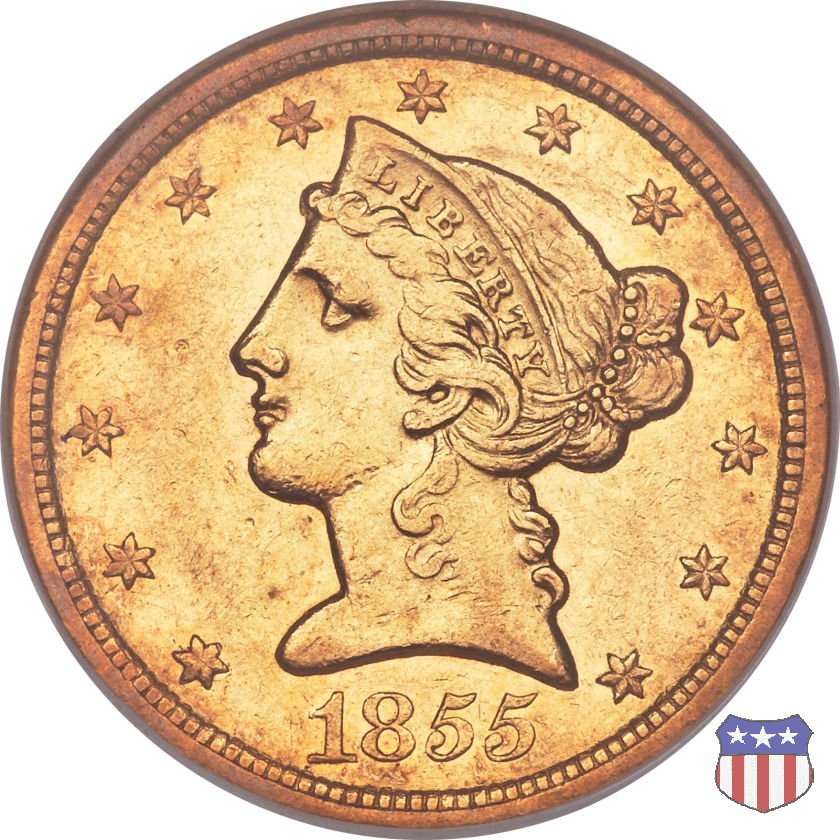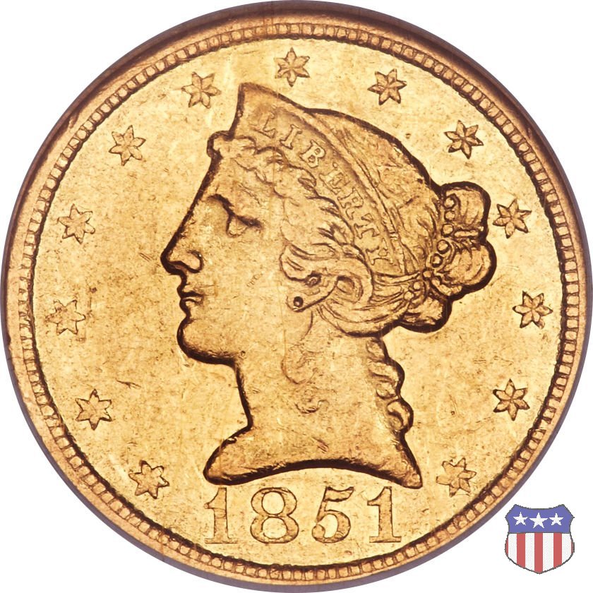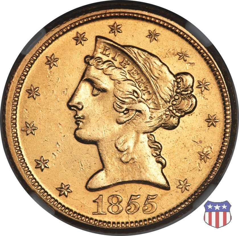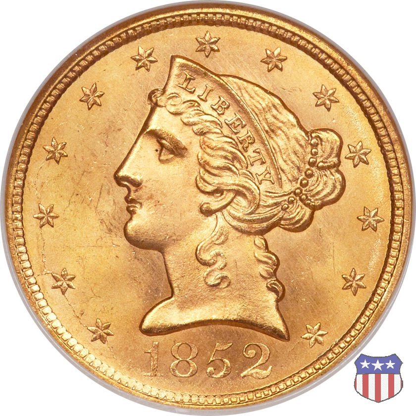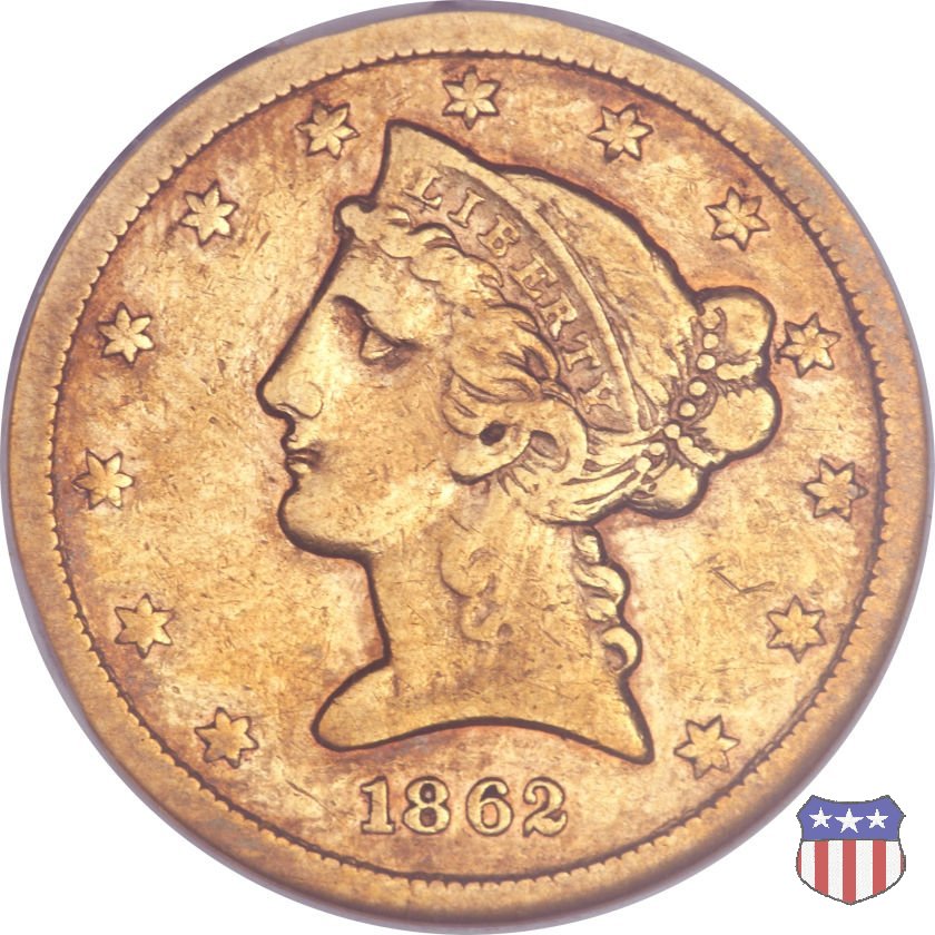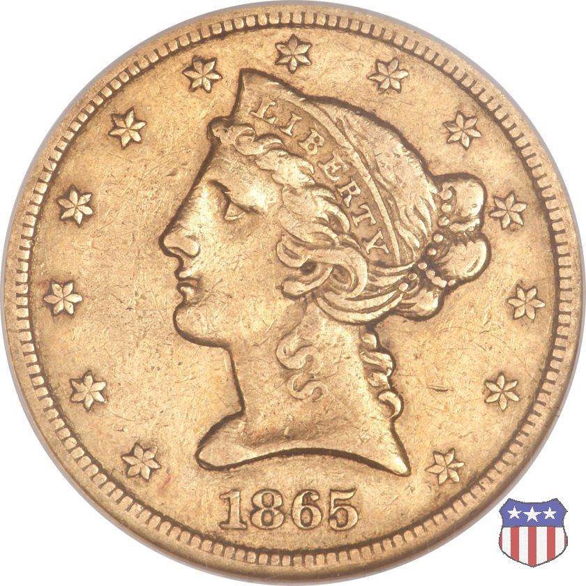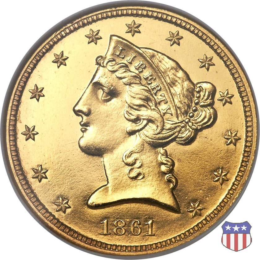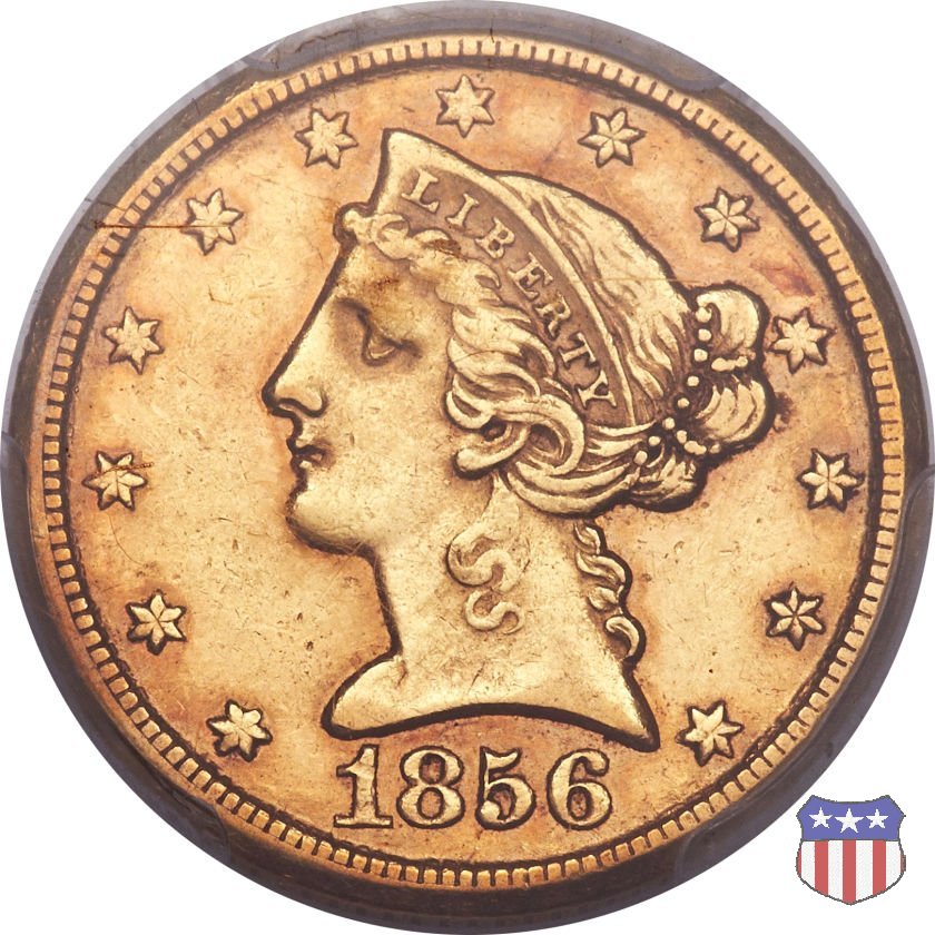 Negli stessi anni in cui creava il dollaro e le altre monete d'argento conosciute come "Liberty Seated", Christian Gobrecht lavorò anche sulle monete d'oro, sia da 2,50 che da 5 e 10 dollari, proponendo per tutte le stesso disegno (unica variante la presenza o meno del motto sulle monete da 5 e 10 dollari). Conosciuto come "Liberty Head", sulla "Half Eagle" questo disegno è stato utilizzato dal 1840 al 1866 nella variante "No Motto", e dal 1866 al 1908 con l'aggiunta del motto IN GOD WE TRUST in un cartiglio sopra la testa dell'aquila. Il dritto mostra una testa coronata di Liberty di ispirazione neoclassica, mentre il rovescio ripropone l'aquila ad ali spiegate con scudo sul petto già vista nelle tipologie precedenti. Da segnalare nella tipologia "No Motto", la grande rarità delle prime coniazioni di San Francisco, nel 1854. Appena 268 esemplari coniati, di cui soltanto tre sono oggi conosciuti. Nel 1840 è stato variato il diametro delle monete. Dopo che una parte di esse era stata coniata a 22,5 mm., si è passati a un diametro piú piccolo, 21,6 mm., mantenuto poi fino al 1929, ultimo anno di coniazione delle "Half Eagles". Segno di zecca: - C Charlotte - D Dahlonega - O New Orleans - S San Francisco - senza segno Philadelphia | ||||||||||||||||