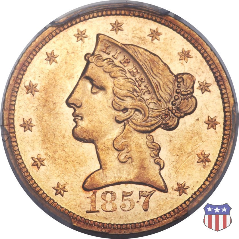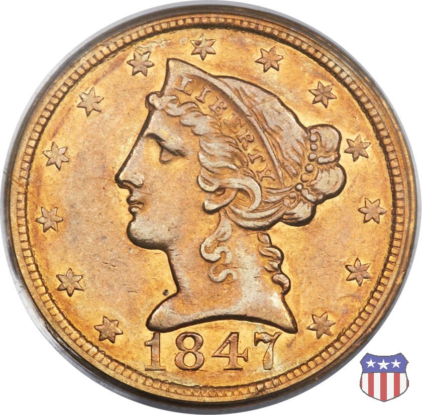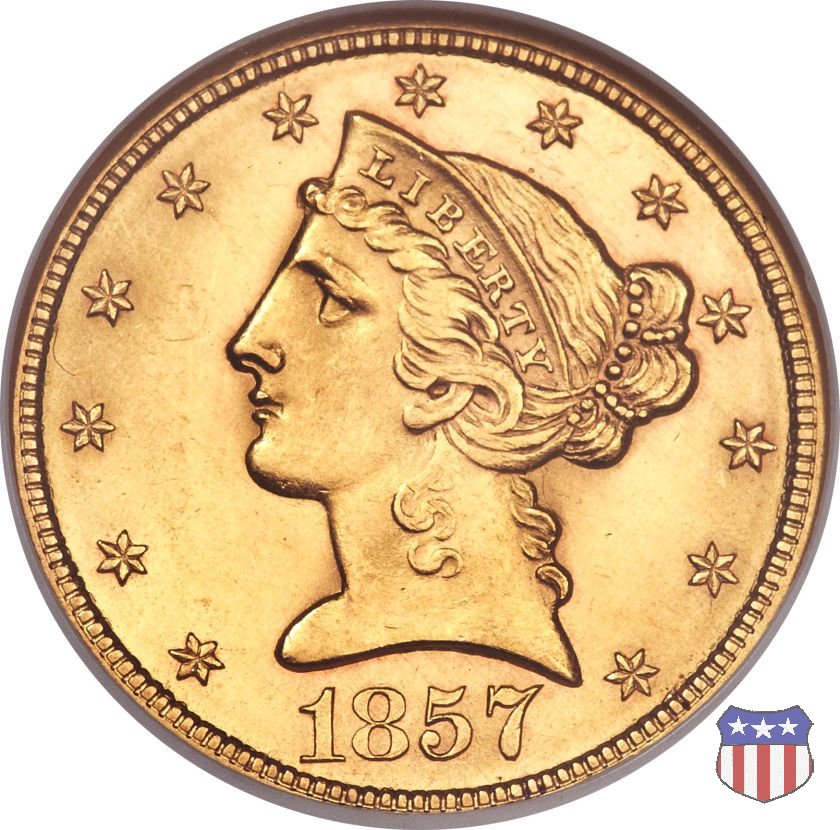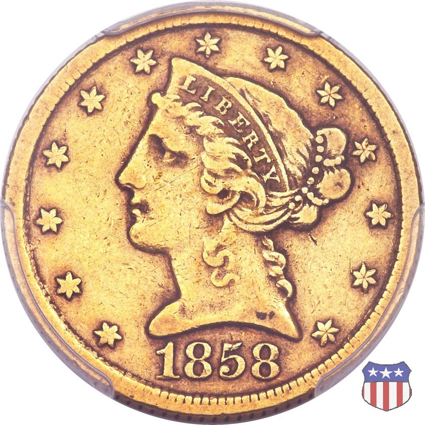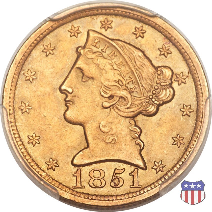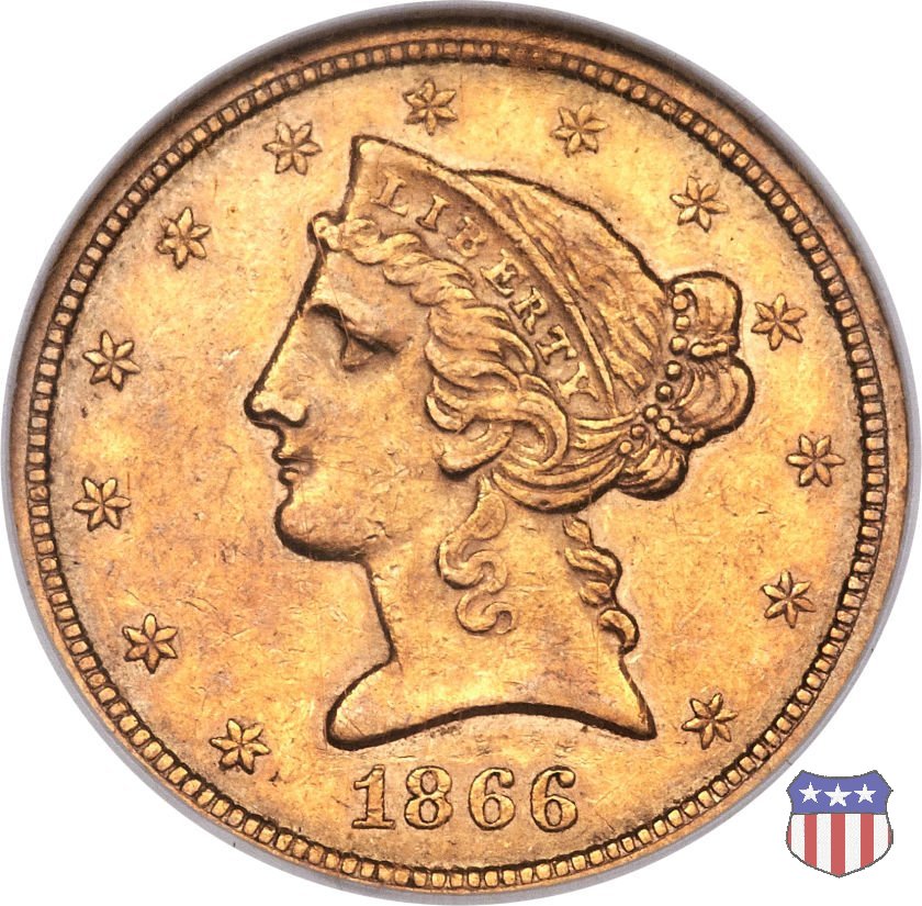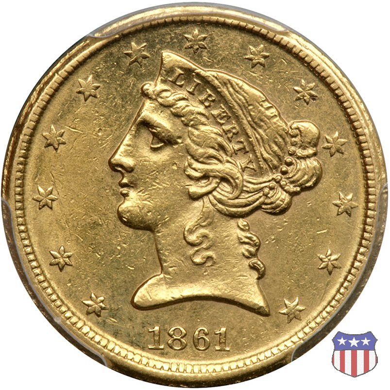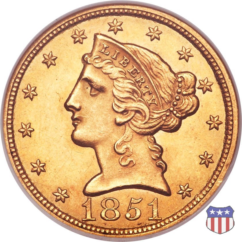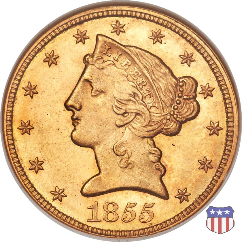 Negli stessi anni in cui creava il dollaro e le altre monete d'argento conosciute come "Liberty Seated", Christian Gobrecht lavorò anche sulle monete d'oro, sia da 2,50 che da 5 e 10 dollari, proponendo per tutte le stesso disegno (unica variante la presenza o meno del motto sulle monete da 5 e 10 dollari). Conosciuto come "Liberty Head", sulla "Half Eagle" questo disegno è stato utilizzato dal 1840 al 1866 nella variante "No Motto", e dal 1866 al 1908 con l'aggiunta del motto IN GOD WE TRUST in un cartiglio sopra la testa dell'aquila. Il dritto mostra una testa coronata di Liberty di ispirazione neoclassica, mentre il rovescio ripropone l'aquila ad ali spiegate con scudo sul petto già vista nelle tipologie precedenti. Da segnalare nella tipologia "No Motto", la grande rarità delle prime coniazioni di San Francisco, nel 1854. Appena 268 esemplari coniati, di cui soltanto tre sono oggi conosciuti. Nel 1840 è stato variato il diametro delle monete. Dopo che una parte di esse era stata coniata a 22,5 mm., si è passati a un diametro piú piccolo, 21,6 mm., mantenuto poi fino al 1929, ultimo anno di coniazione delle "Half Eagles". Segno di zecca: - C Charlotte - D Dahlonega - O New Orleans - S San Francisco - senza segno Philadelphia | ||||||||||||||||