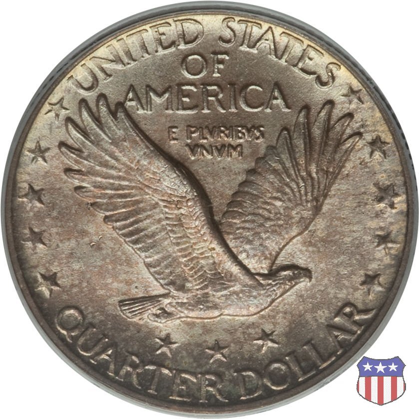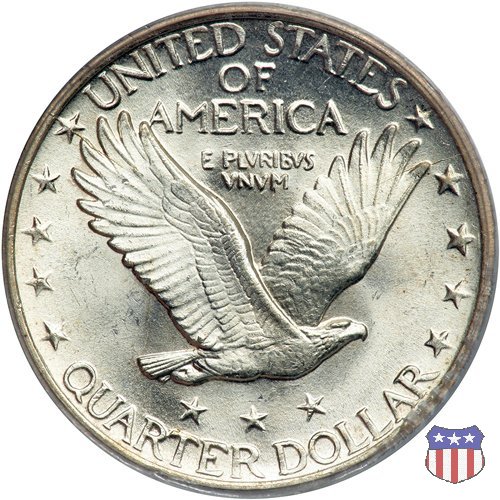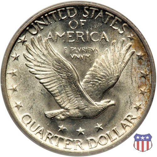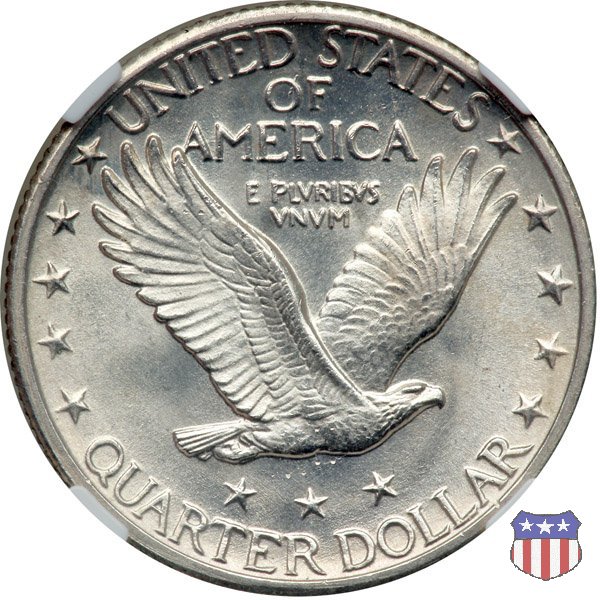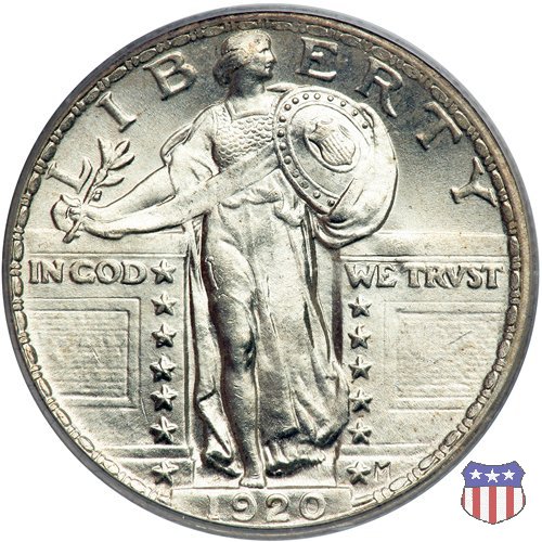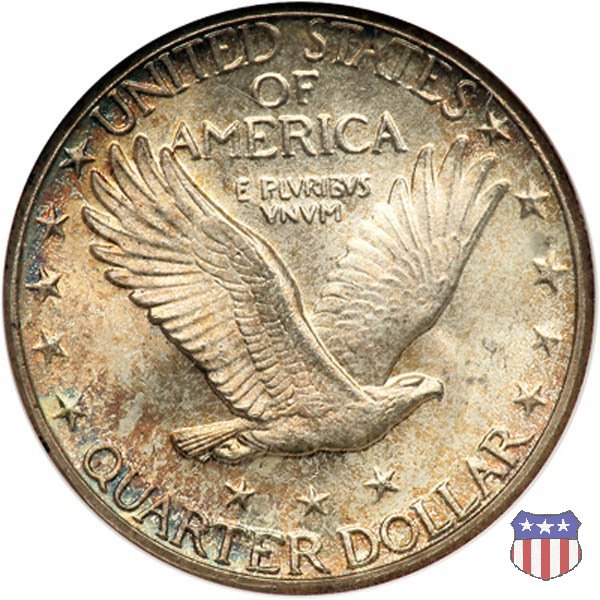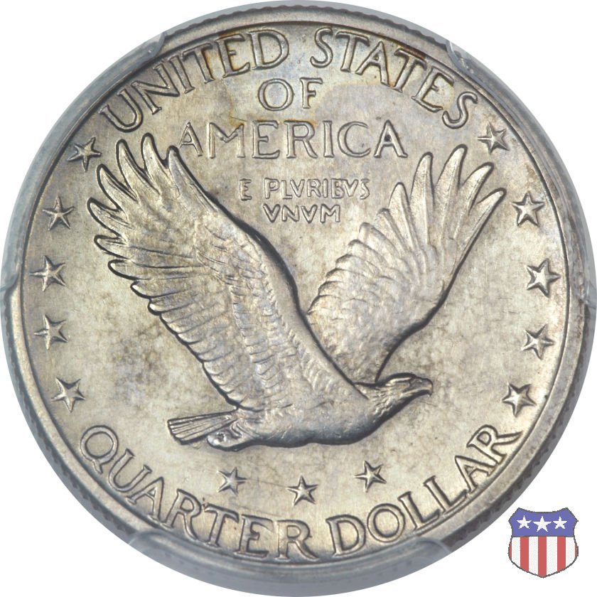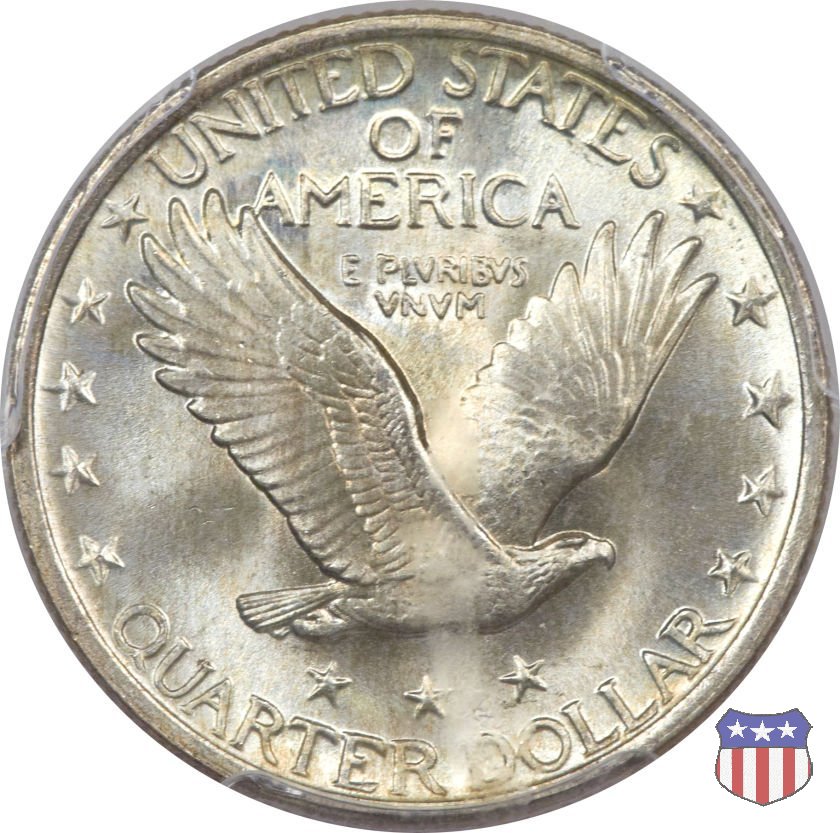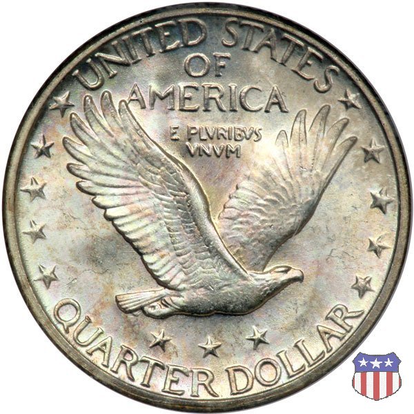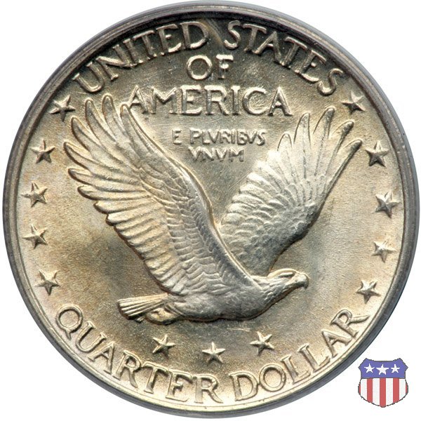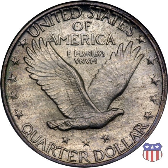 Appena un anno dopo la sua prima uscita, la "Standing Liberty" di Hermon MacNeil subí importanti modifiche, apportate dall'incisore-capo della Zecca, George Morgan. Il rovescio, prima appesantito dall'affollamento delle 13 stelle tra le legende, venne migliorato grazie a uno spostamento verso l'alto dell'aquila e a un diverso posizionamento delle stelle. E' questa modifica a dare il nome alla Variante 2 della moneta, nota come "Stars Below Eagle". Una modifica ancora piú importante riguardò il dritto, dove il seno di Liberty fu coperto da una sorta di corazza. La tradizione numismatica vuole che tale modifica sia stata dovuta alla pressione dell'opinione pubblica, scandalizzata dalla nudità, ma non è stato trovato alcun documento che supporti questa storia. La decisione fu probabilmente presa su richiesta del Dipartimento del Tesoro: una Liberty piú "guerriera", quale appariva rivestita da una corazza, poteva anch'essa servire a sensibilizzare un'America da poco entrata nella Prima Guerra Mondiale. Furono inoltre modificati gli stampi, resi parzialmente convessi perché, venne spiegato, in questo modo avrebbero lavorato meglio, e la qualità del conio ne avrebbe tratto giovamento. In realtà, avvenne esattamente il contrario. Molte monete del secondo tipo presentano infatti una scarsa definizione in molti dettagli, in particolare nei capelli e nel viso di Lady Liberty: le monete meglio riuscite vengono segnalate come "Full Head". Un'ultima modifica fu apportata nel 1925. MacNeil aveva posto la data in una posizione che la rendeva illeggibile dopo solo pochi anni di circolazione. Con questa modifica, il rilievo che ospitava la data venne tagliato via, la data stessa posta all'interno della depressione conseguente ("Recessed Date"), e questo fu sufficiente a preservarla nelle monete emesse dal 1925 al 1930. Lo "Standing Liberty Quarter Dollar" di Hermon MacNeil, probabilmente la piú bella moneta di questa tipologia, ebbe vita breve. Dopo appena 15 anni la sua produzione venne a cessare, per far posto al "Washington Quarter" emesso nel 1932 per celebrare il bicentenario della nascita del primo Presidente degli Stati Uniti, il cui ritratto continua a campeggiare ancora oggi sul dritto della moneta. Segno di zecca: - D Denver - S San Francisco - senza segno Philadelphia | ||||||||||||