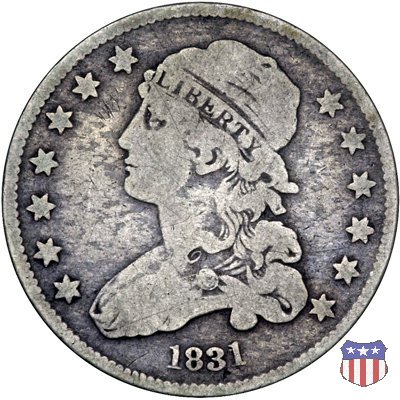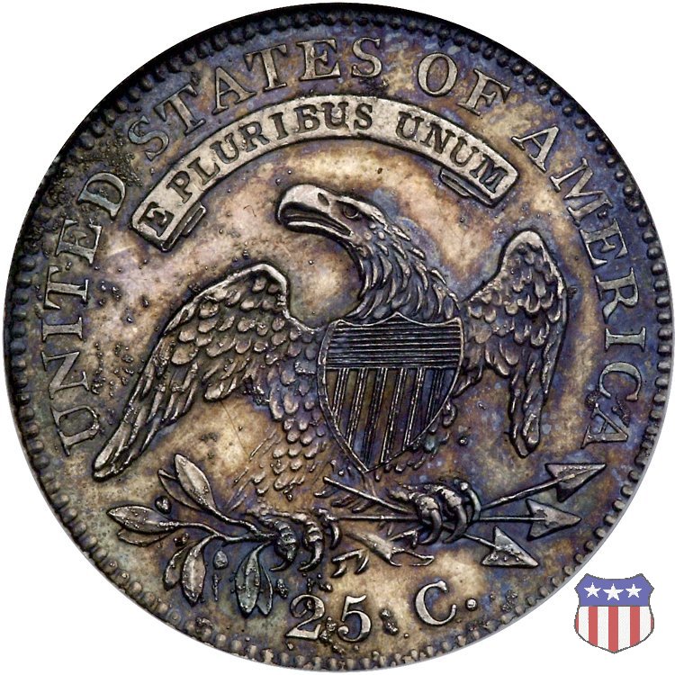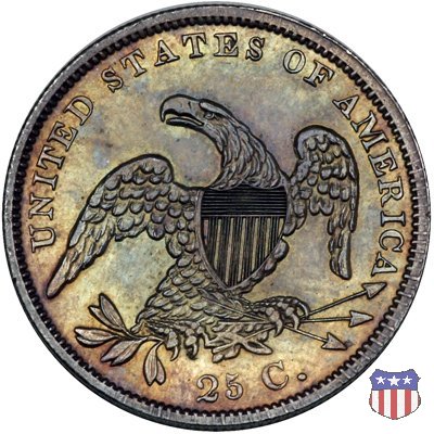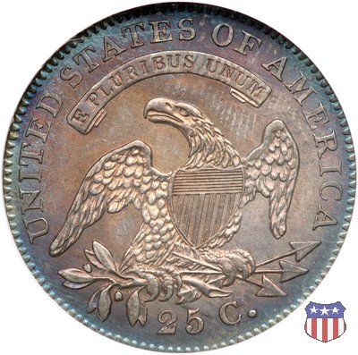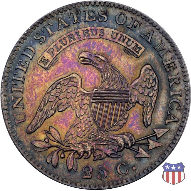 L'autore del quarto di dollaro "Capped Bust" (e di numerose altre monete) era un immigrato di origini bavaresi, Johann Matthias Reich (poi americanizzato in John Reich), che dopo aver lavorato come medaglista insieme a suo padre, era scappato dall'Europa nel 1800 per sfuggire alle guerre napoleoniche. Stabilitosi a Philadelphia, nel 1801, su raccomandazione del Presidente Jefferson, venne assunto alla Zecca. Ma la Zecca in quel momento non aveva bisogno di un incisore, e cosí gli furono affidate altre mansioni. Fu soltanto nel 1807 che divenne assistente dell'incisore-capo, Robert Scot, e subito gli fu affidata la realizzazione di nuove monete, in particolare il mezzo dollaro d'argento e la mezza aquila (5 dollari) d'oro, che erano le piú richieste dalle banche. Le monete di Reich mostrano tutte lo stesso disegno, utilizzato sul quarto di dollaro a partire dal 1815: una formosa Lady Liberty al dritto (per la quale i critici dissero, probabilmente non senza ragione, che l'artista aveva ritratto la sua grassa amante) e un'aquila ad ali spiegate con scudo sul petto, disegno piú tardi noto come "sandwich-board", al rovescio. Lady Liberty indossa un cappello (Liberty Cap), che attirò anch'esso critiche, in quanto fu preso per un tipo di copricapo che nell'antica Roma identificava i liberti, gli schiavi liberati. Venne infine precisato (fu Thomas Jefferson in persona a farlo) che si trattava in realtà di una rielaborazione di un cappello allora di moda, detto "mobcap", che può essere visto su alcuni ritratti di Martha Washington. I quarti di dollaro disegnati da Reich furono coniati, in maniera non continuativa, dal 1815 al 1838. Fino al 1828 al rovescio della moneta, in un cartiglio sopra la testa dell'aquila, compare il motto E PLURIBUS UNUM, e la moneta ha un diametro di 27 mm. (Large Diameter). Dal 1831 (nel 1829 e 1830 i quarti non furono coniati) il motto scompare, e la moneta riduce il suo diametro a 24,3 mm. (Reduced Diameter). Nel 1837 infine, viene leggermente aumentato il titolo dell'argento, che passa da 0,8924 a 0,900, e tale rimarrà fino al 1964. | ||||||||||||||