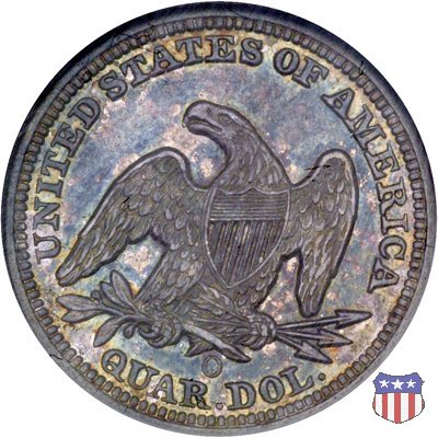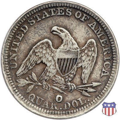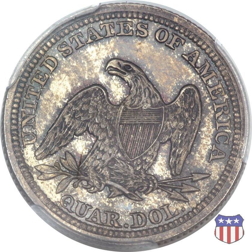 Figura femminile simboleggiante Lady Liberty, con un lungo abito drappeggiato, seduta su una roccia. Con la mano sinistra tiene un'asta, sormontata da un berretto frigio. La mano destra si appoggia a uno scudo e tiene una fascia con la scritta LIBERTY. Nel giro, un arco di 13 stelle, sotto la base della roccia la data, ai cui lati appaiono due frecce, volte a destra e a sinistra. Aquila ad ali spiegate, con scudo sul petto, che stringe un ramo d'ulivo nel suo artiglio destro, e un mazzo di frecce nel sinistro. Le parole UNITED STATES OF AMERICA compaiono sopra l'aquila; il valore, abbreviato, QUAR. DOL., al disotto. Il marchio di zecca, ove presente, appare appena al disotto dell'aquila.