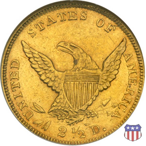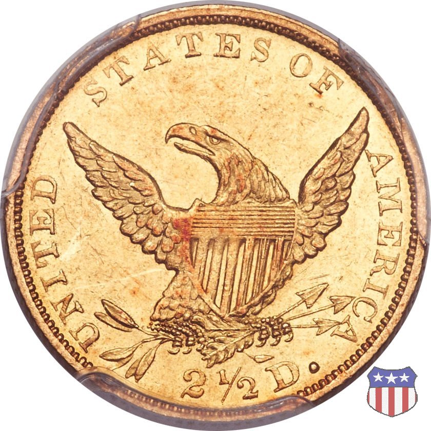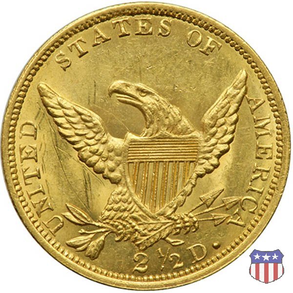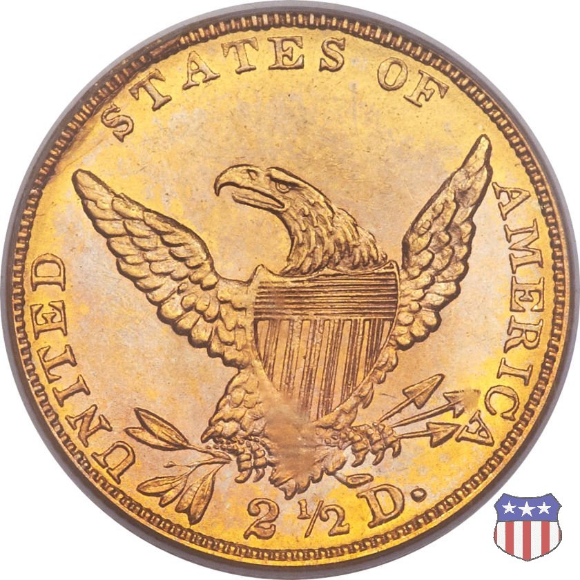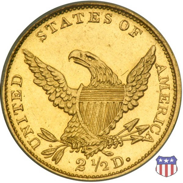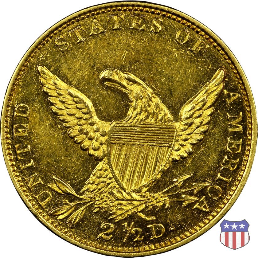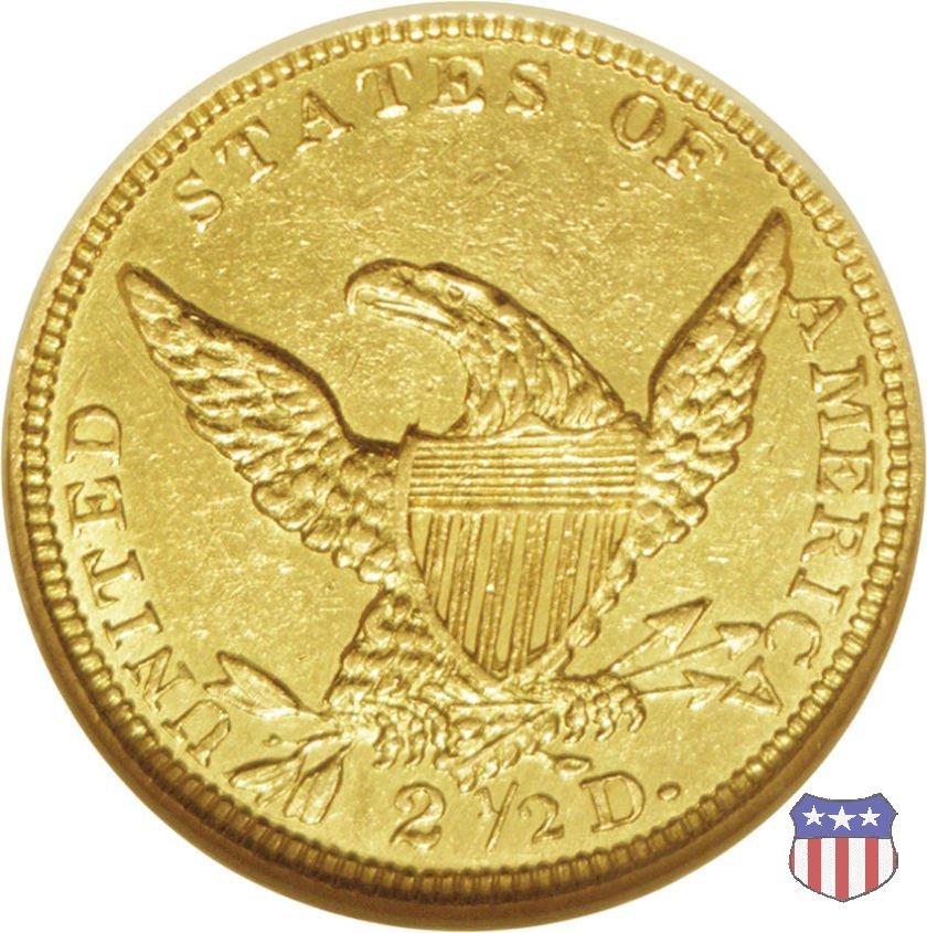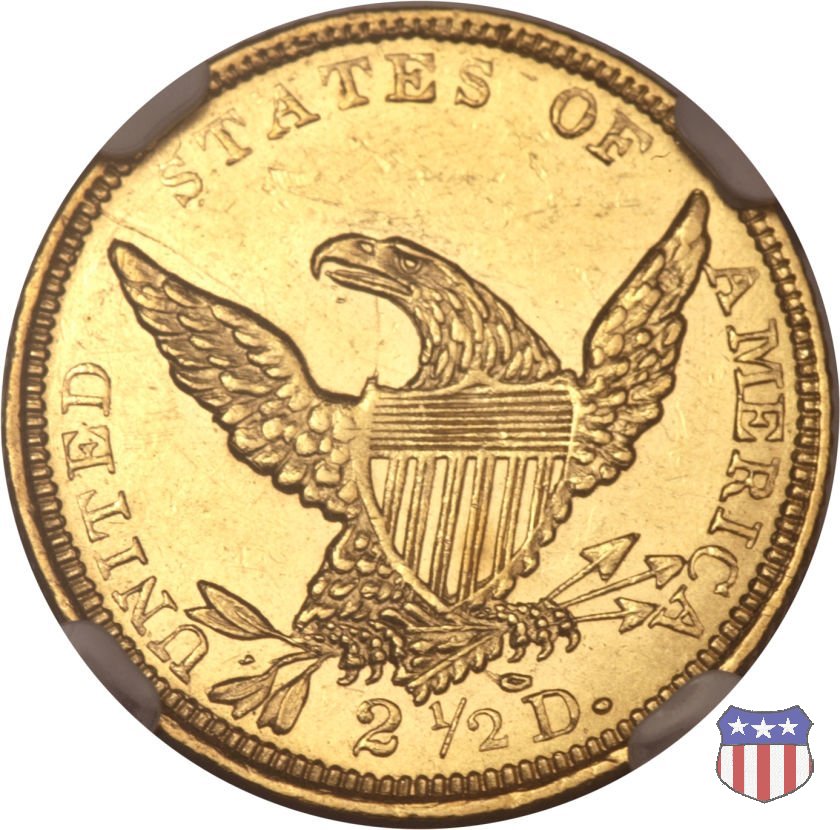 Testa di Lady Liberty volta a sinistra, con un nastro a legare i lunghi capelli ricci e sul quale è incisa la parola LIBERTY. Nel giro 13 stelle, in basso la data. Il marchio di zecca, ove presente, è posizionato tra la troncatura del collo e la data. Aquila ad ali spiegate, con scudo sul petto, che stringe un ramo d'ulivo nel suo artiglio destro, e un mazzo di frecce nel sinistro. Nel giro UNITED STATES OF AMERICA, in basso il valore, 2-1/2 D.