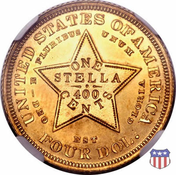 Stella a 5 punte, al cui interno compare l'iscrizione ONE STELLA-400 CENTS. Circoscrivono la stella i motti E PLURIBUS UNUM e DEO EST GLORIA. Nel giro UNITED STATES OF AMERICA e il valore, FOUR DOL.