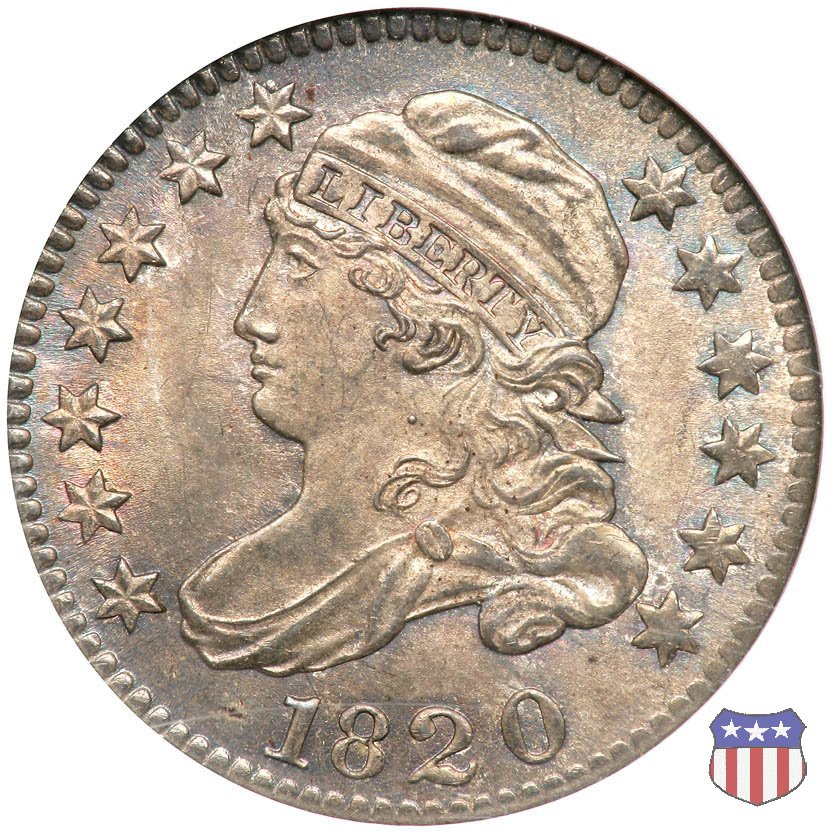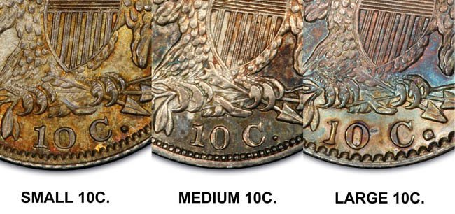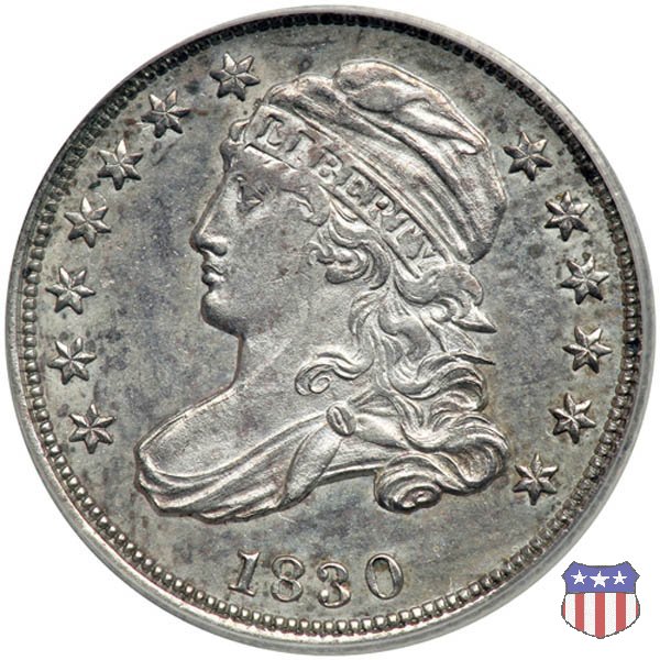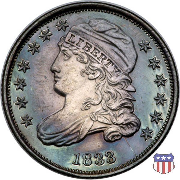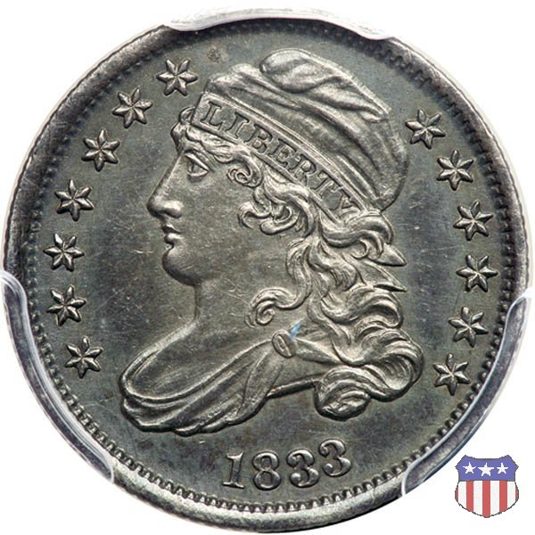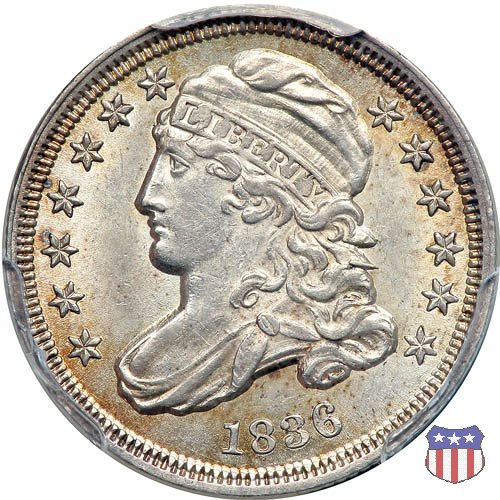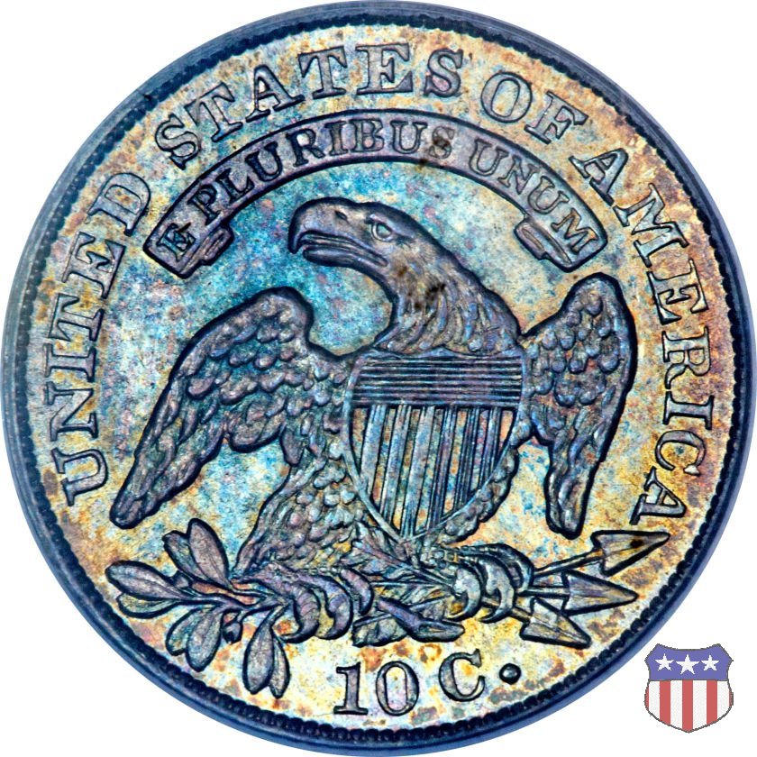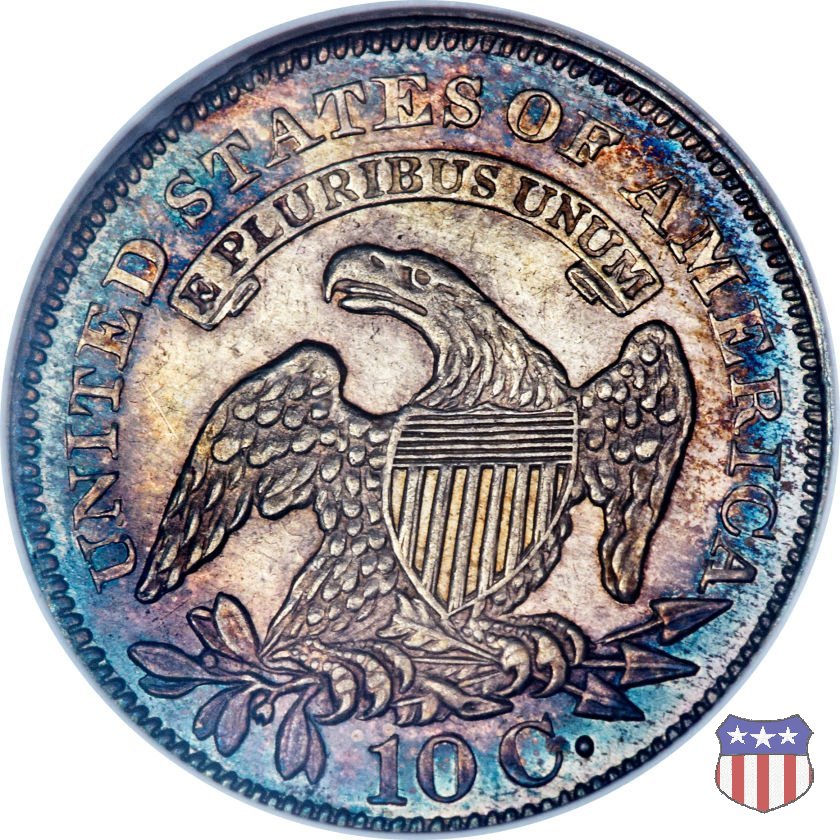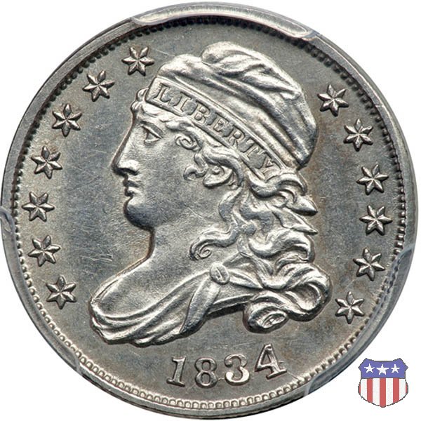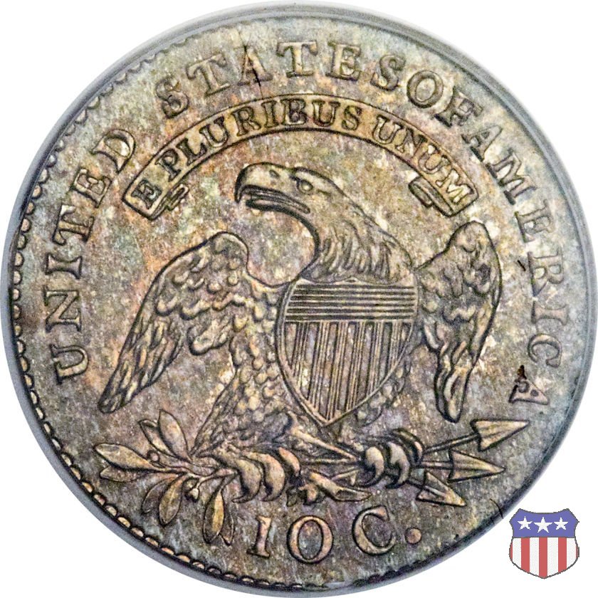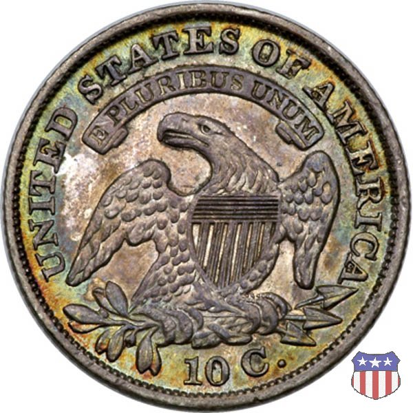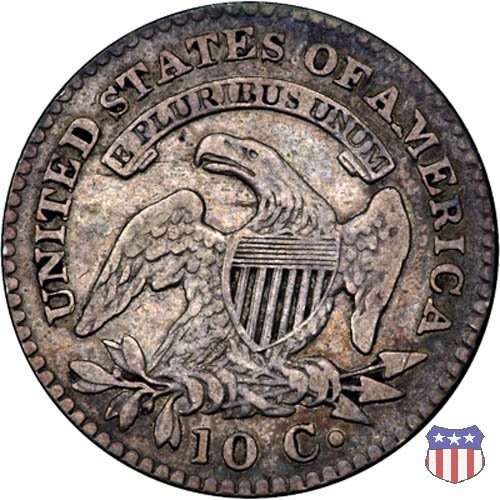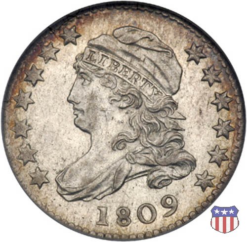 Il "Capped Bust Dime" è stato coniato in maniera non continuativa dal 1809 al 1837, e presenta numerose varianti. Due sono le principali, il tipo detto "Wide Border" (bordo ampio) coniato dal 1809 al 1828, e il tipo "Beaded Border" coniato dal 1828 (variante "Small Date") al 1837. Con l'adozione di questo secondo tipo di bordo, il diametro della moneta, che in precedenza era all'incirca di 18,8 mm. (variabile), venne stabilizzato nella misura fissa di 18,5 mm.