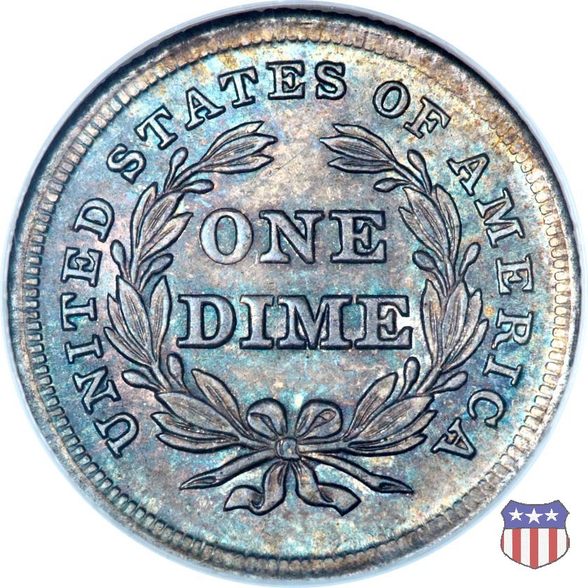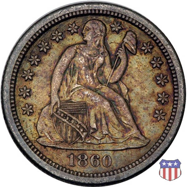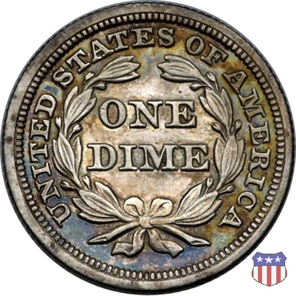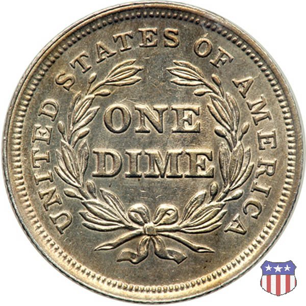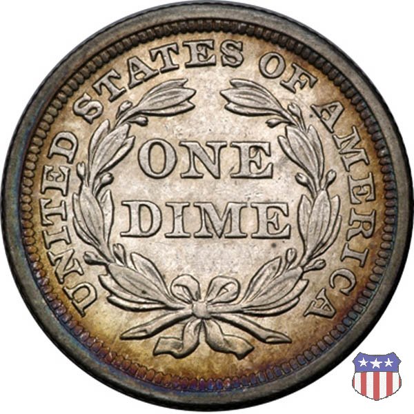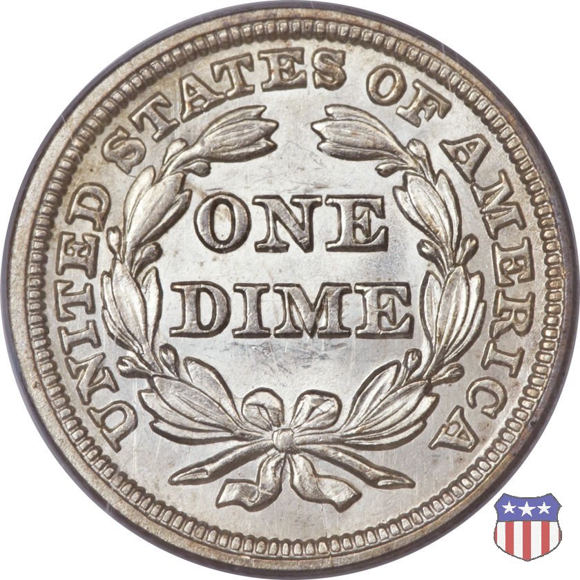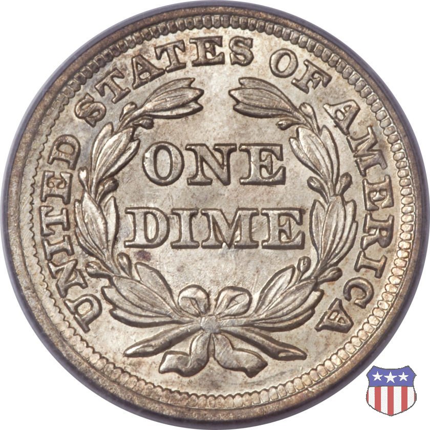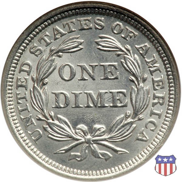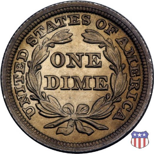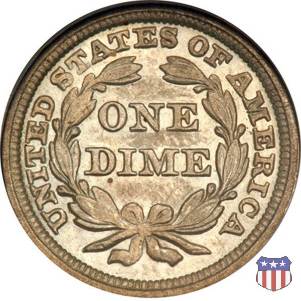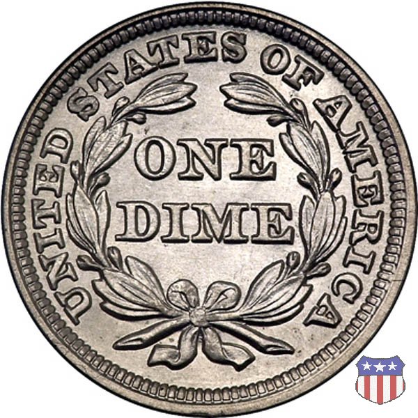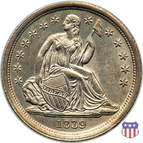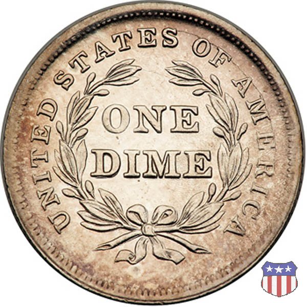 Il dime disegnato da Christian Gobrecht, porta al dritto la figura seduta di Lady Liberty da cui prende nome, vista per la prima volta sul dollaro 1836, e al rovescio il valore, scritto per la prima volta nella forma ONE DIME, all'interno di una corona. Ben cinque sono le varianti di questa moneta, che si distinguono per la presenza o meno delle stelle al dritto, di due frecce ai lati della data, della legenda UNITED STATES OF AMERICA che passa dal rovescio al dritto, per la forma della corona e, "dulcis in fundo", per una differenza di peso. La Variante 2, conosciuta come "Stars on Obverse" vede l'aggiunta nel giro del dritto delle tradizionali 13 stelle, mancanti nella Variante 1. E' stata coniata dal 1838 al 1853 al peso di 2,67 grammi, e dal 1856 al 1860 al peso ridotto di 2,49 grammi (Variety 2 Resumed). Segno di zecca: - O New Orleans - S San Francisco - senza segno Philadelphia | ||||||||||||||