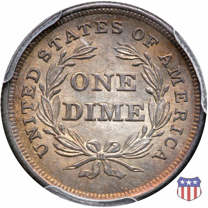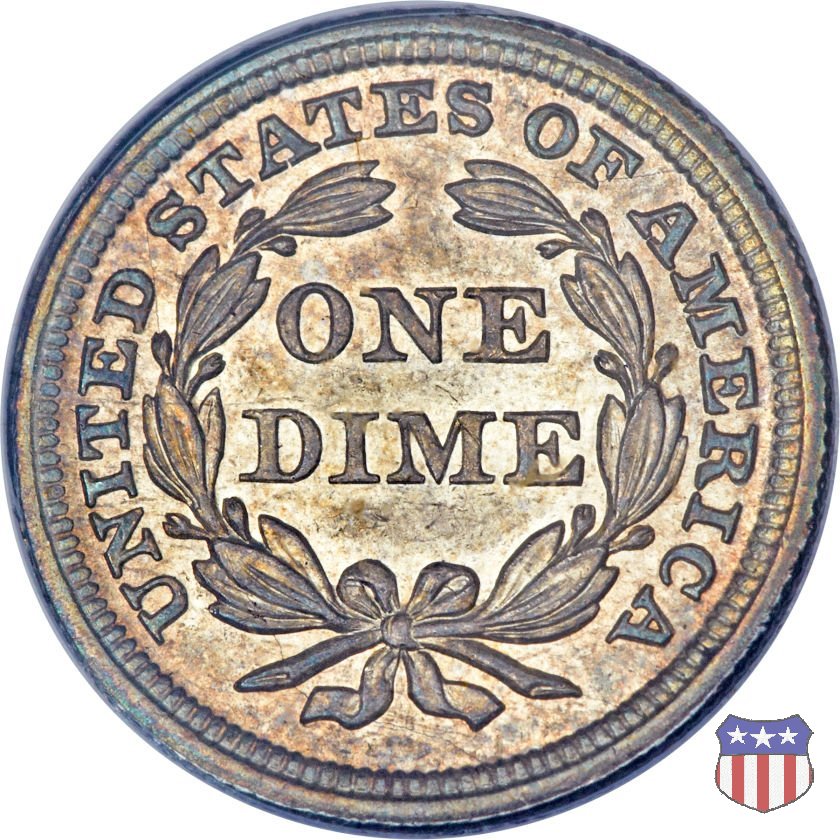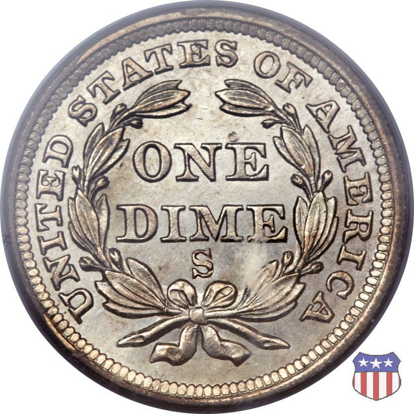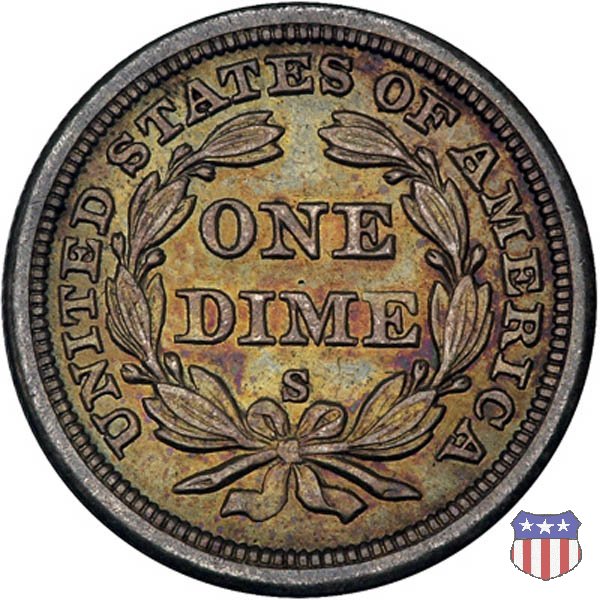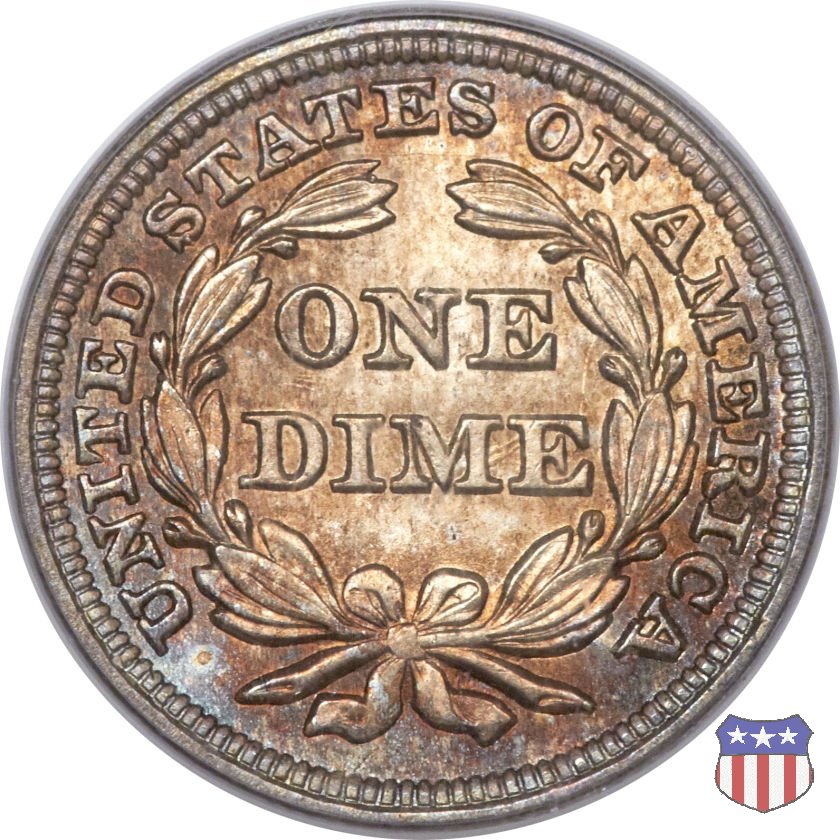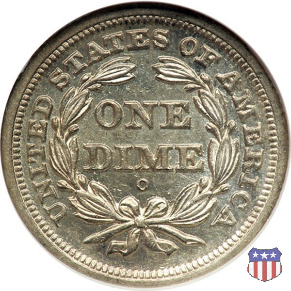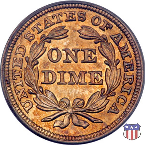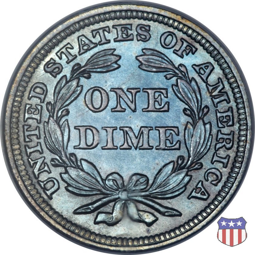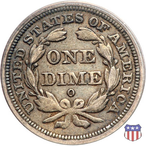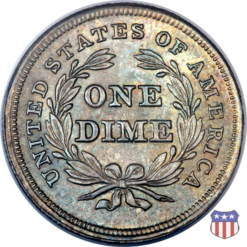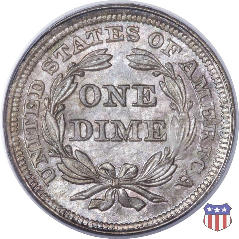Il dime disegnato da Christian Gobrecht, porta al dritto la figura seduta di Lady Liberty da cui prende nome, vista per la prima volta sul dollaro 1836, e al rovescio il valore, scritto per la prima volta nella forma ONE DIME, all'interno di una corona. Ben cinque sono le varianti di questa moneta, che si distinguono per la presenza o meno delle stelle al dritto, di due frecce ai lati della data, della legenda UNITED STATES OF AMERICA che passa dal rovescio al dritto, per la forma della corona e, "dulcis in fundo", per una differenza di peso. La Variante 2, conosciuta come "Stars on Obverse" vede l'aggiunta nel giro del dritto delle tradizionali 13 stelle, mancanti nella Variante 1. E' stata coniata dal 1838 al 1853 al peso di 2,67 grammi, e dal 1856 al 1860 al peso ridotto di 2,49 grammi (Variety 2 Resumed). Segno di zecca: - O New Orleans - S San Francisco - senza segno Philadelphia | ||||||||||||||