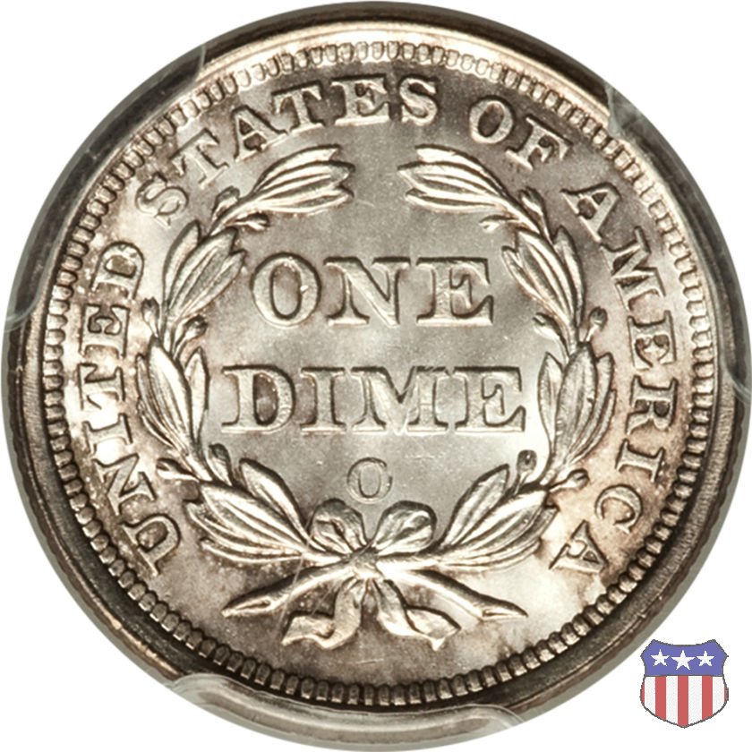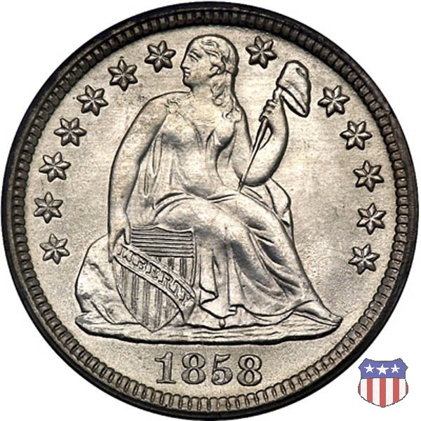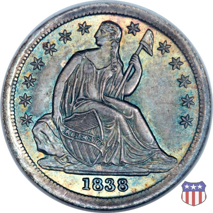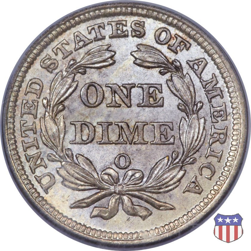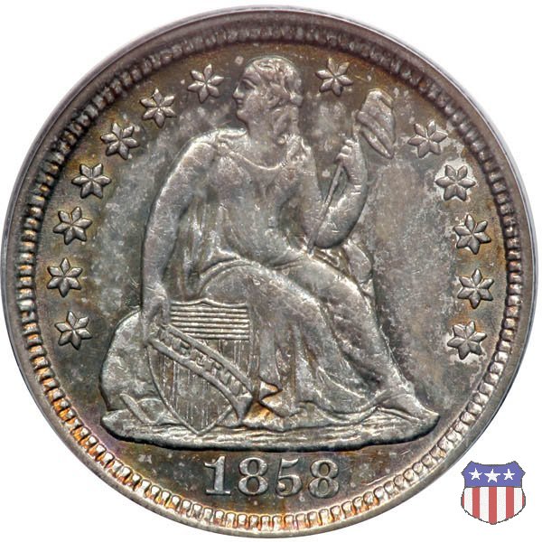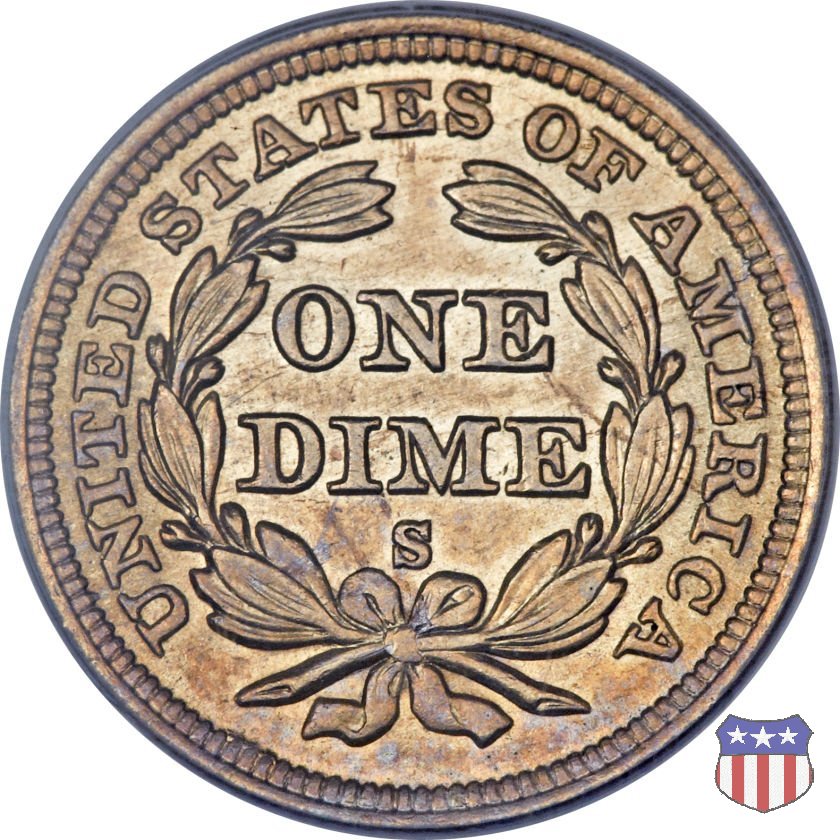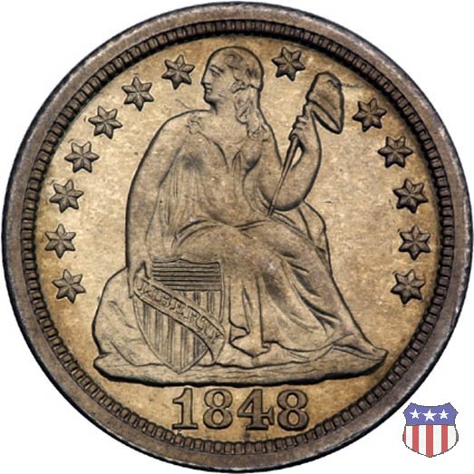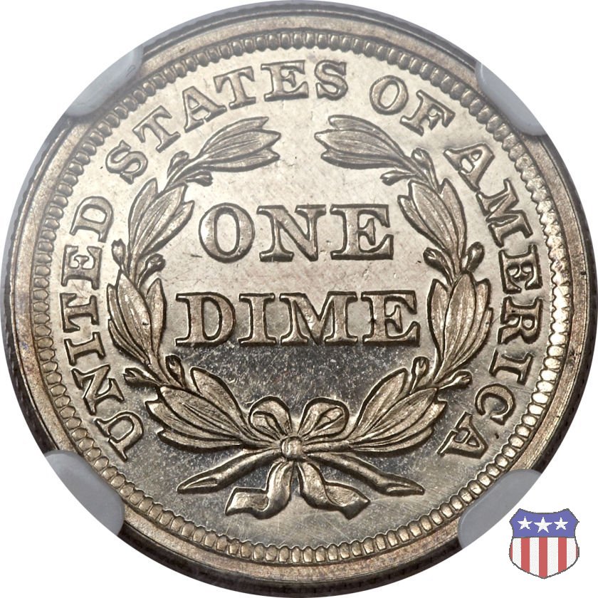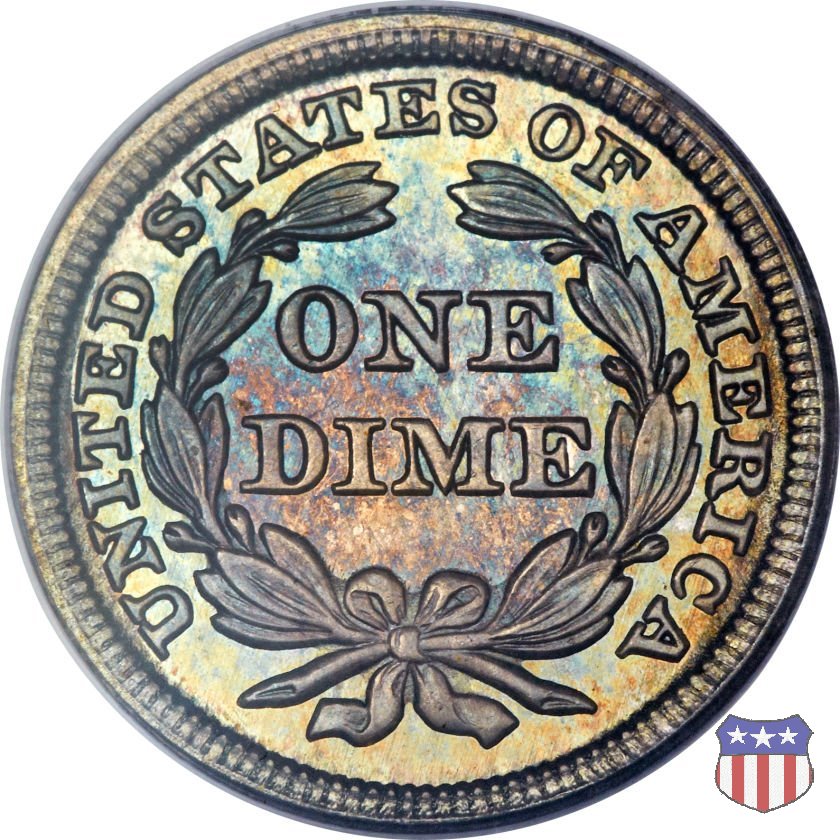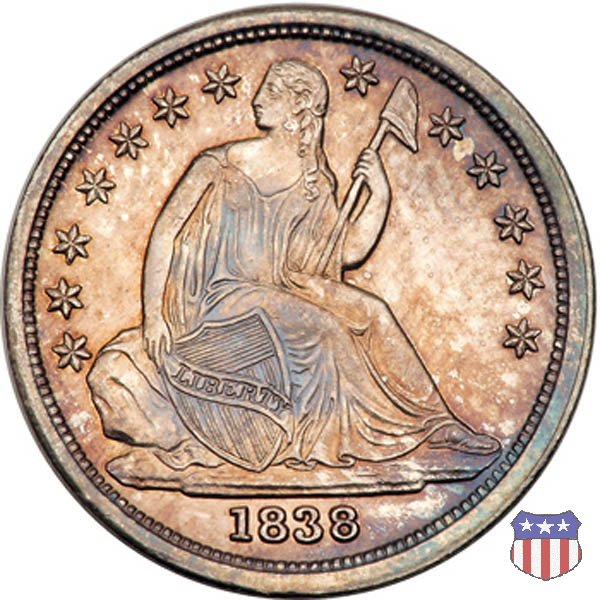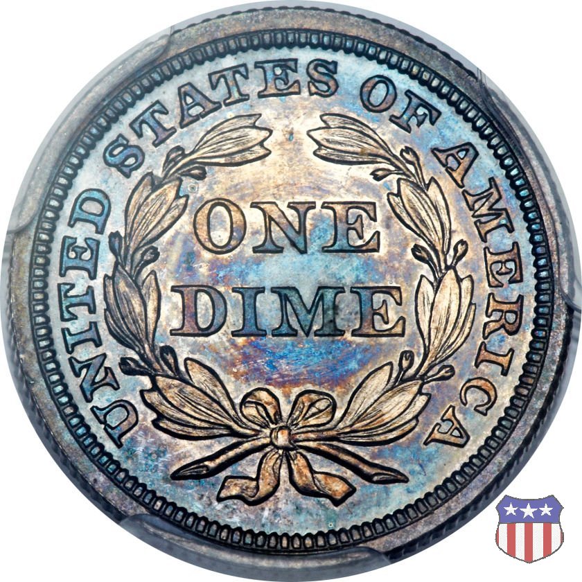 Il dime disegnato da Christian Gobrecht, porta al dritto la figura seduta di Lady Liberty da cui prende nome, vista per la prima volta sul dollaro 1836, e al rovescio il valore, scritto per la prima volta nella forma ONE DIME, all'interno di una corona. Ben cinque sono le varianti di questa moneta, che si distinguono per la presenza o meno delle stelle al dritto, di due frecce ai lati della data, della legenda UNITED STATES OF AMERICA che passa dal rovescio al dritto, per la forma della corona e, "dulcis in fundo", per una differenza di peso. La Variante 2, conosciuta come "Stars on Obverse" vede l'aggiunta nel giro del dritto delle tradizionali 13 stelle, mancanti nella Variante 1. E' stata coniata dal 1838 al 1853 al peso di 2,67 grammi, e dal 1856 al 1860 al peso ridotto di 2,49 grammi (Variety 2 Resumed). Segno di zecca: - O New Orleans - S San Francisco - senza segno Philadelphia | ||||||||||||||