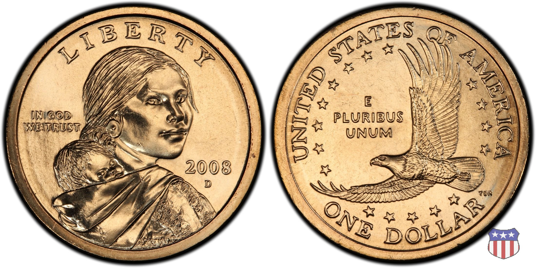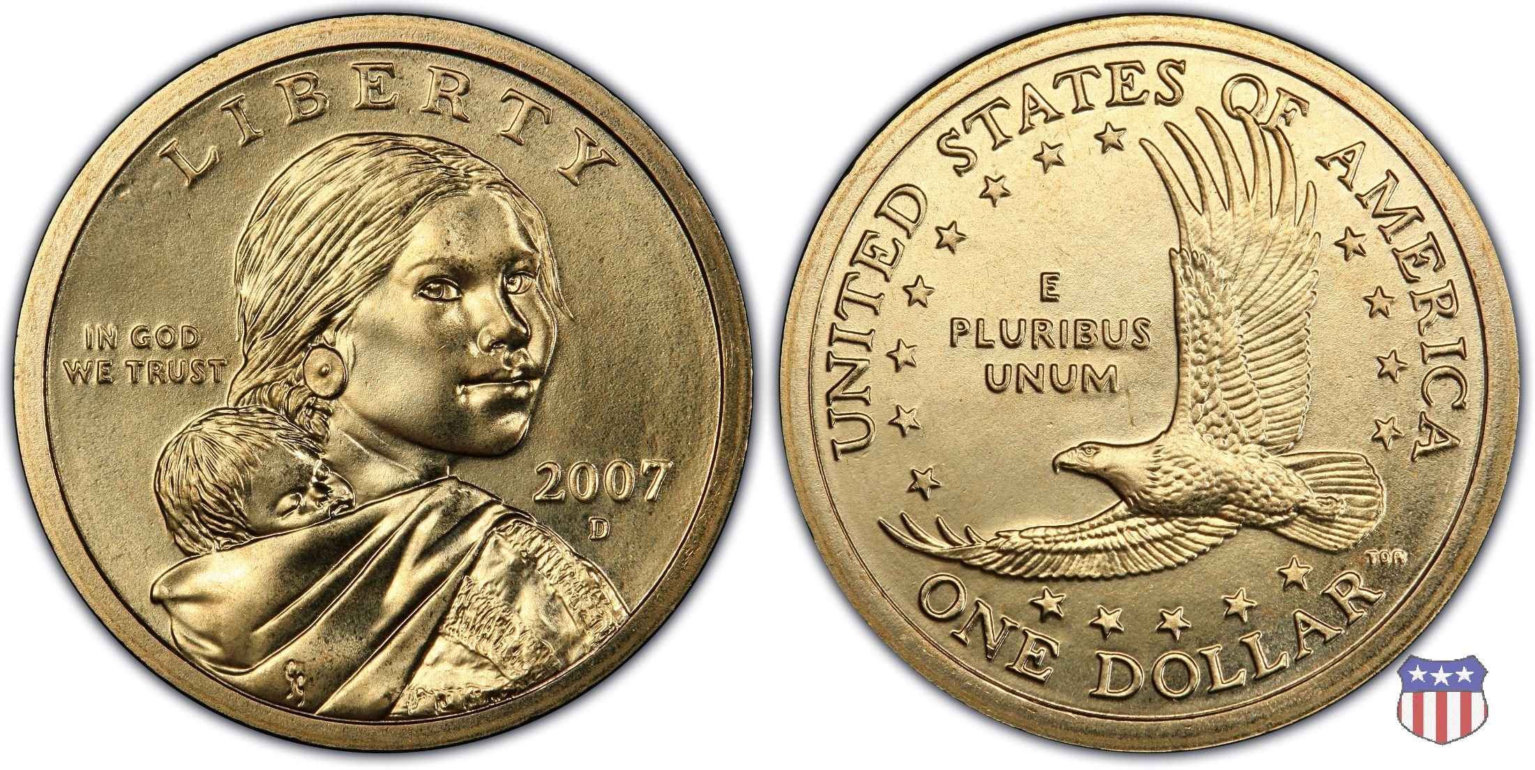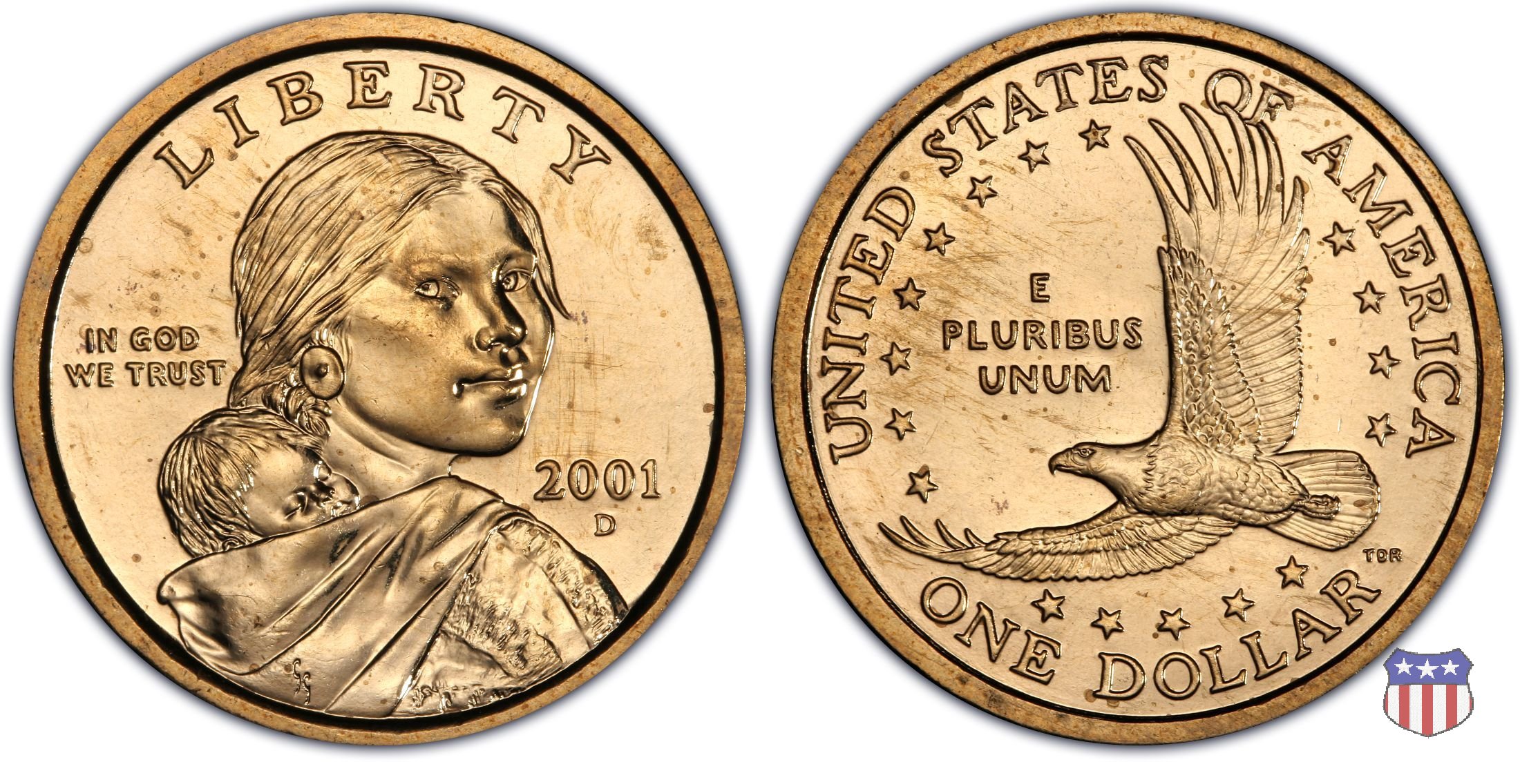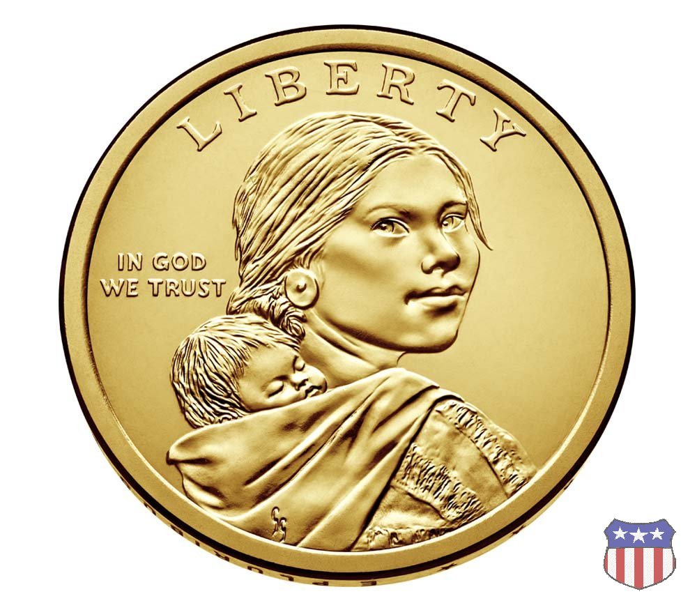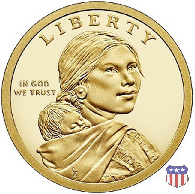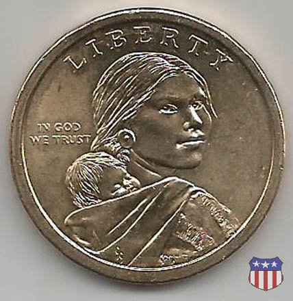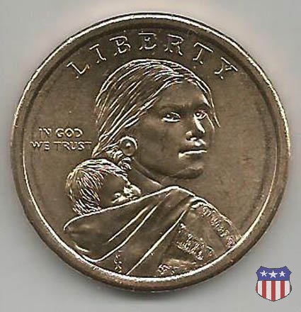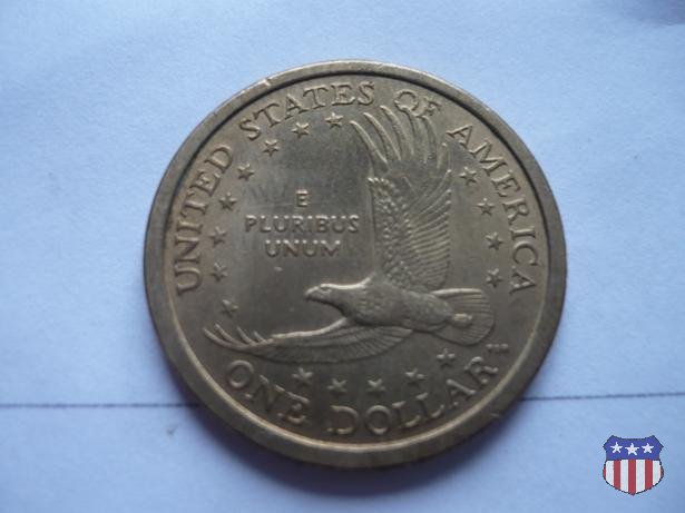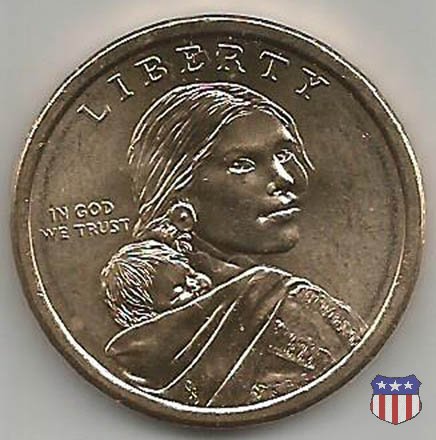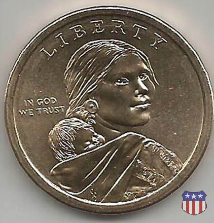 Ritratto idealizzato di Sacagawea, ragazza della tribú Shoshone famosa per aver fatto da guida e interprete alla spedizione di Lewis e Clark, che per primi traversarono l'intero continente nordamericano fino a raggiungere il Pacifico. Sacagawea porta sulla schiena suo figlio, Jean Baptiste. A prestare il suo volto a Sacagawea, di cui non esiste alcun tipo di ritratto, Randy'L He-dow Teton, della tribú Shoshone-Bannock della riserva di Fort Hall, nel sudest dell'Idaho. In alto LIBERTY, a sinistra motto IN GOD WE TRUST, a destra la data, sotto cui compare il marchio di zecca. Dal 2009 data e marchio di zecca vengono spostati sul contorno della moneta. Aquila in volo verso sinistra. Nel giro esterno, in alto UNITED STATES OF AMERICA, in basso il valore ONE DOLLAR, a seguire la R di DOLLAR le iniziali dell'incisore, TDR per Thomas D. Rogers Sr. Nel giro interno 17 stelle, a simboleggiare i 17 Stati che costituivano l'Unione al tempo della spedizione di Lewis e Clark (1804). Al centro, il motto E PLURIBUS UNUM.