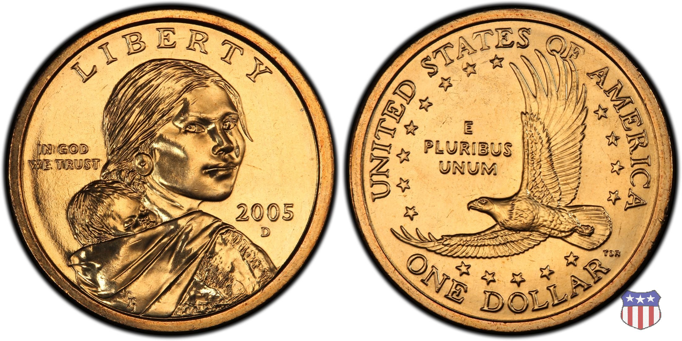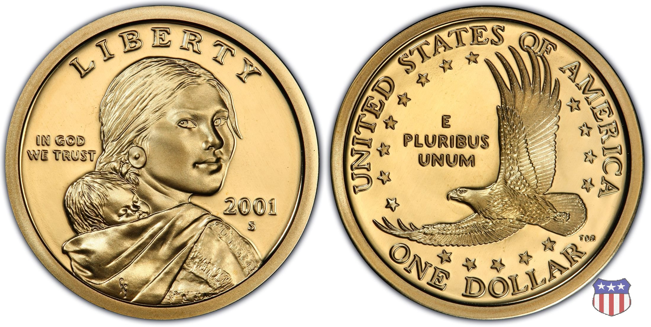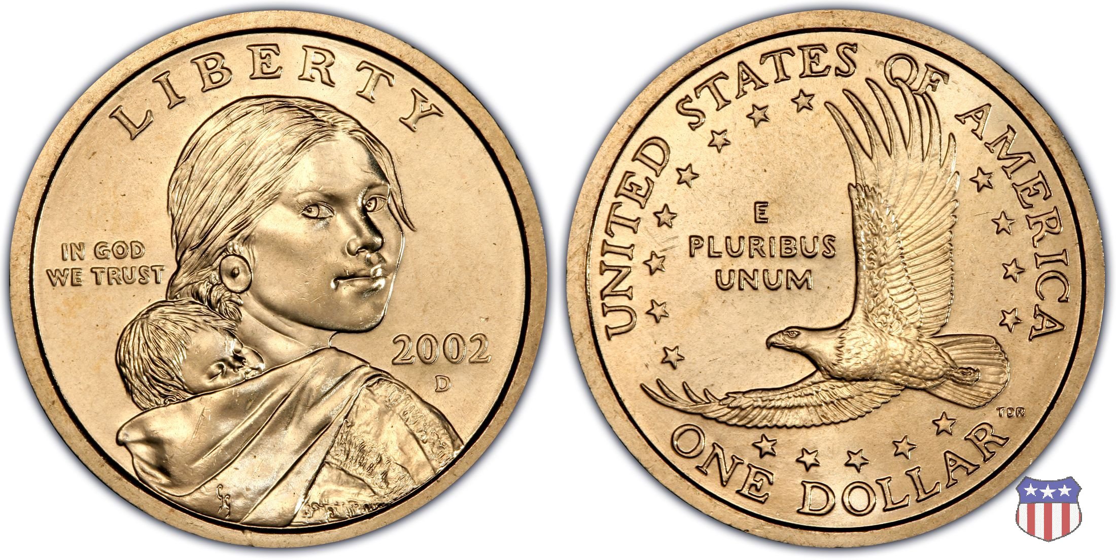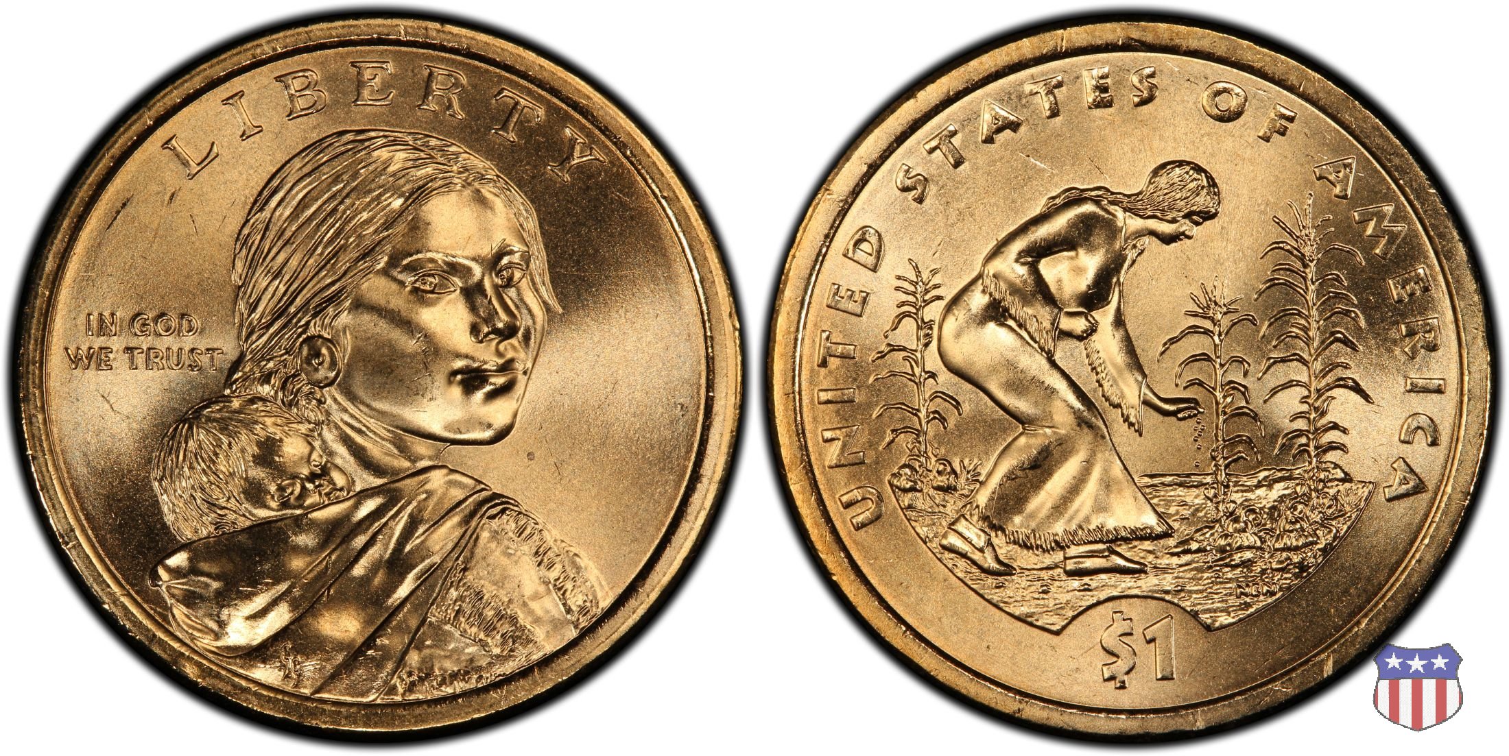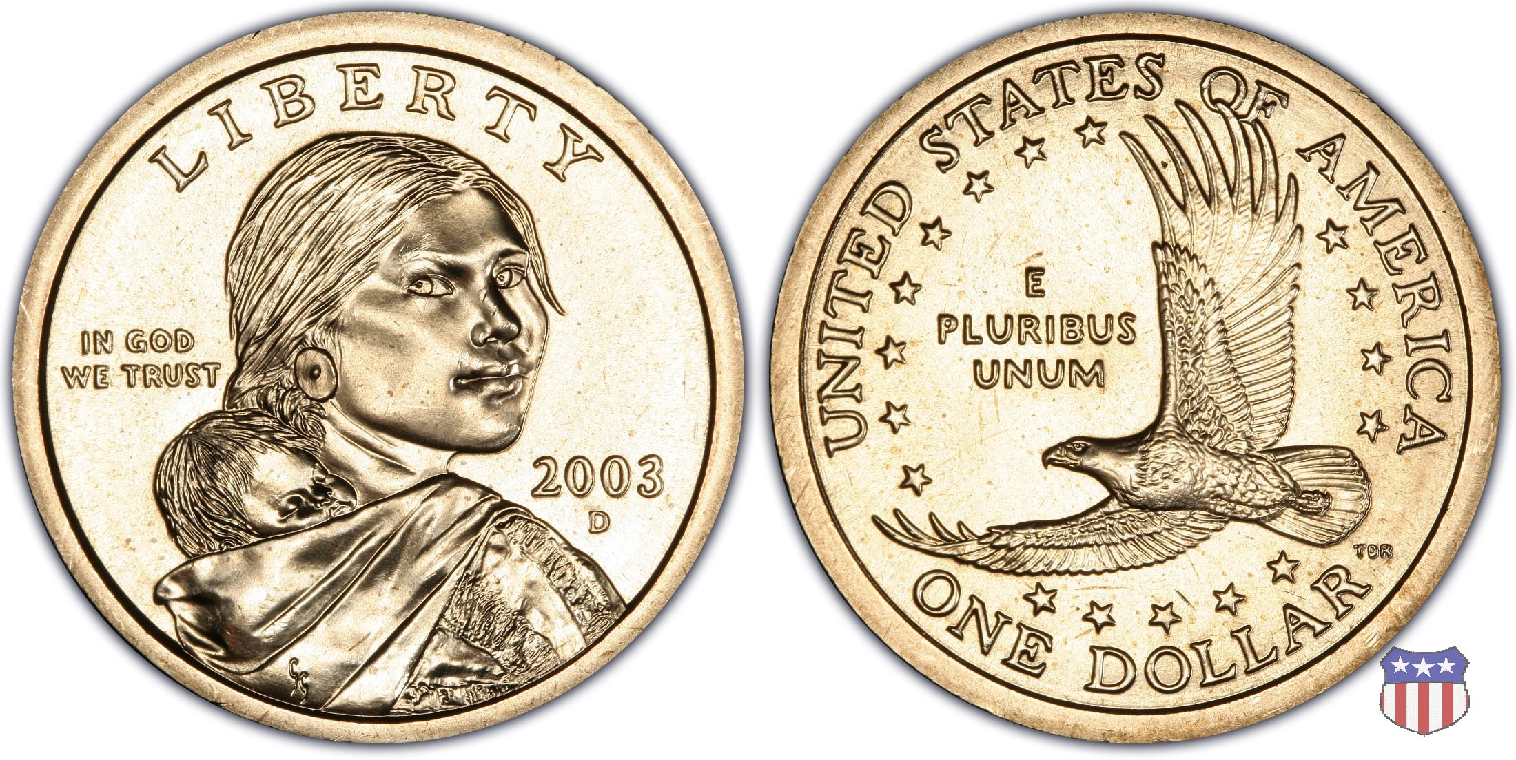 Ritratto idealizzato di Sacagawea, ragazza della tribú Shoshone famosa per aver fatto da guida e interprete alla spedizione di Lewis e Clark, che per primi traversarono l'intero continente nordamericano fino a raggiungere il Pacifico. Sacagawea porta sulla schiena suo figlio, Jean Baptiste. A prestare il suo volto a Sacagawea, di cui non esiste alcun tipo di ritratto, Randy'L He-dow Teton, della tribú Shoshone-Bannock della riserva di Fort Hall, nel sudest dell'Idaho. In alto LIBERTY, a sinistra motto IN GOD WE TRUST, a destra la data, sotto cui compare il marchio di zecca. Dal 2009 data e marchio di zecca vengono spostati sul contorno della moneta. Aquila in volo verso sinistra. Nel giro esterno, in alto UNITED STATES OF AMERICA, in basso il valore ONE DOLLAR, a seguire la R di DOLLAR le iniziali dell'incisore, TDR per Thomas D. Rogers Sr. Nel giro interno 17 stelle, a simboleggiare i 17 Stati che costituivano l'Unione al tempo della spedizione di Lewis e Clark (1804). Al centro, il motto E PLURIBUS UNUM.