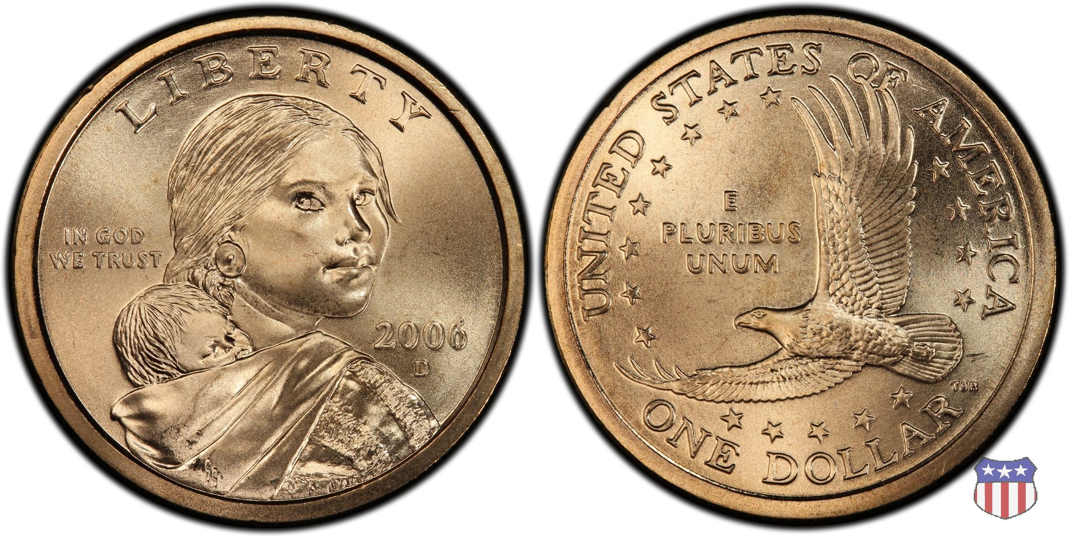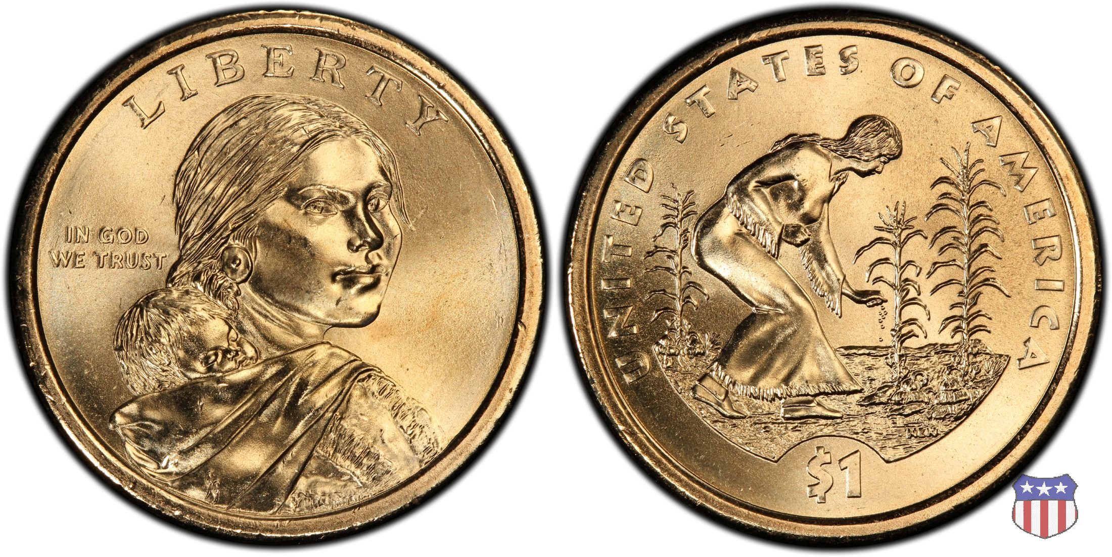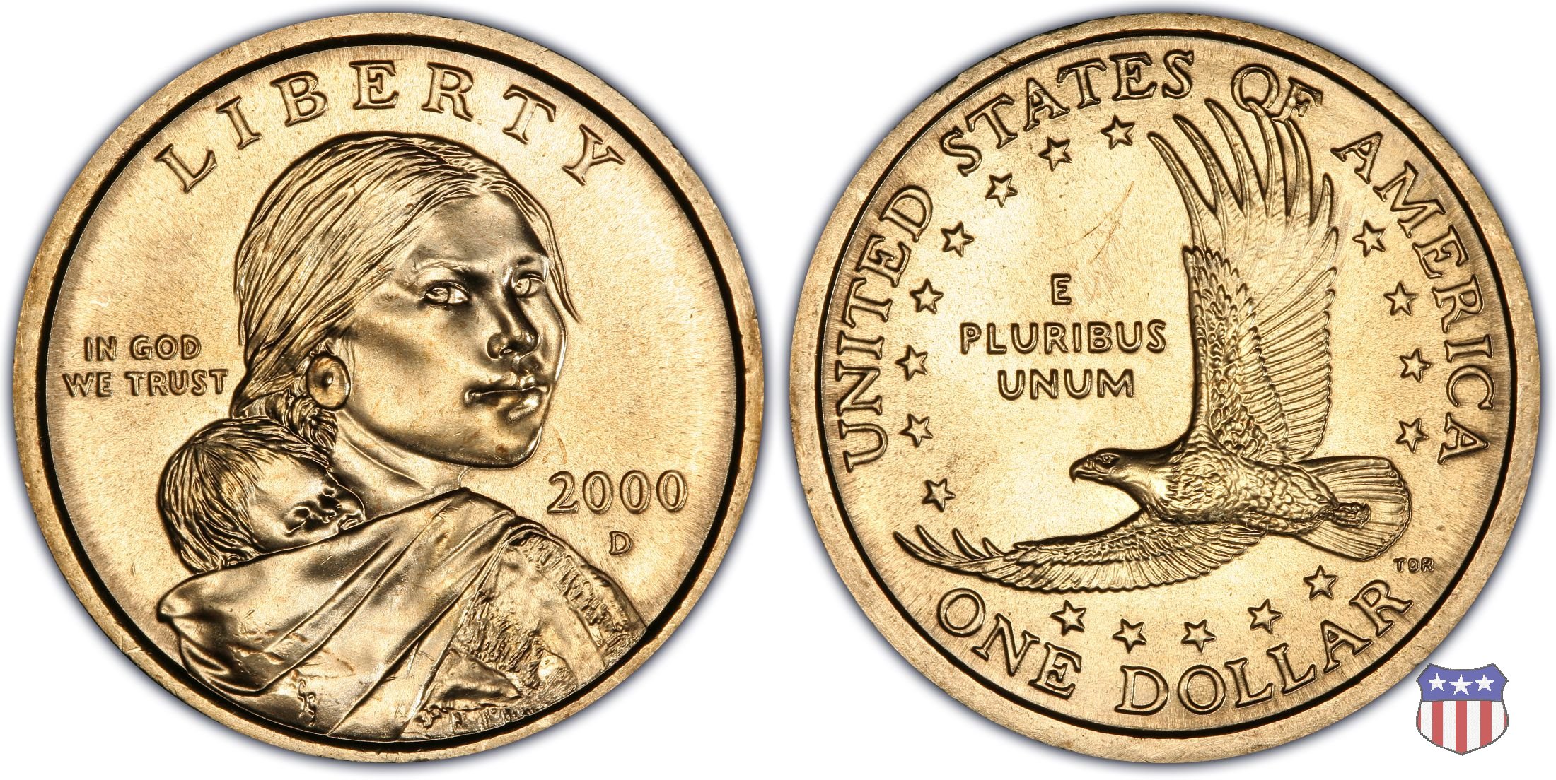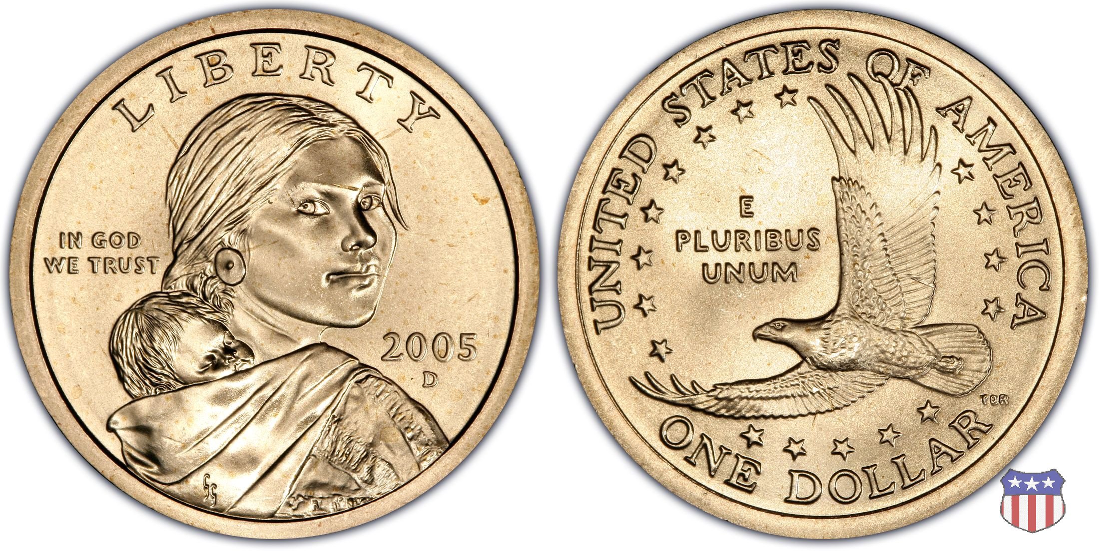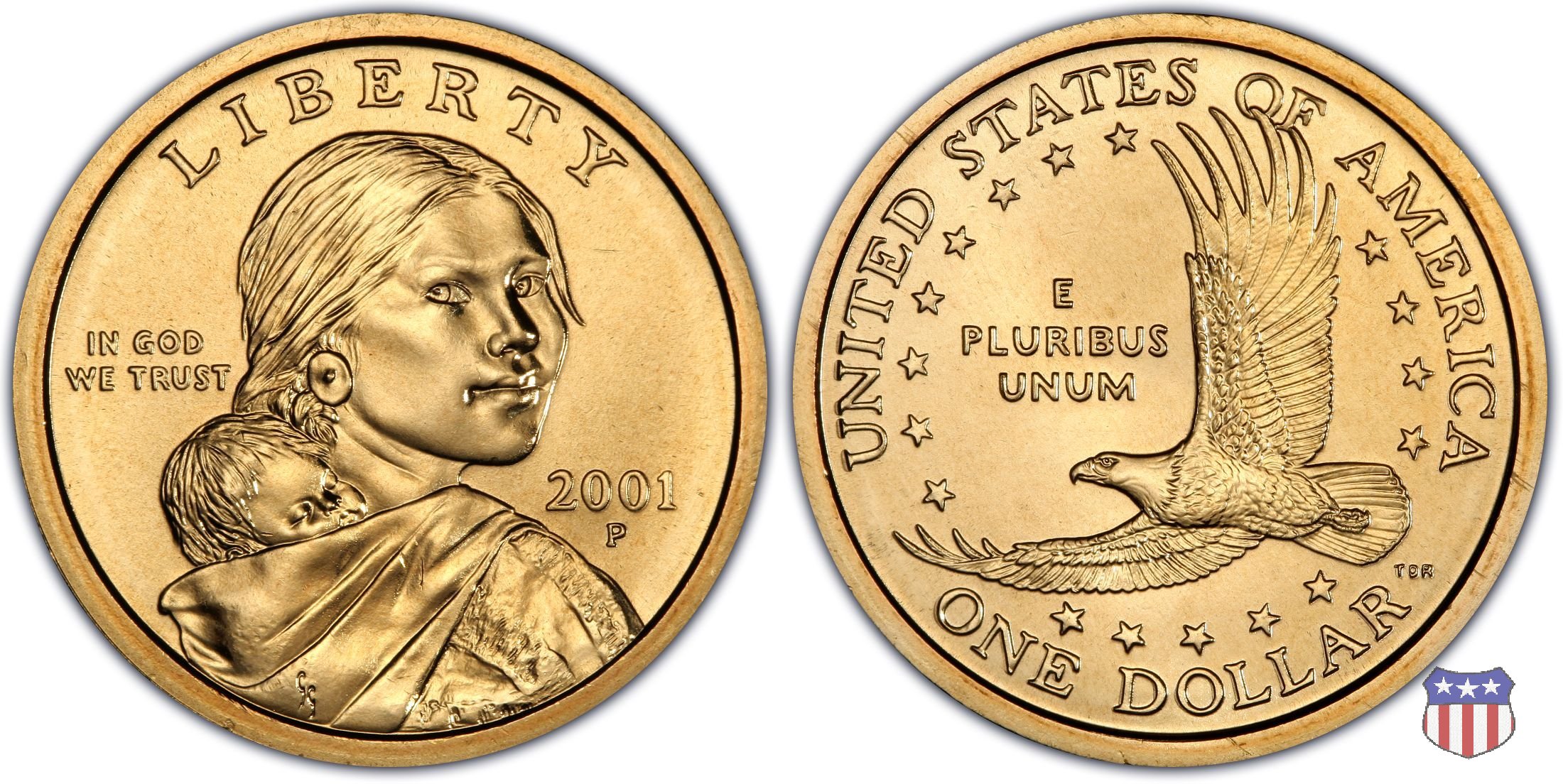 Ritratto idealizzato di Sacagawea, ragazza della tribú Shoshone famosa per aver fatto da guida e interprete alla spedizione di Lewis e Clark, che per primi traversarono l'intero continente nordamericano fino a raggiungere il Pacifico. Sacagawea porta sulla schiena suo figlio, Jean Baptiste. A prestare il suo volto a Sacagawea, di cui non esiste alcun tipo di ritratto, Randy'L He-dow Teton, della tribú Shoshone-Bannock della riserva di Fort Hall, nel sudest dell'Idaho. In alto LIBERTY, a sinistra motto IN GOD WE TRUST, a destra la data, sotto cui compare il marchio di zecca. Dal 2009 data e marchio di zecca vengono spostati sul contorno della moneta. Aquila in volo verso sinistra. Nel giro esterno, in alto UNITED STATES OF AMERICA, in basso il valore ONE DOLLAR, a seguire la R di DOLLAR le iniziali dell'incisore, TDR per Thomas D. Rogers Sr. Nel giro interno 17 stelle, a simboleggiare i 17 Stati che costituivano l'Unione al tempo della spedizione di Lewis e Clark (1804). Al centro, il motto E PLURIBUS UNUM.