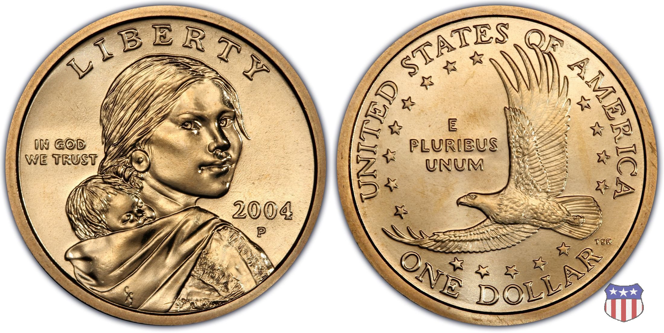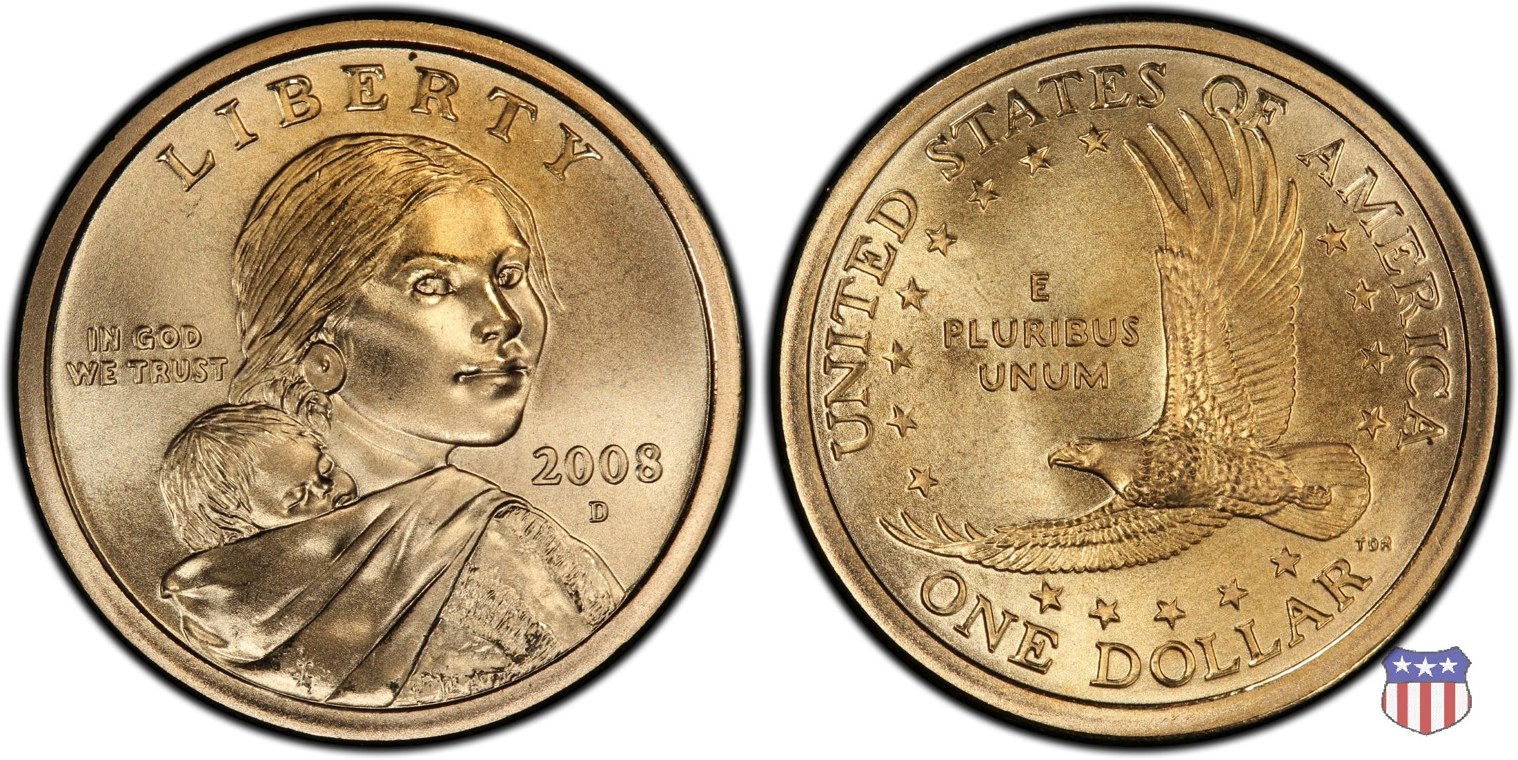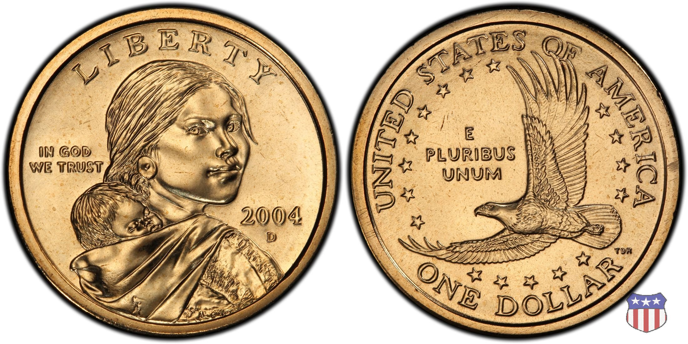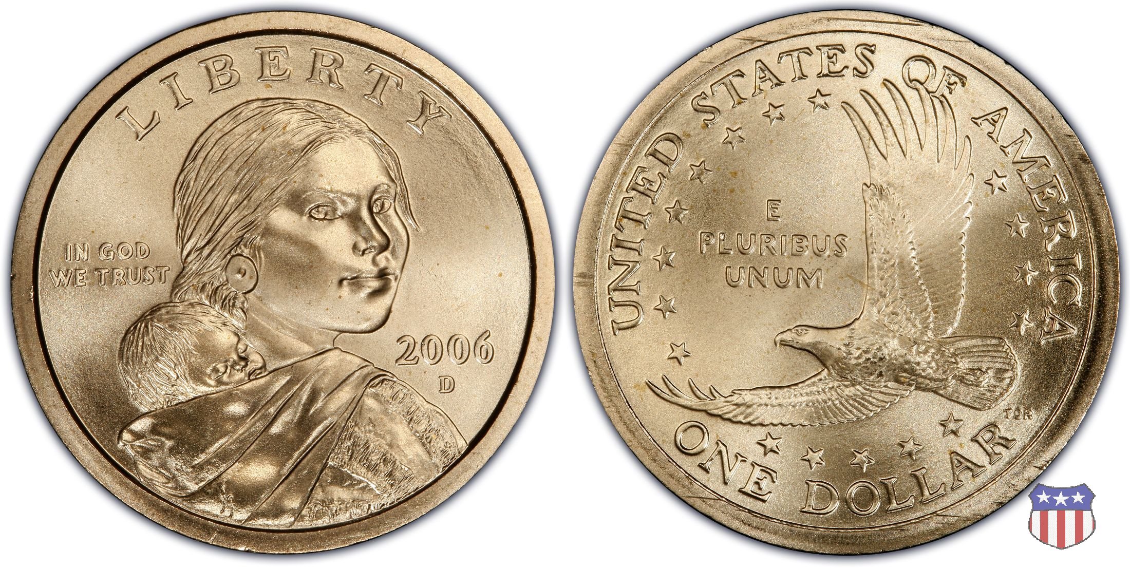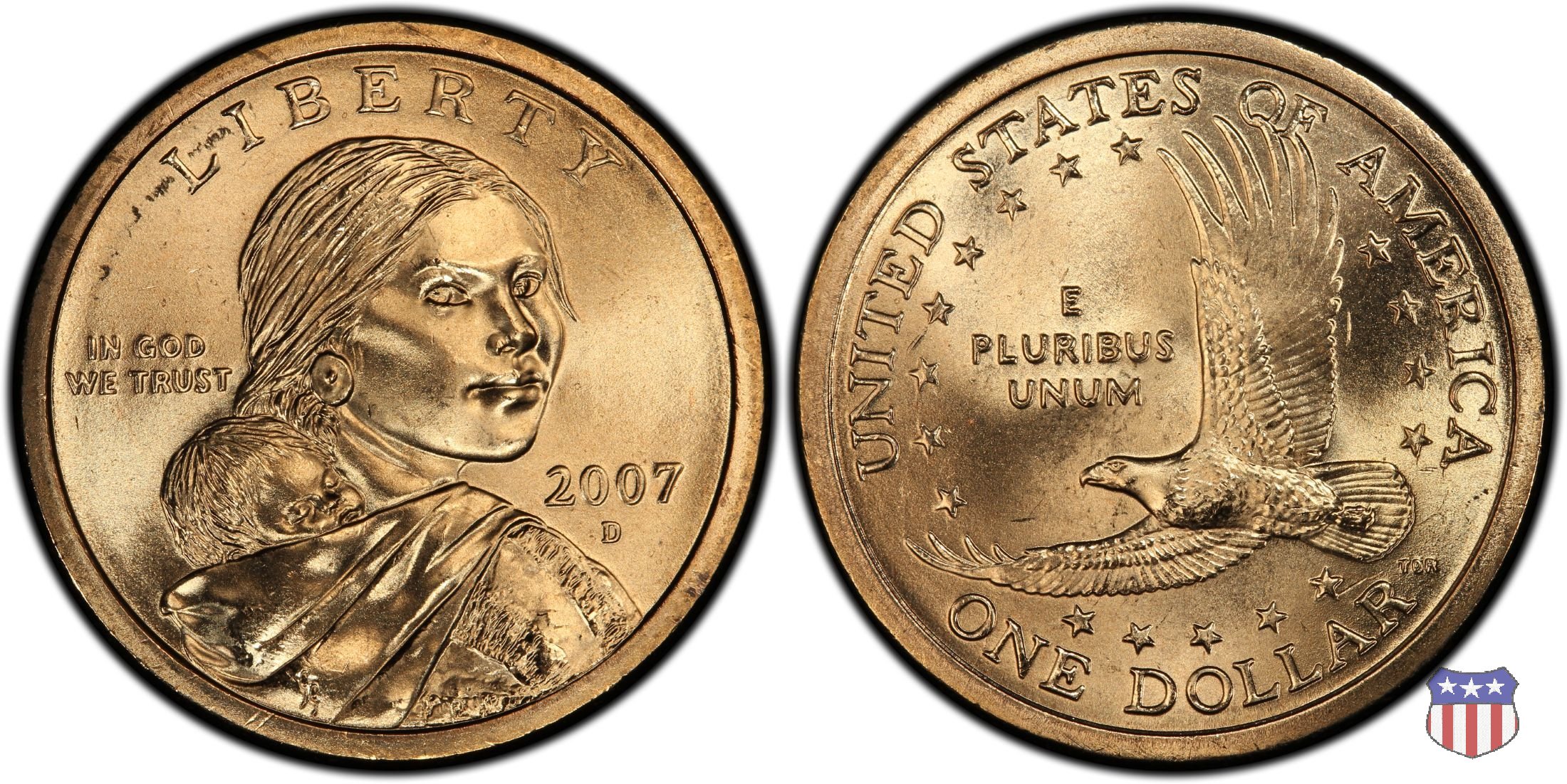 Ritratto idealizzato di Sacagawea, ragazza della tribú Shoshone famosa per aver fatto da guida e interprete alla spedizione di Lewis e Clark, che per primi traversarono l'intero continente nordamericano fino a raggiungere il Pacifico. Sacagawea porta sulla schiena suo figlio, Jean Baptiste. A prestare il suo volto a Sacagawea, di cui non esiste alcun tipo di ritratto, Randy'L He-dow Teton, della tribú Shoshone-Bannock della riserva di Fort Hall, nel sudest dell'Idaho. In alto LIBERTY, a sinistra motto IN GOD WE TRUST, a destra la data, sotto cui compare il marchio di zecca. Dal 2009 data e marchio di zecca vengono spostati sul contorno della moneta. Aquila in volo verso sinistra. Nel giro esterno, in alto UNITED STATES OF AMERICA, in basso il valore ONE DOLLAR, a seguire la R di DOLLAR le iniziali dell'incisore, TDR per Thomas D. Rogers Sr. Nel giro interno 17 stelle, a simboleggiare i 17 Stati che costituivano l'Unione al tempo della spedizione di Lewis e Clark (1804). Al centro, il motto E PLURIBUS UNUM.