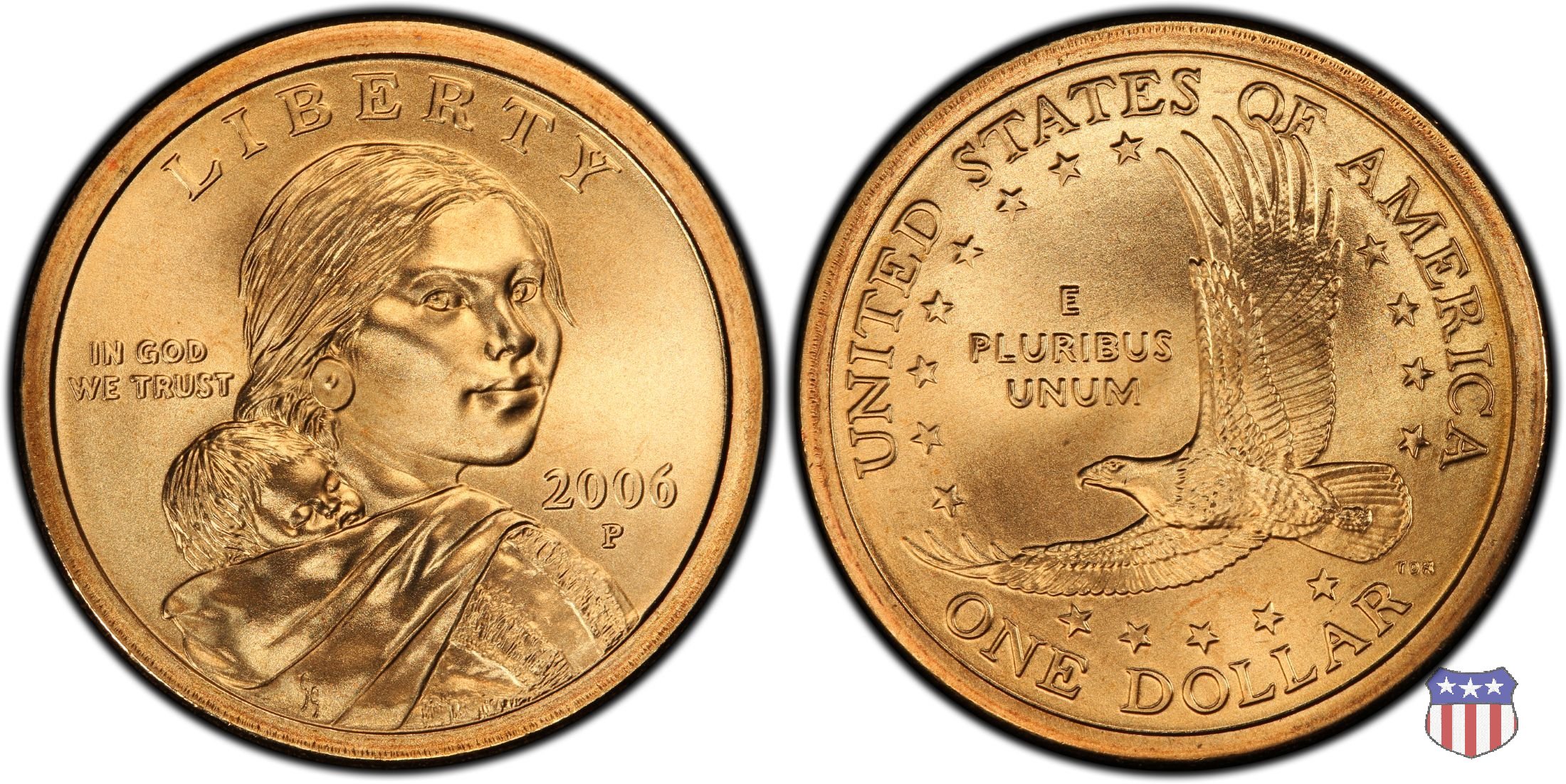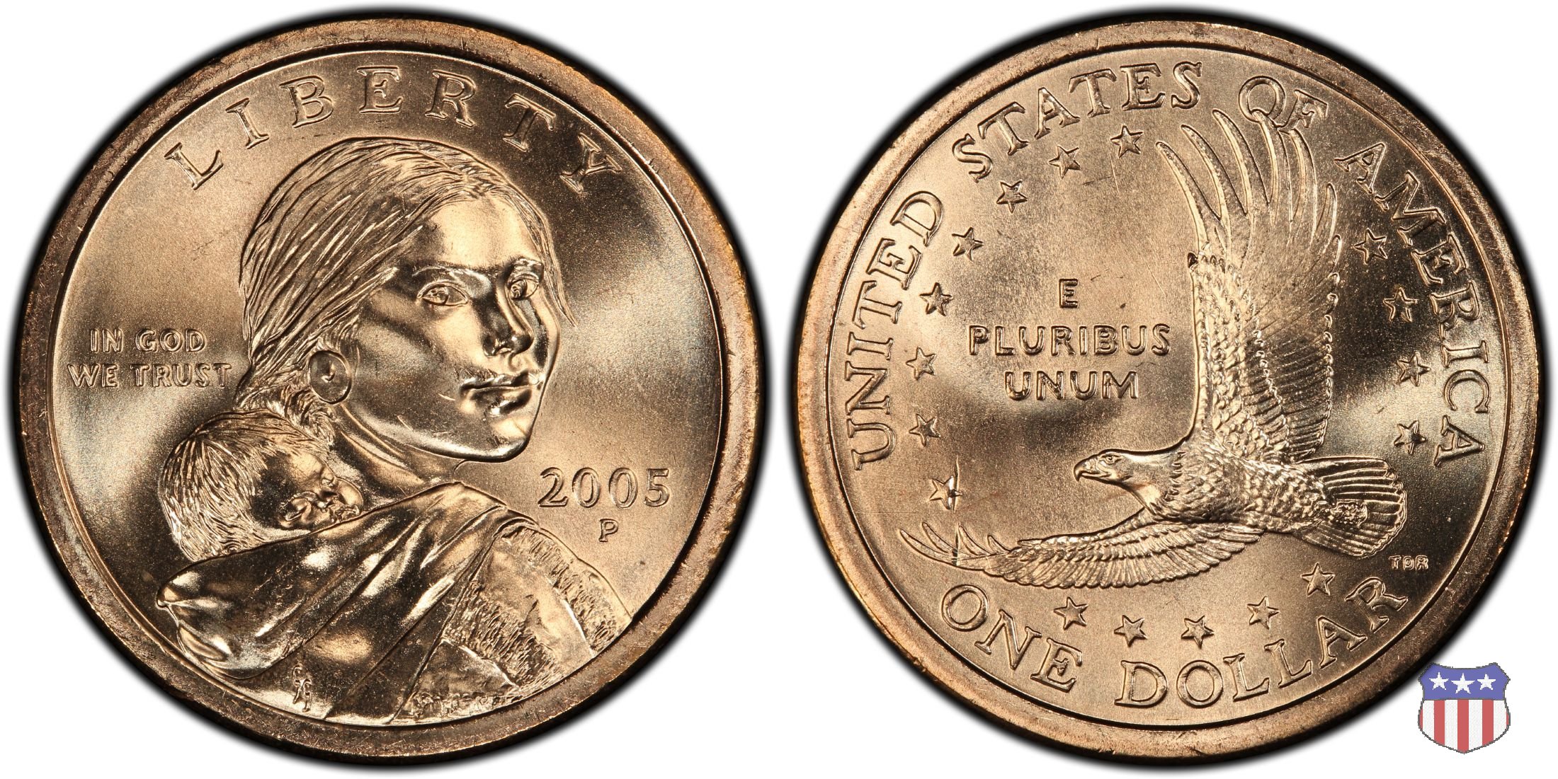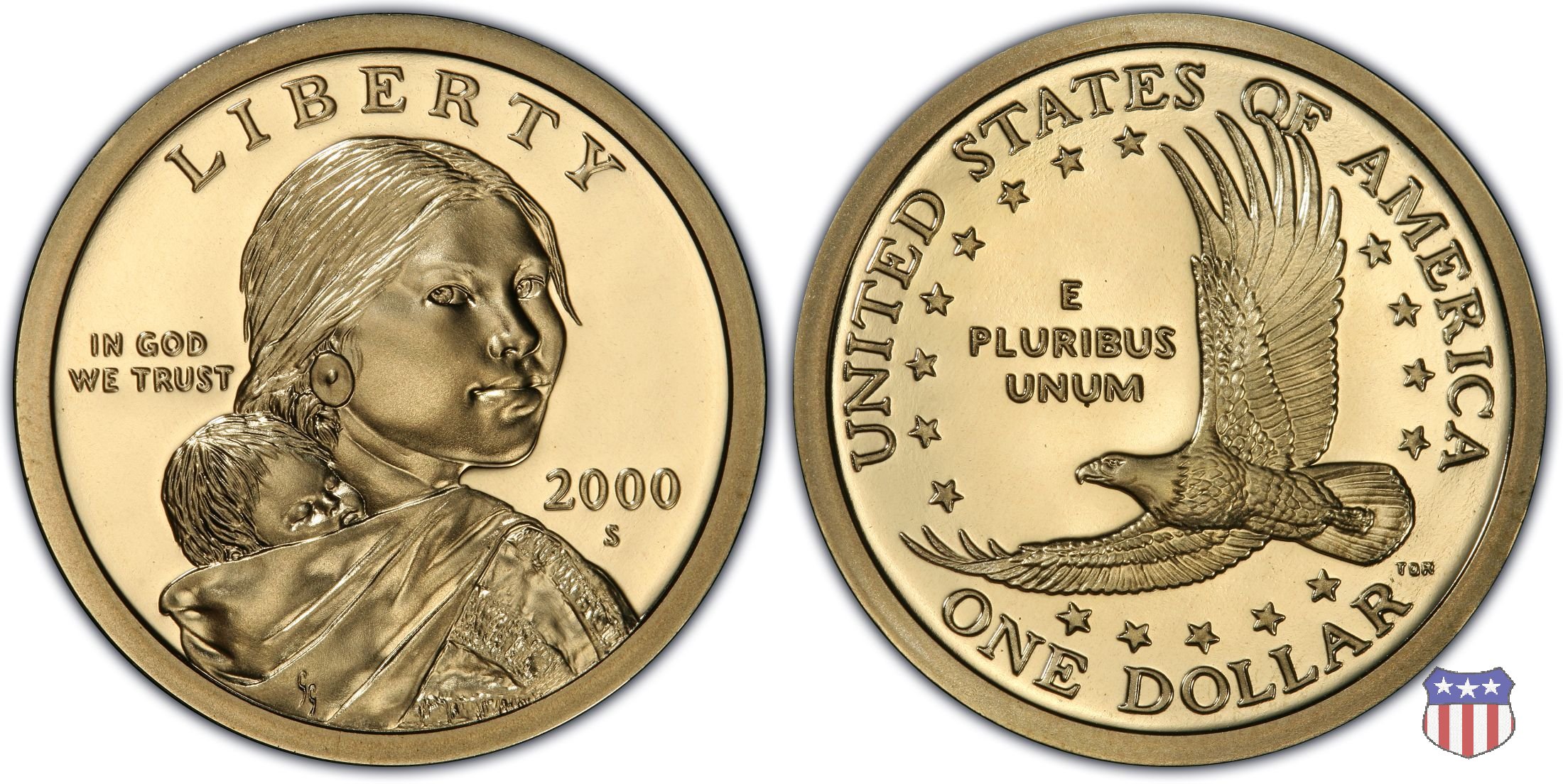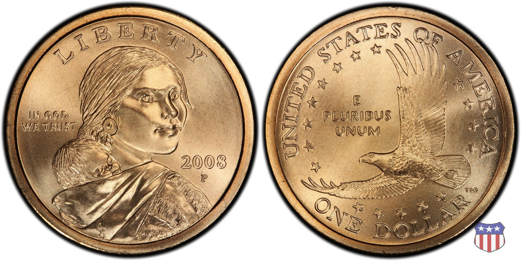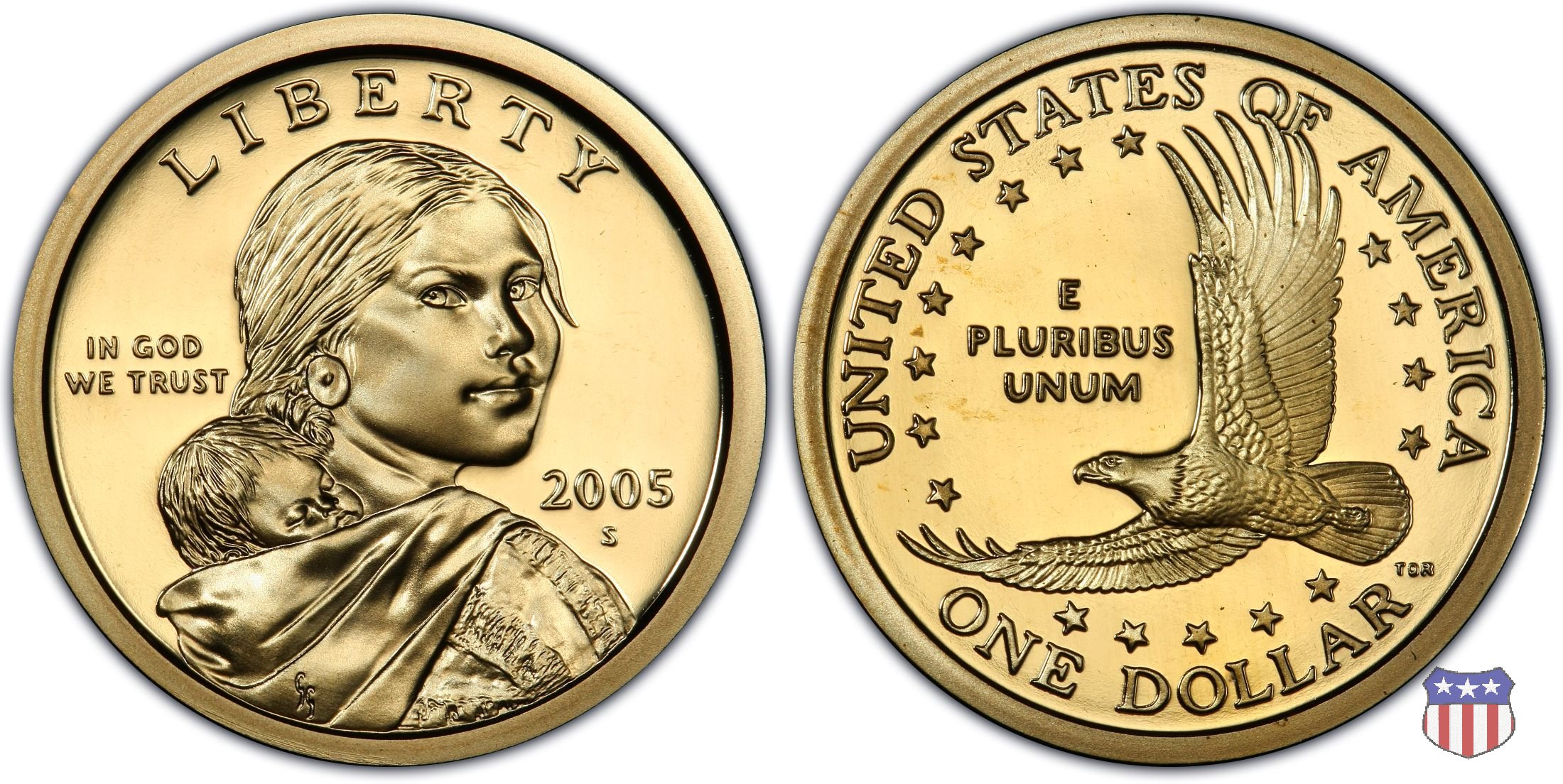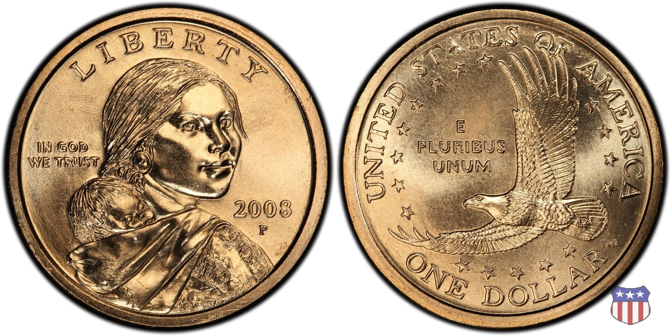 Ritratto idealizzato di Sacagawea, ragazza della tribú Shoshone famosa per aver fatto da guida e interprete alla spedizione di Lewis e Clark, che per primi traversarono l'intero continente nordamericano fino a raggiungere il Pacifico. Sacagawea porta sulla schiena suo figlio, Jean Baptiste. A prestare il suo volto a Sacagawea, di cui non esiste alcun tipo di ritratto, Randy'L He-dow Teton, della tribú Shoshone-Bannock della riserva di Fort Hall, nel sudest dell'Idaho. In alto LIBERTY, a sinistra motto IN GOD WE TRUST, a destra la data, sotto cui compare il marchio di zecca. Dal 2009 data e marchio di zecca vengono spostati sul contorno della moneta. Aquila in volo verso sinistra. Nel giro esterno, in alto UNITED STATES OF AMERICA, in basso il valore ONE DOLLAR, a seguire la R di DOLLAR le iniziali dell'incisore, TDR per Thomas D. Rogers Sr. Nel giro interno 17 stelle, a simboleggiare i 17 Stati che costituivano l'Unione al tempo della spedizione di Lewis e Clark (1804). Al centro, il motto E PLURIBUS UNUM.