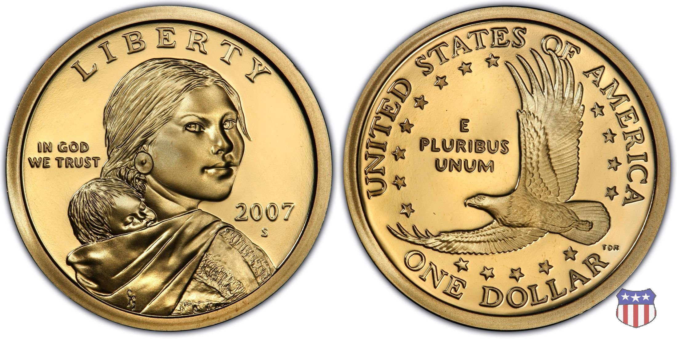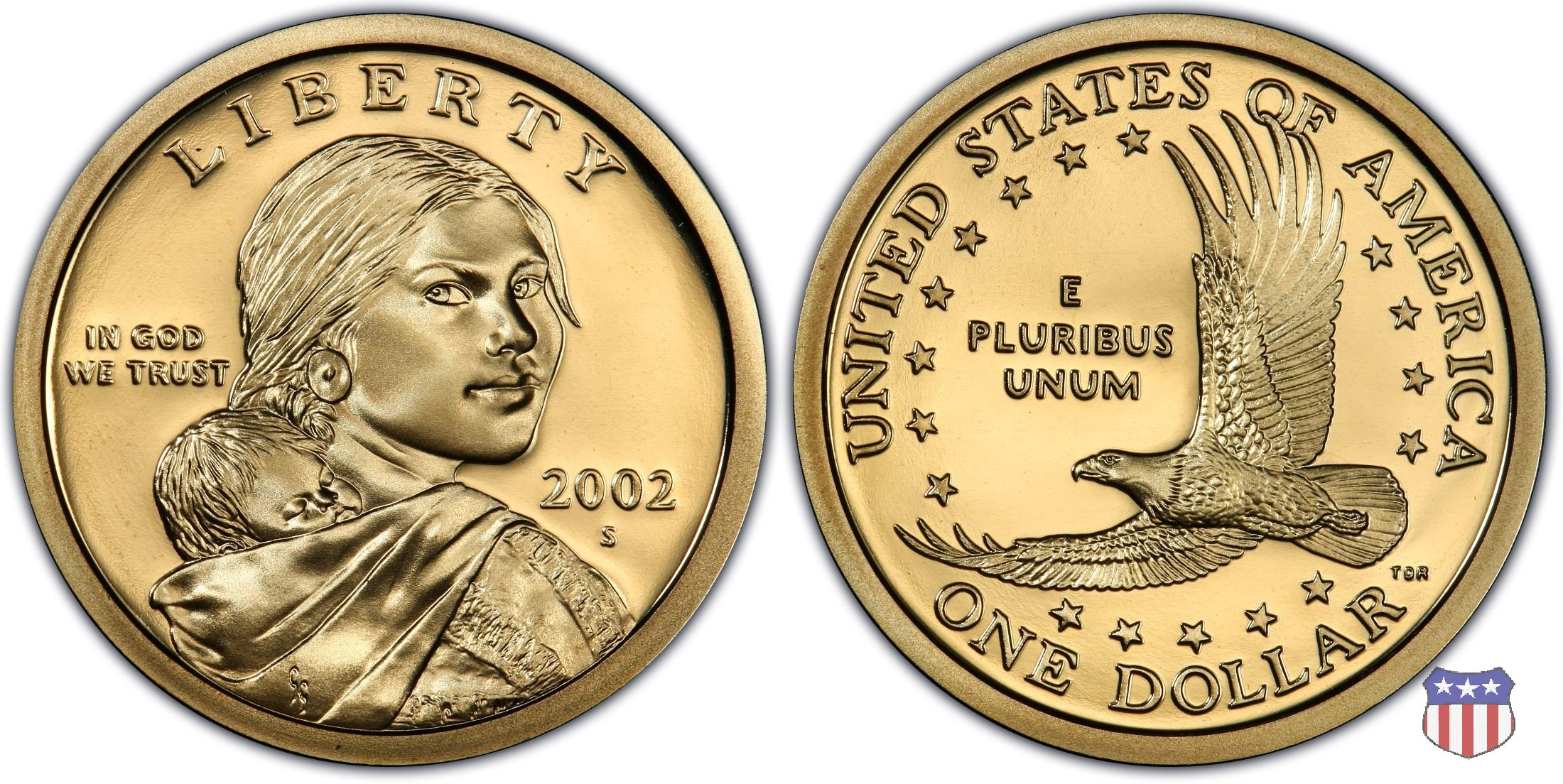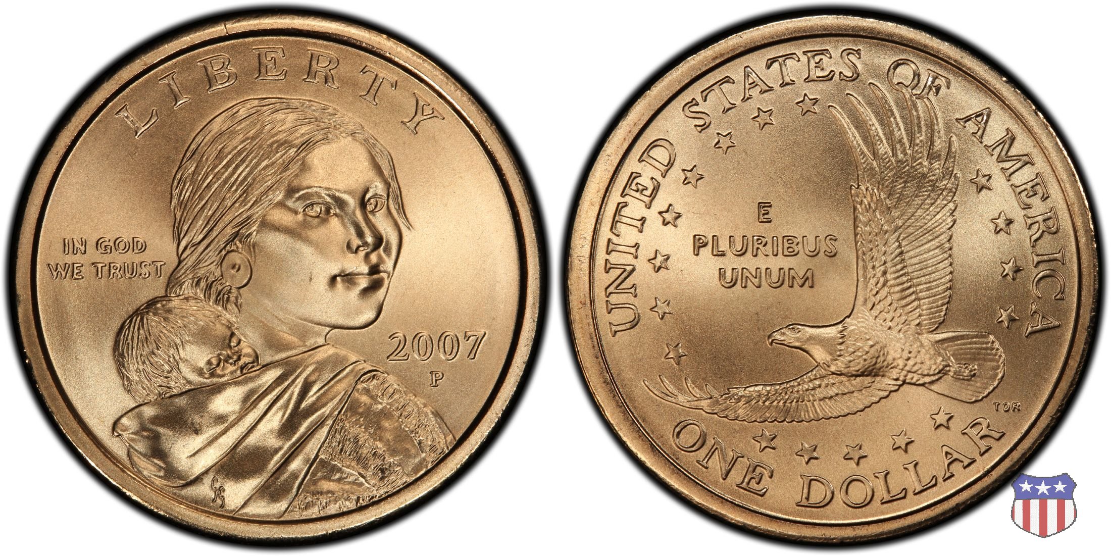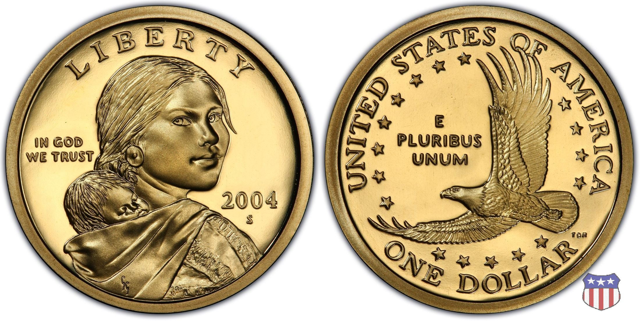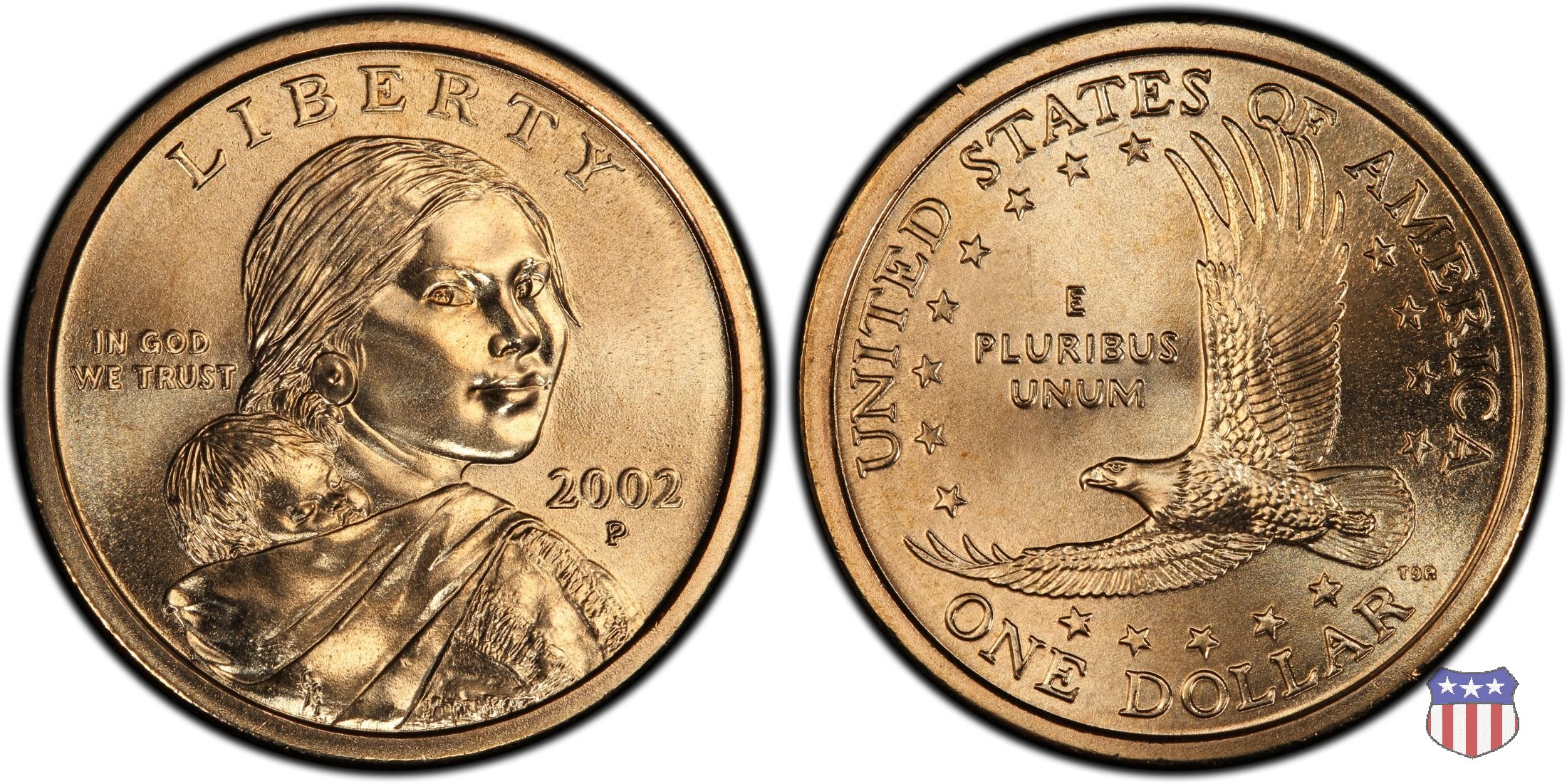 Ritratto idealizzato di Sacagawea, ragazza della tribú Shoshone famosa per aver fatto da guida e interprete alla spedizione di Lewis e Clark, che per primi traversarono l'intero continente nordamericano fino a raggiungere il Pacifico. Sacagawea porta sulla schiena suo figlio, Jean Baptiste. A prestare il suo volto a Sacagawea, di cui non esiste alcun tipo di ritratto, Randy'L He-dow Teton, della tribú Shoshone-Bannock della riserva di Fort Hall, nel sudest dell'Idaho. In alto LIBERTY, a sinistra motto IN GOD WE TRUST, a destra la data, sotto cui compare il marchio di zecca. Dal 2009 data e marchio di zecca vengono spostati sul contorno della moneta. Aquila in volo verso sinistra. Nel giro esterno, in alto UNITED STATES OF AMERICA, in basso il valore ONE DOLLAR, a seguire la R di DOLLAR le iniziali dell'incisore, TDR per Thomas D. Rogers Sr. Nel giro interno 17 stelle, a simboleggiare i 17 Stati che costituivano l'Unione al tempo della spedizione di Lewis e Clark (1804). Al centro, il motto E PLURIBUS UNUM.