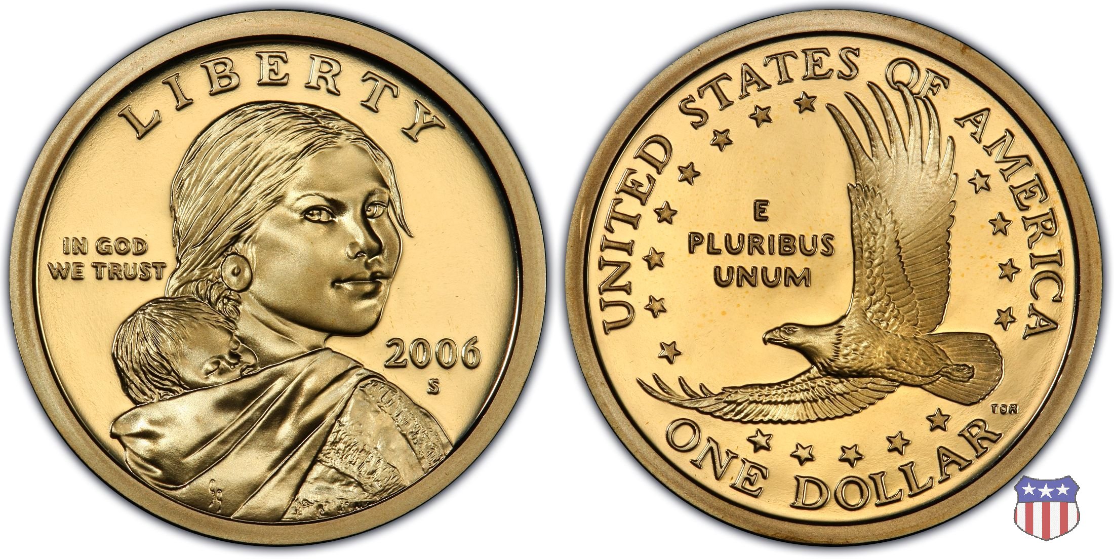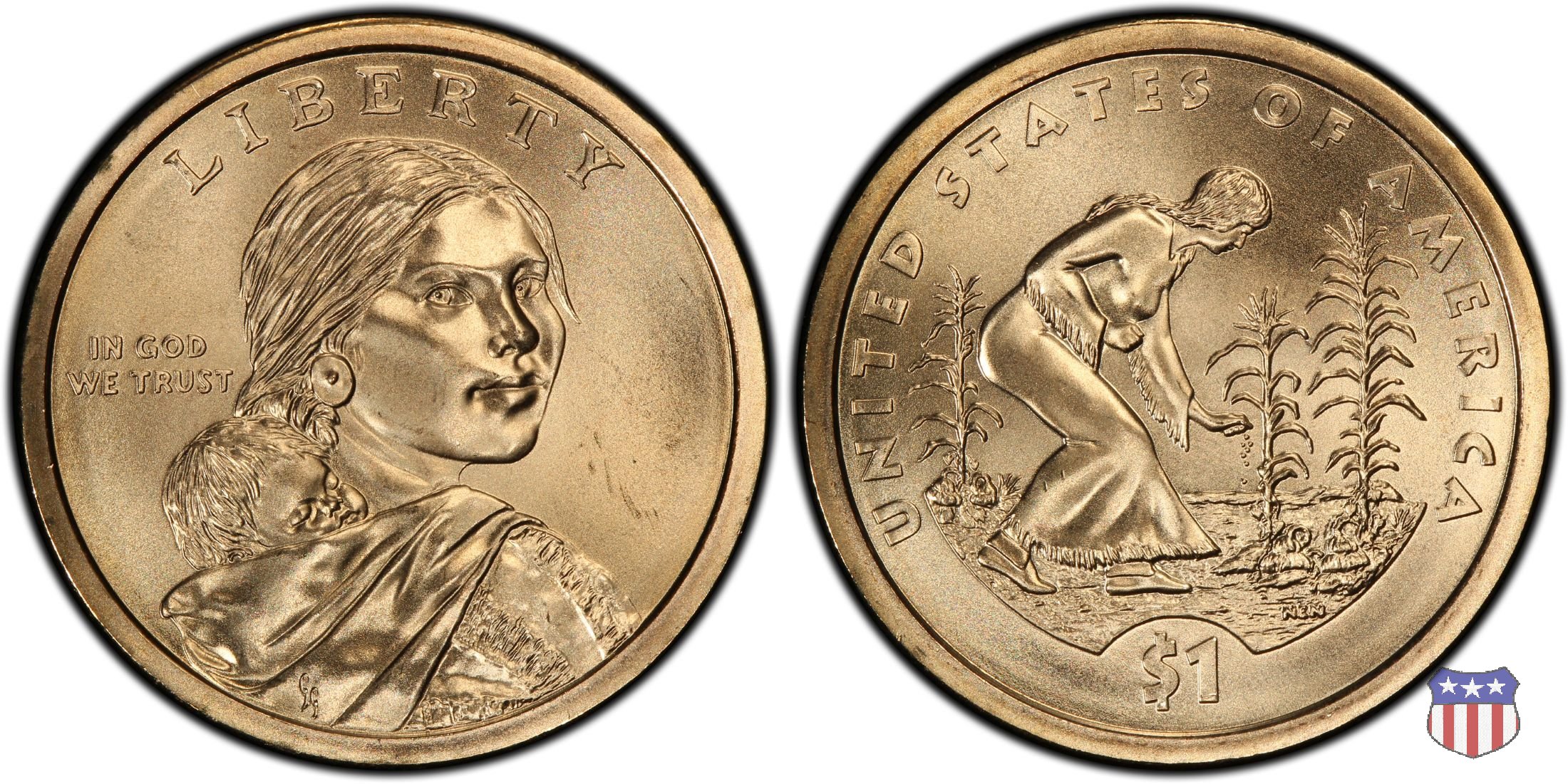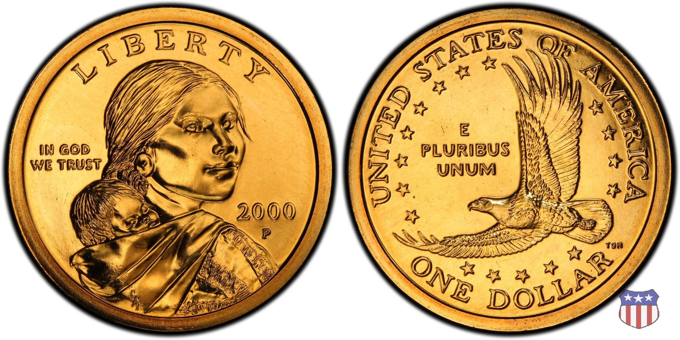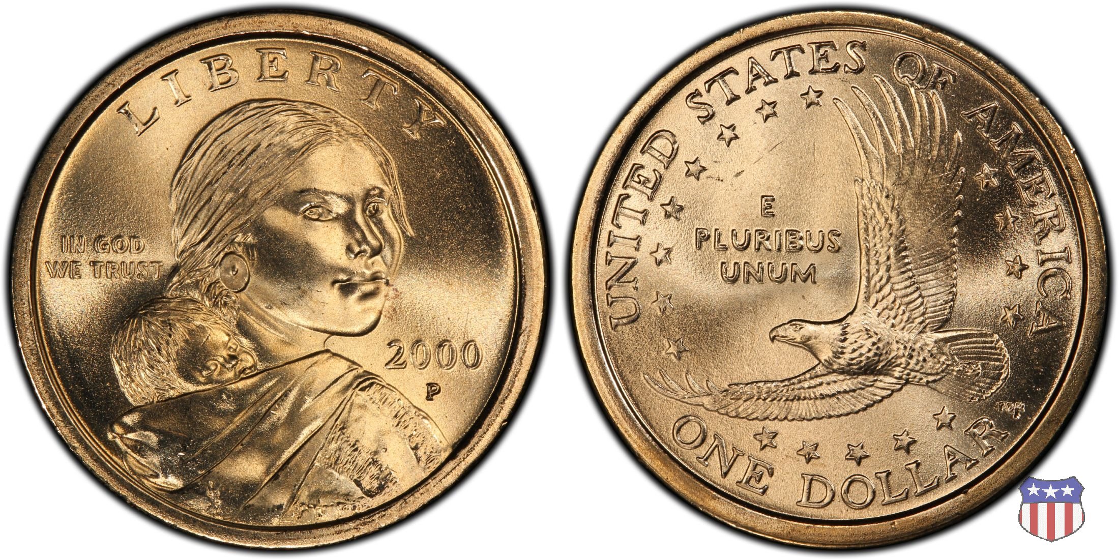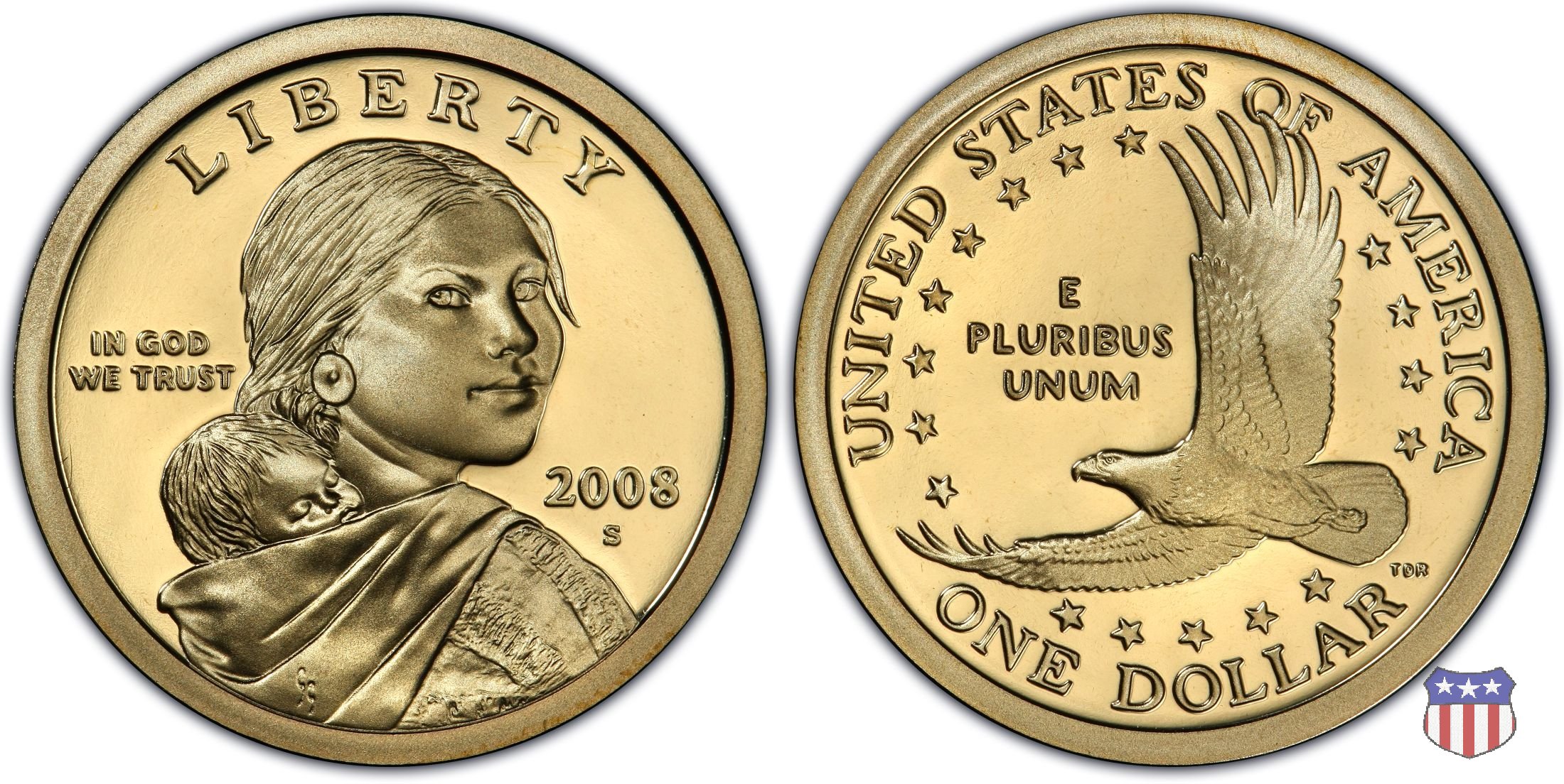 Ritratto idealizzato di Sacagawea, ragazza della tribú Shoshone famosa per aver fatto da guida e interprete alla spedizione di Lewis e Clark, che per primi traversarono l'intero continente nordamericano fino a raggiungere il Pacifico. Sacagawea porta sulla schiena suo figlio, Jean Baptiste. A prestare il suo volto a Sacagawea, di cui non esiste alcun tipo di ritratto, Randy'L He-dow Teton, della tribú Shoshone-Bannock della riserva di Fort Hall, nel sudest dell'Idaho. In alto LIBERTY, a sinistra motto IN GOD WE TRUST, a destra la data, sotto cui compare il marchio di zecca. Dal 2009 data e marchio di zecca vengono spostati sul contorno della moneta. Aquila in volo verso sinistra. Nel giro esterno, in alto UNITED STATES OF AMERICA, in basso il valore ONE DOLLAR, a seguire la R di DOLLAR le iniziali dell'incisore, TDR per Thomas D. Rogers Sr. Nel giro interno 17 stelle, a simboleggiare i 17 Stati che costituivano l'Unione al tempo della spedizione di Lewis e Clark (1804). Al centro, il motto E PLURIBUS UNUM.