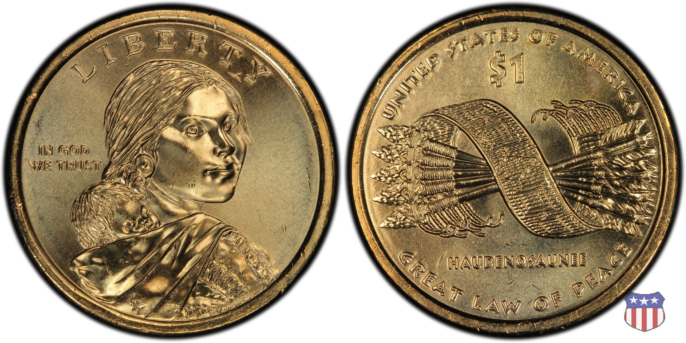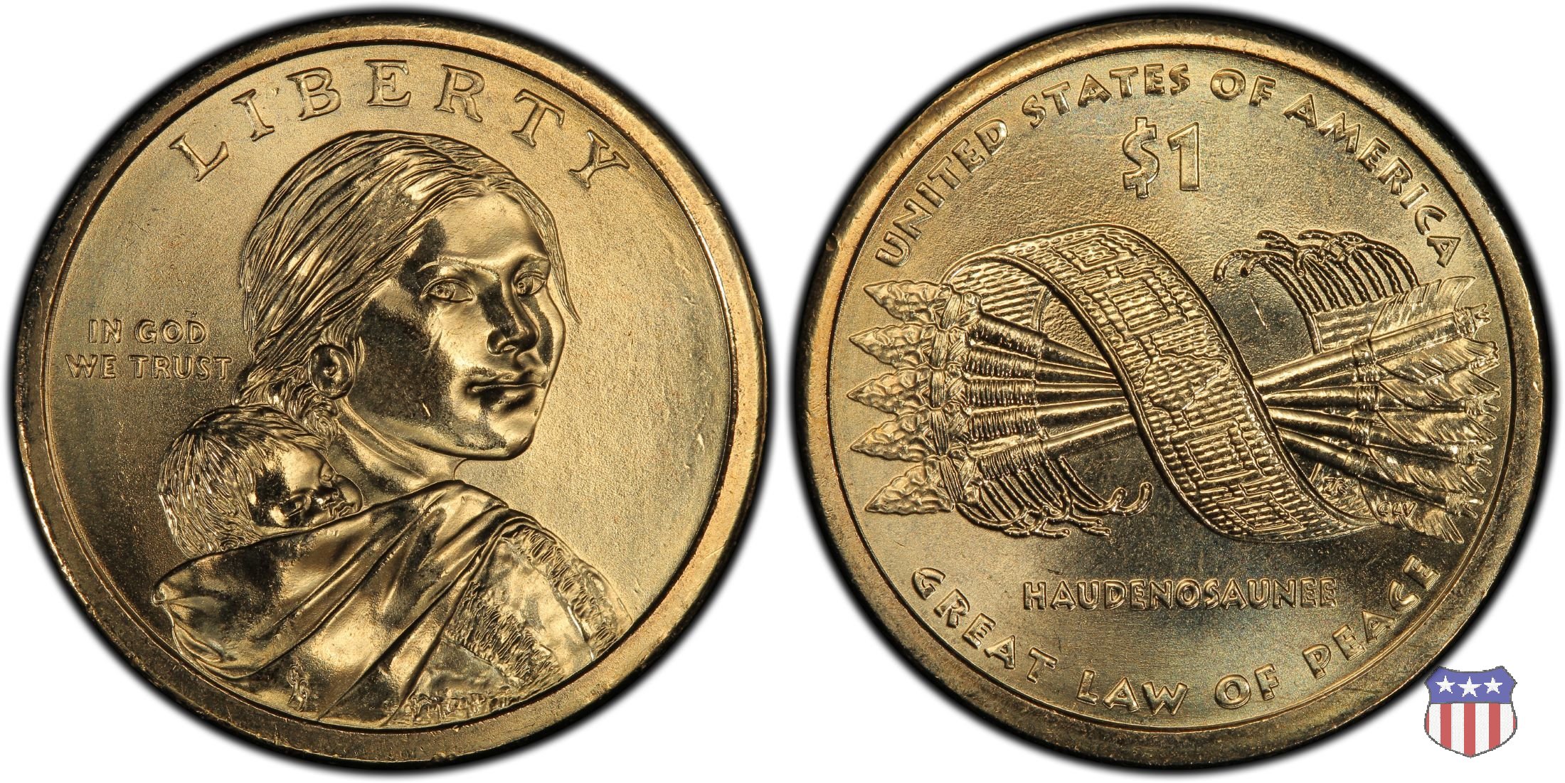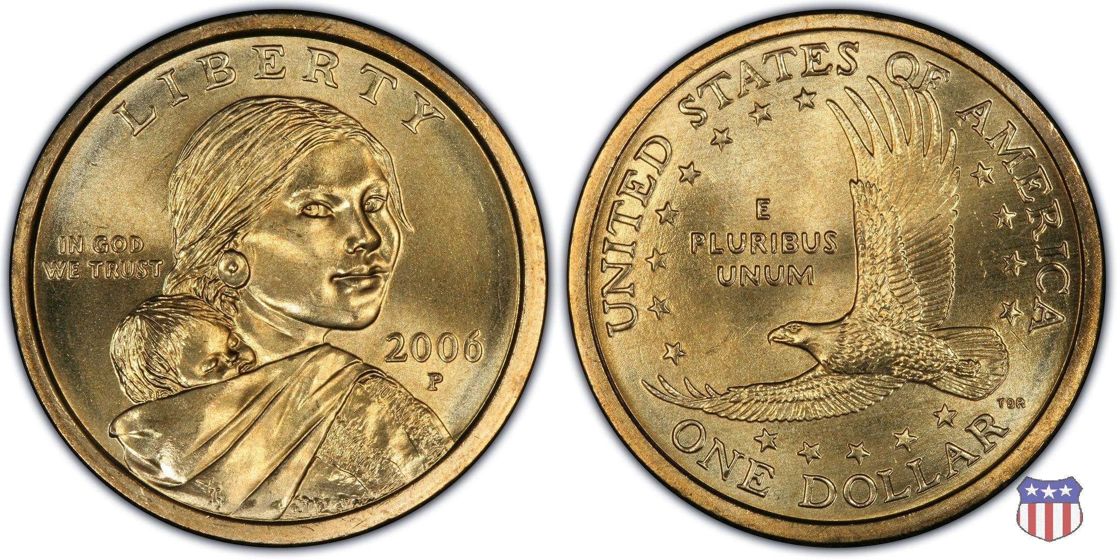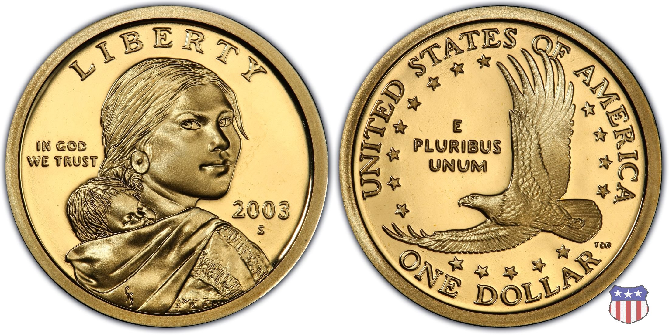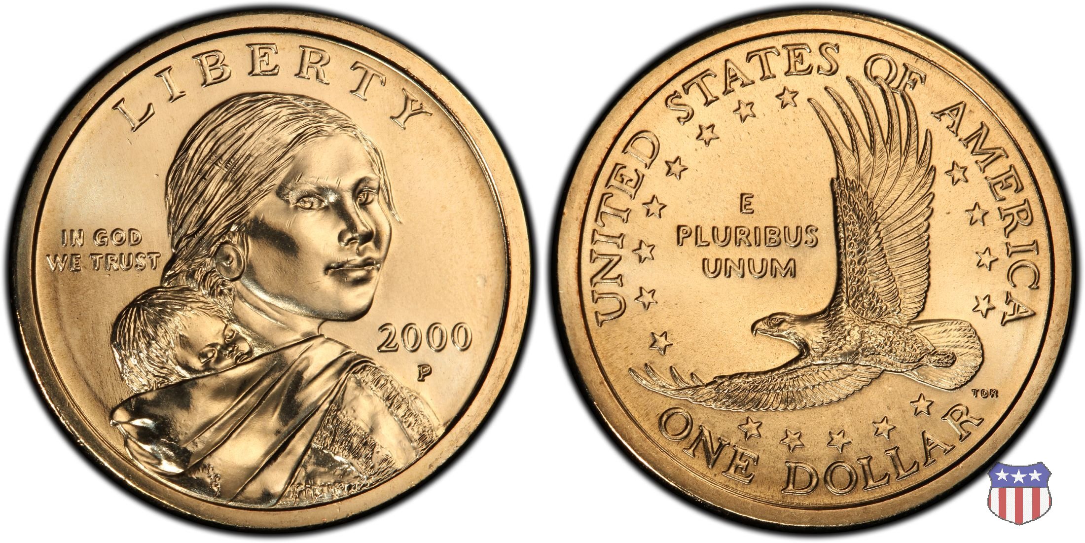 Ritratto idealizzato di Sacagawea, ragazza della tribú Shoshone famosa per aver fatto da guida e interprete alla spedizione di Lewis e Clark, che per primi traversarono l'intero continente nordamericano fino a raggiungere il Pacifico. Sacagawea porta sulla schiena suo figlio, Jean Baptiste. A prestare il suo volto a Sacagawea, di cui non esiste alcun tipo di ritratto, Randy'L He-dow Teton, della tribú Shoshone-Bannock della riserva di Fort Hall, nel sudest dell'Idaho. In alto LIBERTY, a sinistra motto IN GOD WE TRUST, a destra la data, sotto cui compare il marchio di zecca. Dal 2009 data e marchio di zecca vengono spostati sul contorno della moneta. Aquila in volo verso sinistra. Nel giro esterno, in alto UNITED STATES OF AMERICA, in basso il valore ONE DOLLAR, a seguire la R di DOLLAR le iniziali dell'incisore, TDR per Thomas D. Rogers Sr. Nel giro interno 17 stelle, a simboleggiare i 17 Stati che costituivano l'Unione al tempo della spedizione di Lewis e Clark (1804). Al centro, il motto E PLURIBUS UNUM.