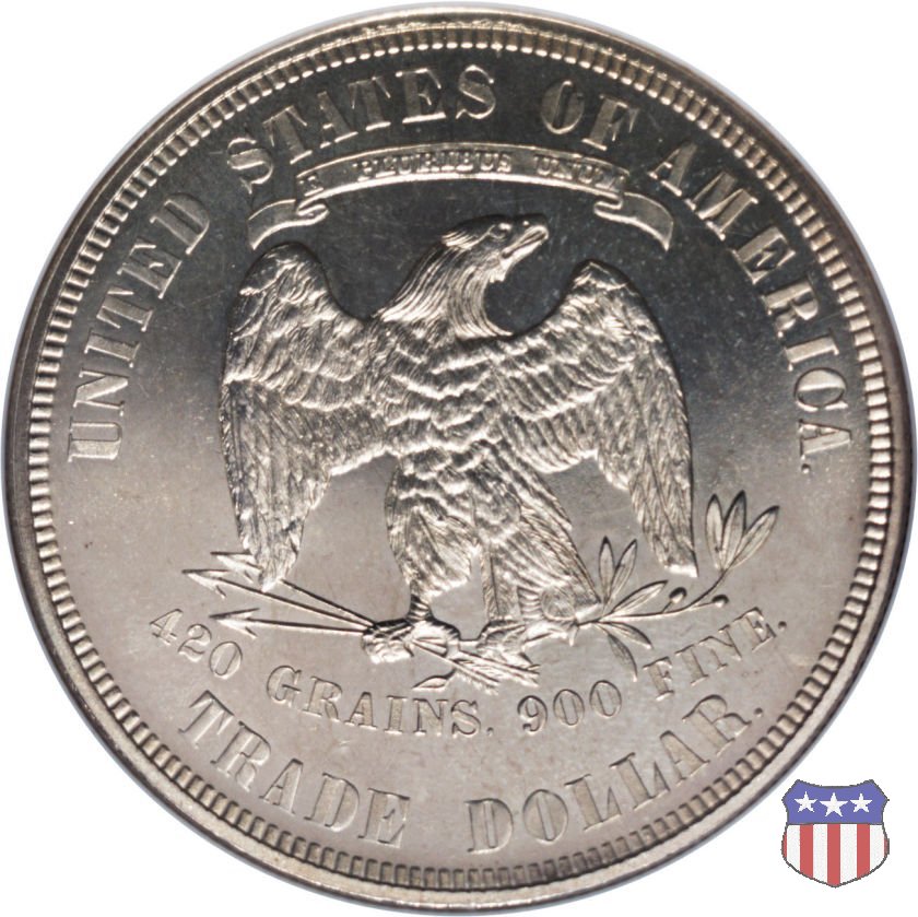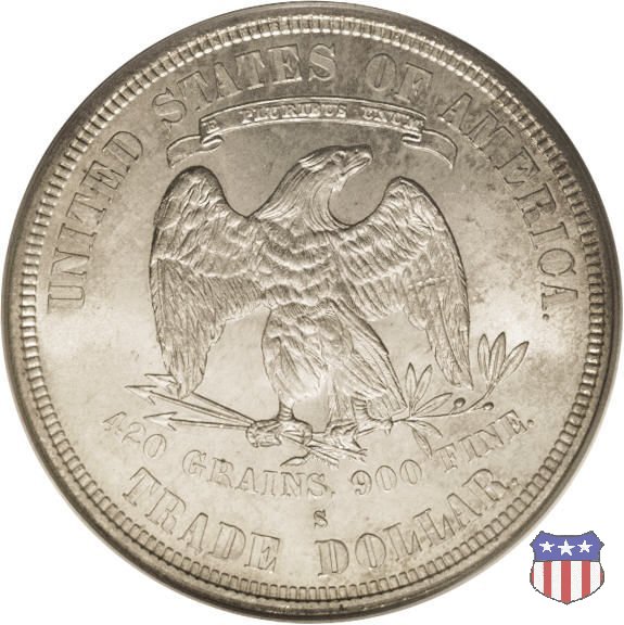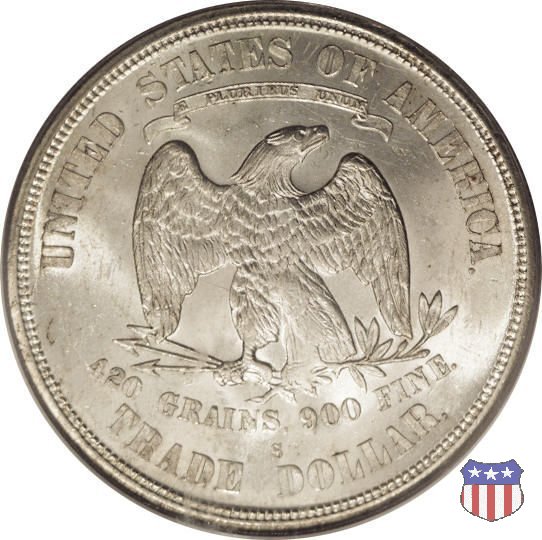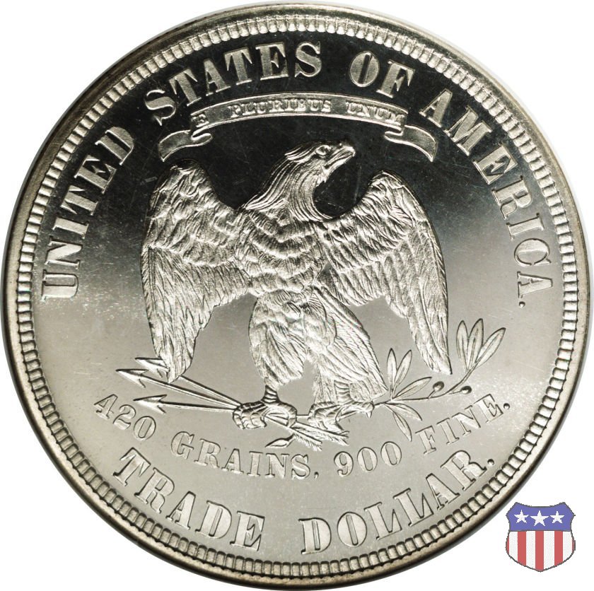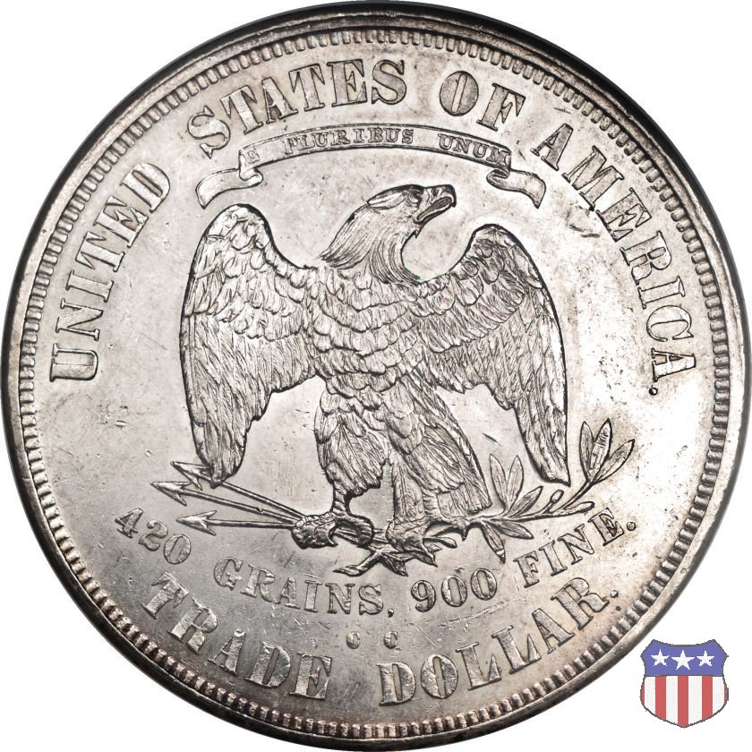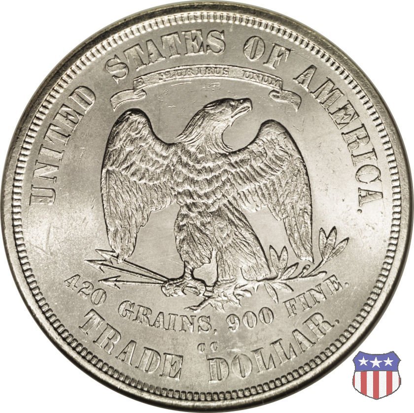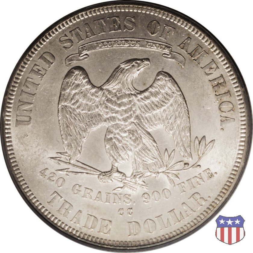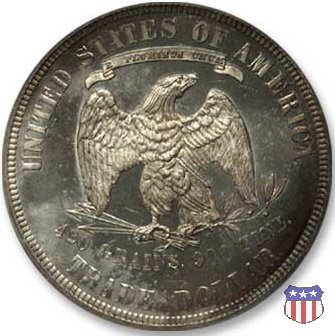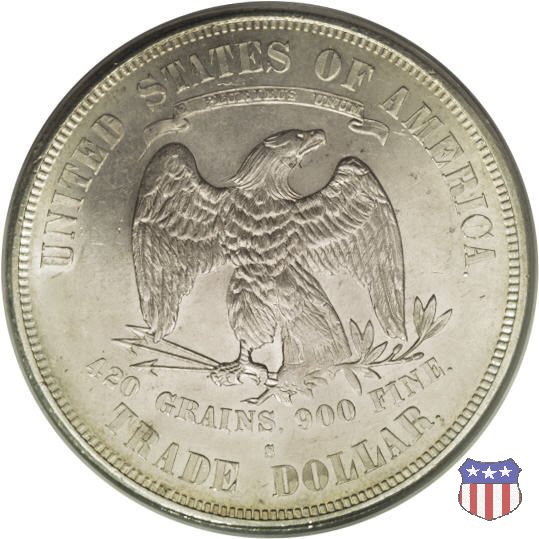 Figura femminile simboleggiante Lady Liberty, che indossa un lungo vestito drappeggiato e guarda a sinistra, seduta su una balla di cotone e altri prodotti americani, che stanno a indicare il carattere commerciale della moneta. Le balle di mercanzia poggiano a loro volta su un tappeto erboso, che ha come sfondo le onde del mare. Con la mano destra, stesa in avanti, la figura femminile regge un ramo d'ulivo, con la sinistra stringe un cartiglio con la parola LIBERTY. Al disotto delle balle di mercanzia, e appena sopra la data, il motto IN GOD WE TRUST. Nel cerchio, a circondare Lady Liberty, 13 stelle. Aquila di fronte ad ali spiegate, che stringe un ramo d'ulivo nel suo artiglio sinistro e un mazzo di frecce nel destro. Al disopra dell'aquila, le parole UNITED STATES OF AMERICA e un cartiglio col motto E PLURIBUS UNUM. Al disotto dell'aquila, il peso e la finezza della moneta (420 GRAINS. 900 FINE) e la denominazione TRADE DOLLAR. Sopra la D di DOLLAR eventuale marchio di zecca.