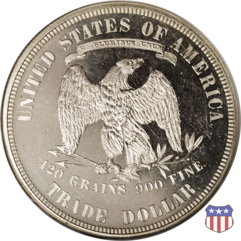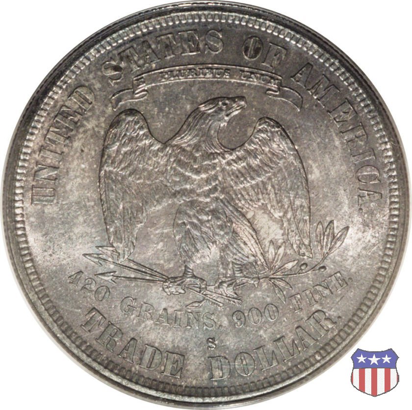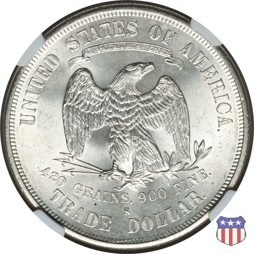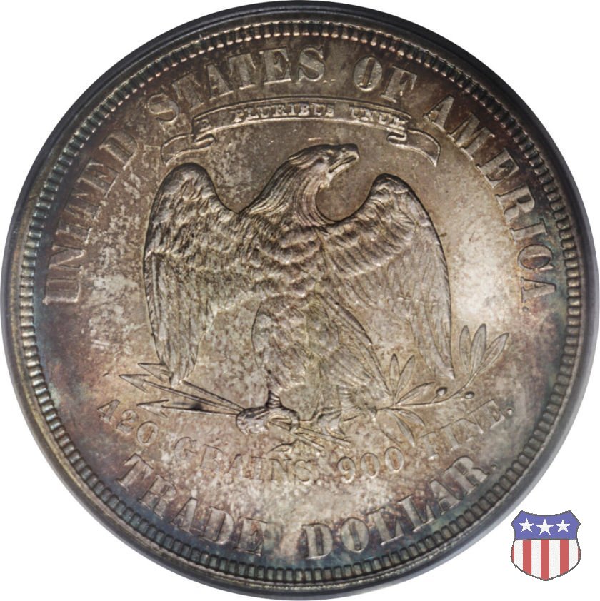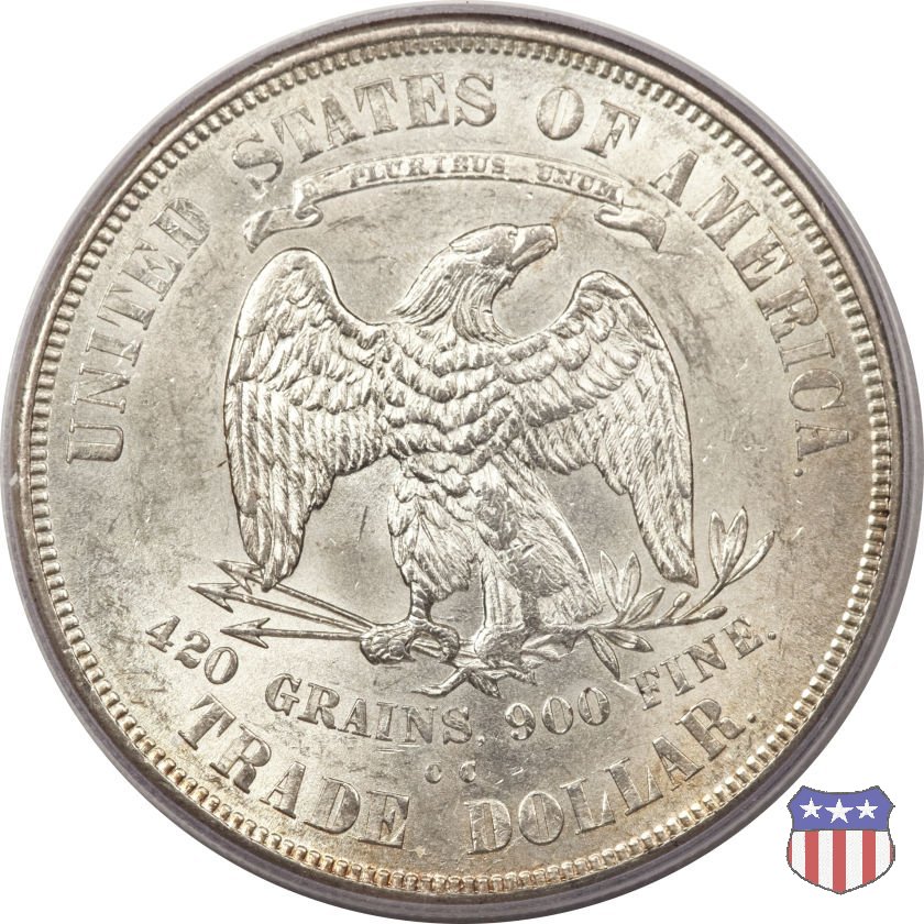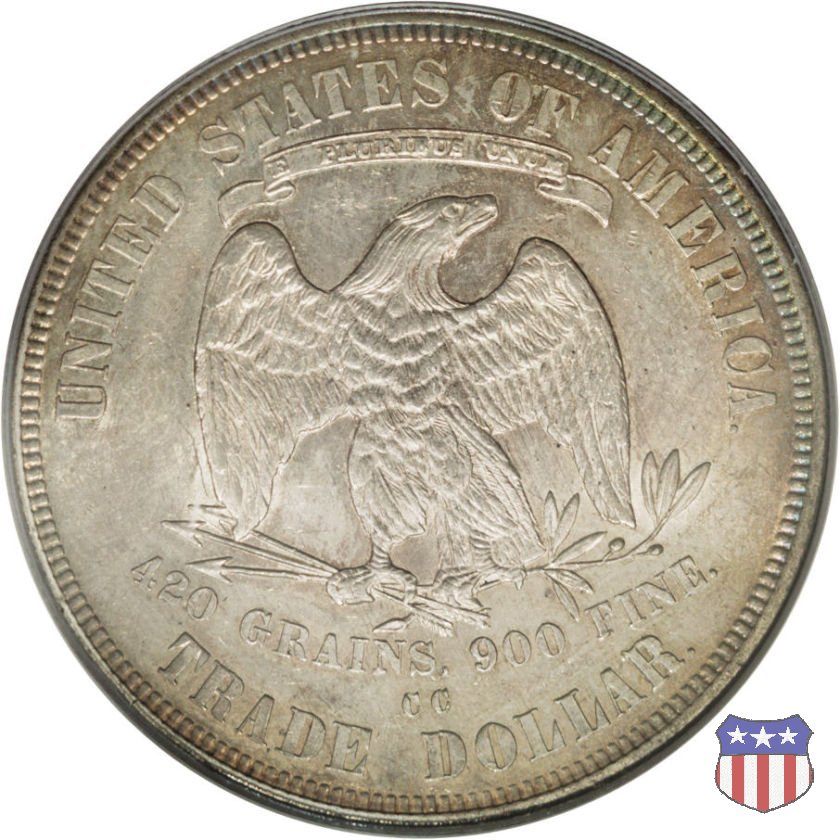 Figura femminile simboleggiante Lady Liberty, che indossa un lungo vestito drappeggiato e guarda a sinistra, seduta su una balla di cotone e altri prodotti americani, che stanno a indicare il carattere commerciale della moneta. Le balle di mercanzia poggiano a loro volta su un tappeto erboso, che ha come sfondo le onde del mare. Con la mano destra, stesa in avanti, la figura femminile regge un ramo d'ulivo, con la sinistra stringe un cartiglio con la parola LIBERTY. Al disotto delle balle di mercanzia, e appena sopra la data, il motto IN GOD WE TRUST. Nel cerchio, a circondare Lady Liberty, 13 stelle. Aquila di fronte ad ali spiegate, che stringe un ramo d'ulivo nel suo artiglio sinistro e un mazzo di frecce nel destro. Al disopra dell'aquila, le parole UNITED STATES OF AMERICA e un cartiglio col motto E PLURIBUS UNUM. Al disotto dell'aquila, il peso e la finezza della moneta (420 GRAINS. 900 FINE) e la denominazione TRADE DOLLAR. Sopra la D di DOLLAR eventuale marchio di zecca.