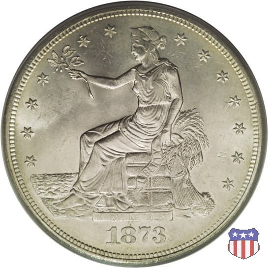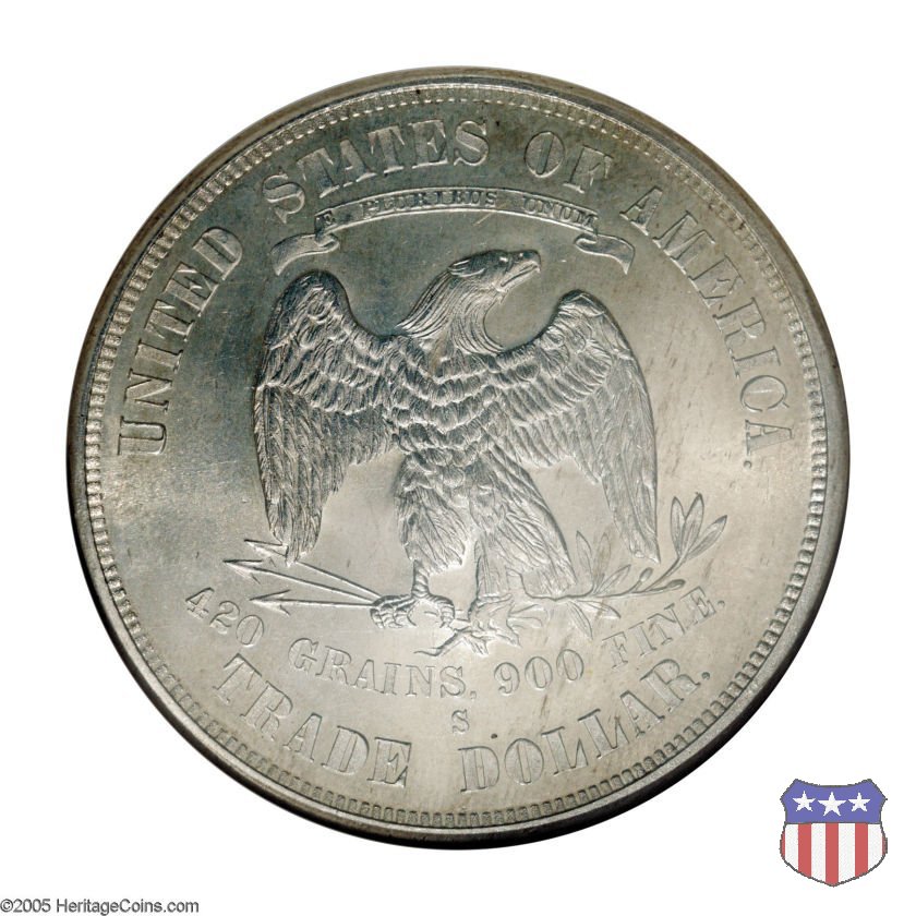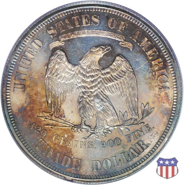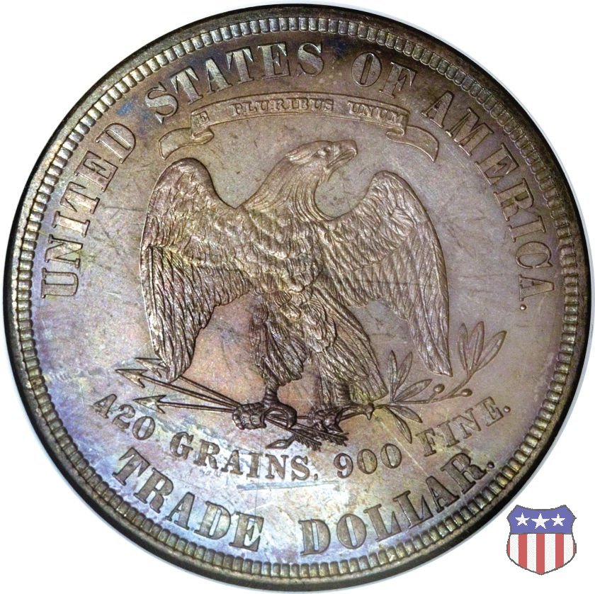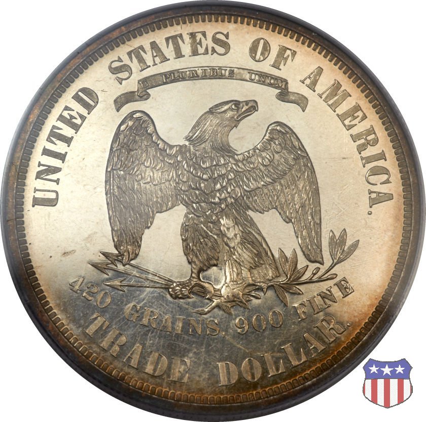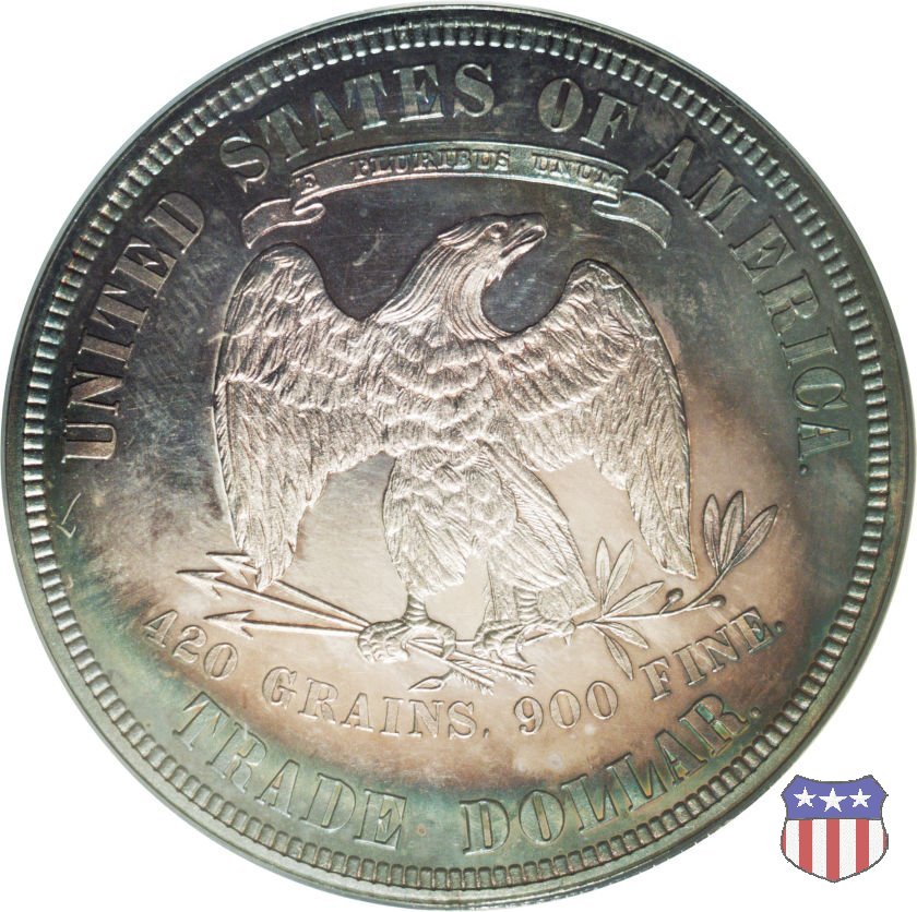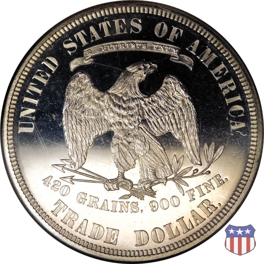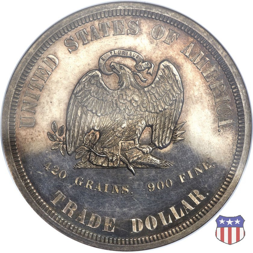 Figura femminile simboleggiante Lady Liberty, che indossa un lungo vestito drappeggiato e guarda a sinistra, seduta su una balla di cotone e altri prodotti americani, che stanno a indicare il carattere commerciale della moneta. Le balle di mercanzia poggiano a loro volta su un tappeto erboso, che ha come sfondo le onde del mare. Con la mano destra, stesa in avanti, la figura femminile regge un ramo d'ulivo, con la sinistra stringe un cartiglio con la parola LIBERTY. Al disotto delle balle di mercanzia, e appena sopra la data, il motto IN GOD WE TRUST. Nel cerchio, a circondare Lady Liberty, 13 stelle. Aquila di fronte ad ali spiegate, che stringe un ramo d'ulivo nel suo artiglio sinistro e un mazzo di frecce nel destro. Al disopra dell'aquila, le parole UNITED STATES OF AMERICA e un cartiglio col motto E PLURIBUS UNUM. Al disotto dell'aquila, il peso e la finezza della moneta (420 GRAINS. 900 FINE) e la denominazione TRADE DOLLAR. Sopra la D di DOLLAR eventuale marchio di zecca.