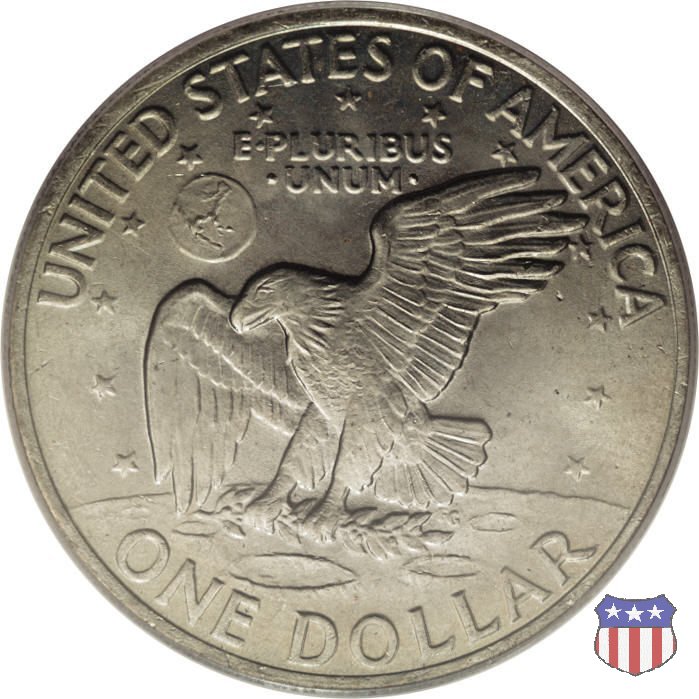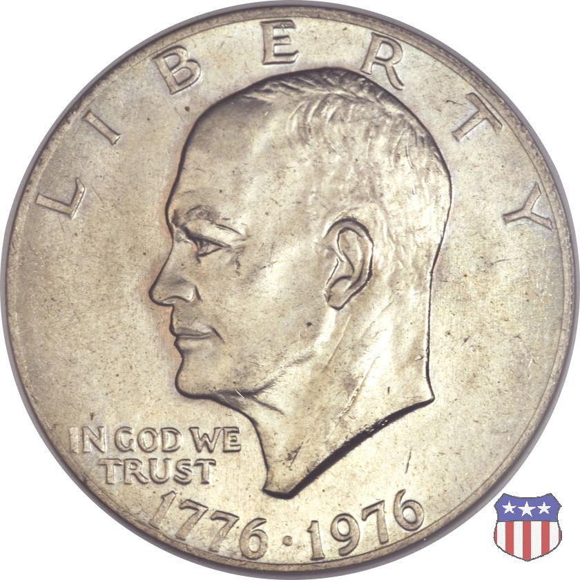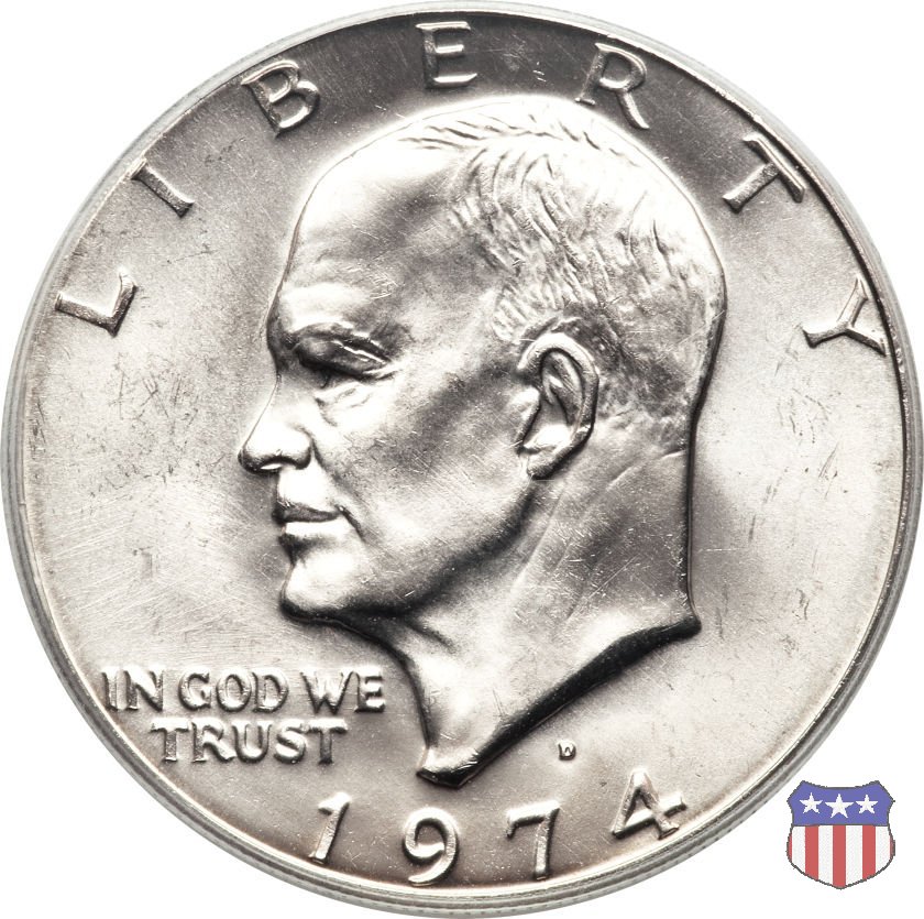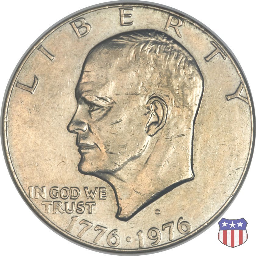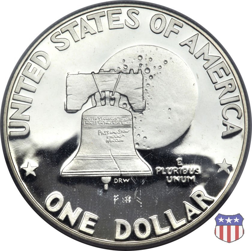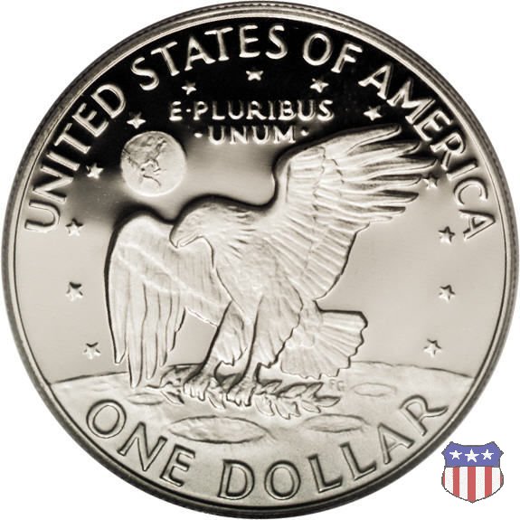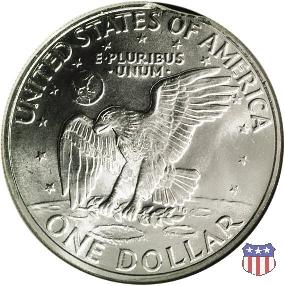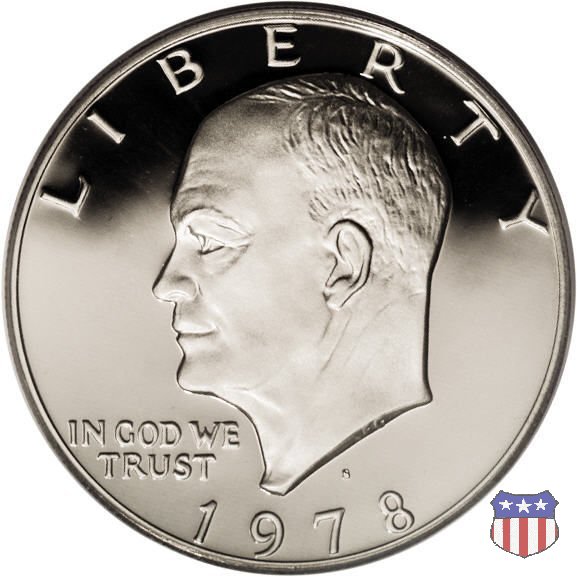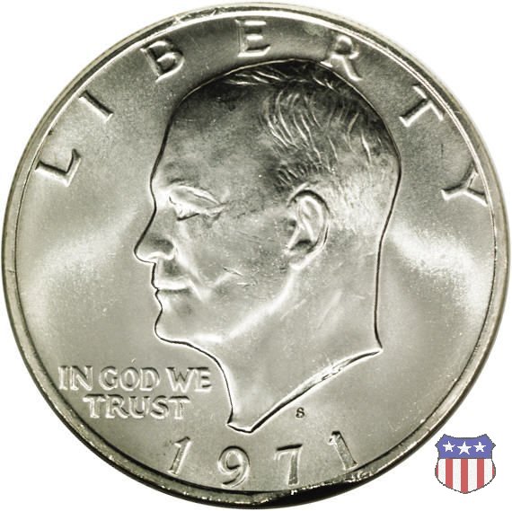 Ma non furono piú monete ad alto contenuto d'argento, come le precedenti, ma prodotte in due leghe diverse, di cui una, detta "Silver Clad" con un basso titolo d'argento (40%) e l'altra, denominata "Clad", in una lega di rame e nickel. Le due monete, di pari diametro, hanno pesi diversi: 24,59 gr. il "Silver Clad", 22,68 gr. il "Clad". Sul dollaro sono commemorati Dwigt D. "Ike" Eisenhower, già Comandante Supremo Alleato nella Seconda Guerra Mondiale, poi Presidente degli Stati Uniti, da poco scomparso (1969) e lo sbarco del primo uomo sulla Luna, con la missione Apollo 11, di cui il rovescio riprende, adattandolo, lo stemma ufficiale. Un accoppiamento che a qualcuno sembrò alquanto forzato, ma che venne giustificato col fatto che fu proprio sotto la presidenza Eisenhower che venne dato il via al programma spaziale degli Stati Uniti, culminato il 20 Luglio 1969 con lo sbarco sul nostro satellite. Nel 1976, in occasione del Bicentenario della Dichiarazione d'Indipendenza, il rovescio del dollaro venne cambiato, con l'inserimento, al posto dello stemma dell'Apollo 11, della Campana della Libertà (Liberty Bell) ma rimase il riferimento alla missione spaziale, con la Luna sullo sfondo della Campana. Nel 1977 e 1978, ultimo anno di coniazione, si tornò poi al precedente rovescio. Segno di zecca: - D Denver - S San Francisco - senza segno Philadelphia | ||||||||||||||||||||